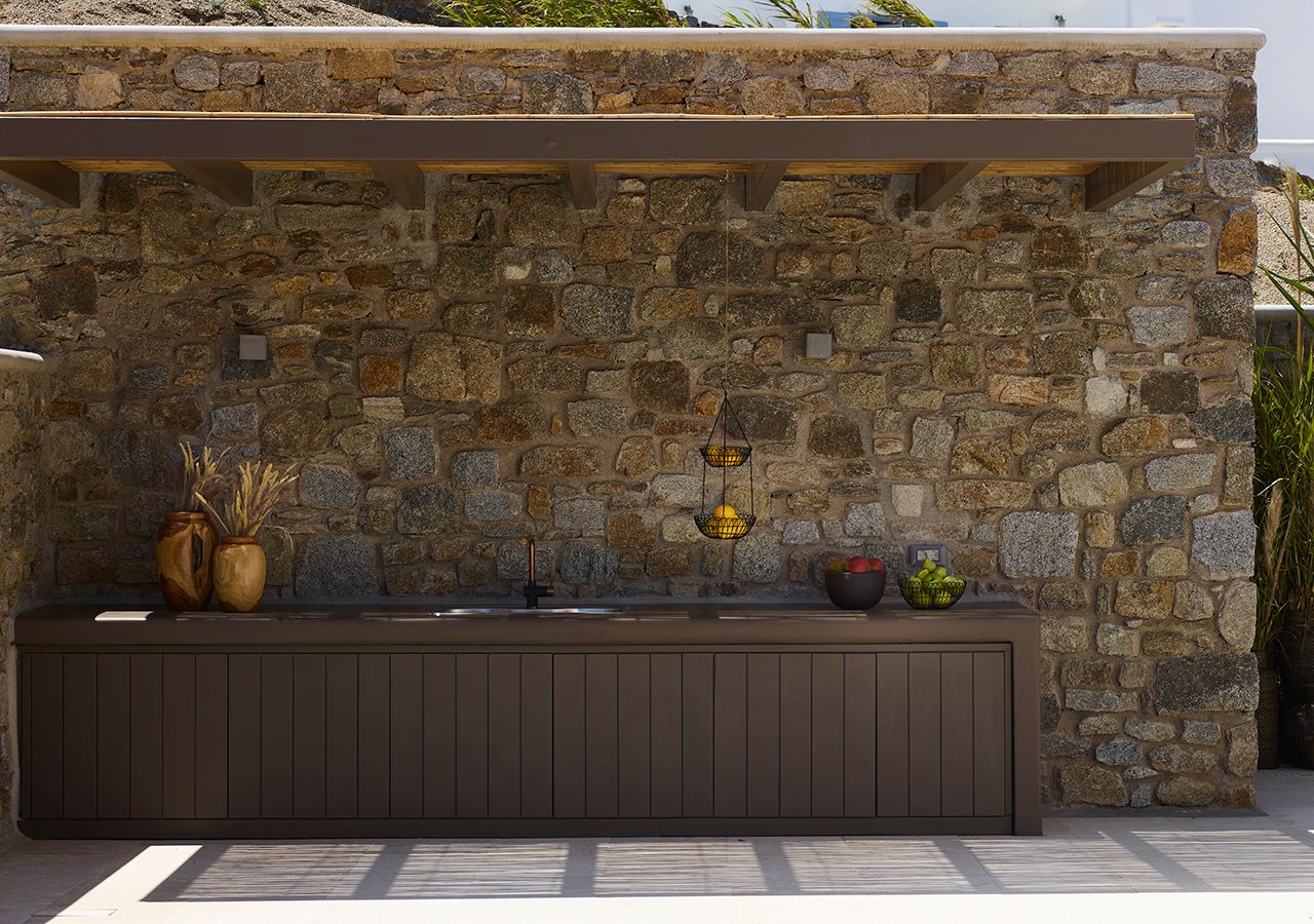The ample 530m² (5705 sq. ft) outdoor recreation area is paved in local stone, with a private, 40m² (430 sq. ft) swimming pool as its centerpiece, complete with a sun deck with stretchers and umbrellas, adjacent to a fragrant Mediterranean herb garden which blends seamlessly into the landscape. The outdoor lounge, intimately sheltered under a wooden pergola, is furnished with outdoor sofas and armchairs with a signature hand-crafted weave by Ethimo and invites dining al fresco, cooled by the northern breeze. The dining area is equipped with a barbecue, cooking worktop, and mini-fridge, and can comfortably cater to long gatherings for families and friends, taking place exclusively in the open air, with a soothing view of the sea horizon in the background.