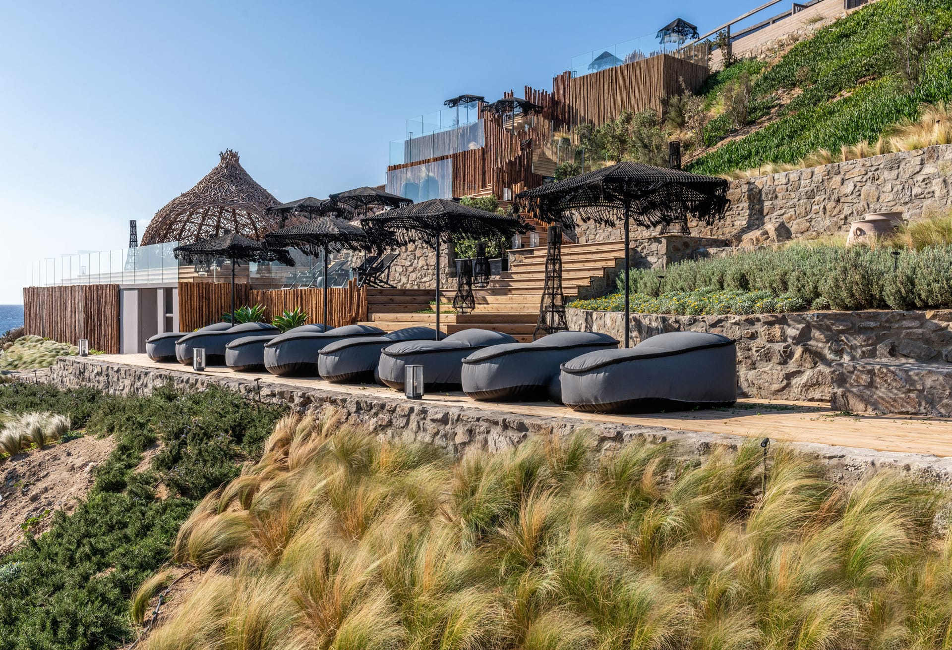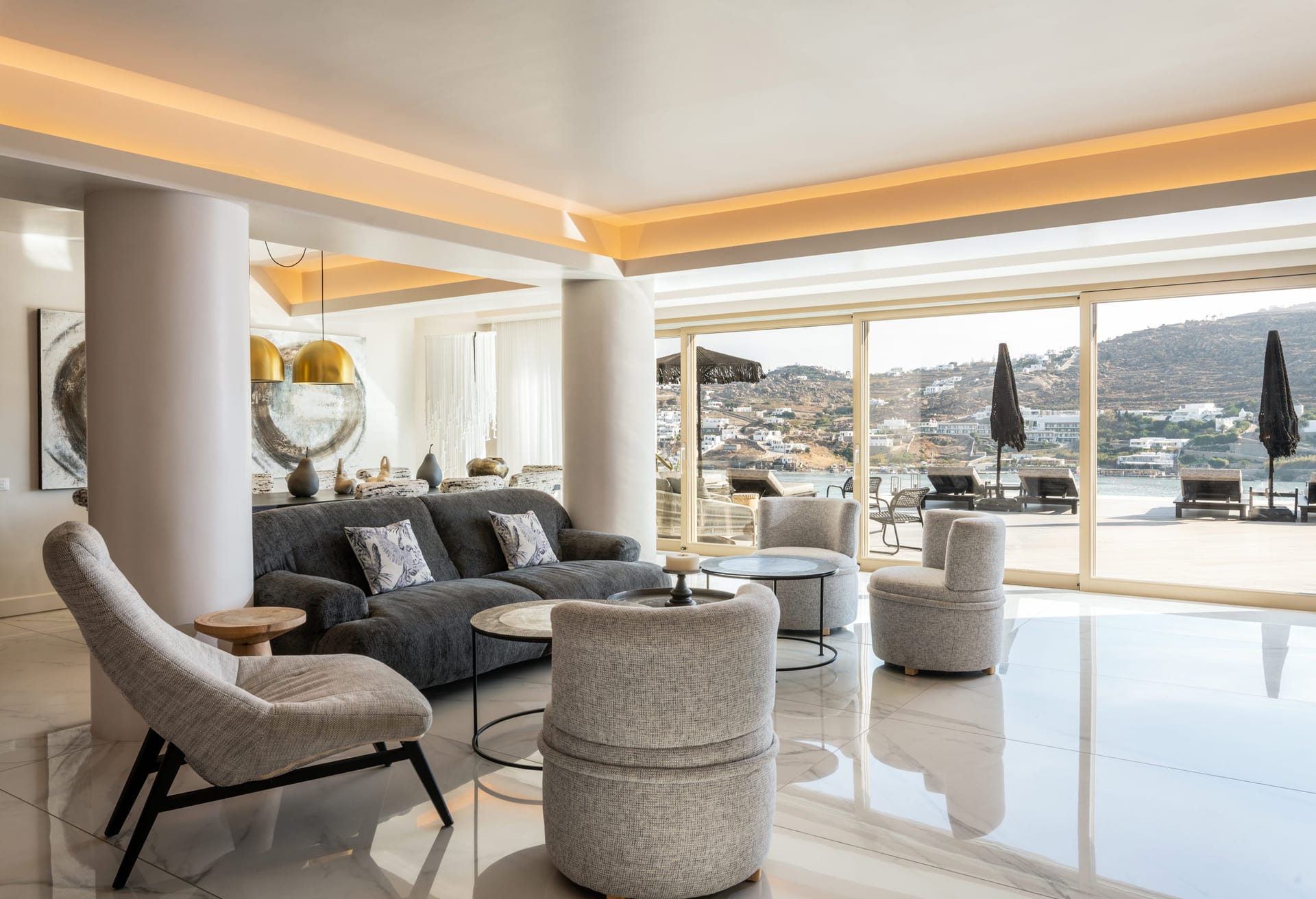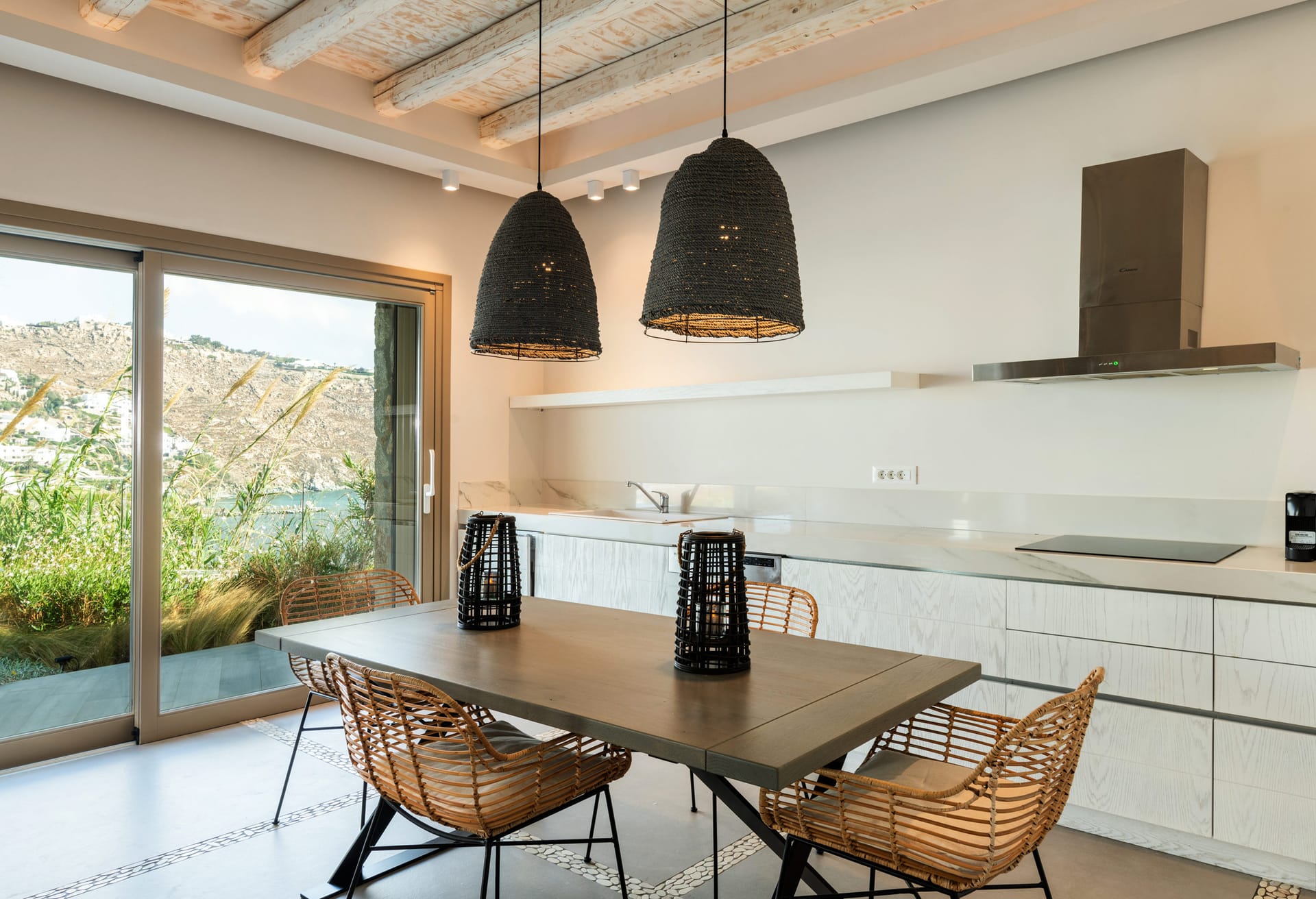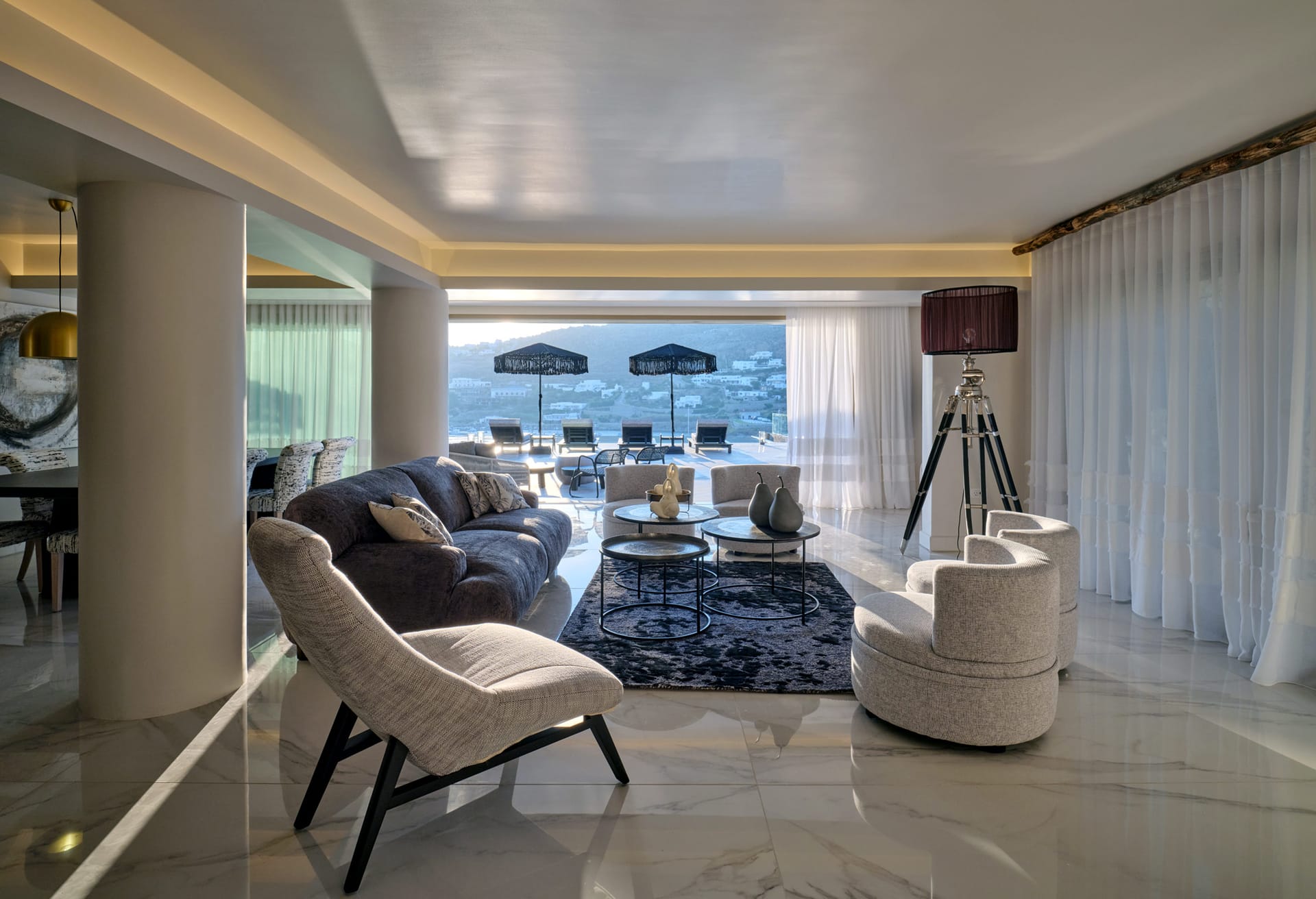 On the outside, the wide, wonderful private pool is the center piece of outdoor living at this stunning holiday residence. Communal dining spaces, elegant daybeds, outdoor sofas, with so much space to make the most of, it’s easy to find an alone time when you need it or gather together for meals and fun poolside moments. All these spaces are designed for chilling out across the villa grounds all with breath-taking sea and sunset views.