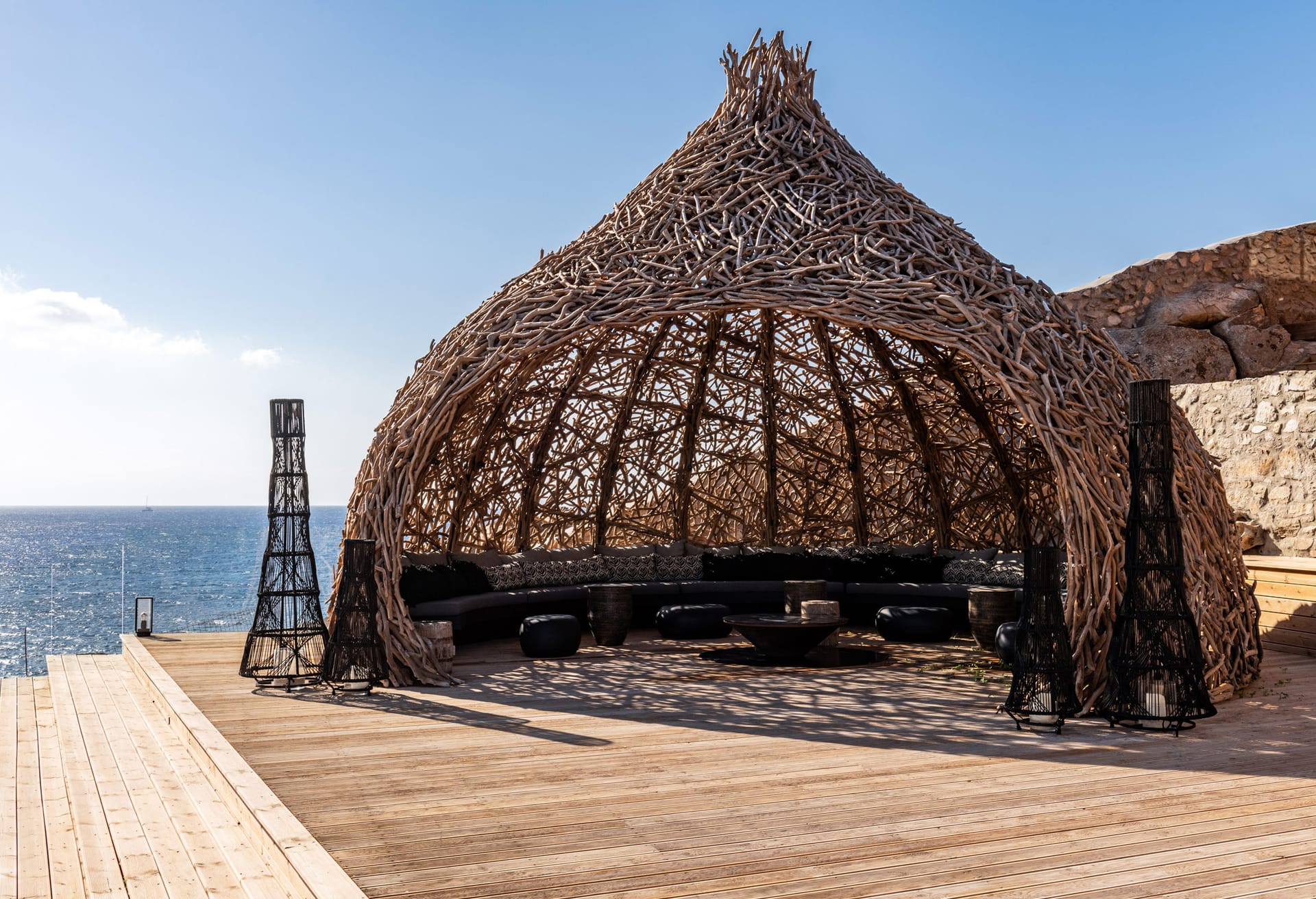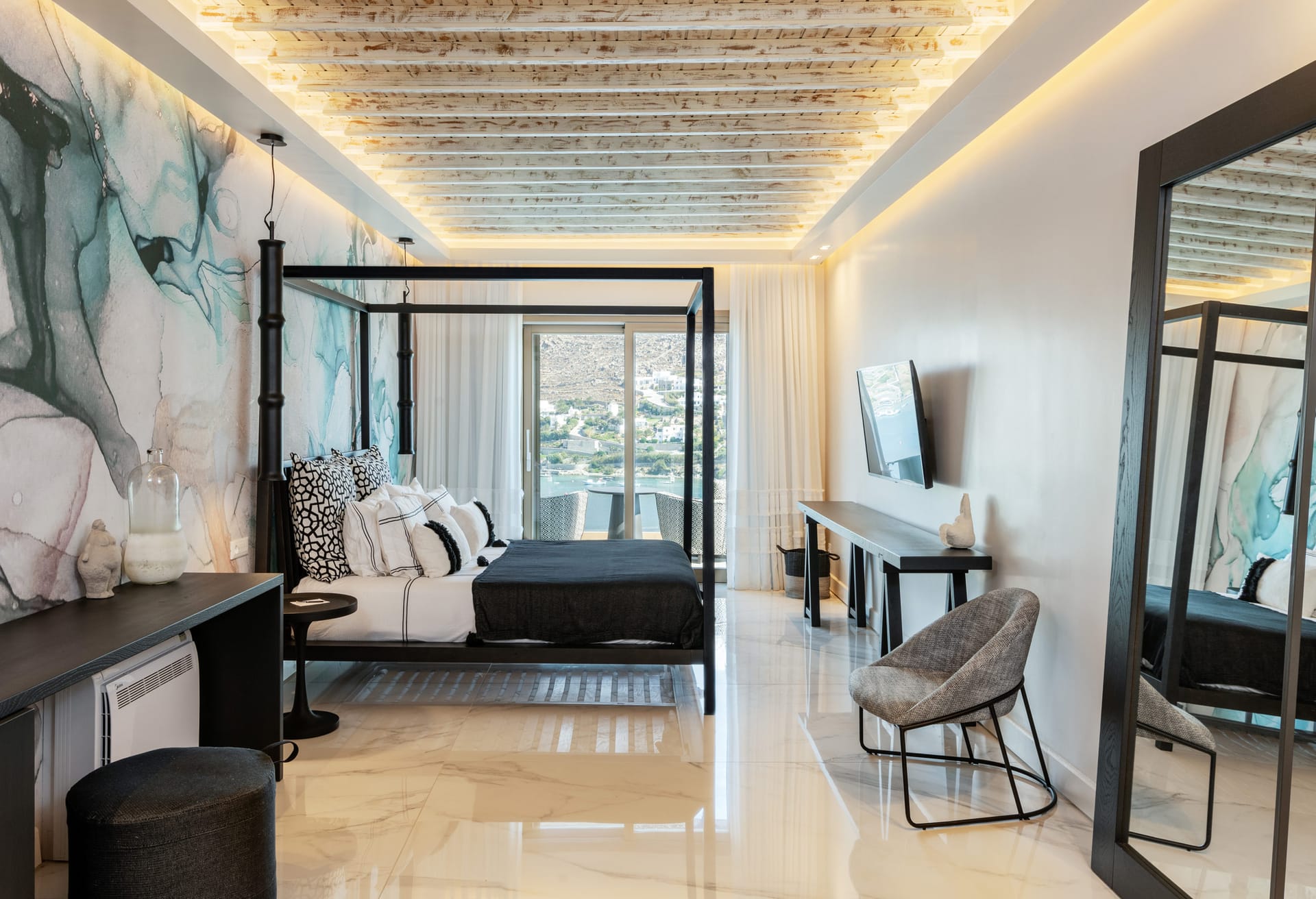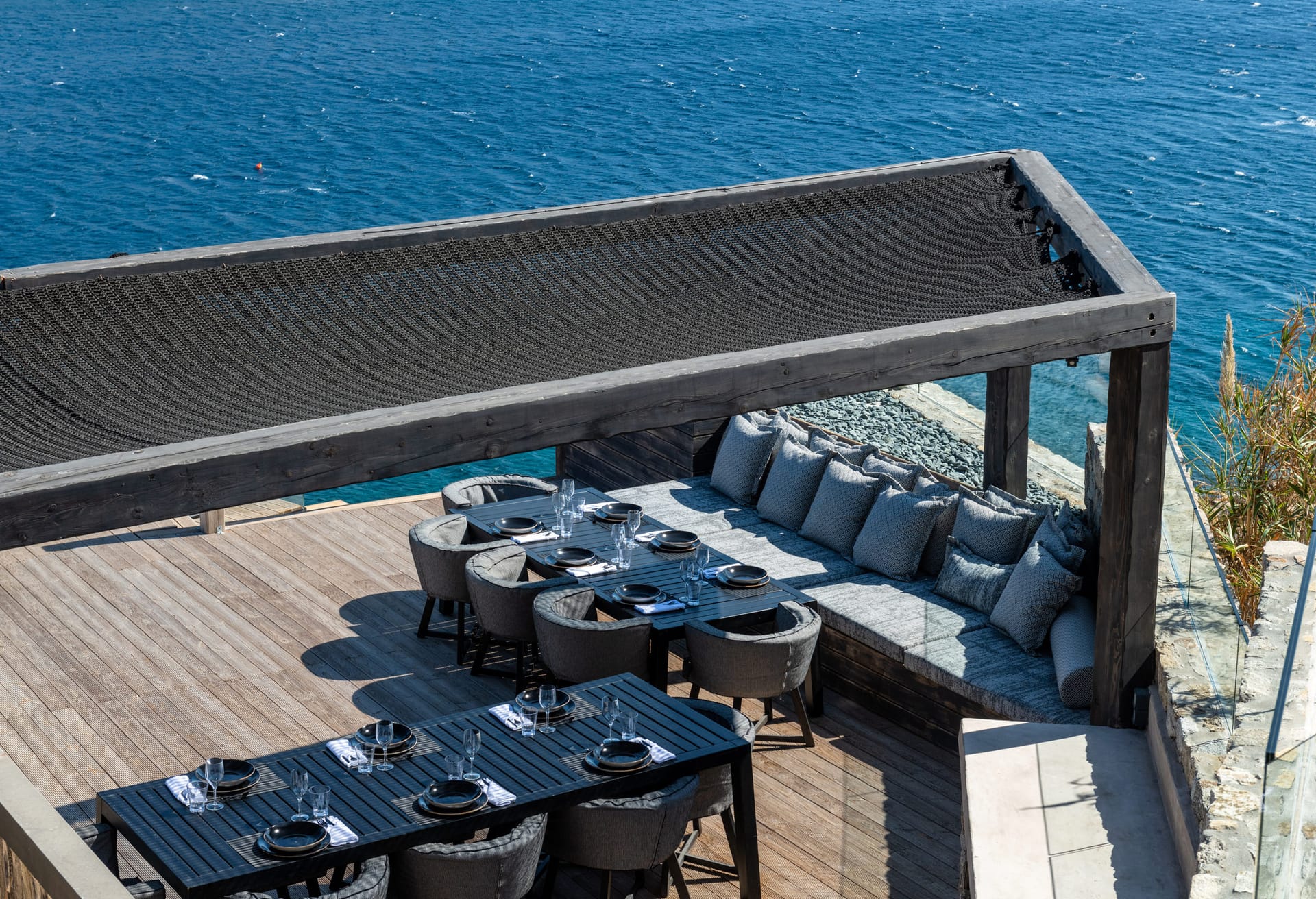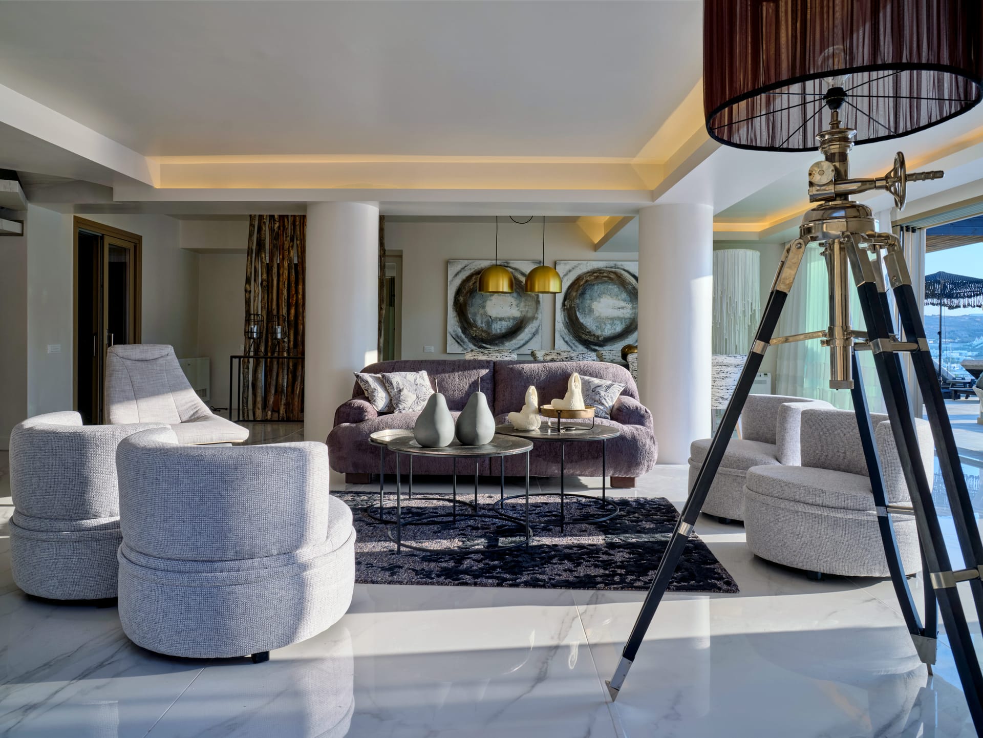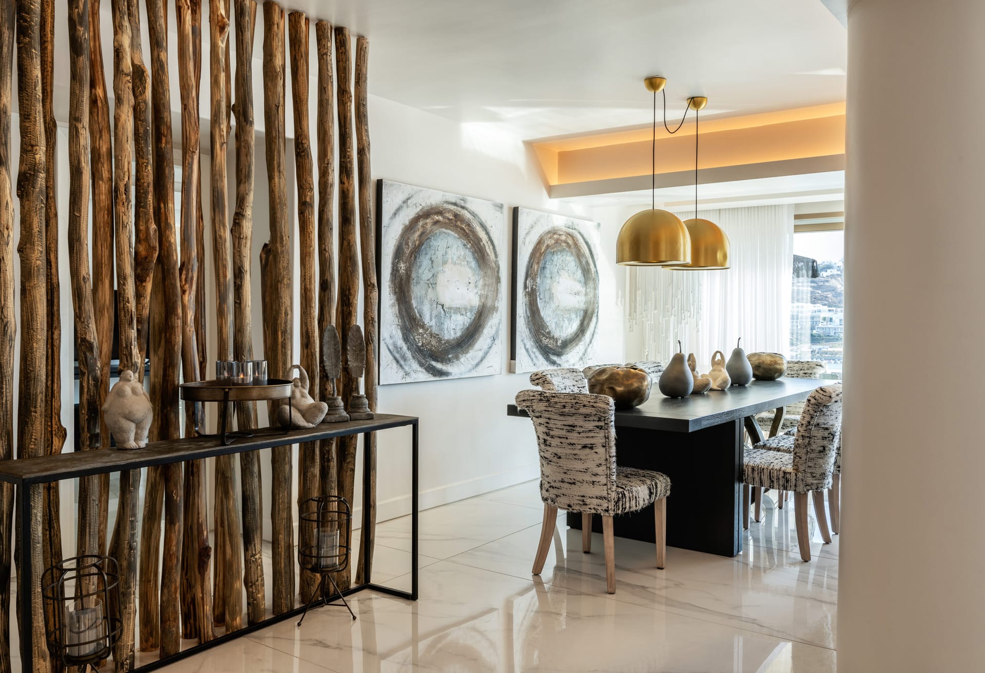 On the outside, the wide, wonderful private pool is the center piece of outdoor living at this stunning holiday residence. Communal dining spaces, elegant daybeds, outdoor sofas, with so much space to make the most of, it’s easy to find an alone time when you need it or gather together for meals and fun poolside moments. All these spaces are designed for chilling out across the villa grounds all with breath-taking sea and sunset views.