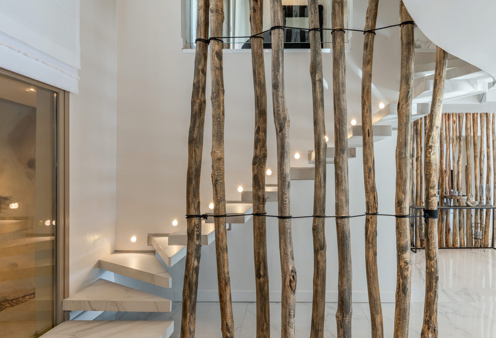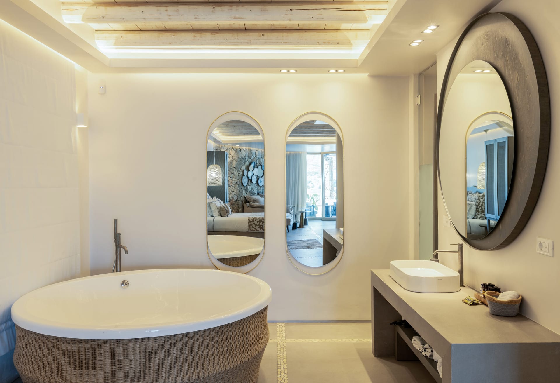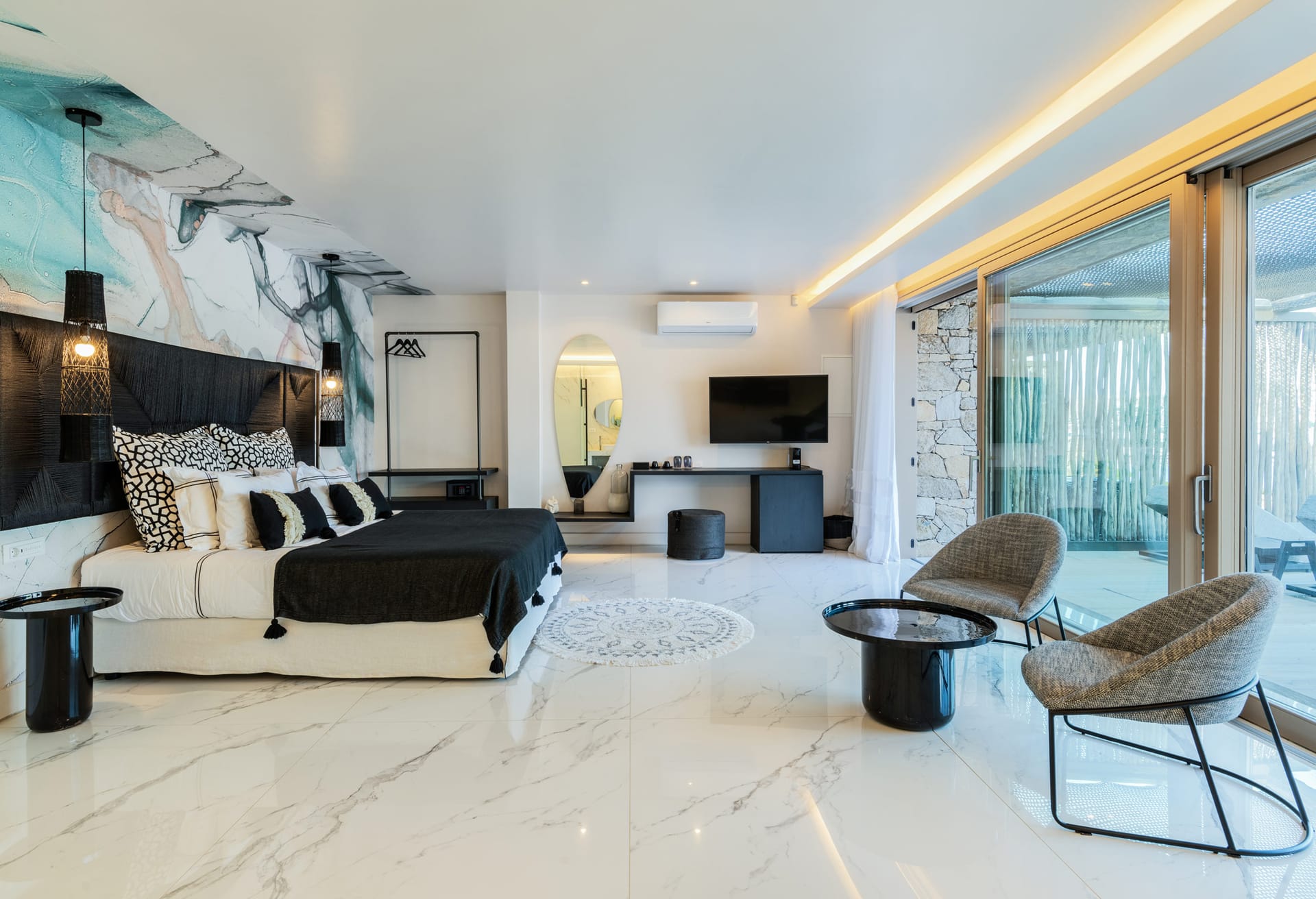 On the entrance level there is the master suite of the residence while on the main building there are three bedrooms and the spacious open space living room. On the ground floor there are also three independent suites and four more on the lower level of the property. All rooms are beautifully designed and decorated in minimal mood.