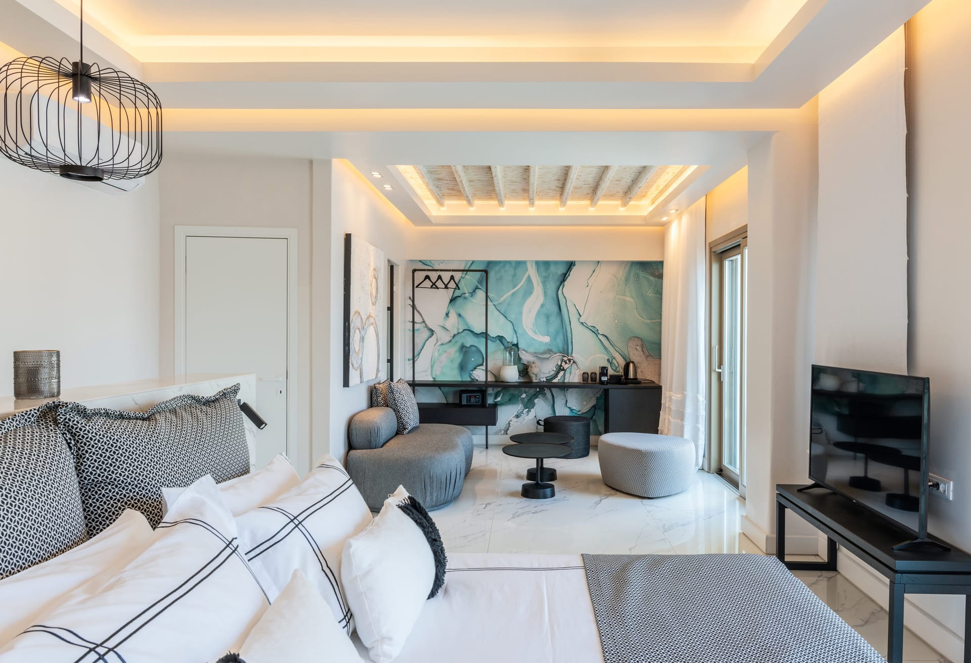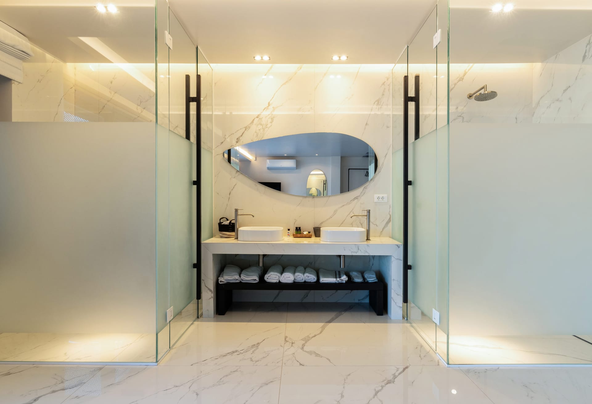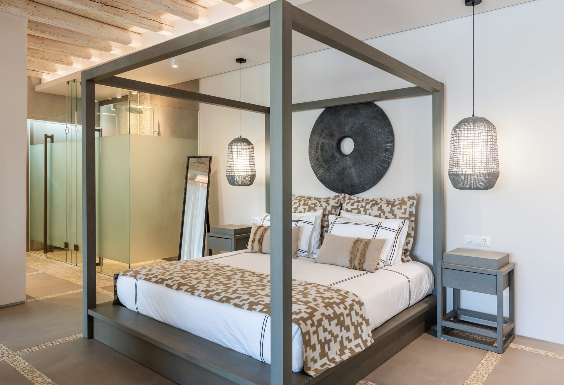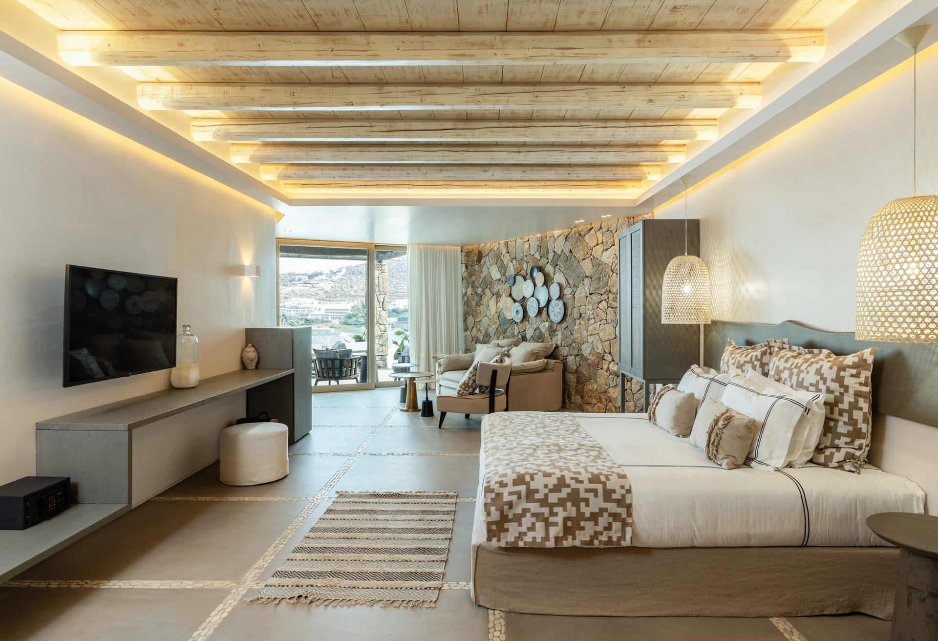 On the entrance level there is the master suite of the residence while on the main building there are three bedrooms and the spacious open space living room. On the ground floor there are also three independent suites and four more on the lower level of the property. All rooms are beautifully designed and decorated in minimal mood.
