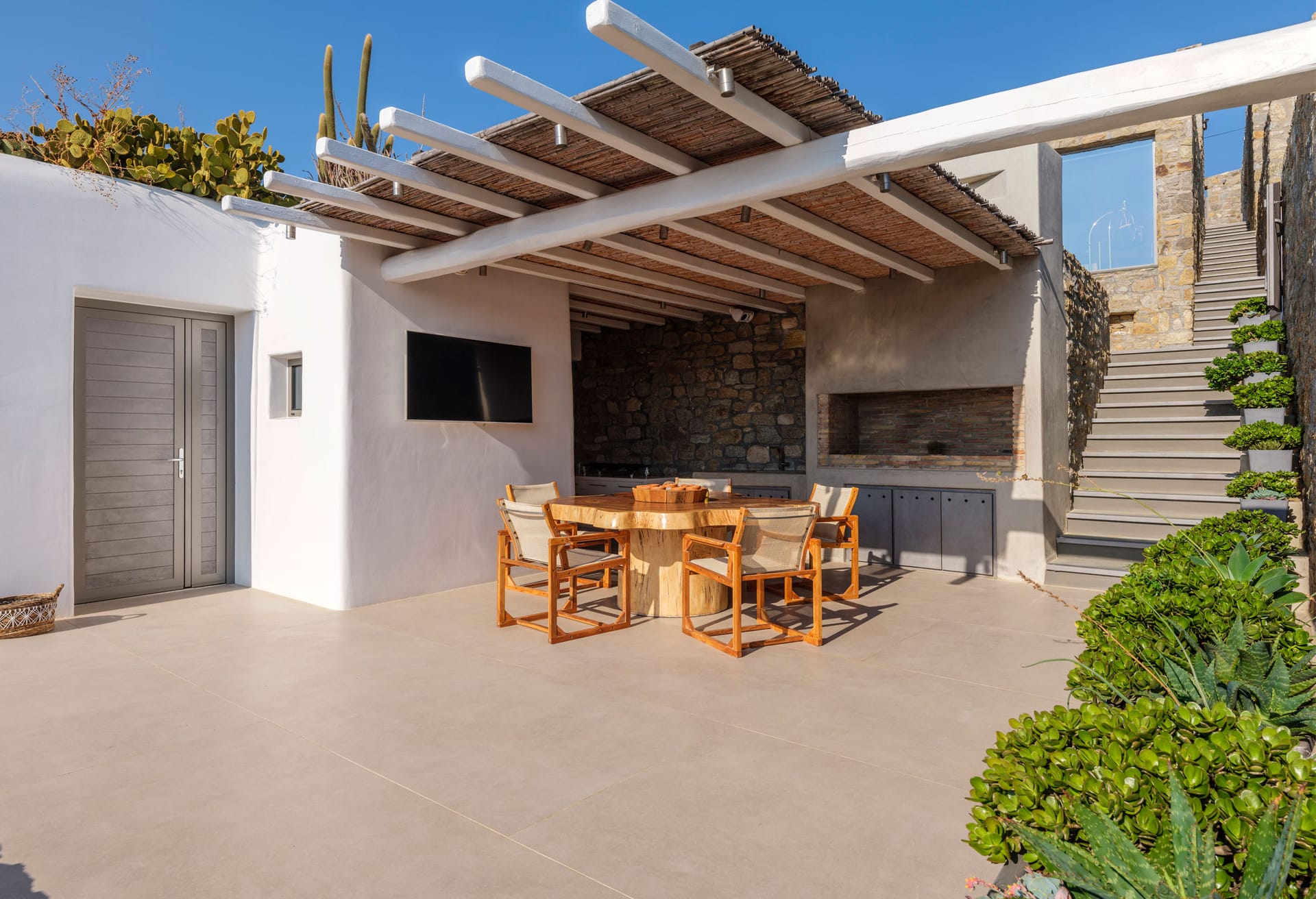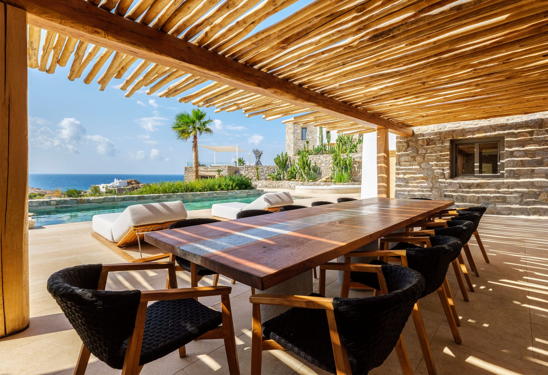 The Villa presents an architectural design characterized by its contemporary and stylish aesthetics. It features three captivating swimming pools, elegantly framed by opulent sun loungers, providing a breathtaking setting for memorable sunset vistas. Enhancing its allure, an outdoor dining area is discreetly nestled beneath a protective pergola, complemented by a meticulously crafted stone barbecue, ensuring a delightful experience of al fresco dining beneath the starlit night sky.
