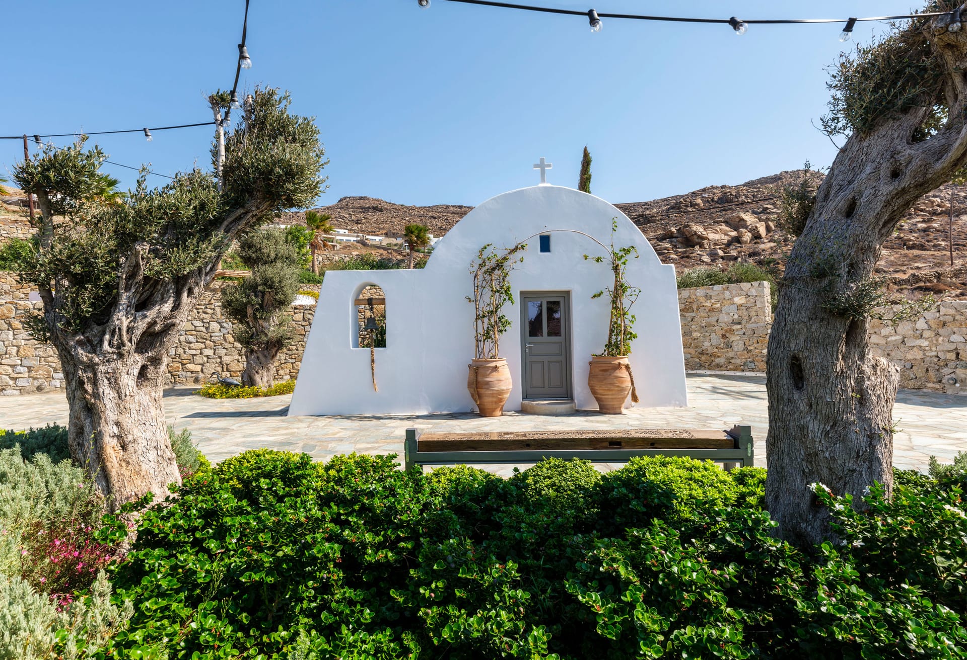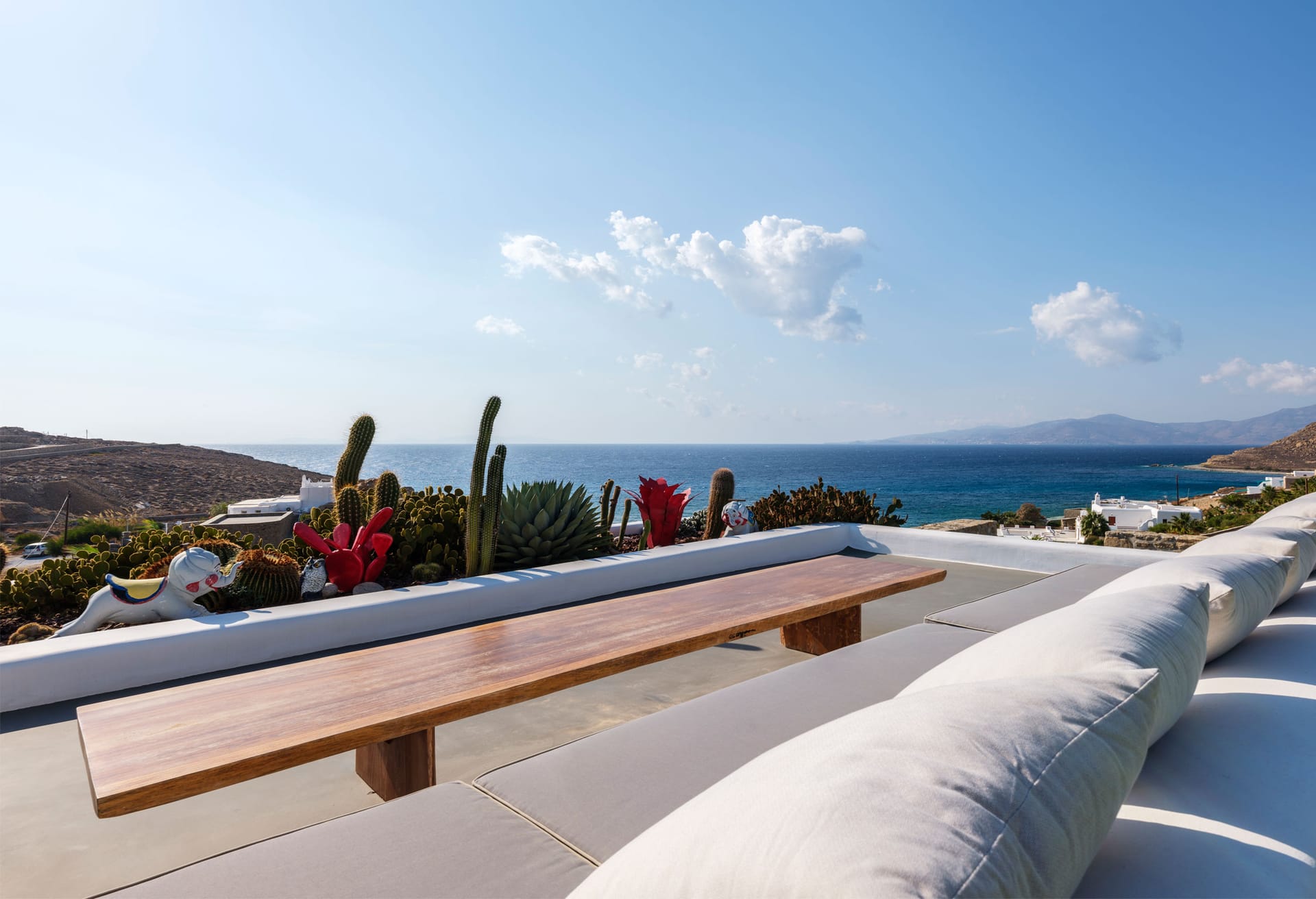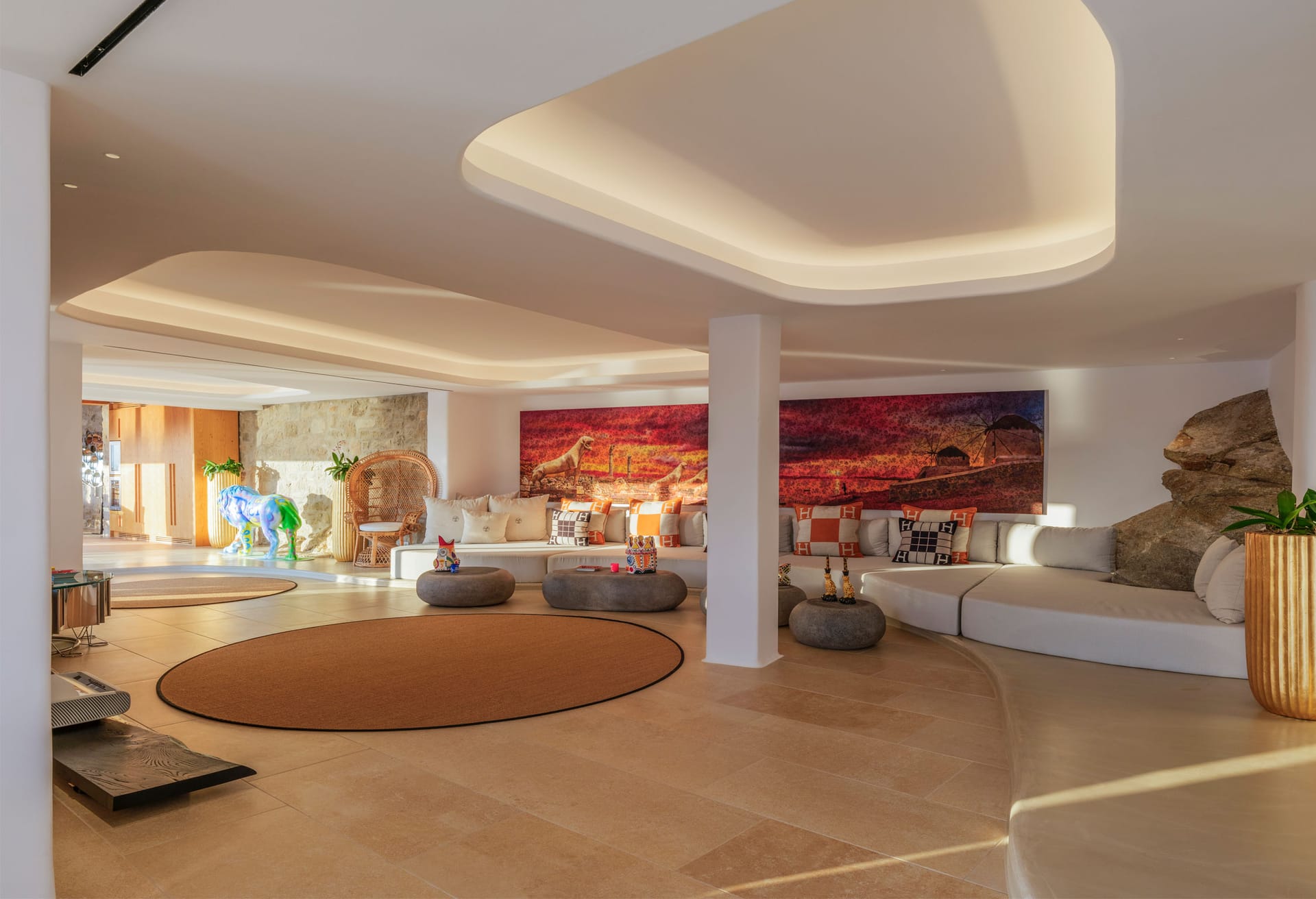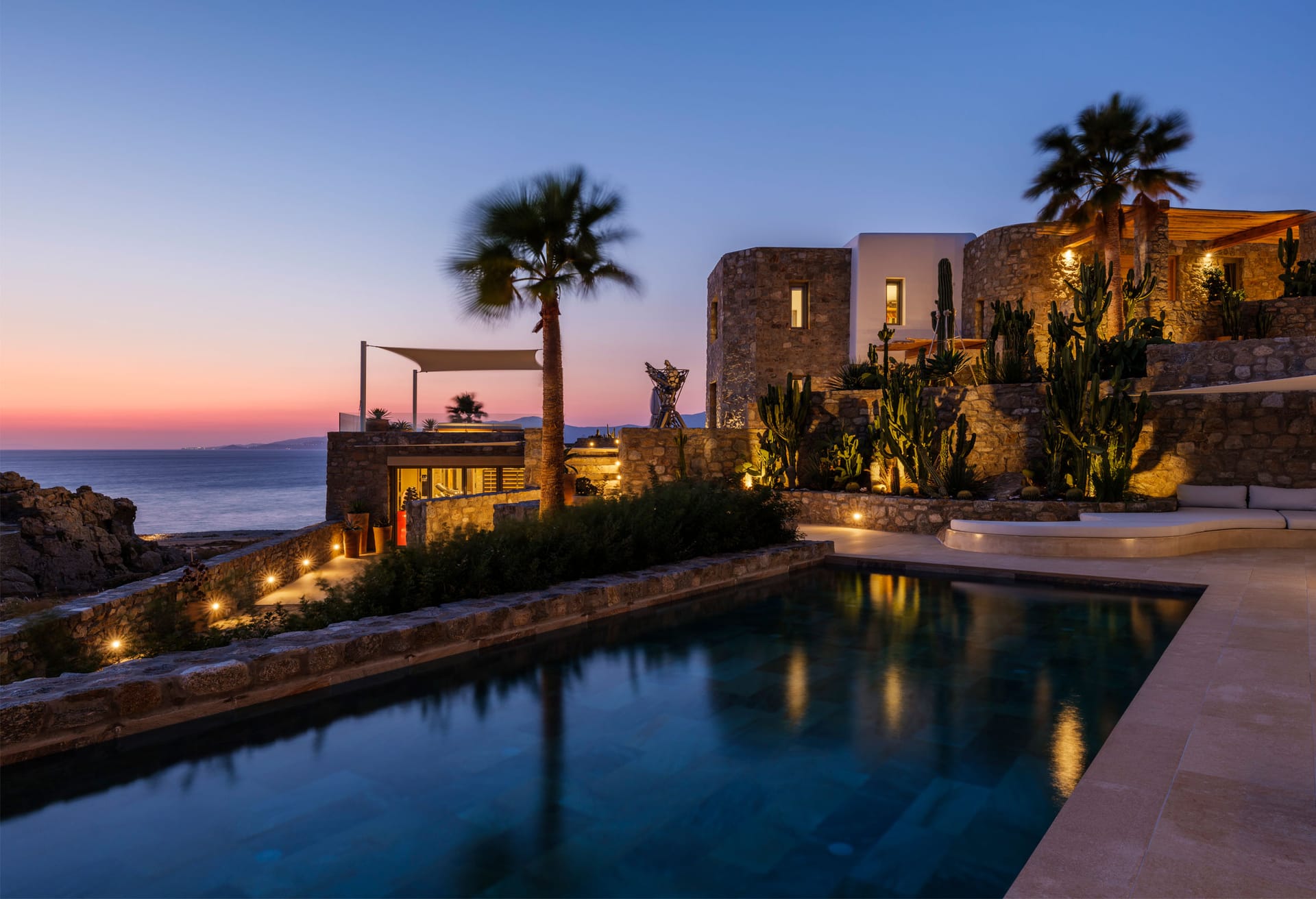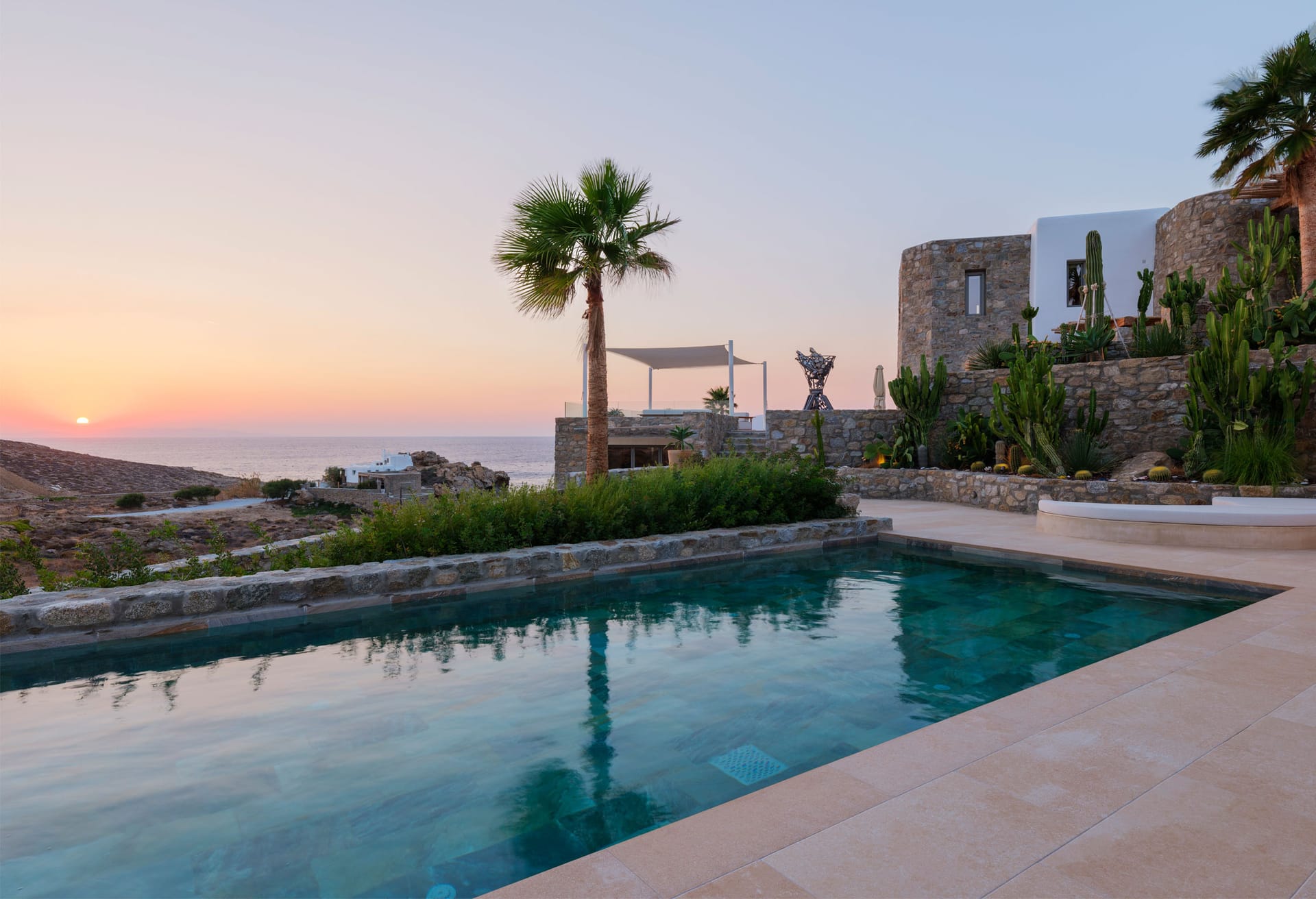 Exclusive Vip Property. Mykonos Villa Paradise boasts an exclusive perch with breathtaking views of Chouloukas Beach on the captivating Mykonos Island. This architecturally striking stone villa blends contemporary elegance with lavish amenities, ensuring an unforgettable experience for all who choose to stay. Take pleasure in the sweeping sunset and captivating Aegean scenery that graces this extraordinary property.