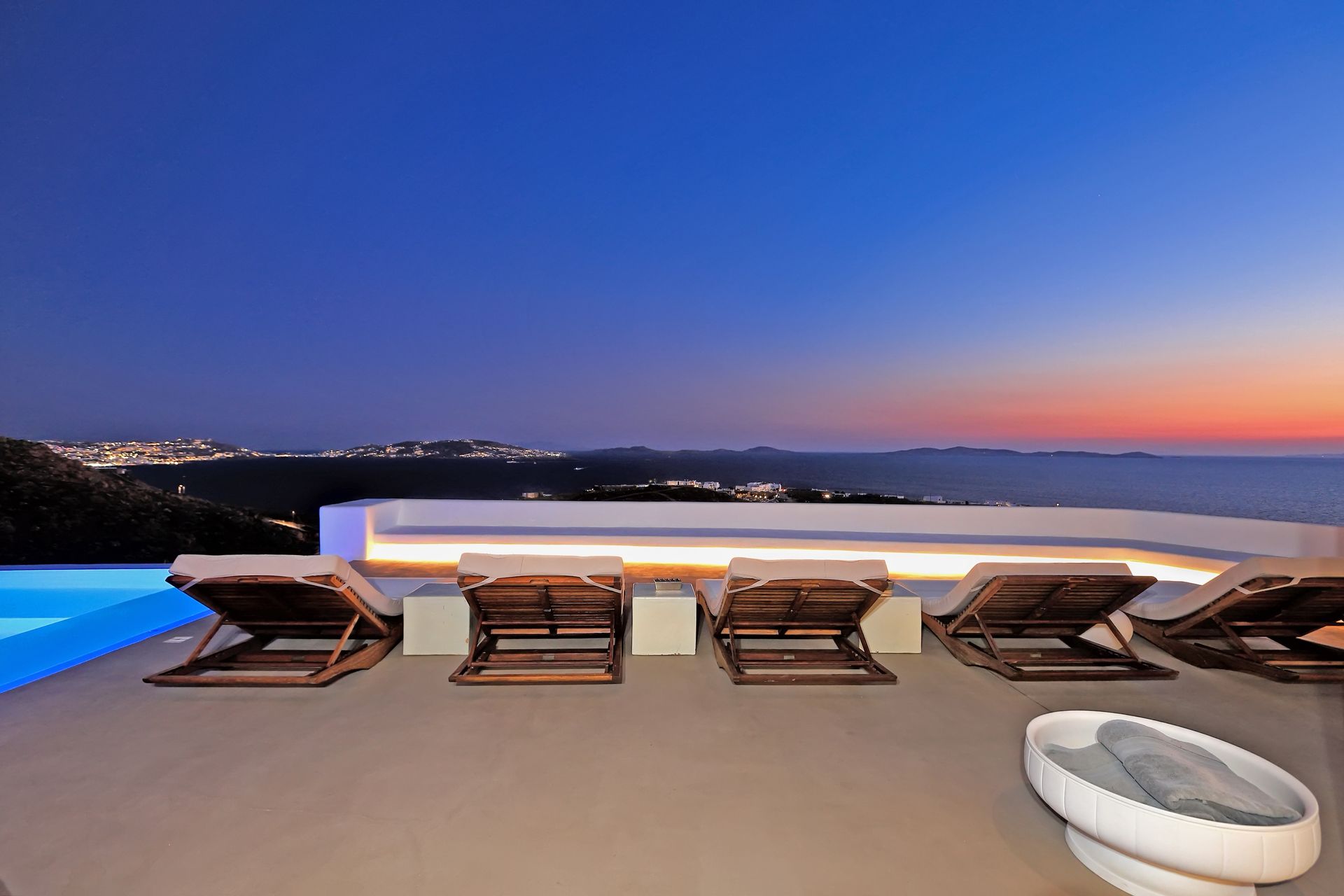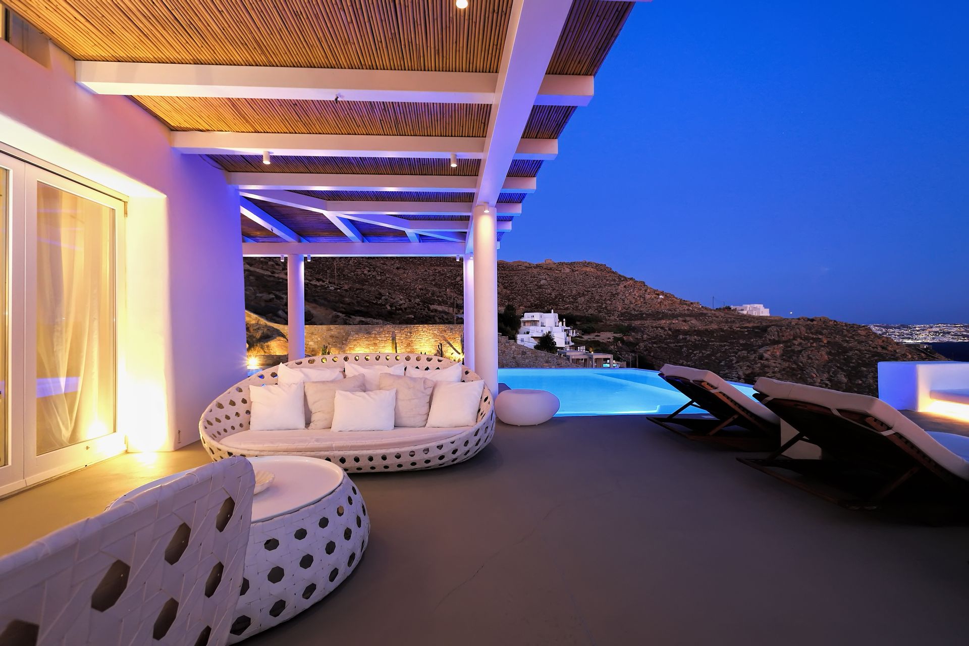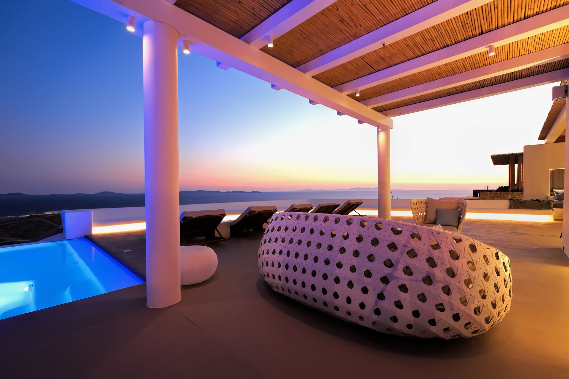 Outdoors, there are large terraces, a covered pergola that offers shade during the hot cycladic summer days and a dining table for six. There are lounge chairs where someone can relax and enjoy the panoramic view over the Kalo Livadi bay.