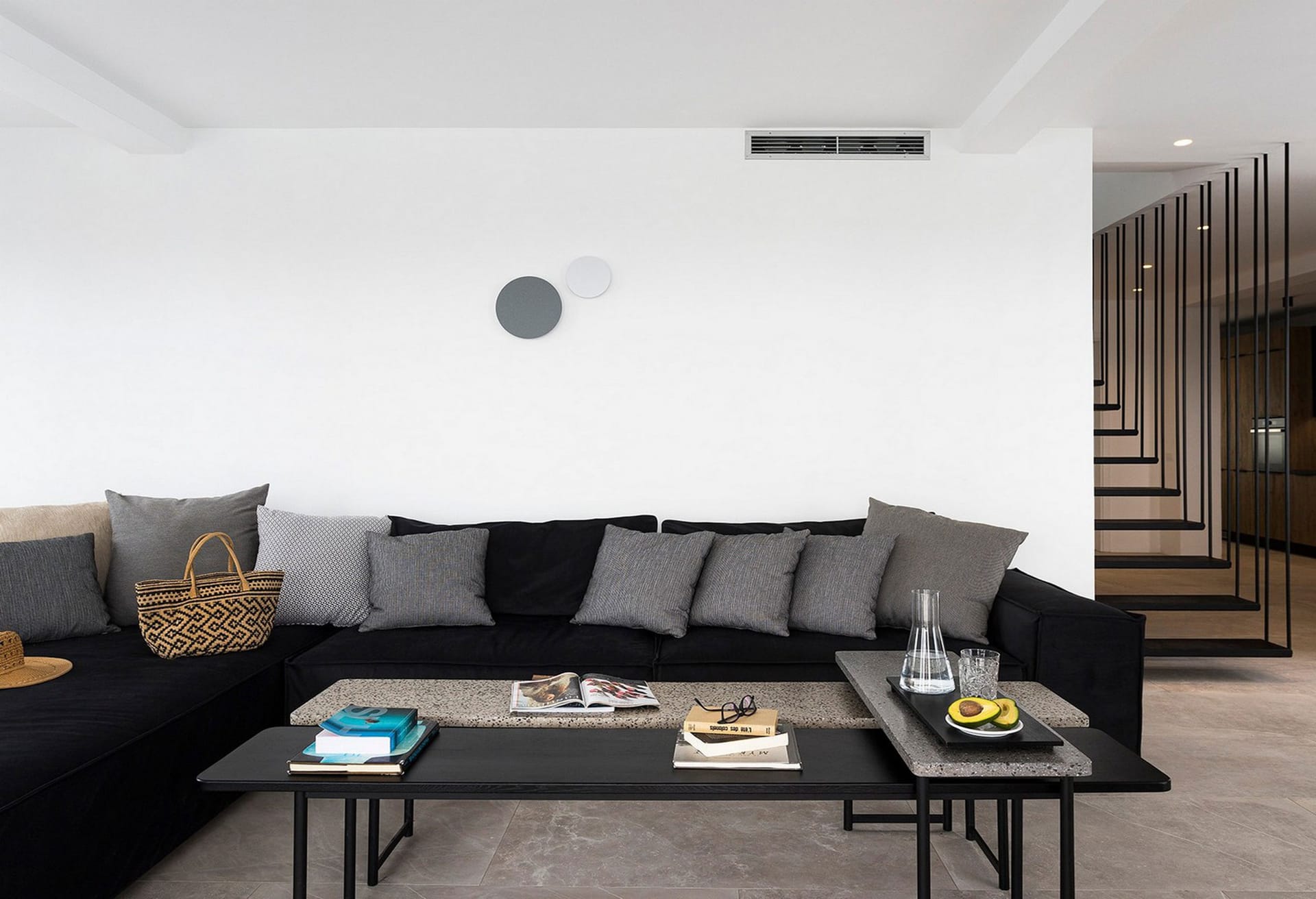 - Living area with sofa, A/C, TV, sea view, access to pool