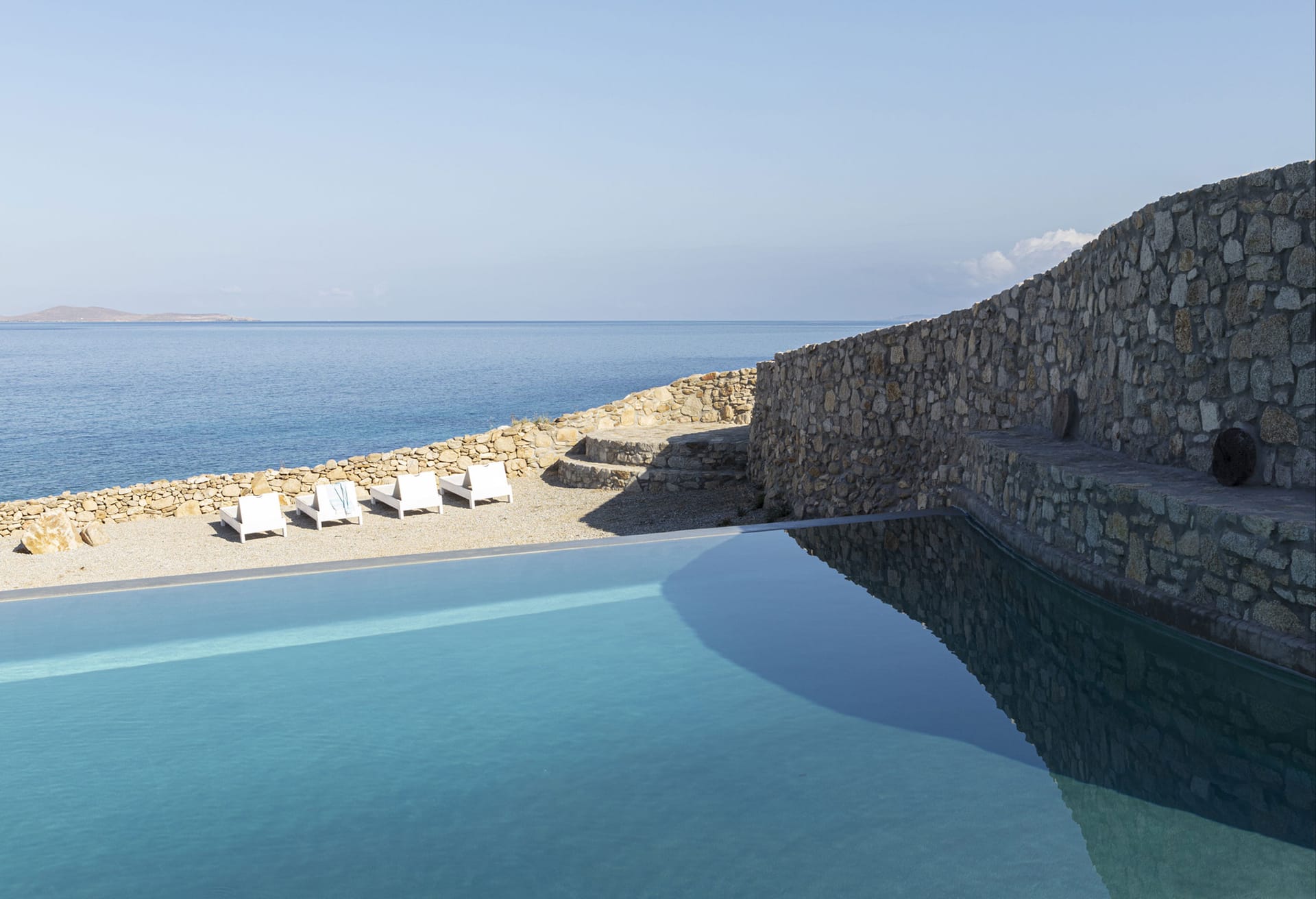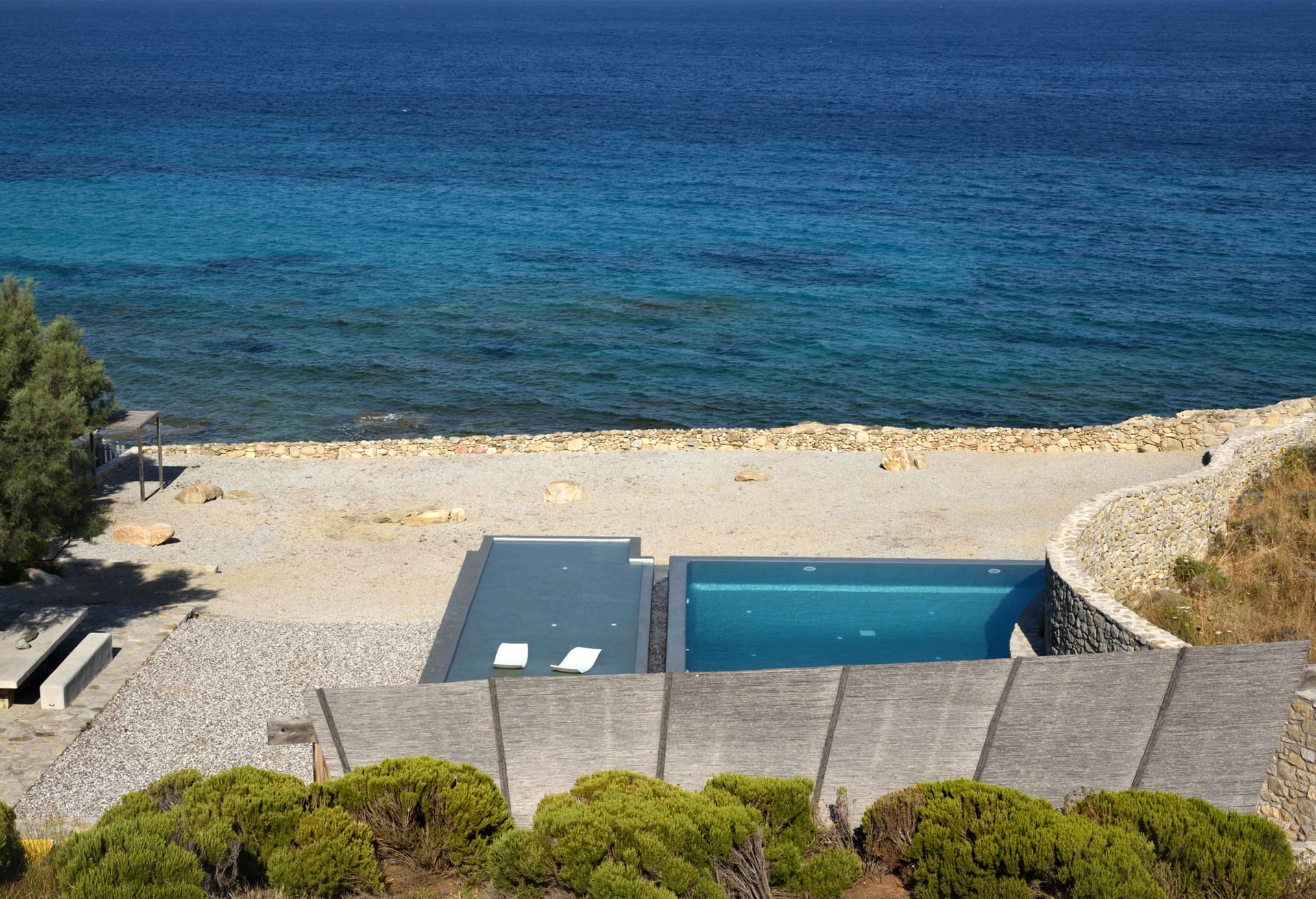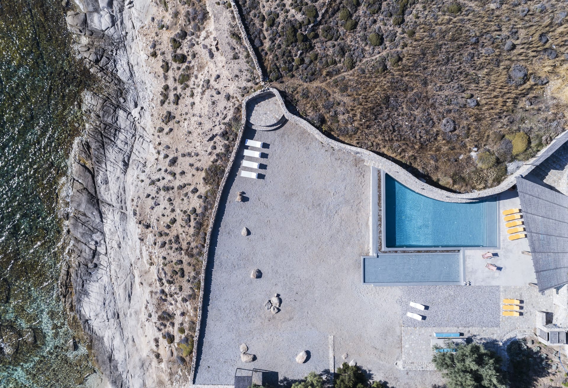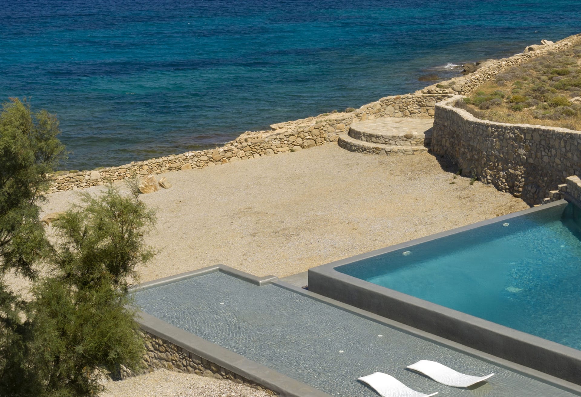 The guest house is independent and has an open-plan layout with two double beds. A zig-zag path leads down to a wide pavilion with a lounge area, the statement double pool with a shallow mirror pond, a sculptural stone table, and a small cabane. From here, guests can simply descend directly to the shore, a very rare feature for Mykonian villas.