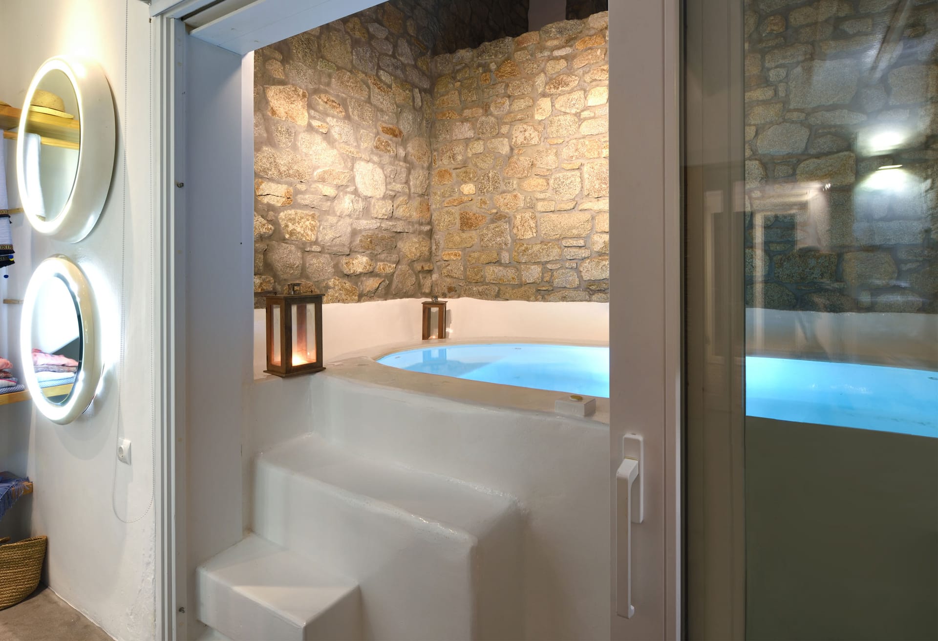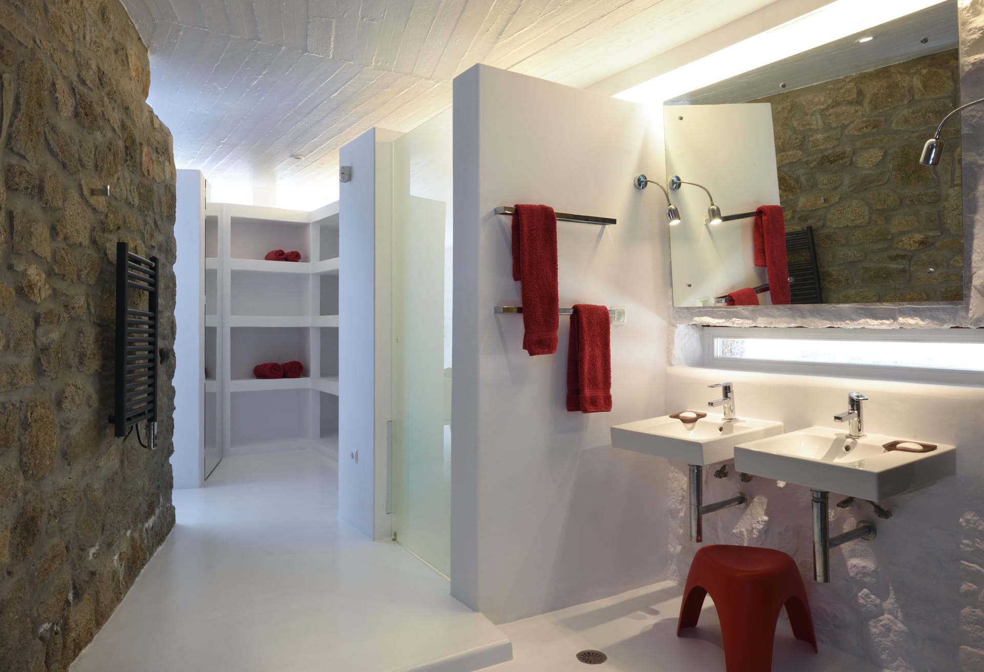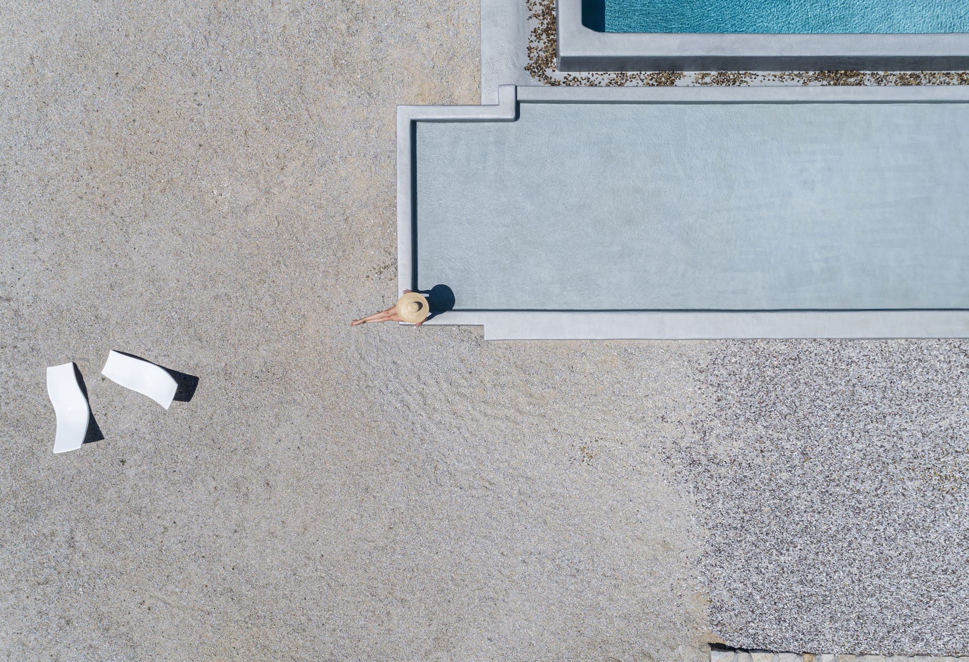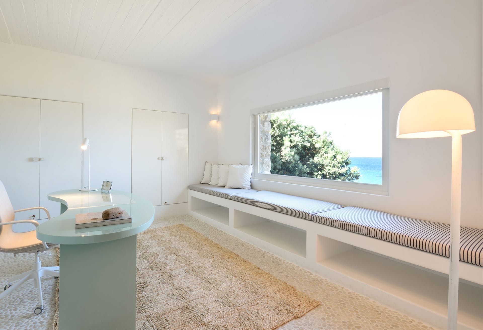 The guest house is independent and has an open-plan layout with two double beds. A zig-zag path leads down to a wide pavilion with a lounge area, the statement double pool with a shallow mirror pond, a sculptural stone table, and a small cabane. From here, guests can simply descend directly to the shore, a very rare feature for Mykonian villas.