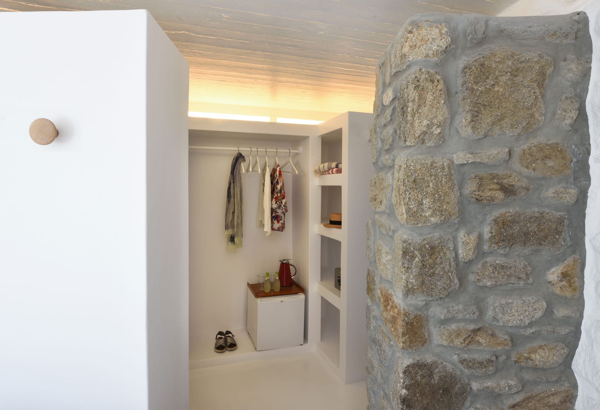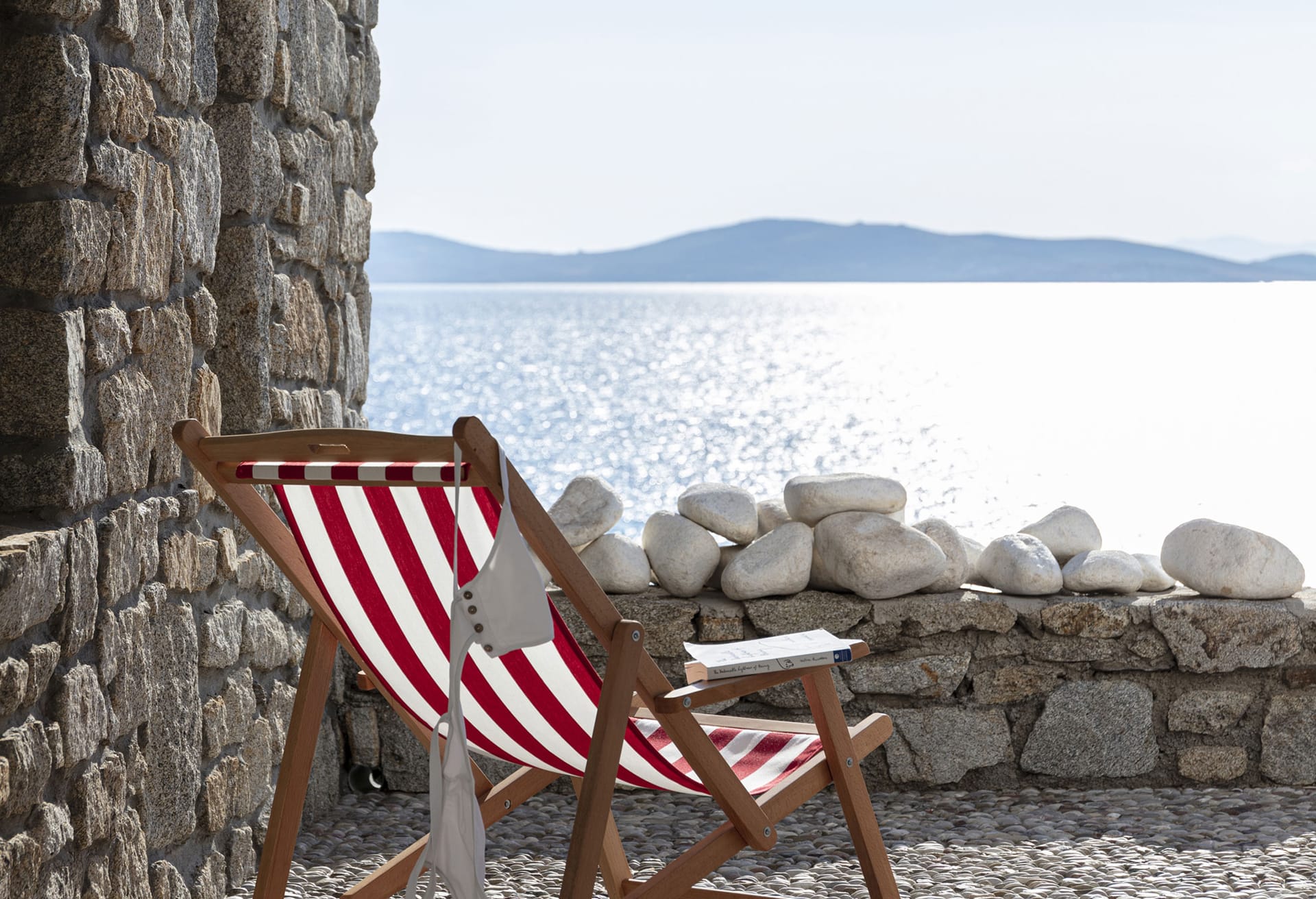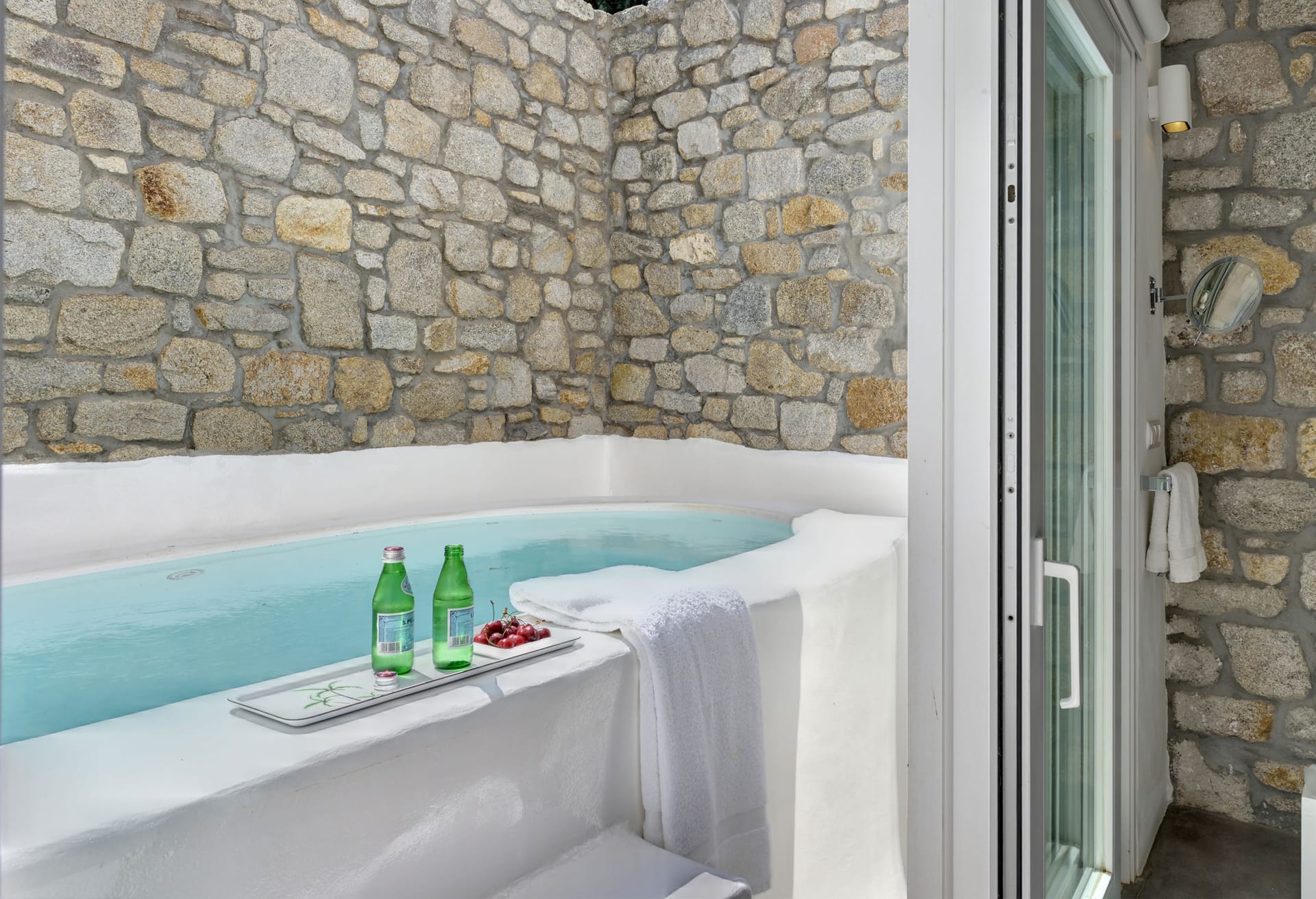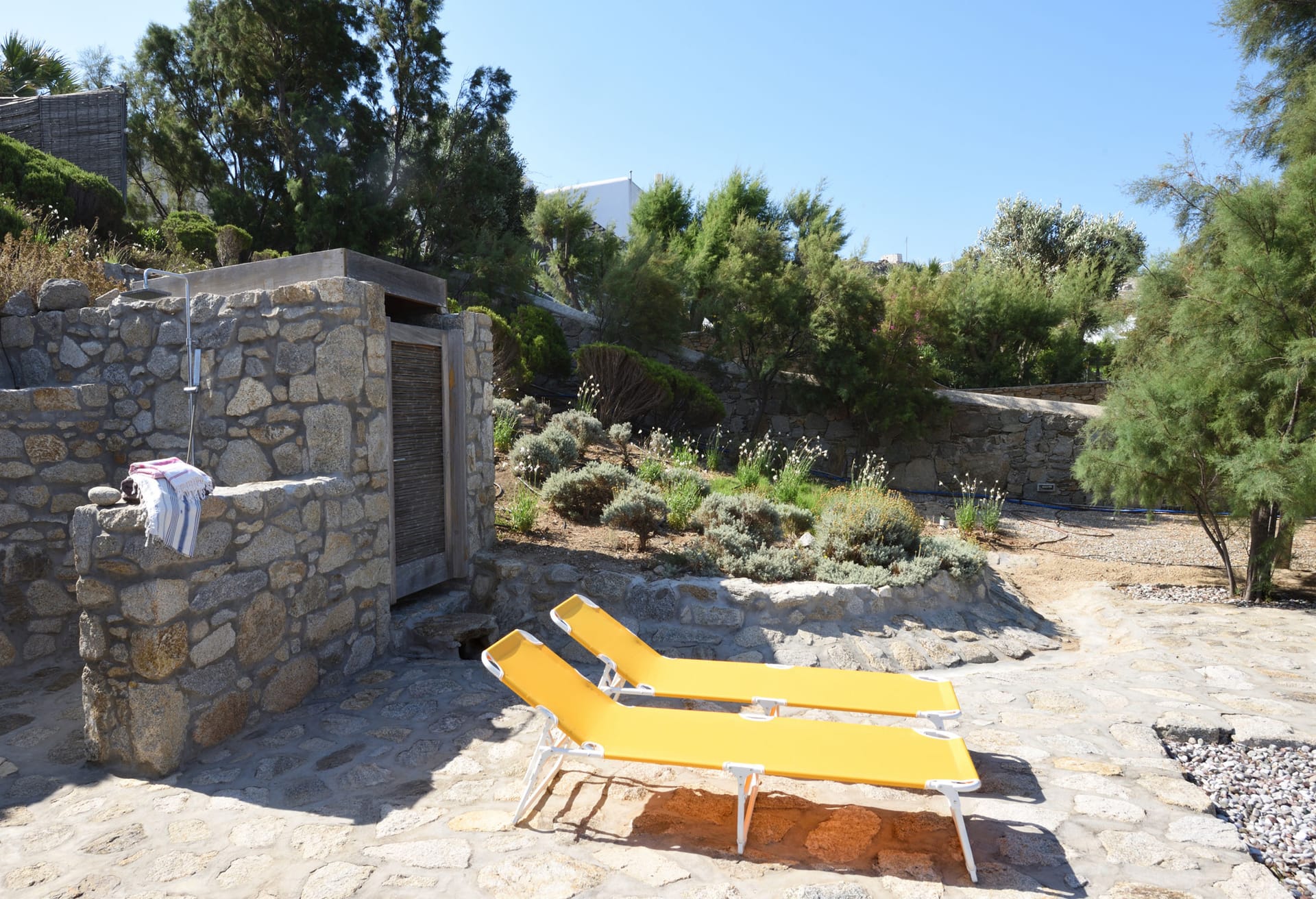 The guest house is independent and has an open-plan layout with two double beds. A zig-zag path leads down to a wide pavilion with a lounge area, the statement double pool with a shallow mirror pond, a sculptural stone table, and a small cabane. From here, guests can simply descend directly to the shore, a very rare feature for Mykonian villas.