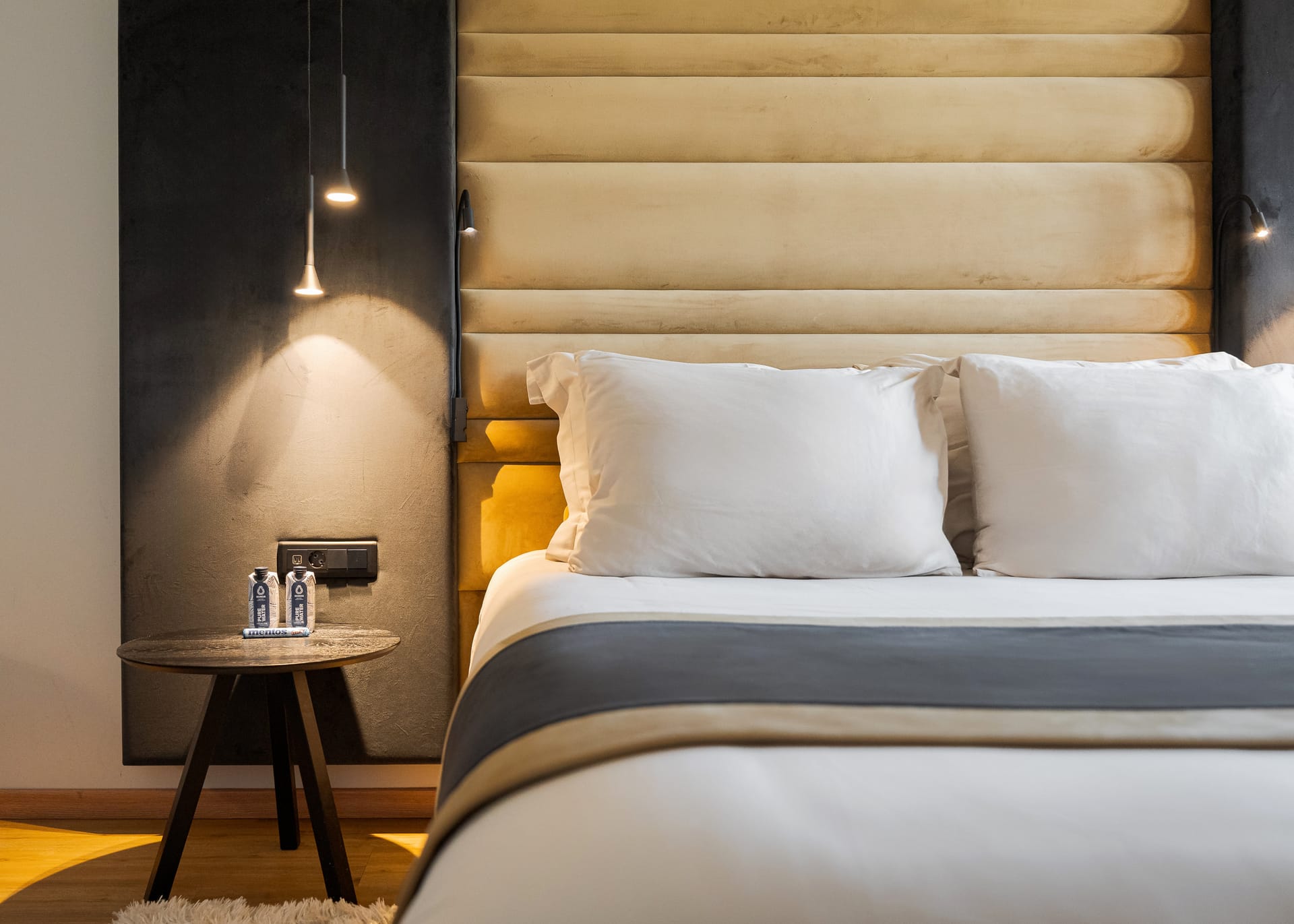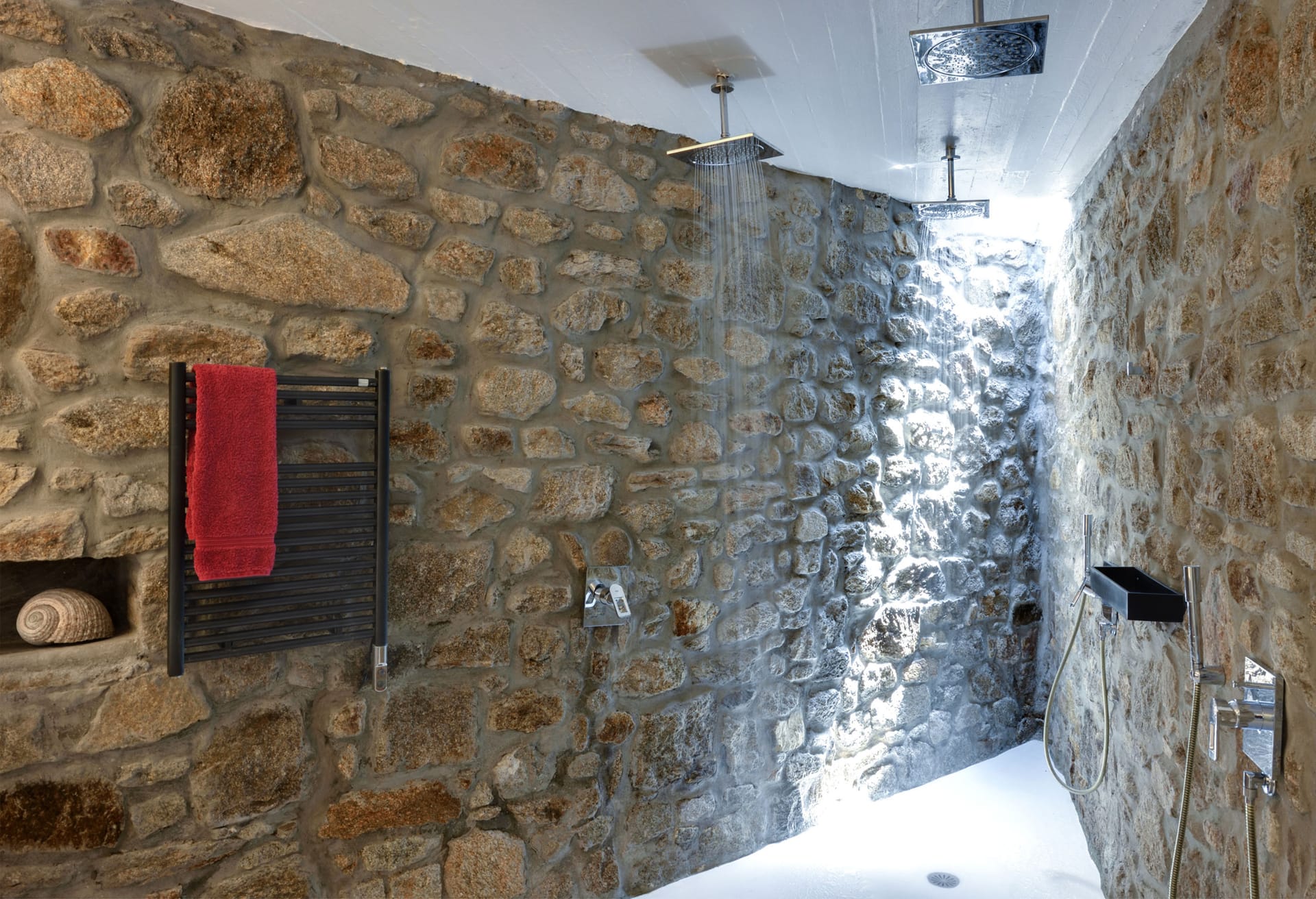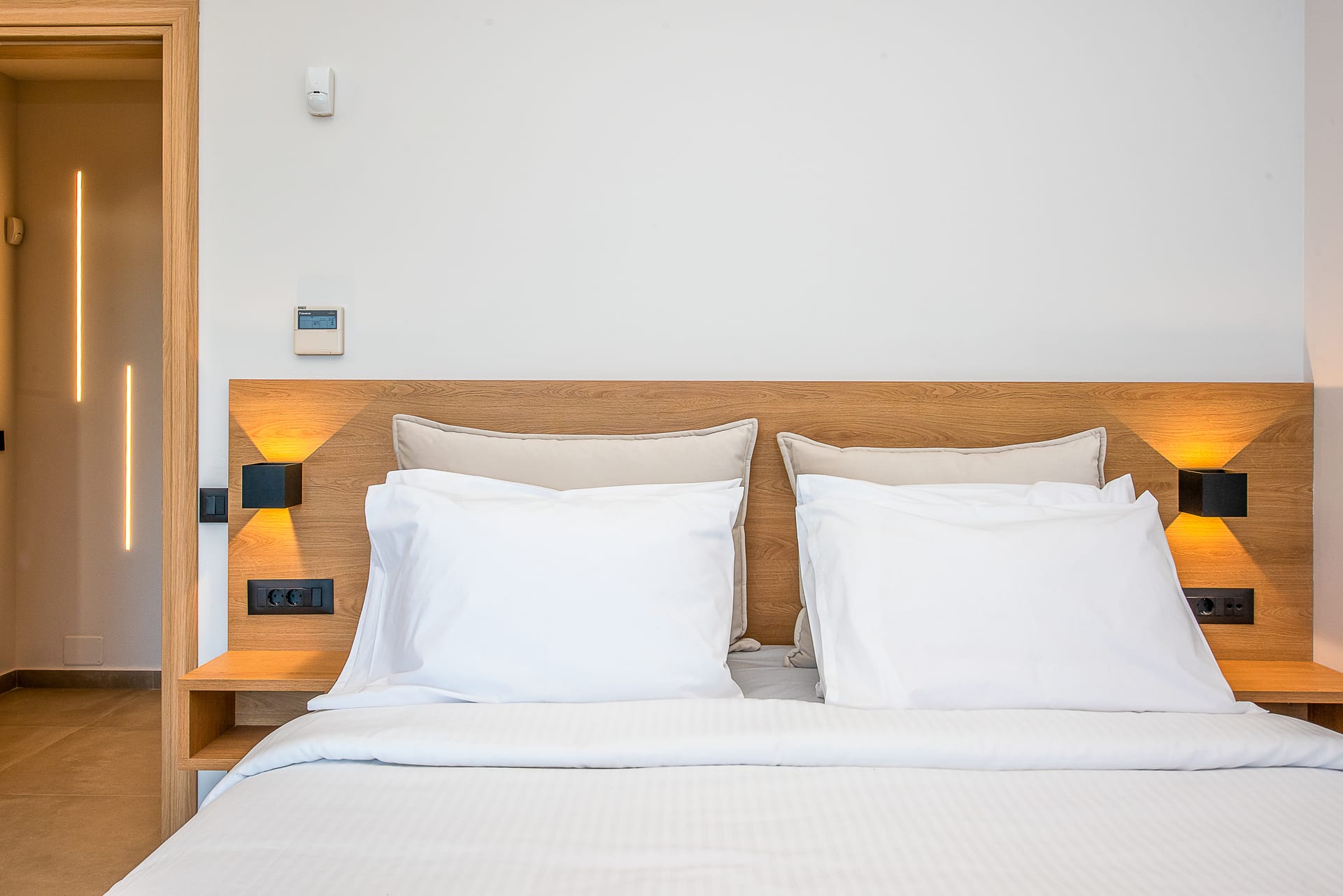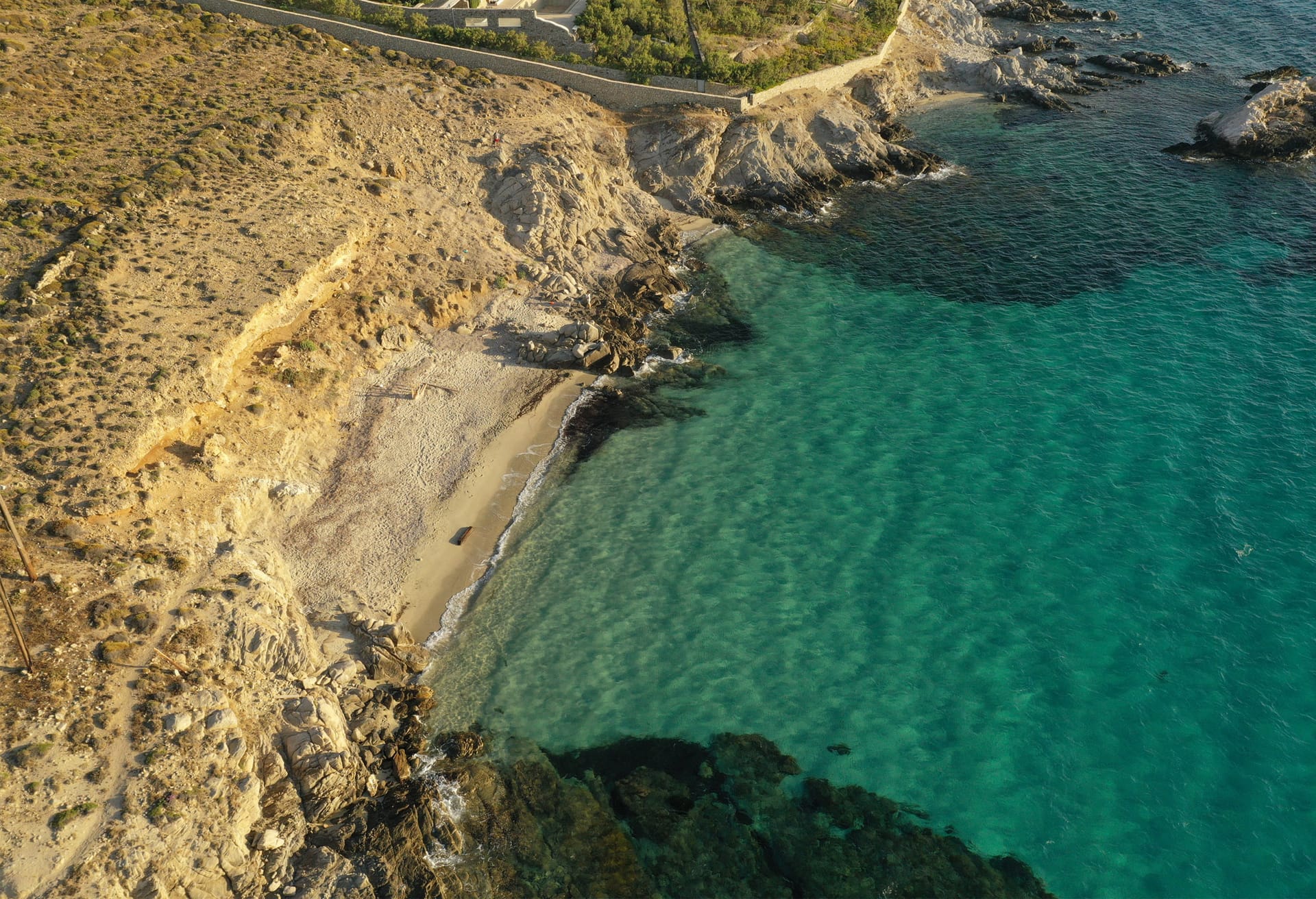 The guest house is independent and has an open-plan layout with two double beds. A zig-zag path leads down to a wide pavilion with a lounge area, the statement double pool with a shallow mirror pond, a sculptural stone table, and a small cabane. From here, guests can simply descend directly to the shore, a very rare feature for Mykonian villas.