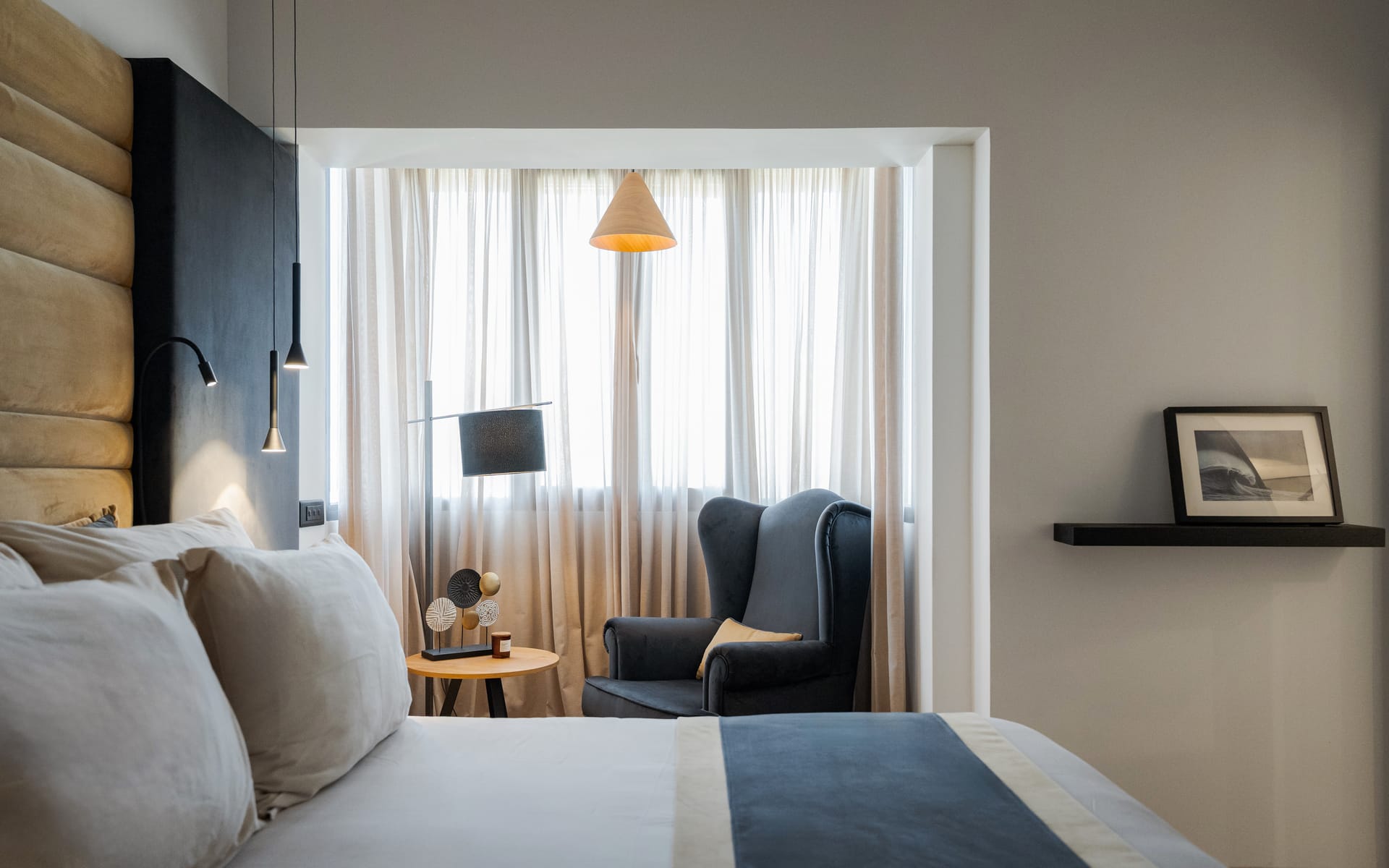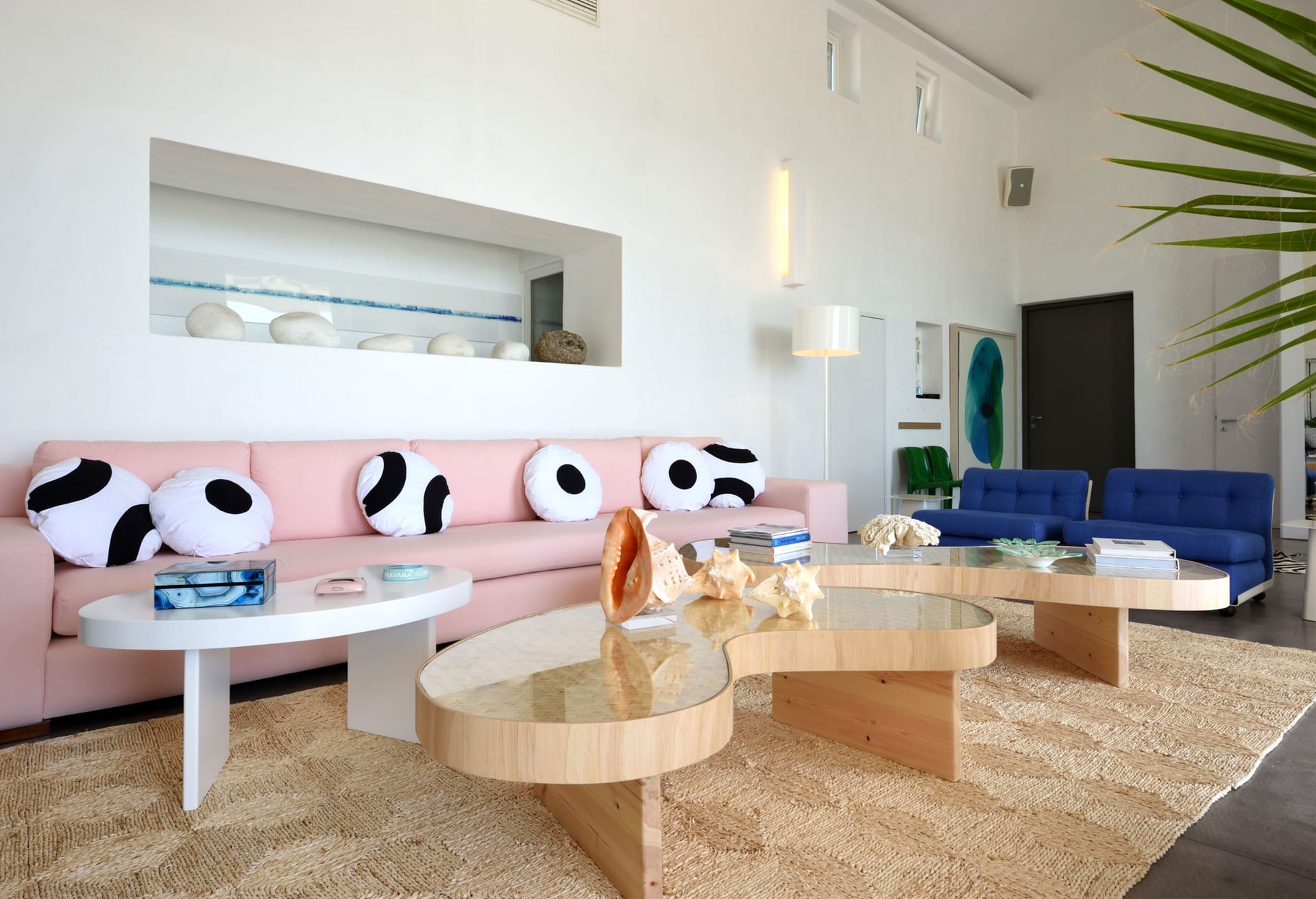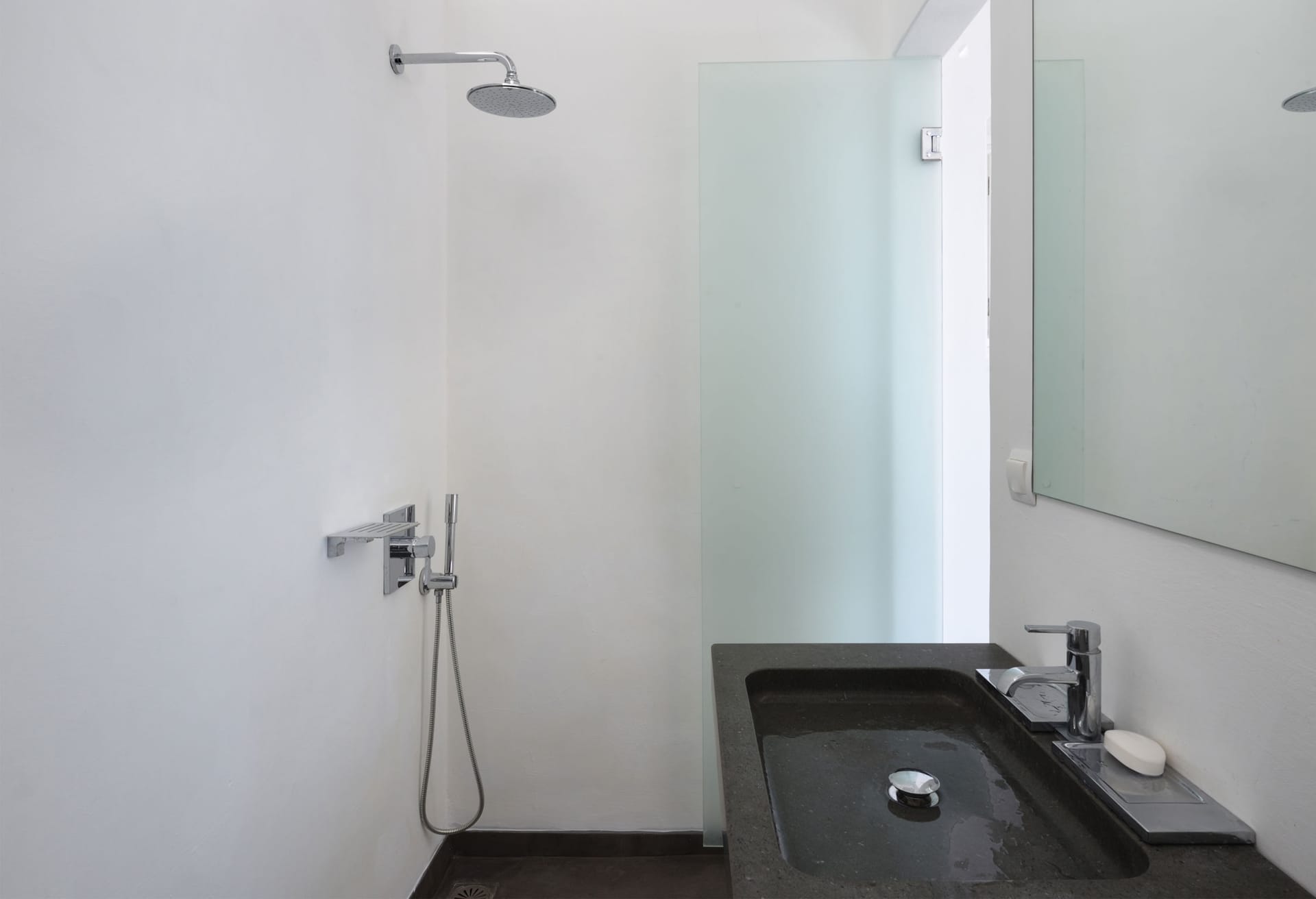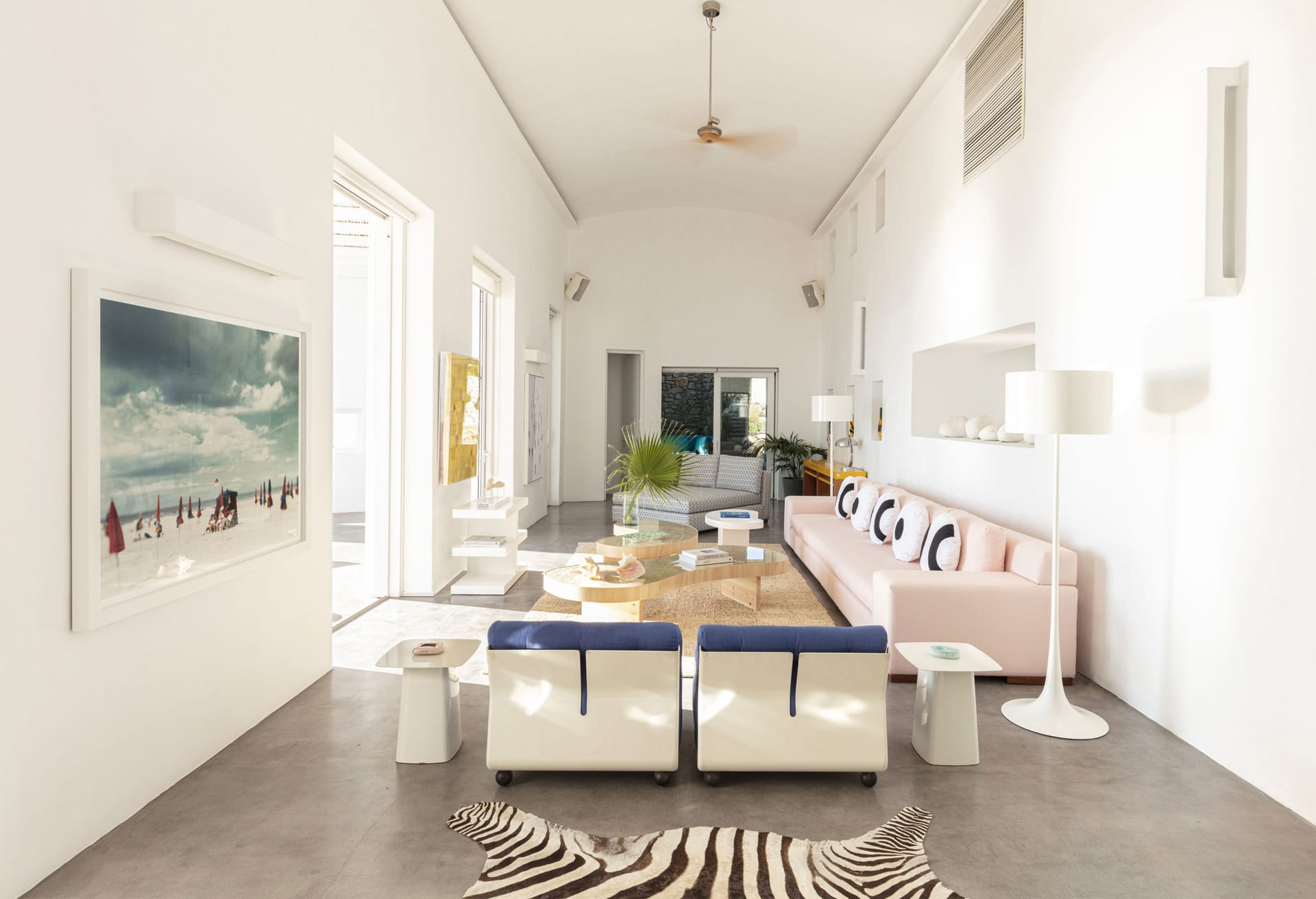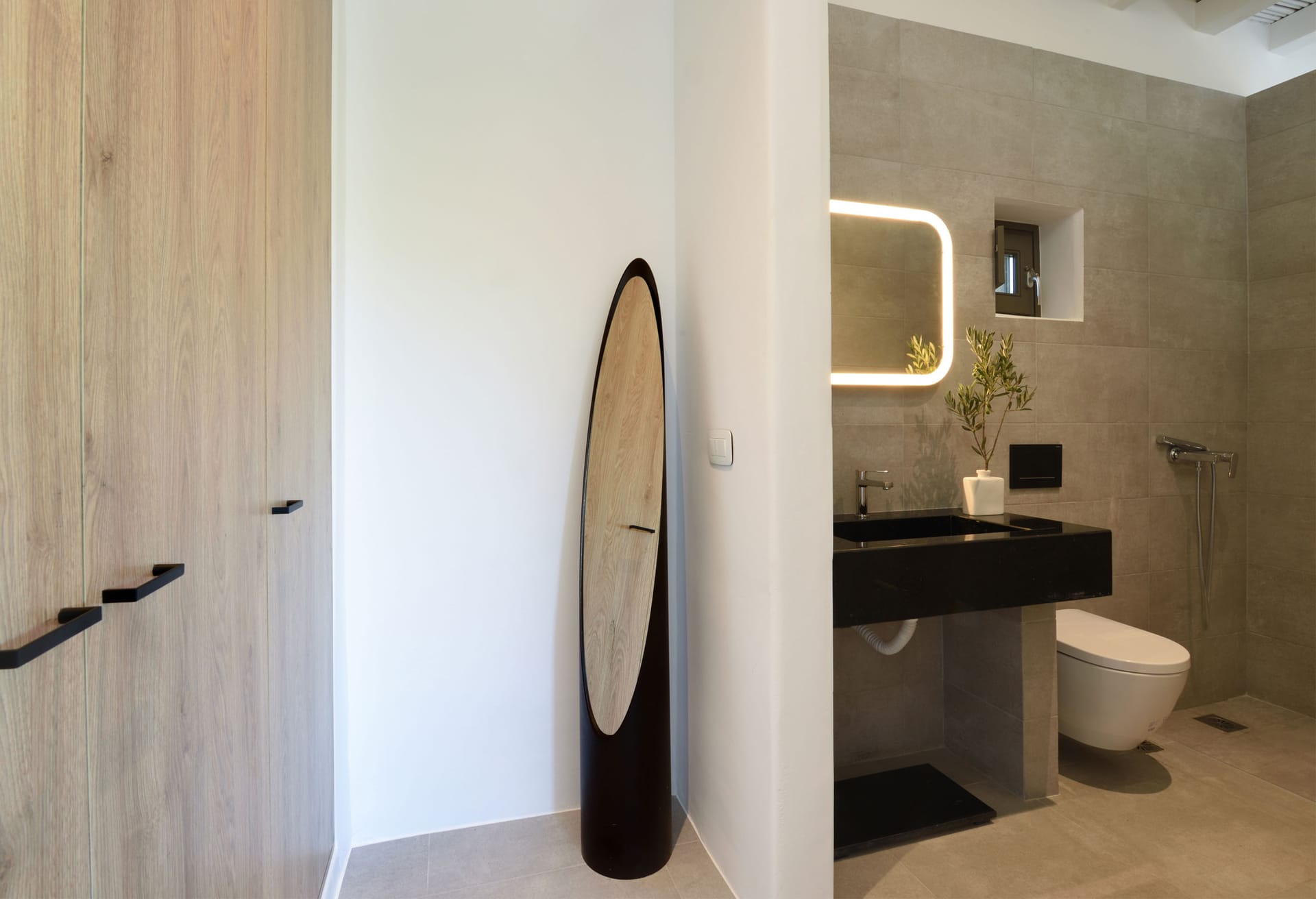 Natural wood and stone have been used selectively to balance out a palette of sleek materials like metal and glass and to imbue the overall design with a local character that is in dialogue with its surroundings. All main living spaces are tastefully decorated with a selection of modern furniture and art that combine cheerful, summery colors with neutral tones of sand, grey, and white. The living areas connect directly to the courtyard, creating a seamless flow between the inside and outside that is especially pleasant throughout the summer season.