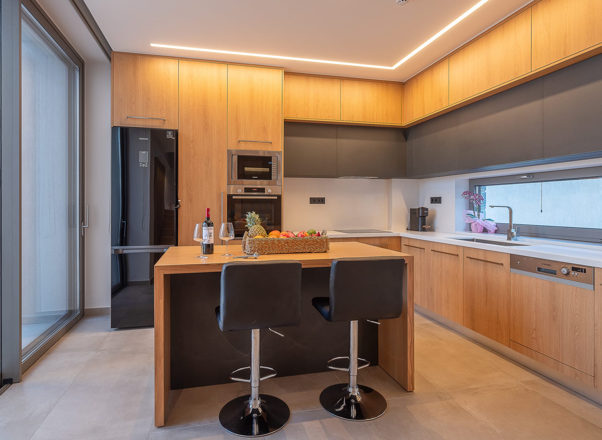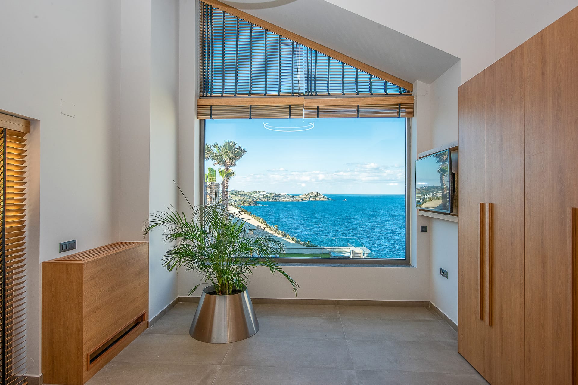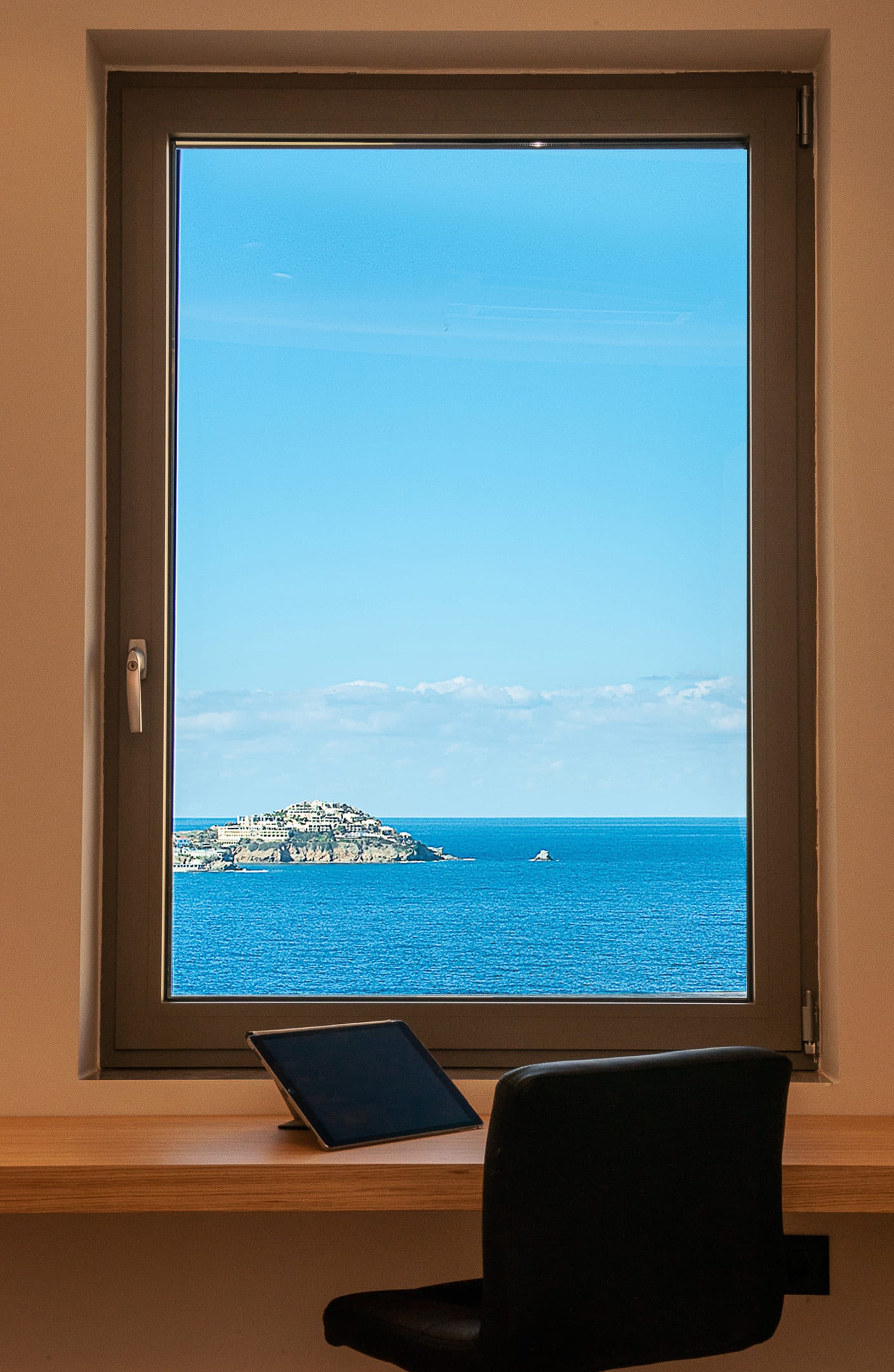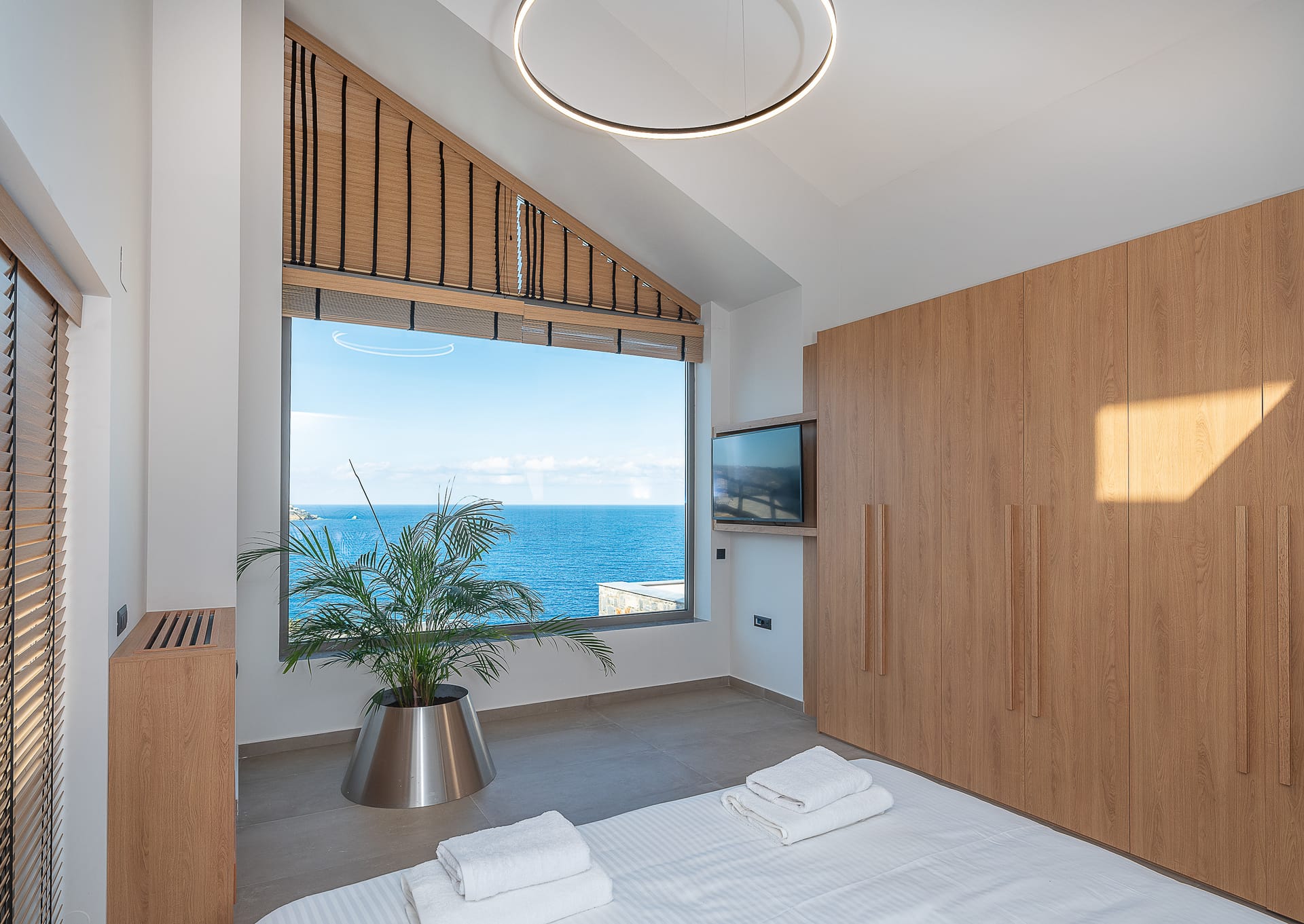 Bedroom 1 (master) (50 sqm) = 1 double bed, A/C en suite bathroom with double sinks & shower, walk-in closet, exterior jacuzzi, terrace with sun-loungers, study room, sea view & sunset view