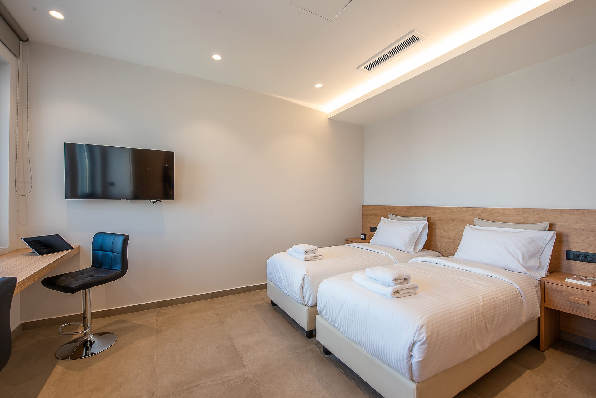 Bedroom 2 (25 sqm) = 2 single beds convertible in 1 double bed, A/C, en suite bathroom with double sinks & shower, veranda with sun-loungers, sea view & sunset view