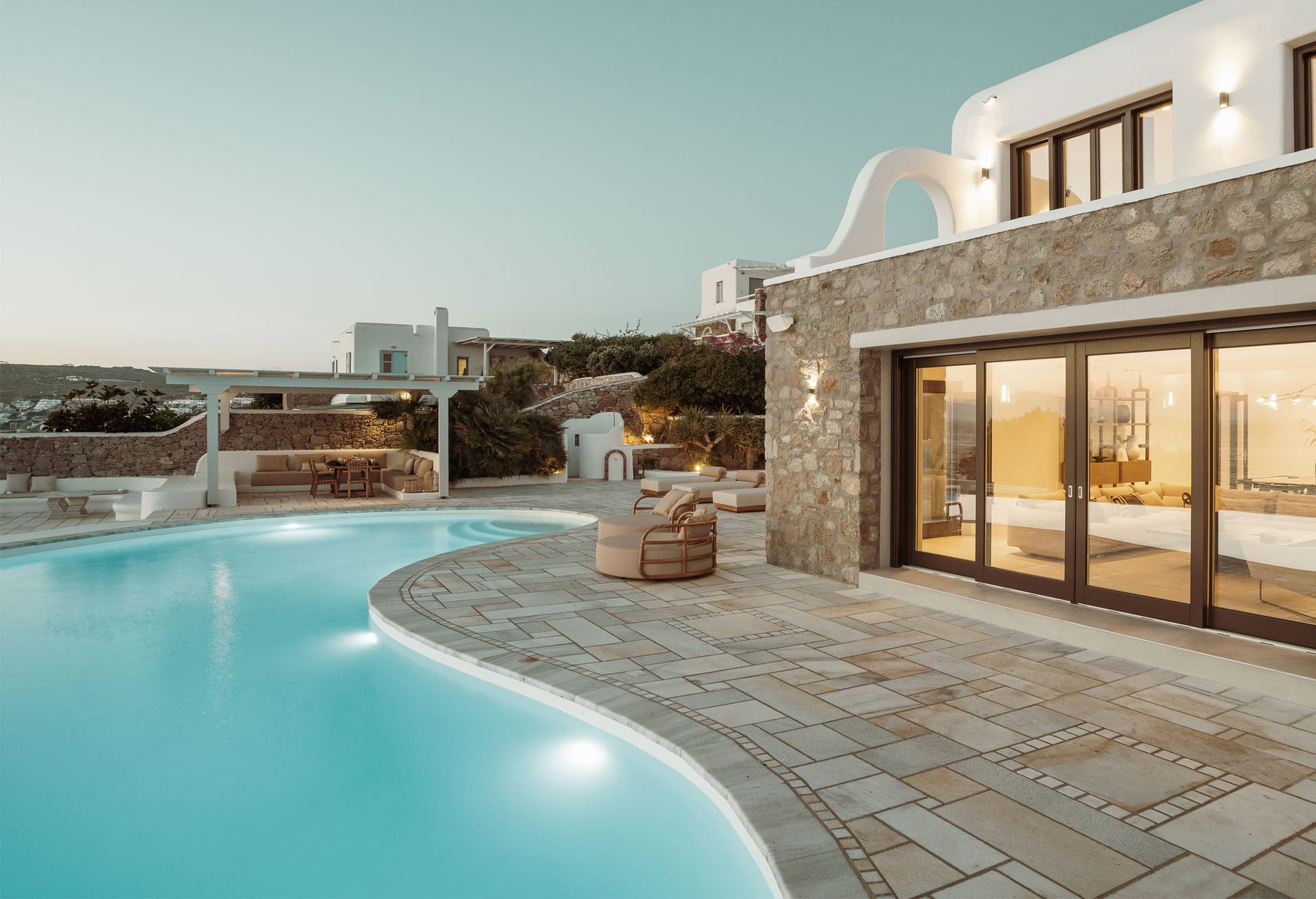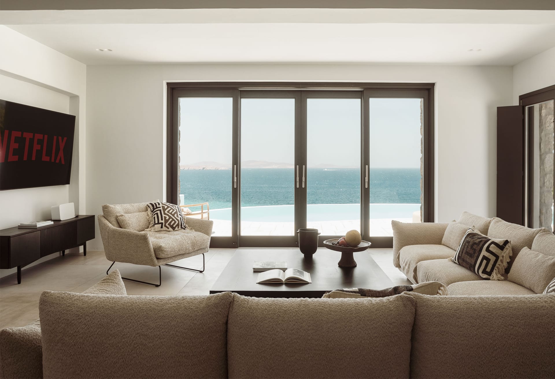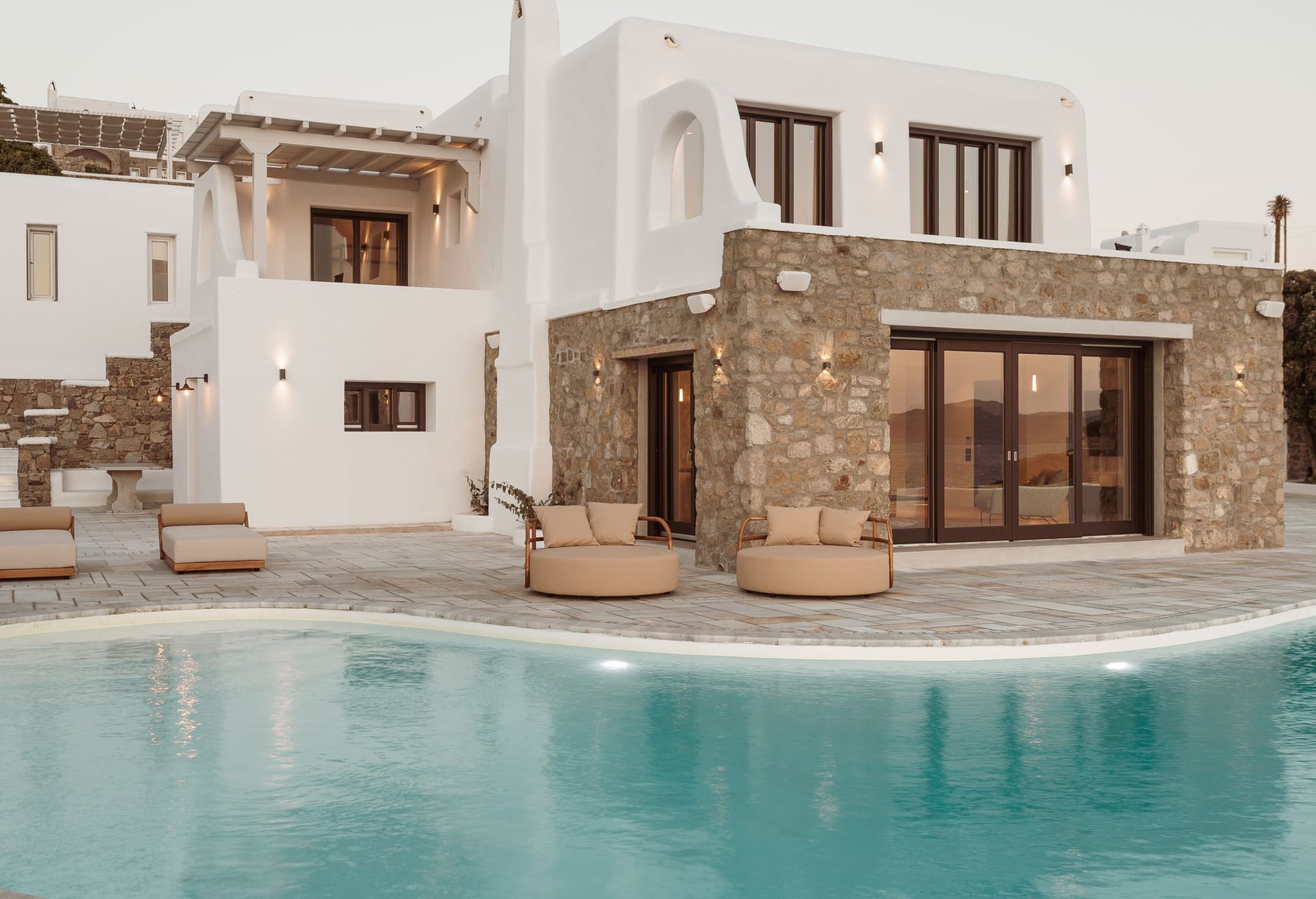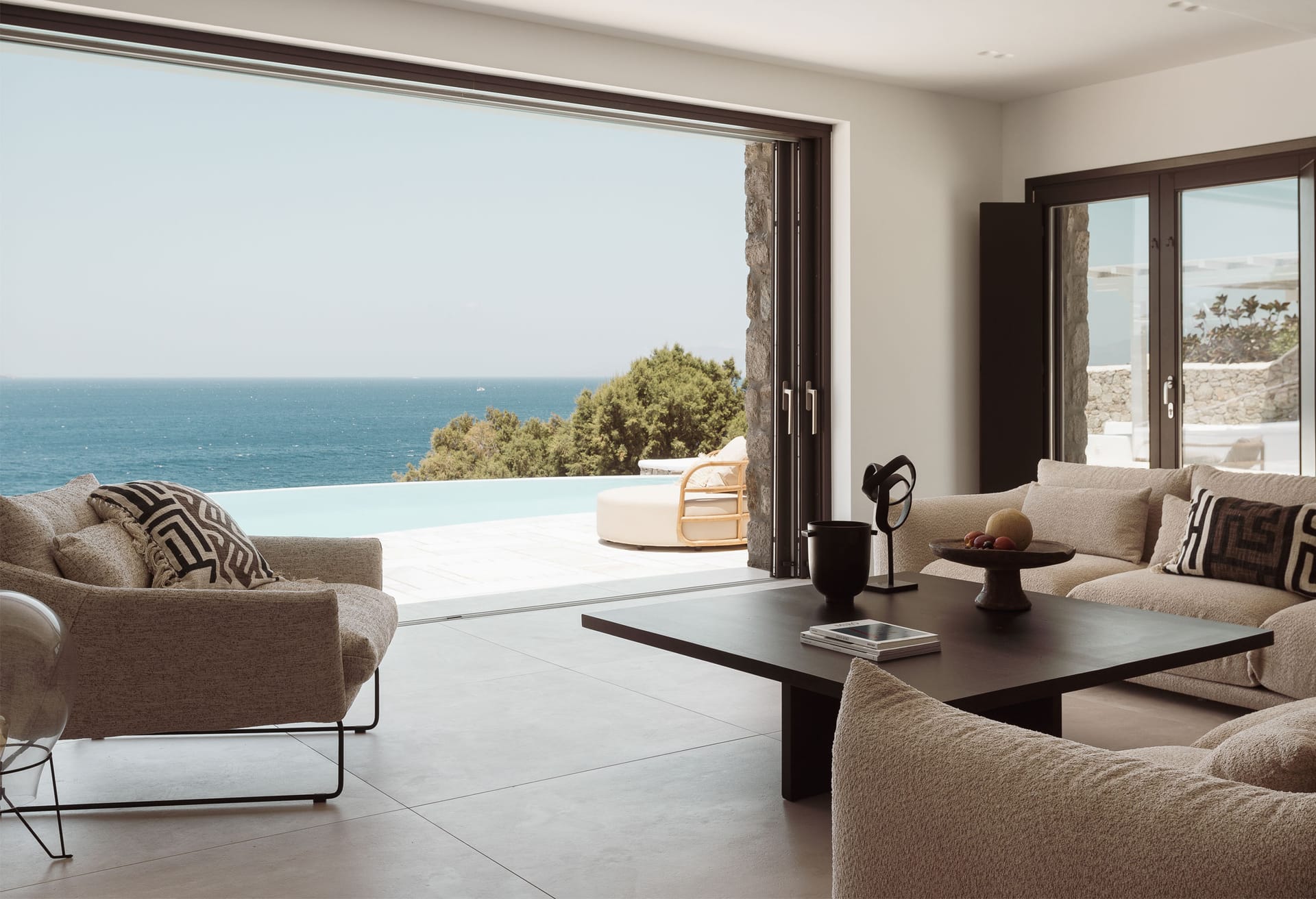 The construction and architecture of the villa is a flawless combination of modern and traditional Mykonian style.
