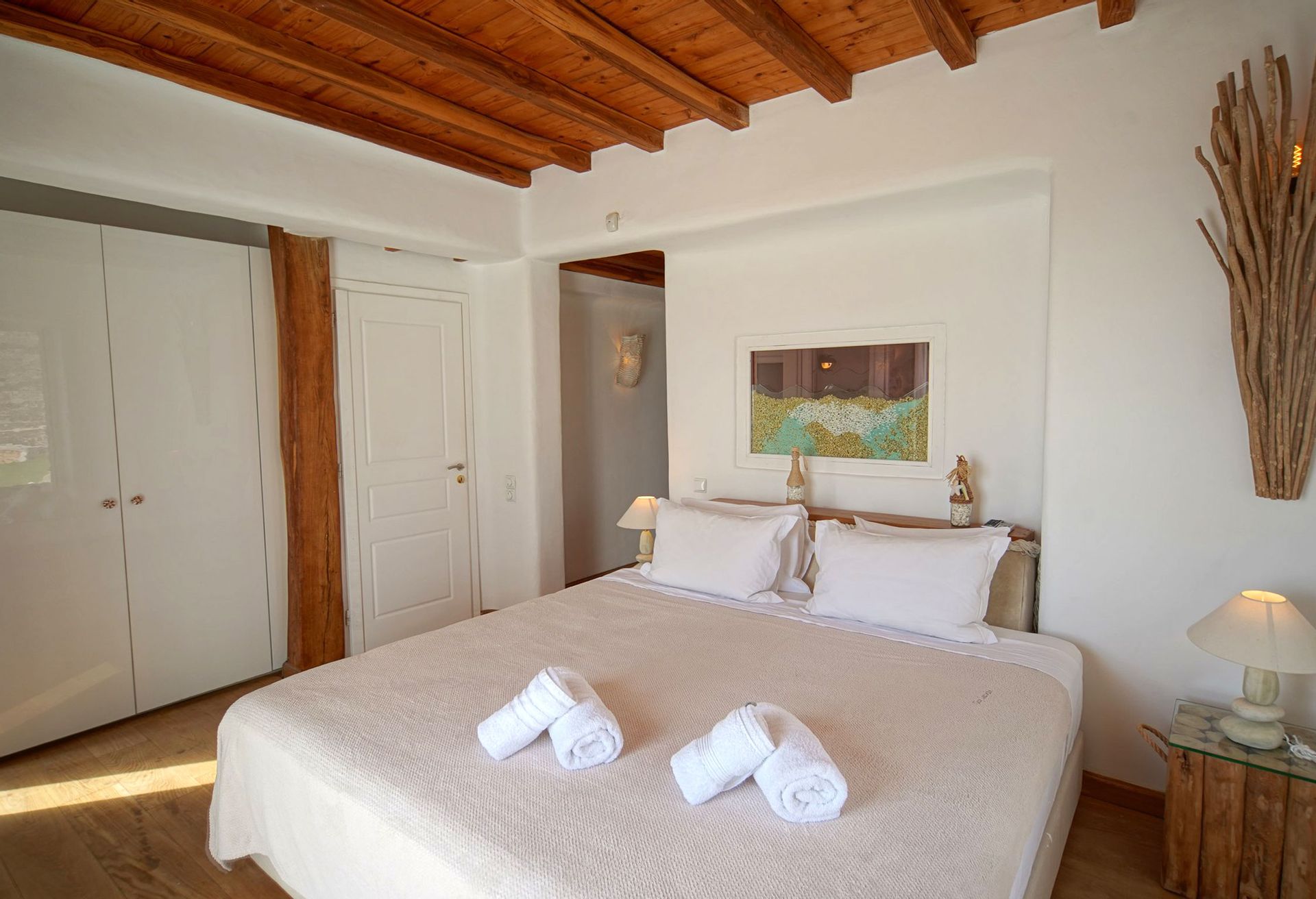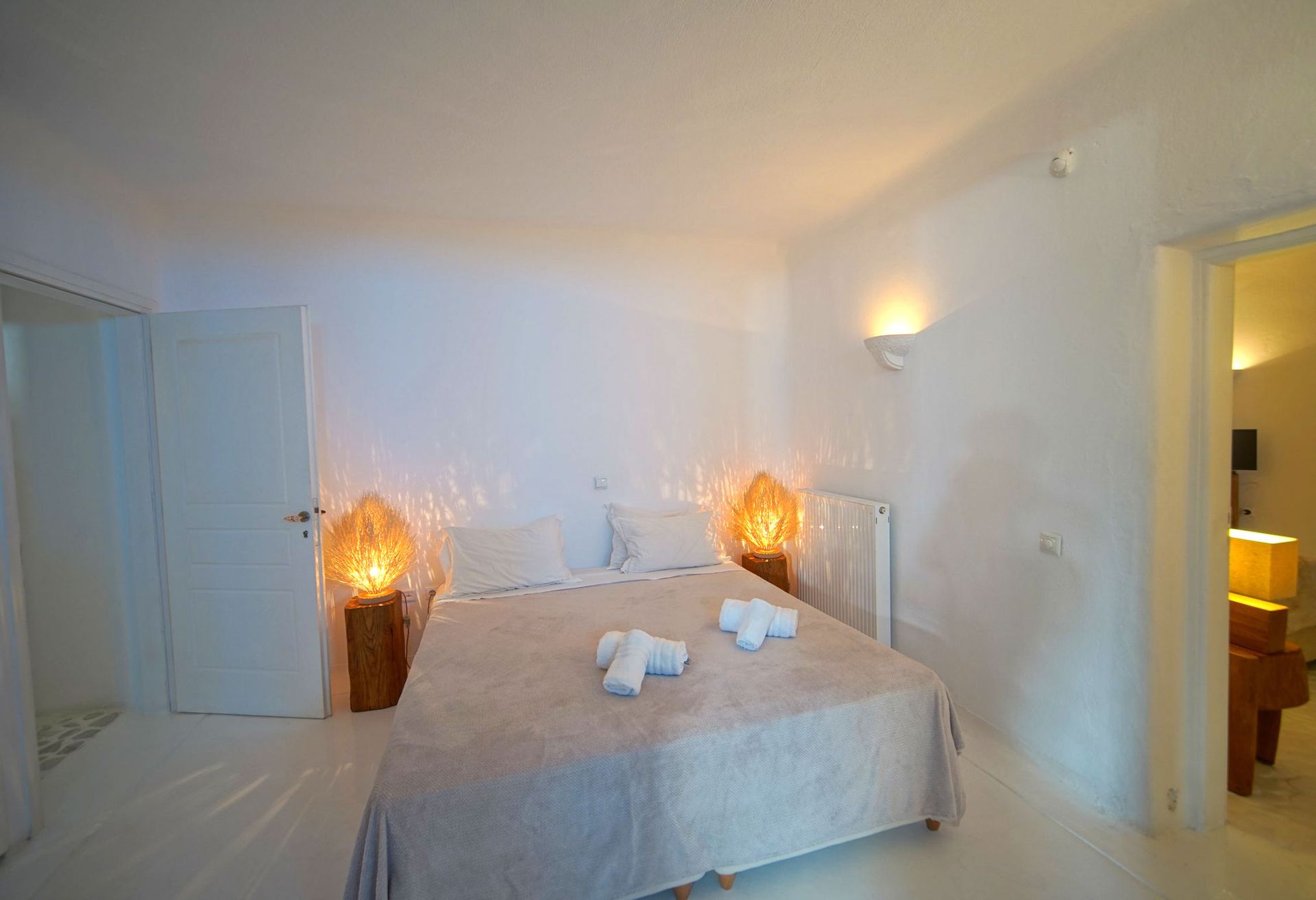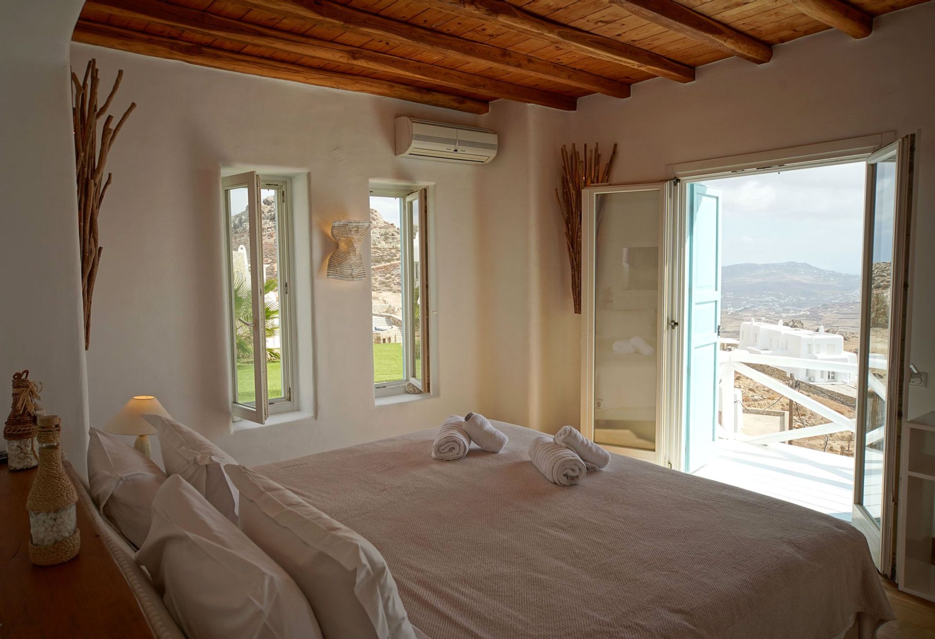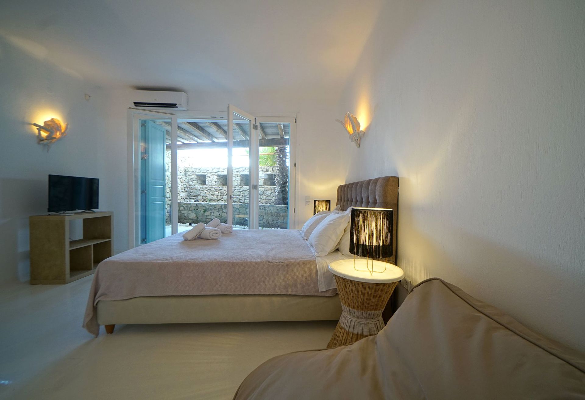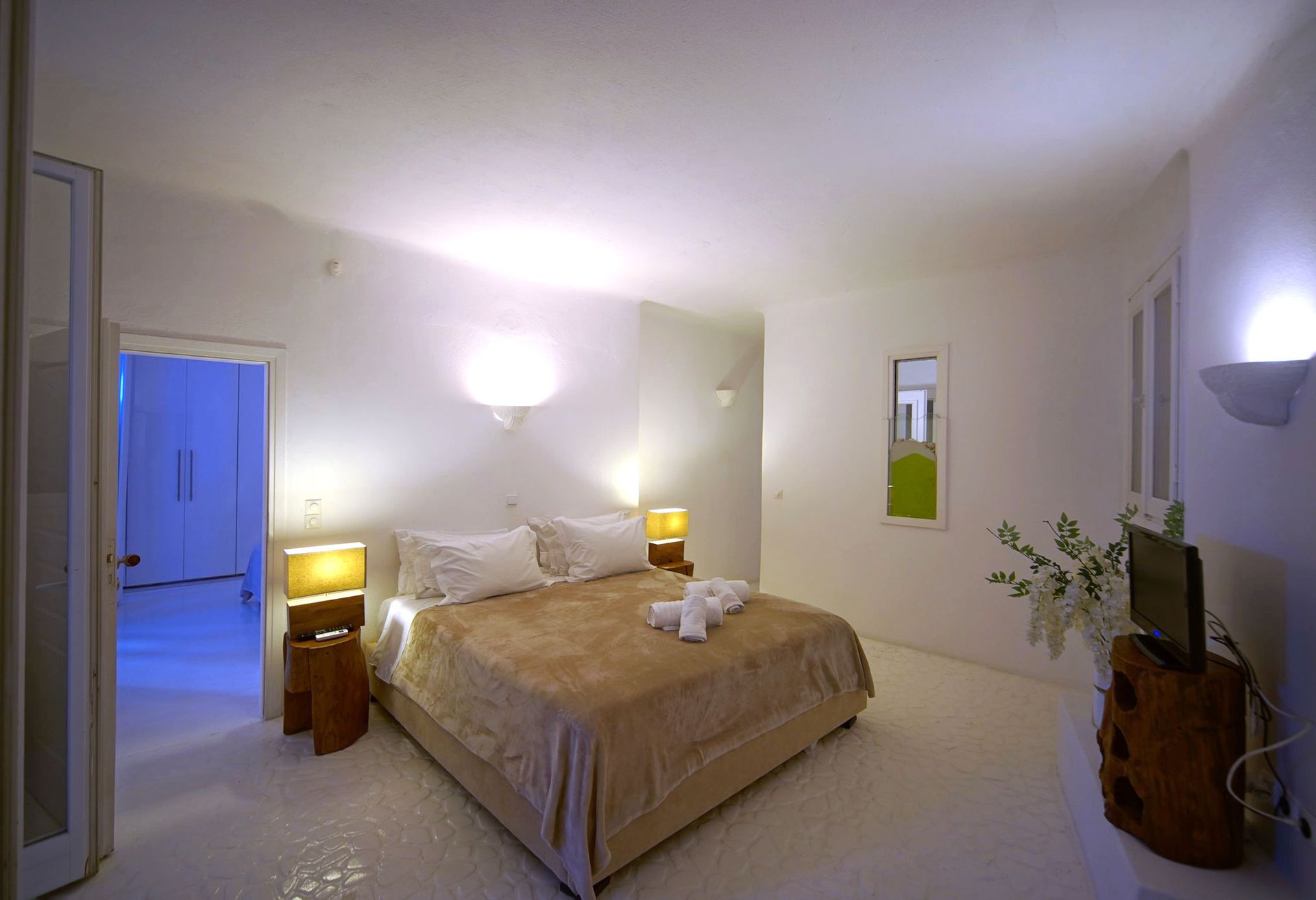 This luxurious Mykonian Villa accommodation provides delightfully designed rooms for couples with view to the captivating town of Mykonos and the azure never ending sea. As soon as one walks through the villa’s private entrance which is secluded by pergolas and palm trees he steps into a private world of tranquil comfort and unrivaled luxury.