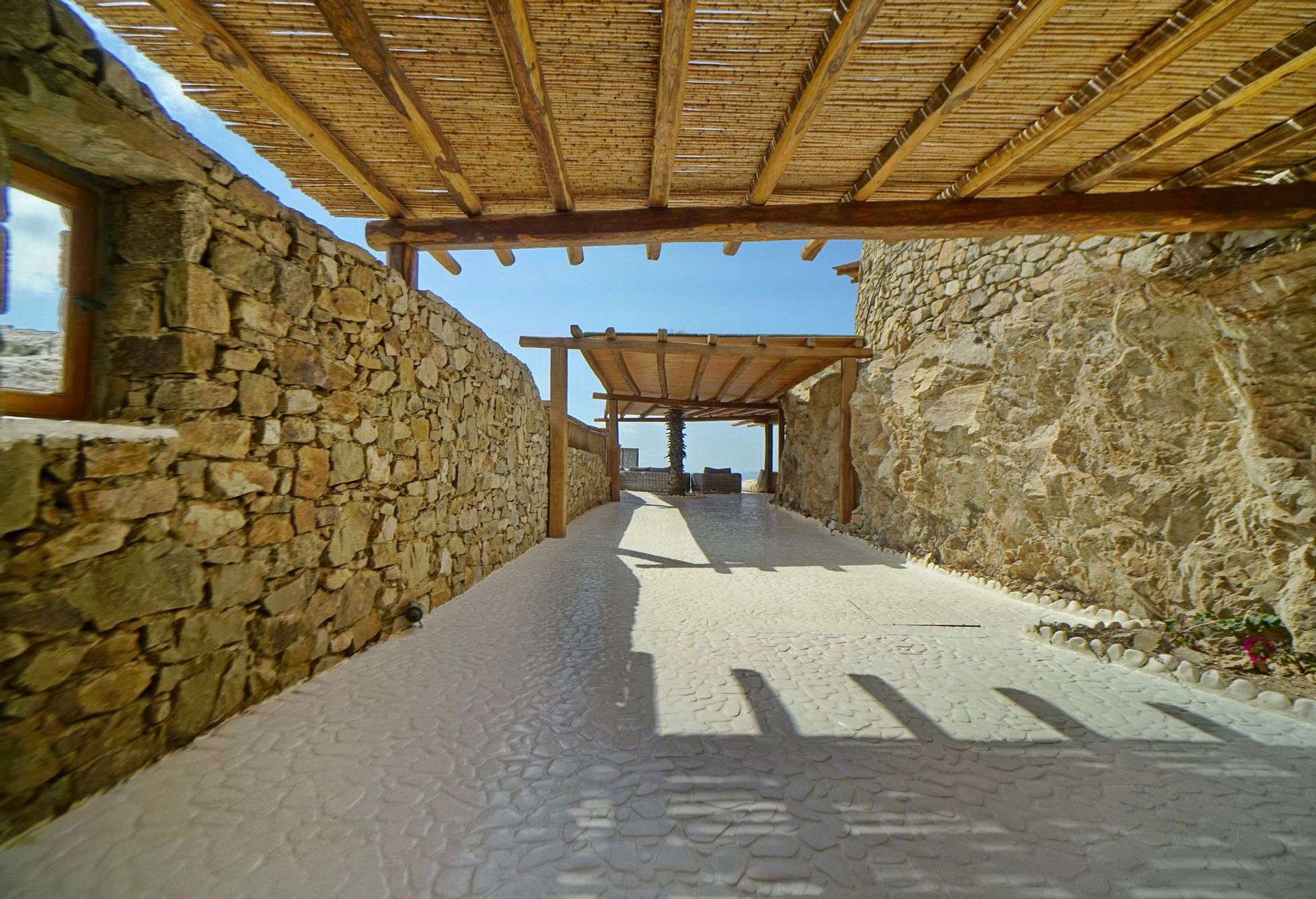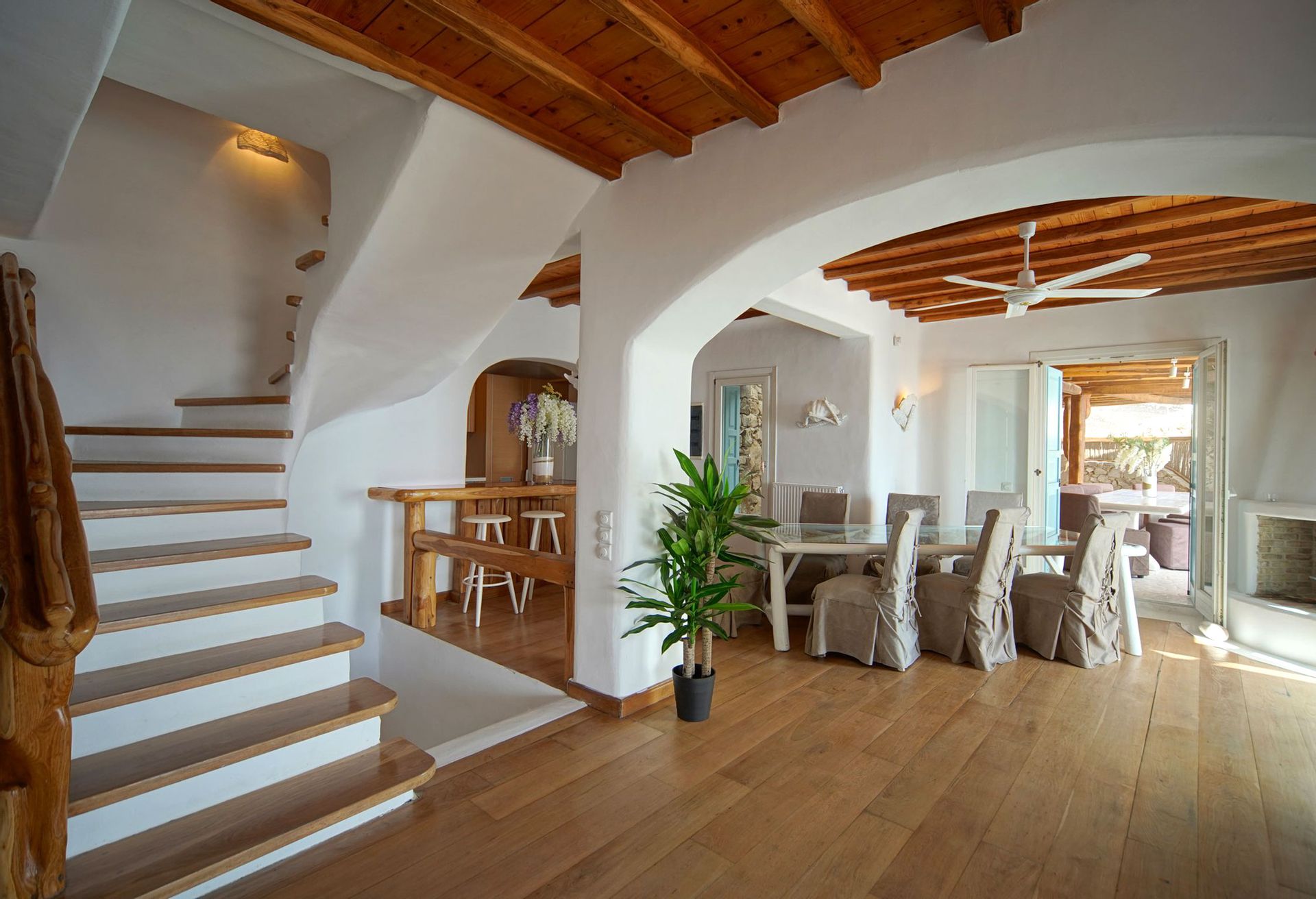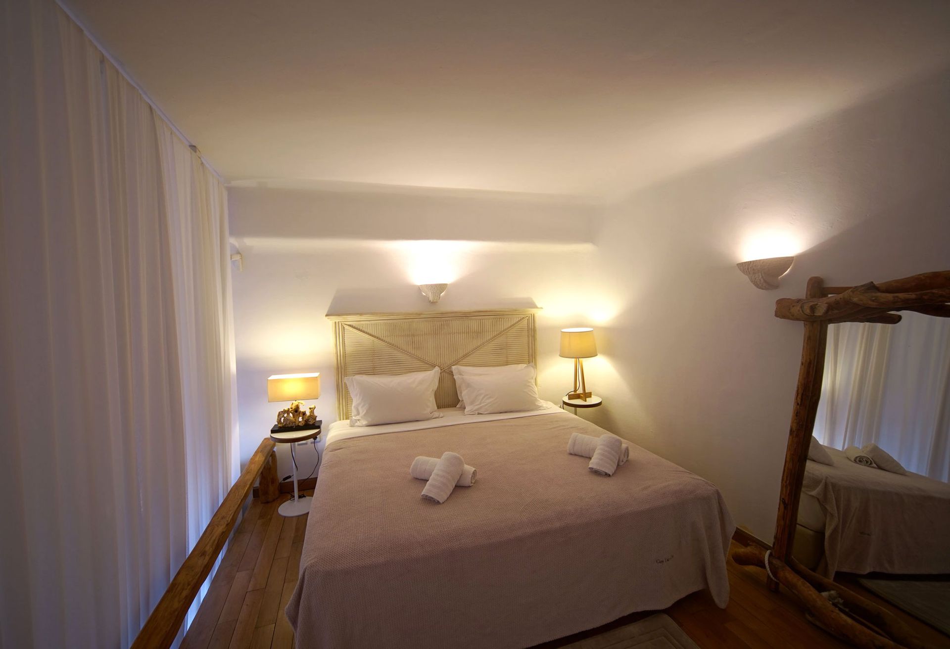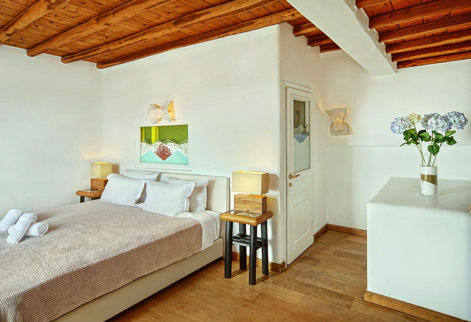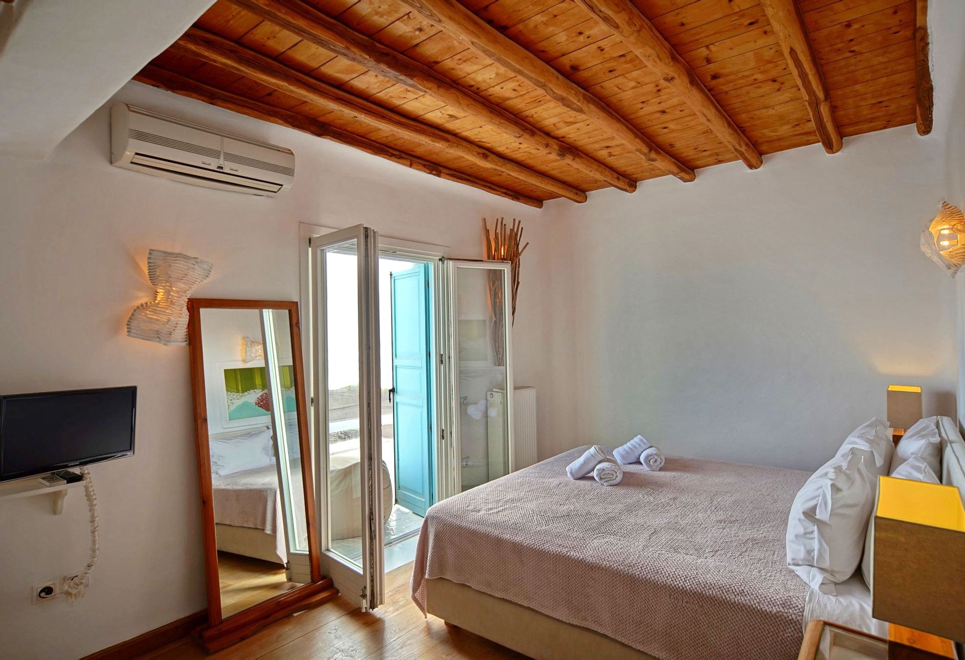 This luxurious Mykonian Villa accommodation provides delightfully designed rooms for couples with view to the captivating town of Mykonos and the azure never ending sea. As soon as one walks through the villa’s private entrance which is secluded by pergolas and palm trees he steps into a private world of tranquil comfort and unrivaled luxury.