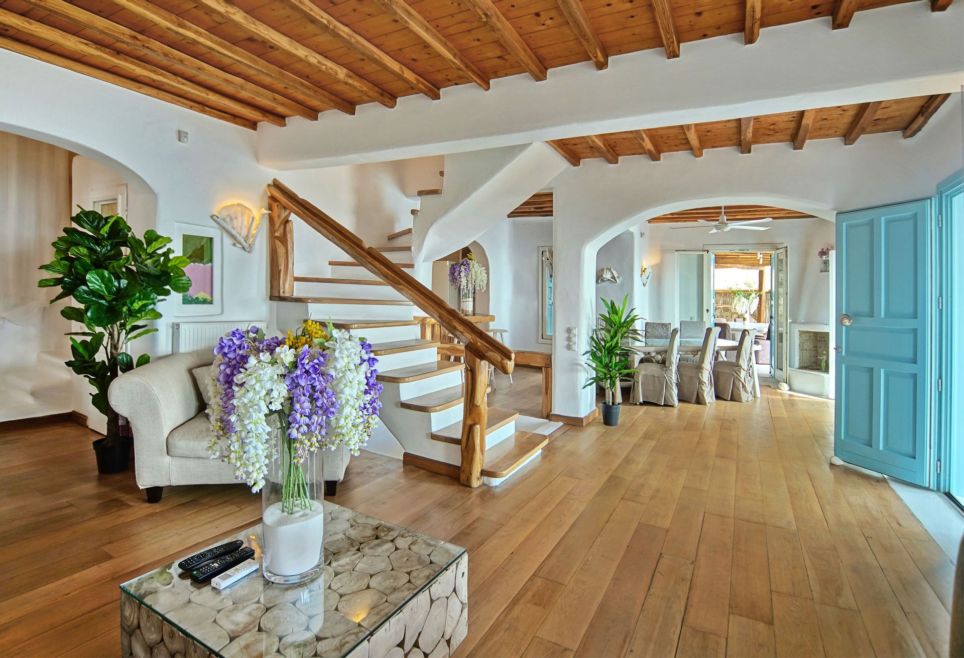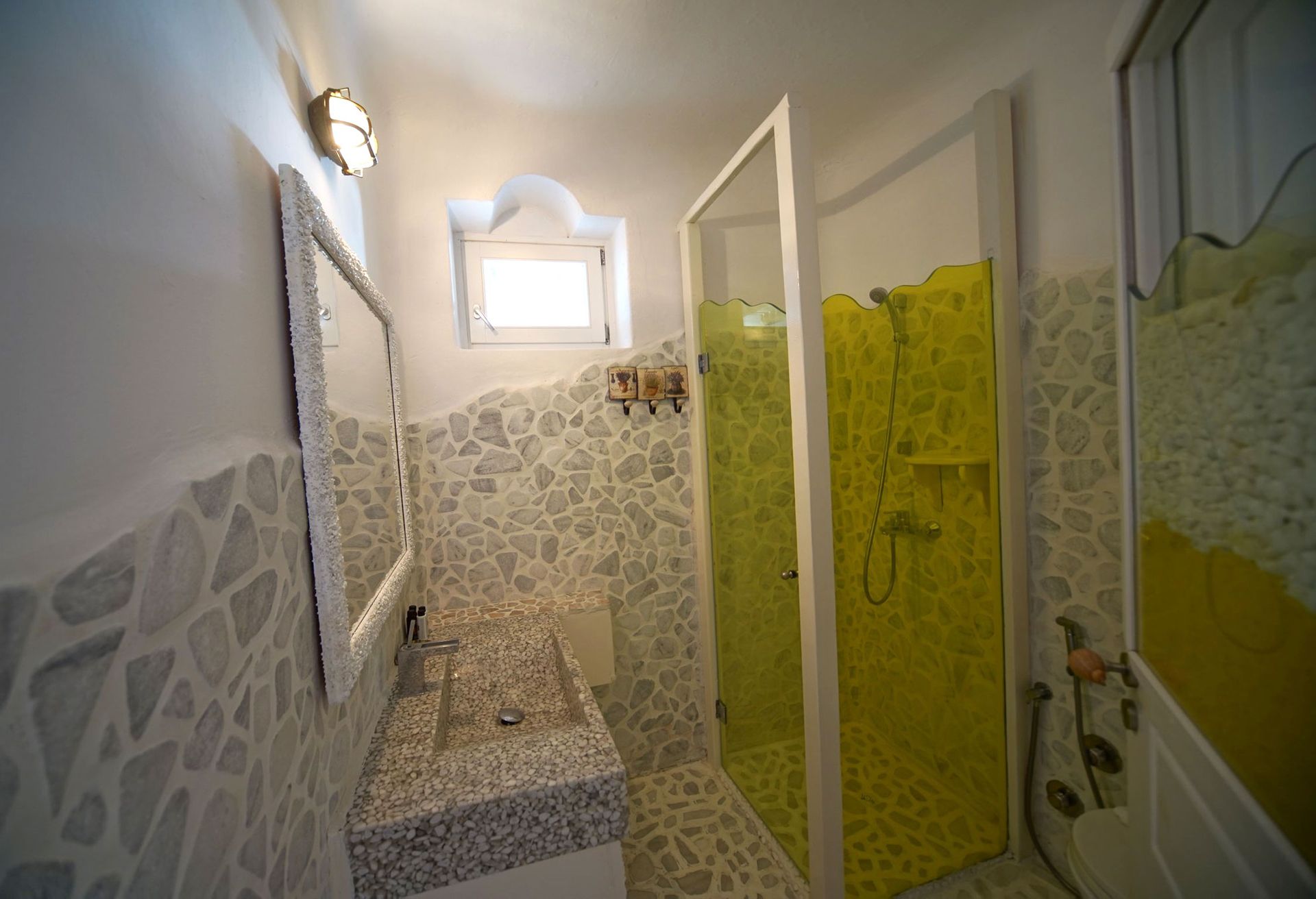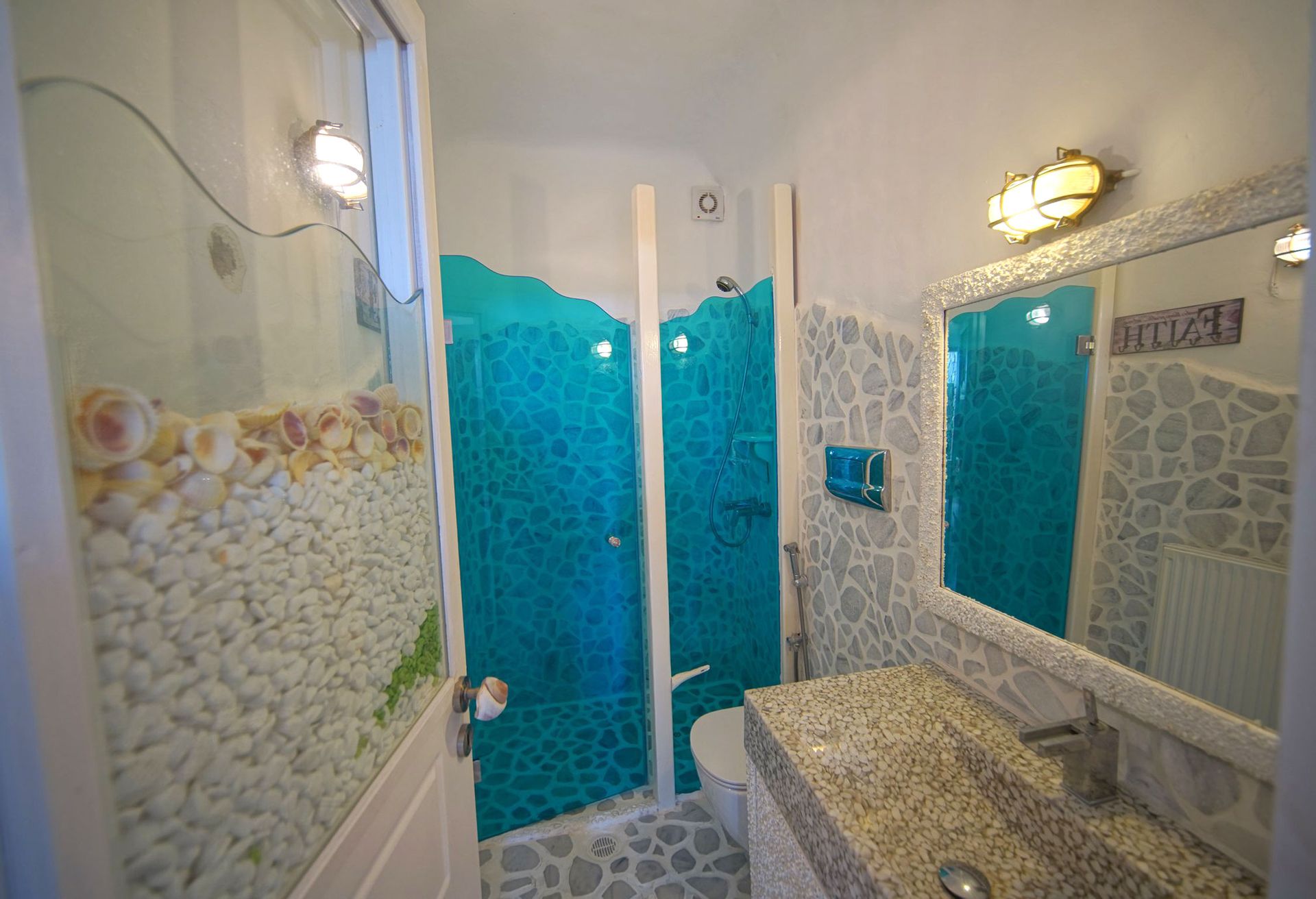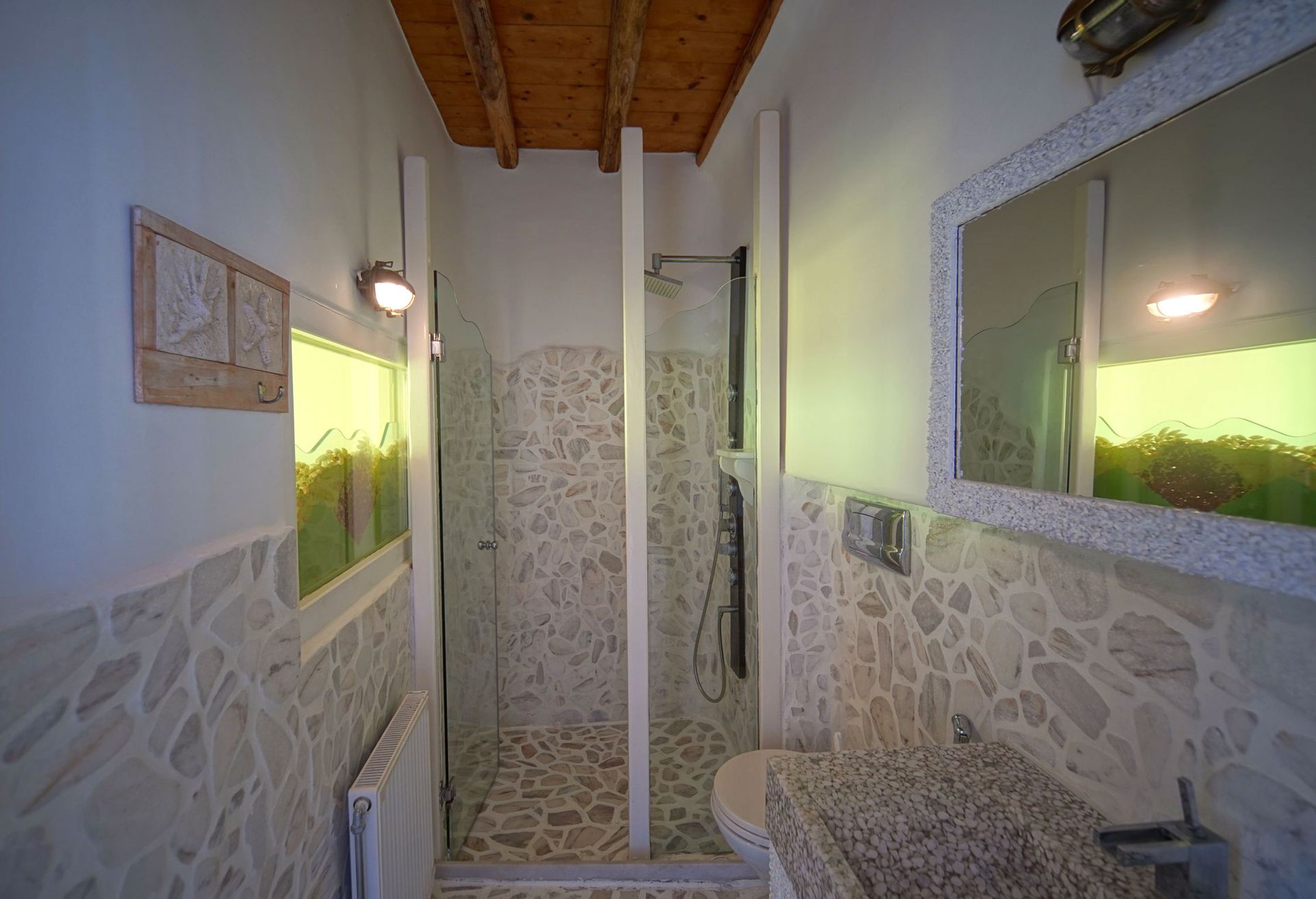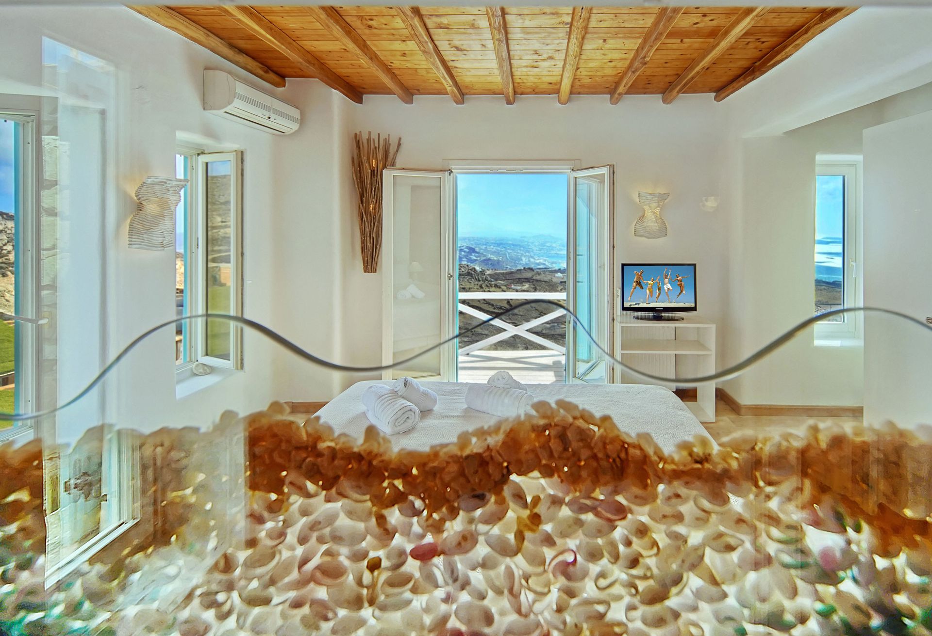 There are 2 king size suite rooms for couples and a small cozy room with a single bed ideal for one child, at the upper level and 3 king size suite bedrooms on the lower level all featuring their own uniquely designed private bathrooms. All bathrooms are exquisitely crafted with natural stones, sea elements and luxurious adornments and feature a power shower enclosed by colorful glass doors. The inimitable bathroom doors are filled with natural pebbles, sea shells and coral decorations and allow residents to enjoy the endless views to the azure sea.