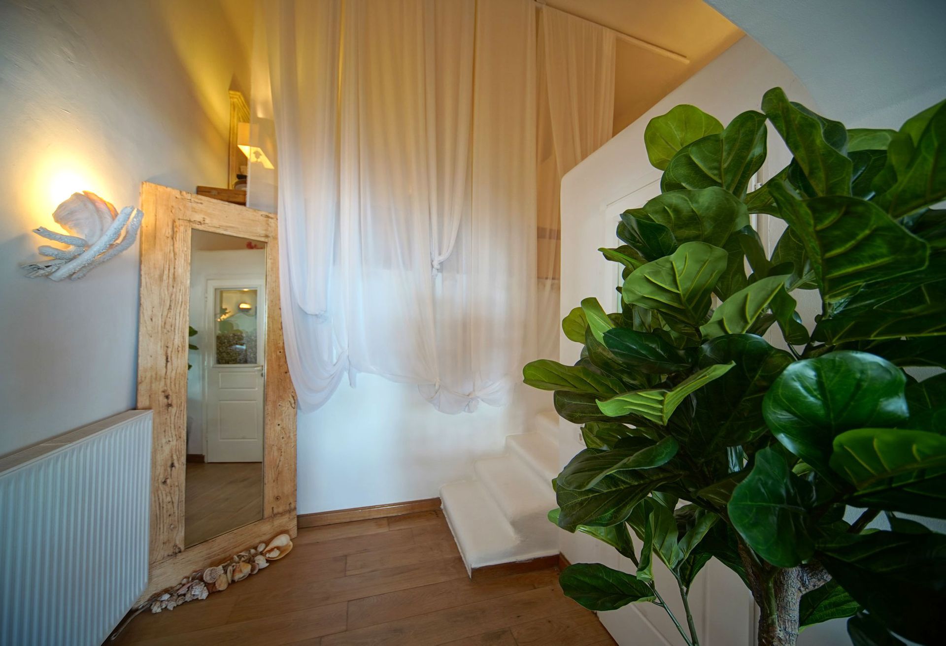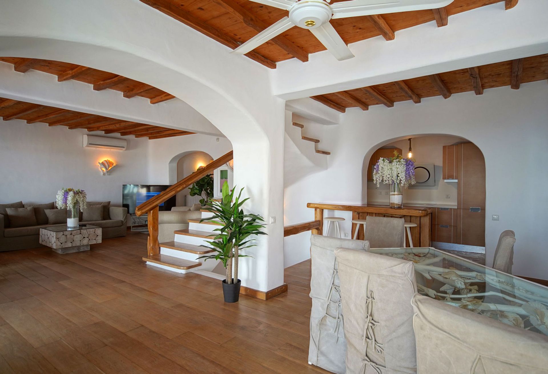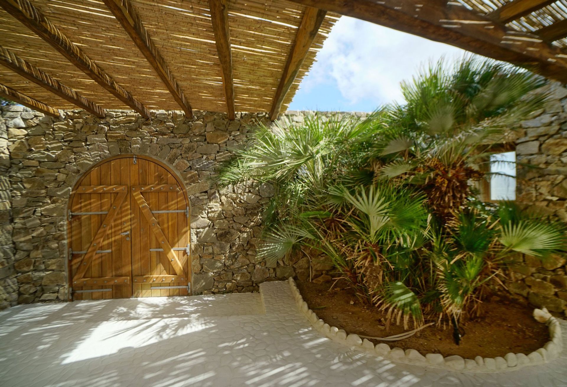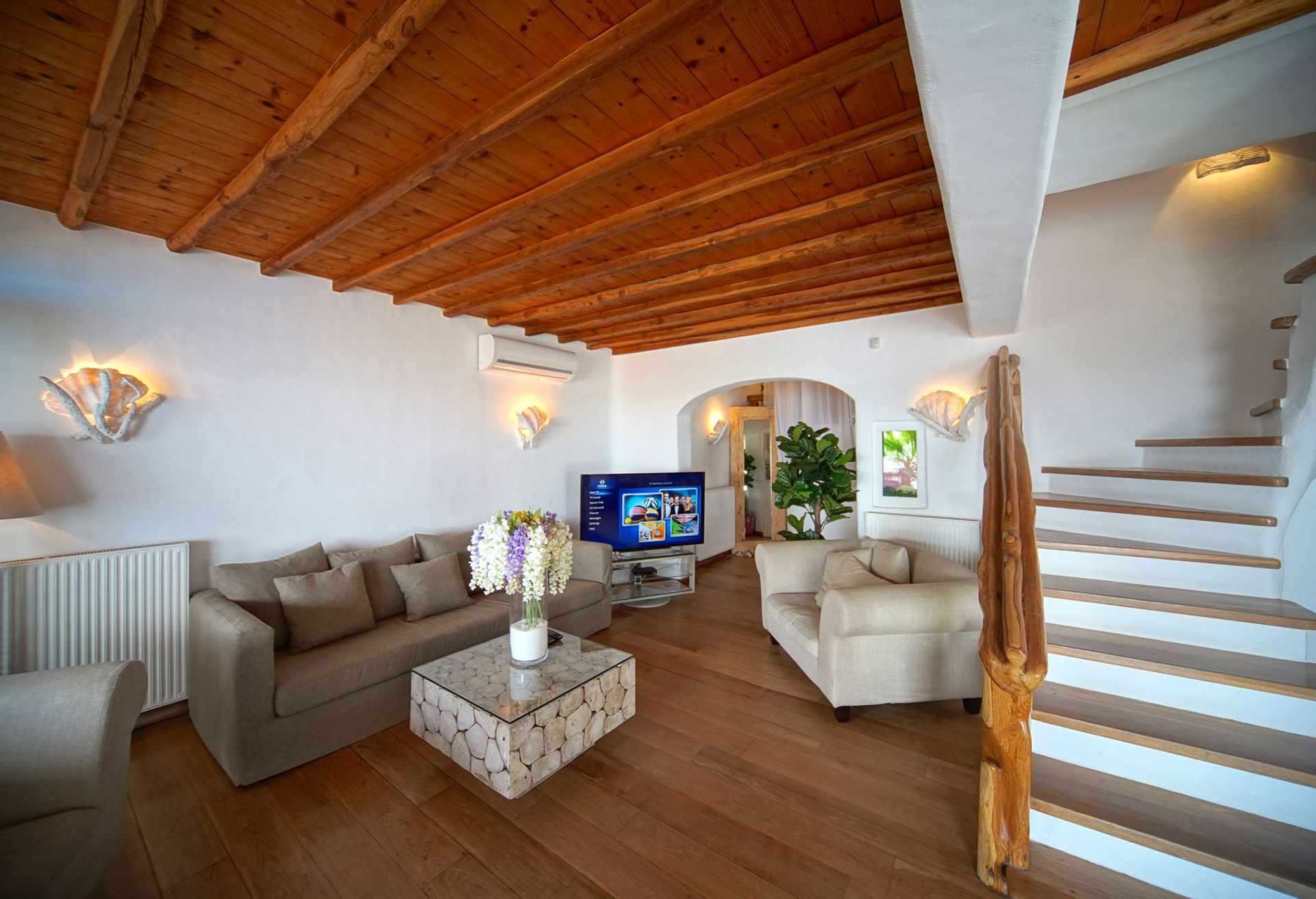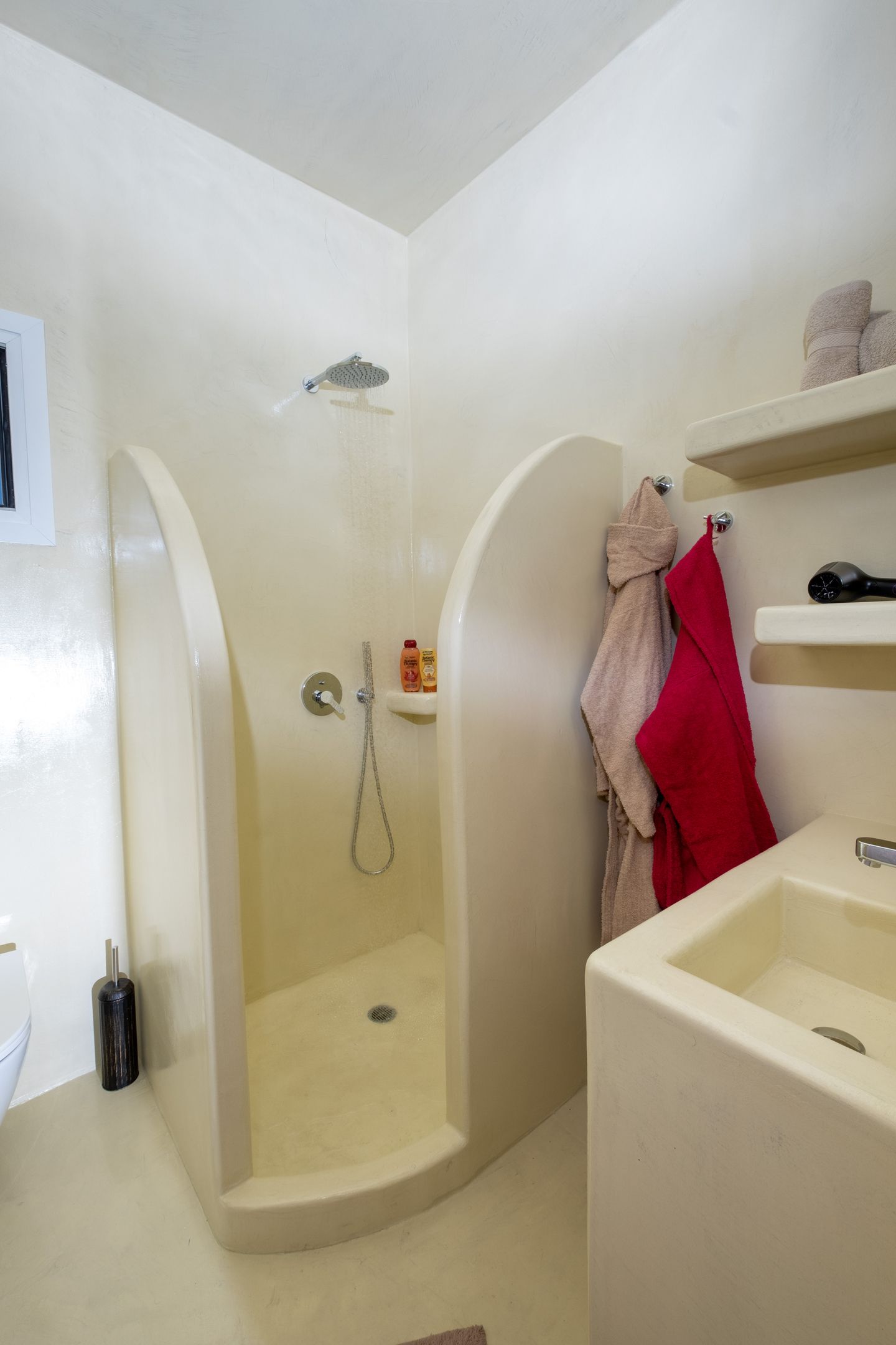 There are 2 king size suite rooms for couples and a small cozy room with a single bed ideal for one child, at the upper level and 3 king size suite bedrooms on the lower level all featuring their own uniquely designed private bathrooms. All bathrooms are exquisitely crafted with natural stones, sea elements and luxurious adornments and feature a power shower enclosed by colorful glass doors. The inimitable bathroom doors are filled with natural pebbles, sea shells and coral decorations and allow residents to enjoy the endless views to the azure sea.