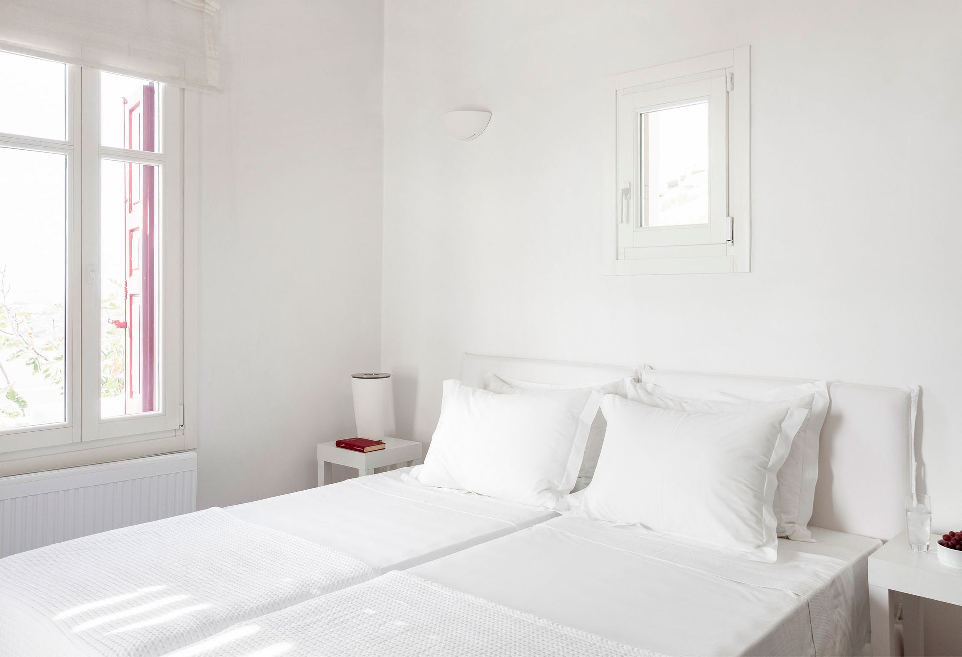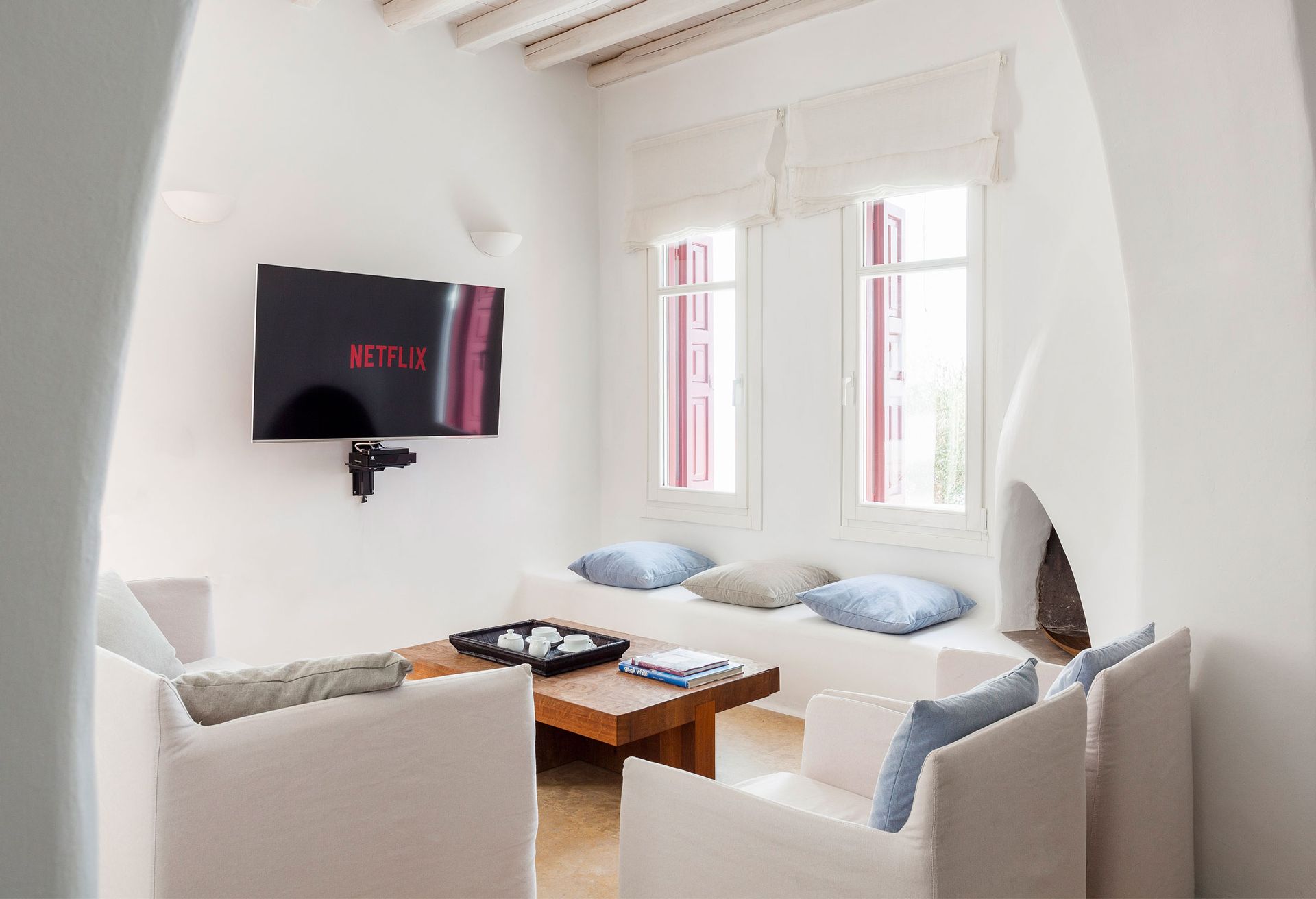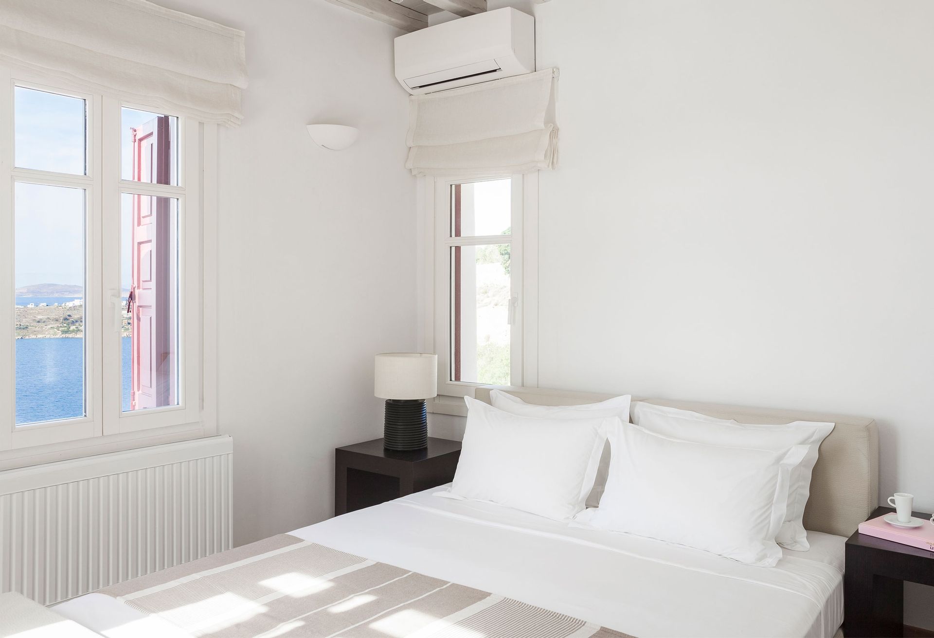 Mykonos Villa Zafira 4 is perched at the top of a private 11-Villa estate and enjoys a bird’s eye view of the islands of Delos and Rhenea, over a majestic drop to the sea, offering the picture-perfect Mykonos sunset. Villa Zafira 4 boasts an outdoor BBQ and an outdoor dining & lounging area (sunny & shady all day long)- all in front of the 73m2 infinity pool that flows off into the Aegean horizon- and you are still less than a two-minute walk to the sea (still within the estate). Villa Zafira 4 has a single main entrance, one Master Bedroom (expanded Queen-size bed), with an en-suite bathroom on the upper level, and a terrace; another Master bedroom (with King-size bed- or two twins) with an en-suite bathroom on the pool level; and a third bedroom (Queen-size bed) on the ground level. The brilliant white interiors and exteriors and the subtle tasteful decorations reflect the Mykonian-elegance the island is known for, so you can totally immerse yourself in the spirit of the island. The refurbished luxury estate has daily, complimentary maid service-so you don’t lift a finger, 24/7 CCTV monitoring at the periphery of the estate- so unauthorized people are detectable, Netflix- to quench your thirst for relaxed adventure, flat-screen TVs- so everyone can watch, back-up generators- to face the frequent local electric shortages, a desalination plant- so you can ignore the frequent local water shortages, and a 24/7 gate-access control. The pool can be heated for a fee.