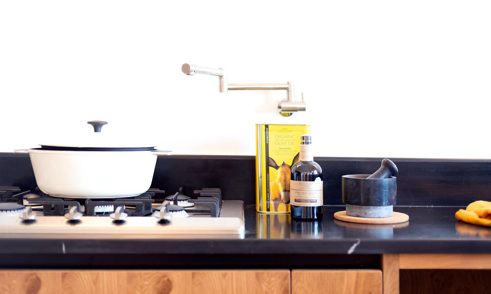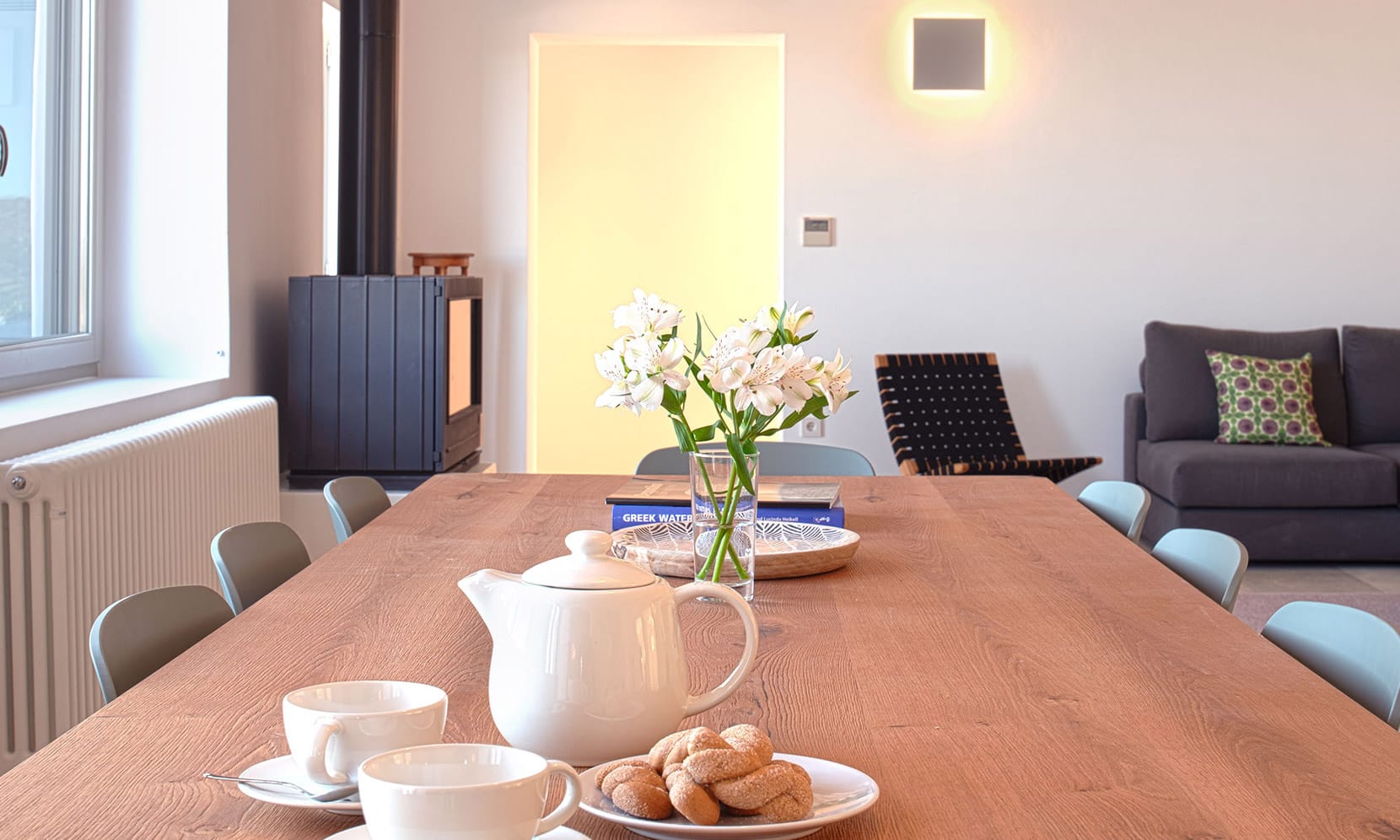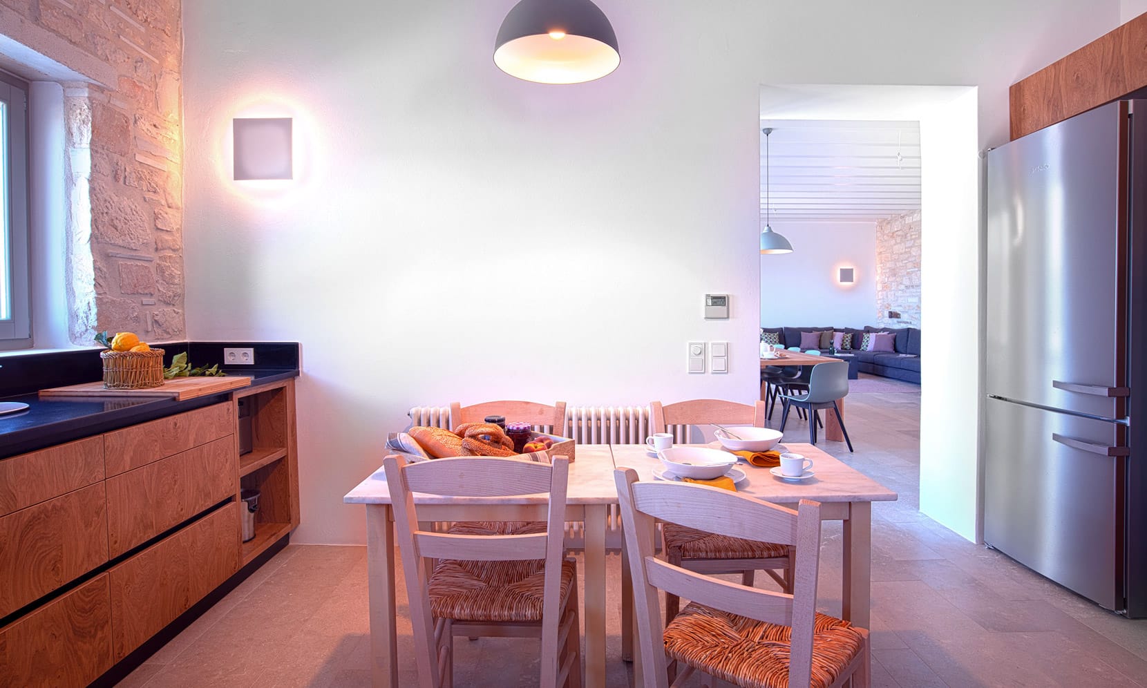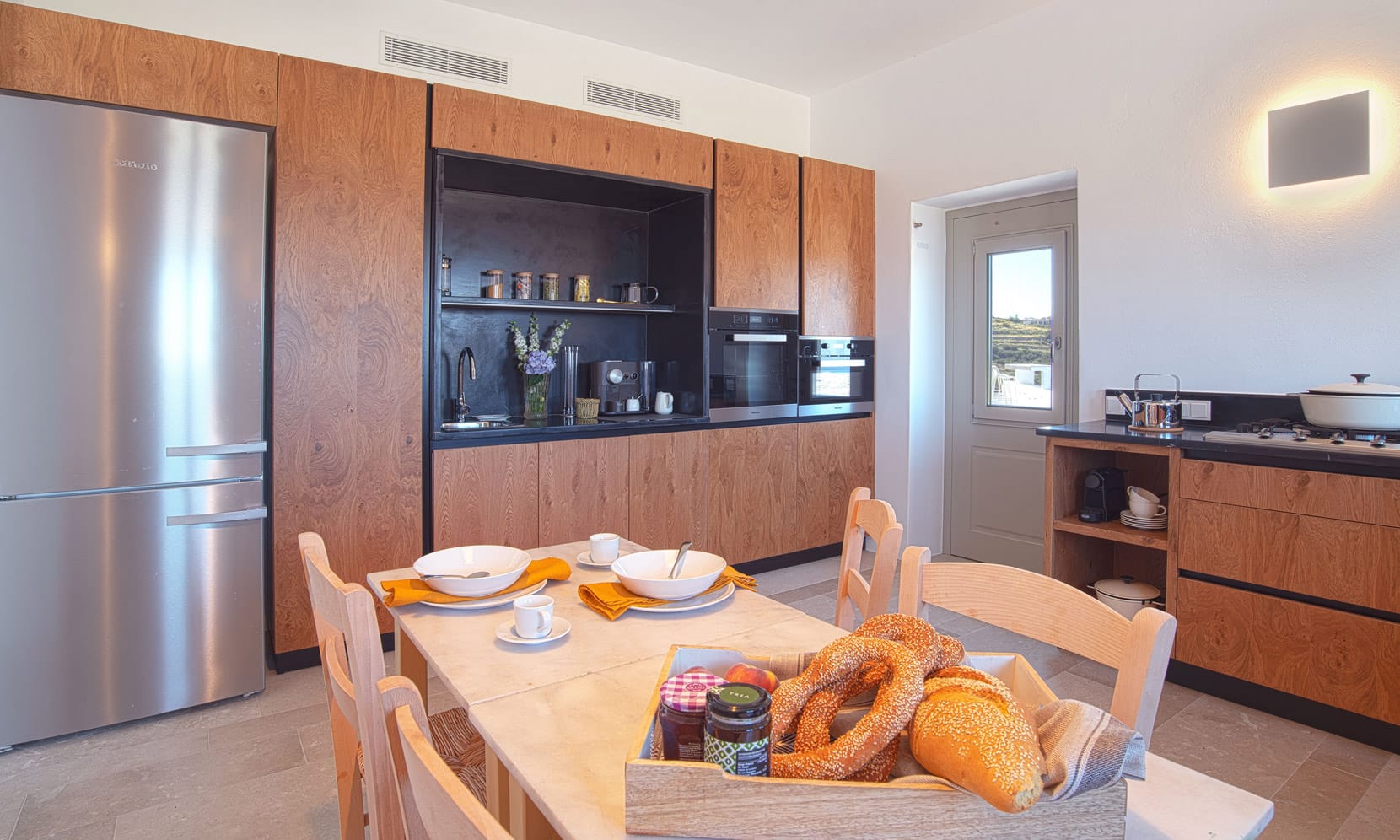 The owners have applied special attention to the Kitchen-vast and welcoming with its spectacular sea view, equipped with high-end appliances, making meal preparation a real treat. The kitchen has a direct access to the garden for fresh supply of organic herbs and vegetables, farm to table has never been so close.