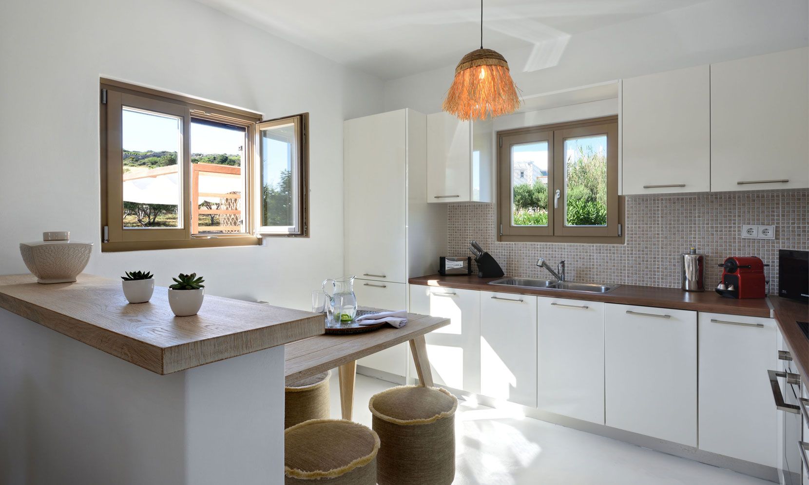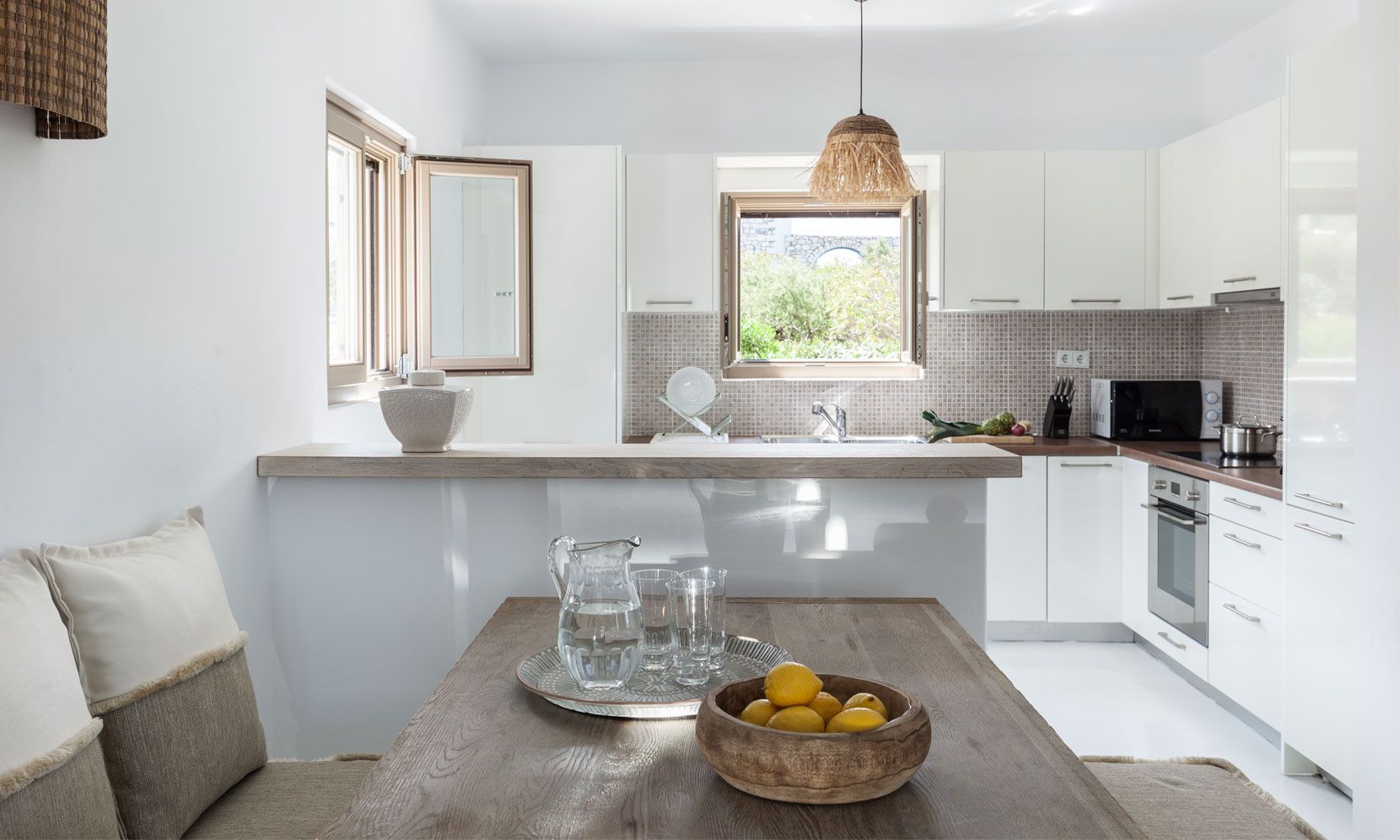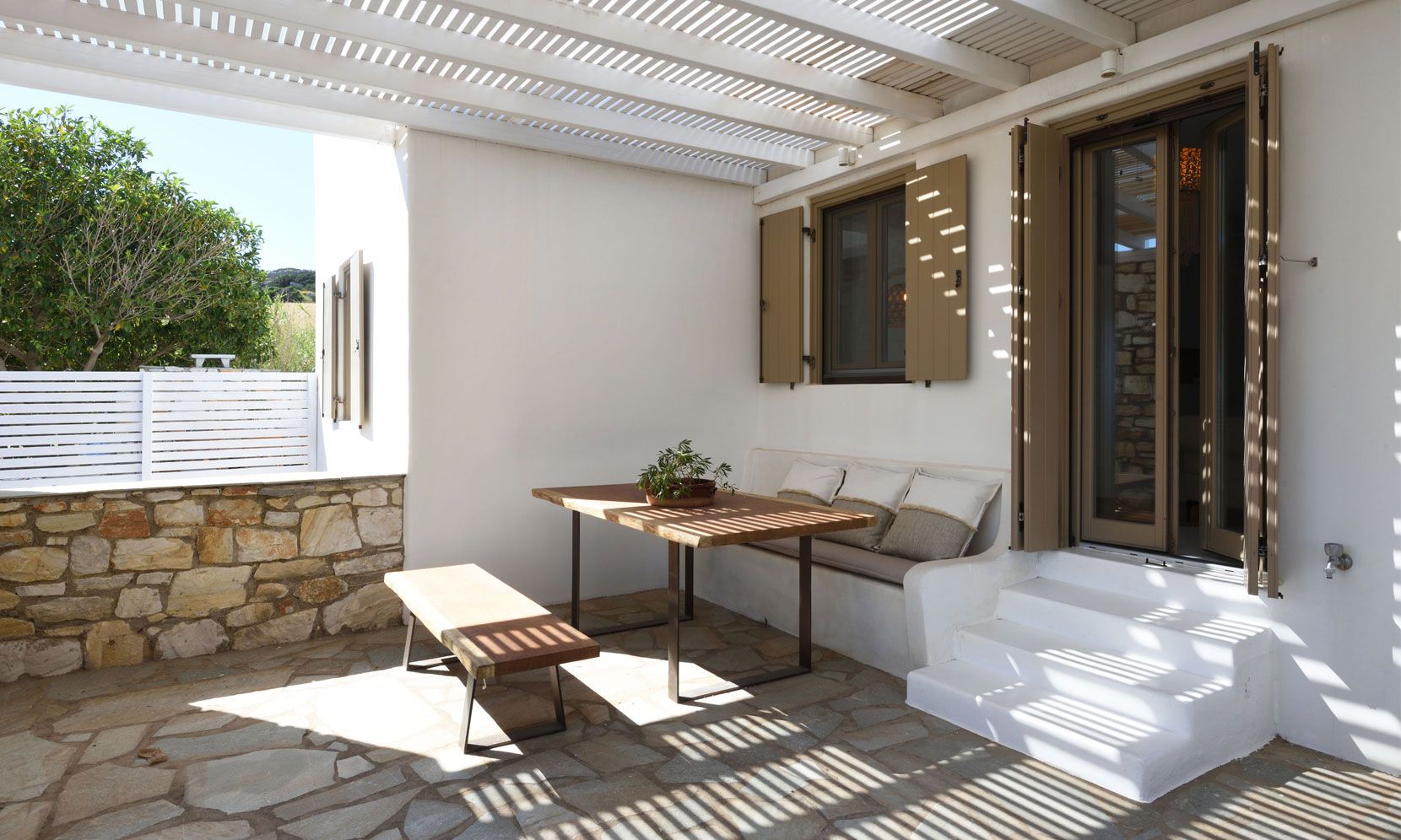 The profuse vegetation encircling Paros Villa Daphne creates an atmosphere of pure tranquility and bliss. Guests can unwind at the sun kissed patio as they lay on the comfortable sun beds or the stone build day bed overlooking the country side and the sprawling verdant fields. The beautiful dining area and lounger on the large veranda invite guests to relax under the shade of the pergola and relish local specialties as they gaze at the azure sea.
