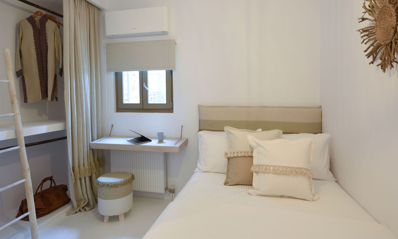 Nuzzled in the serene verdurous landscape Paros Villa Daphne offers a tranquil retreat for luxurious island holidays. The main entrance leads directly to a beautifully appointed open plan area featuring the vast living room, the elegant dining room and the brilliantly white fully equipped kitchen all fitted with contemporary amenities and conveniences for a truly enjoyable stay. At the lower floor there is the master king size bedroom with en suite bathroom, a single bedroom and a queen size bedroom sharing a bathroom with a shower. A small kitchenette on the hallway allows guests to enjoy a quick espresso or snack. A separate guesthouse with a double bed and a private entrance on the side of the villa can be used as a room for the stuff as well as for extra guests.