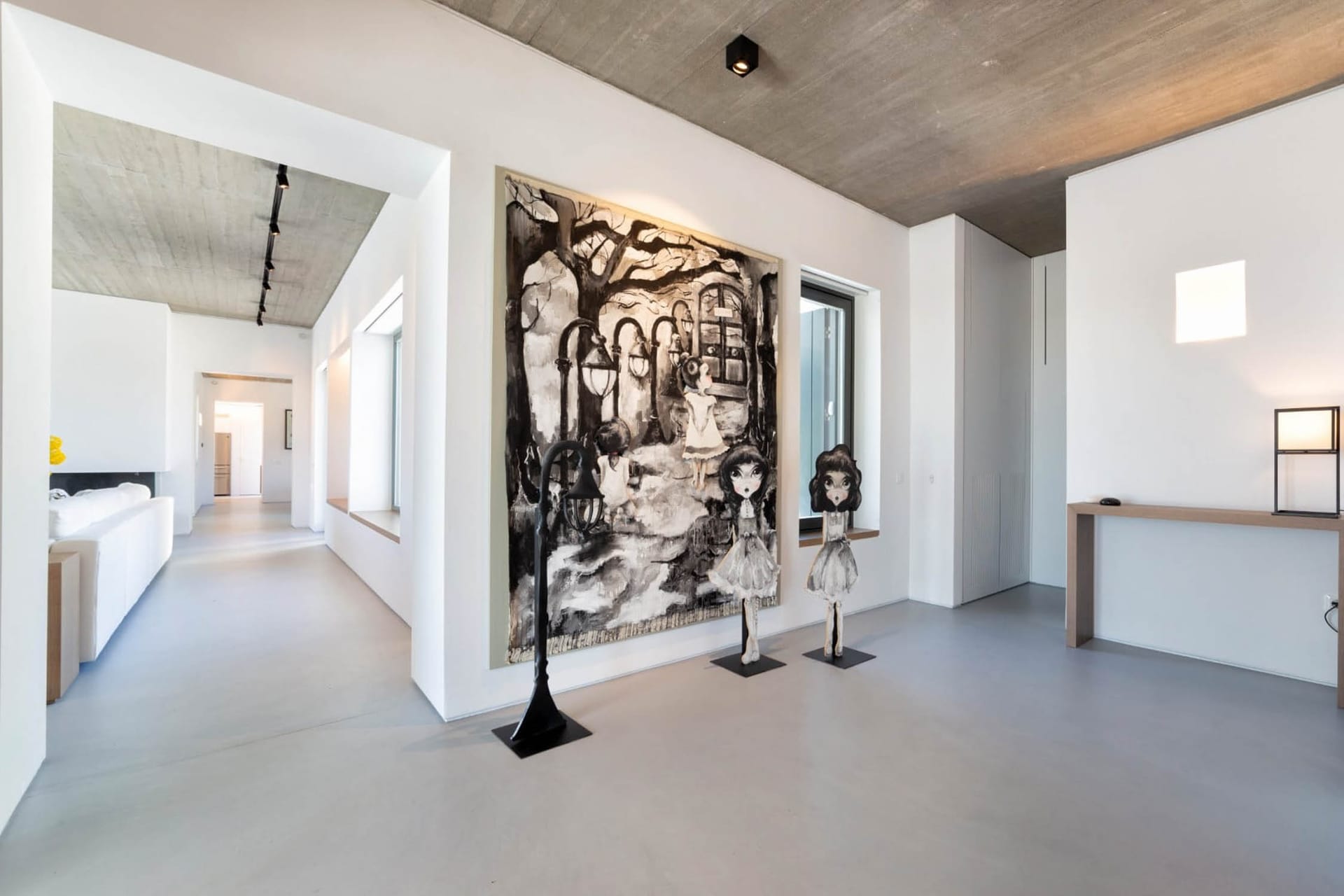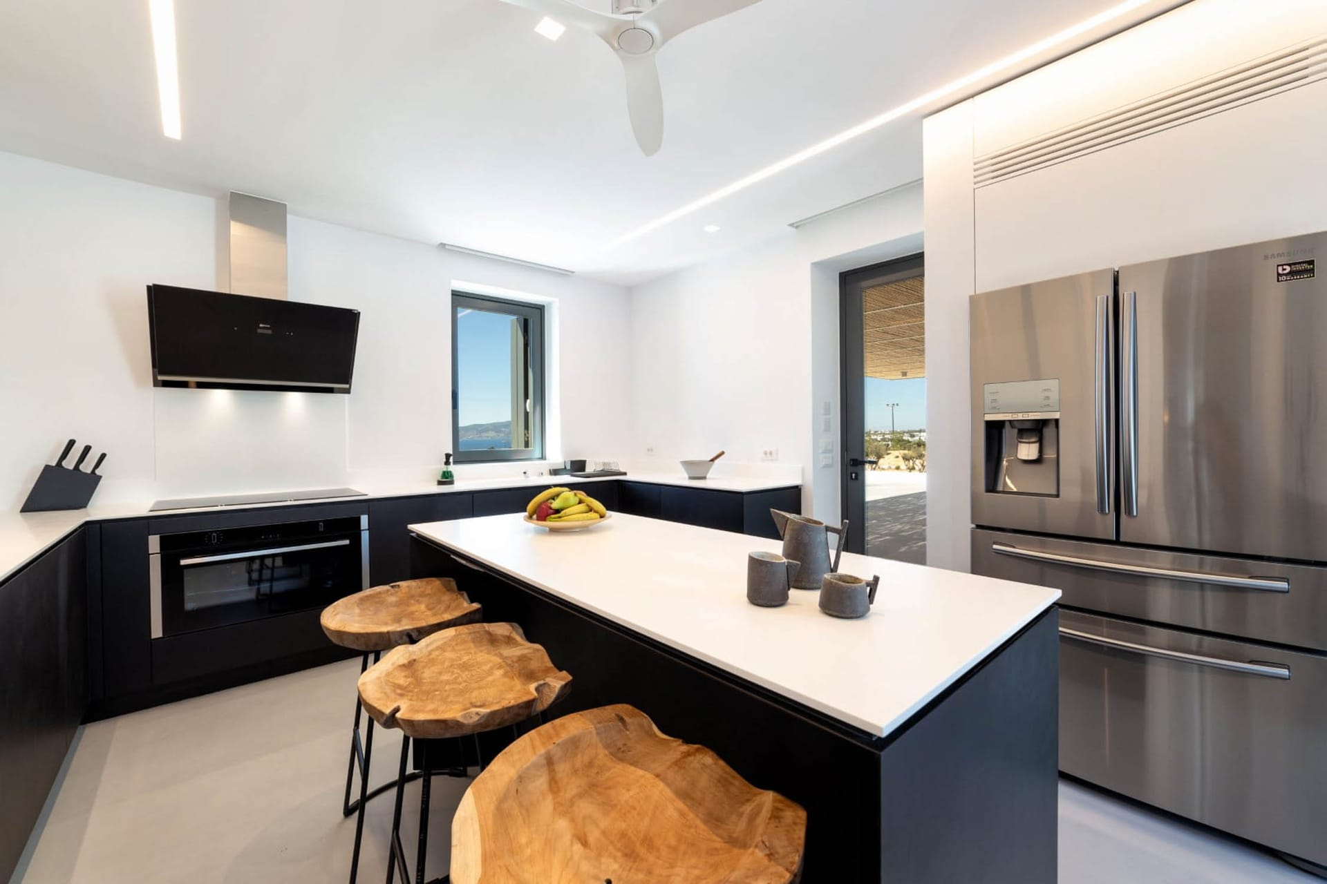 From the cube-shaped decorative details in the living area to the minimalistic dining room and striking black-and-white kitchen, the interiors embody understated elegance. Large windows open to the sea, flooding the spaces with light and offering stunning views from nearly every angle. Outside, guests can enjoy a multitude of lounging, dining, and recreational areas, making the villa ideal for both relaxed mornings and lively evenings under the stars.