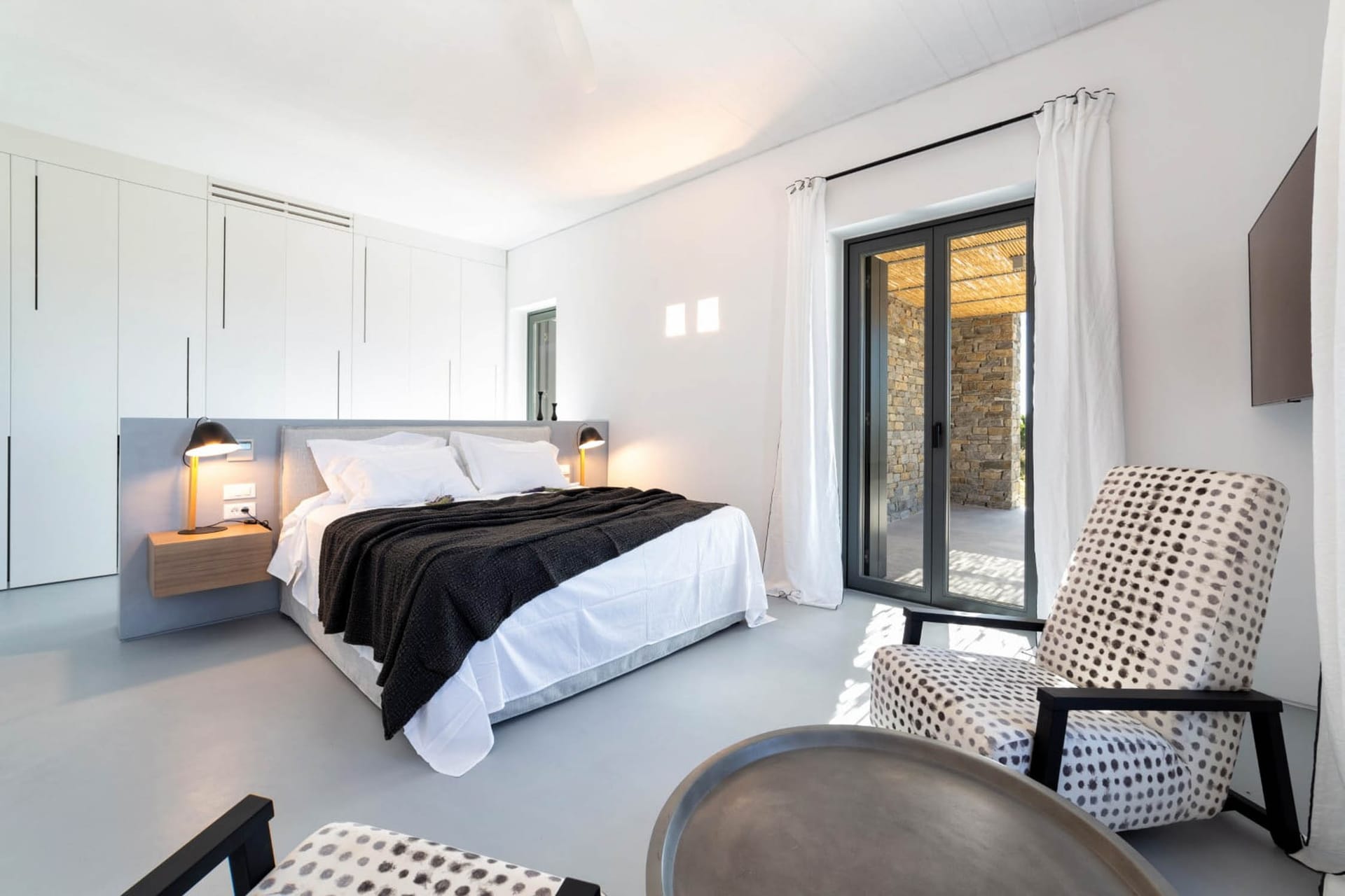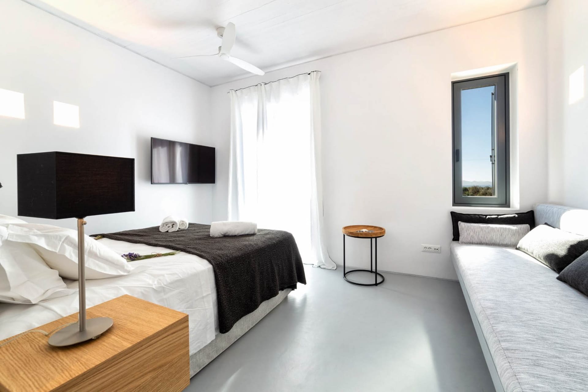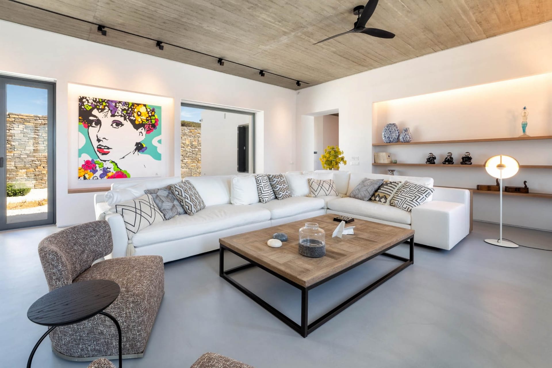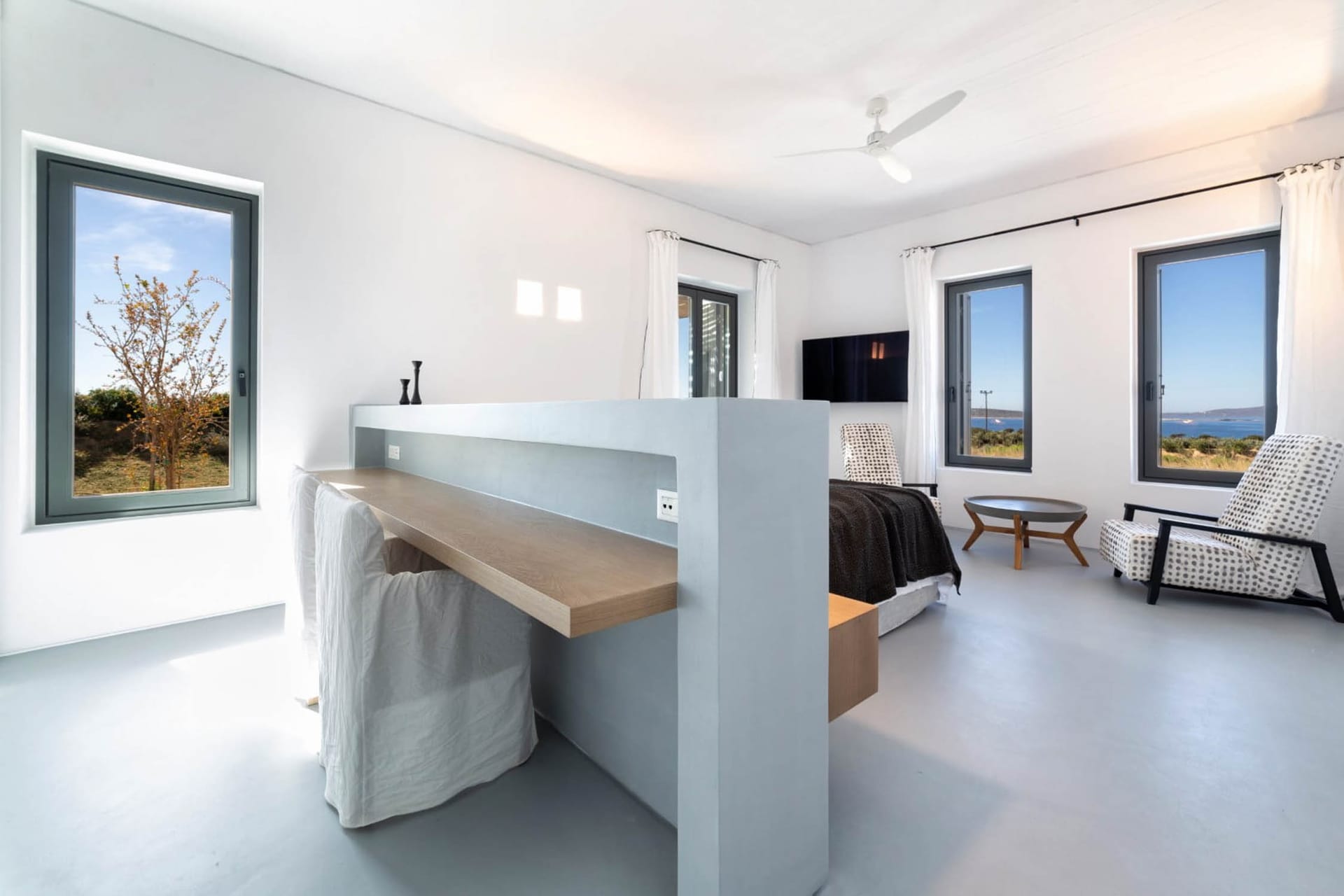 The villa’s interior is marked by a harmonious blend of natural textures, contemporary furnishings, and hand-picked artworks that elevate the space with a unique identity. Carefully treated cement elements on ceilings and patios reflect a fusion of modern design and traditional technique. Whether enjoying the sea view from the infinity pool, gathering around the stylish fire pit, or relaxing in the peaceful indoor spaces, Villa Francisco delivers a sophisticated and memorable Paros experience.