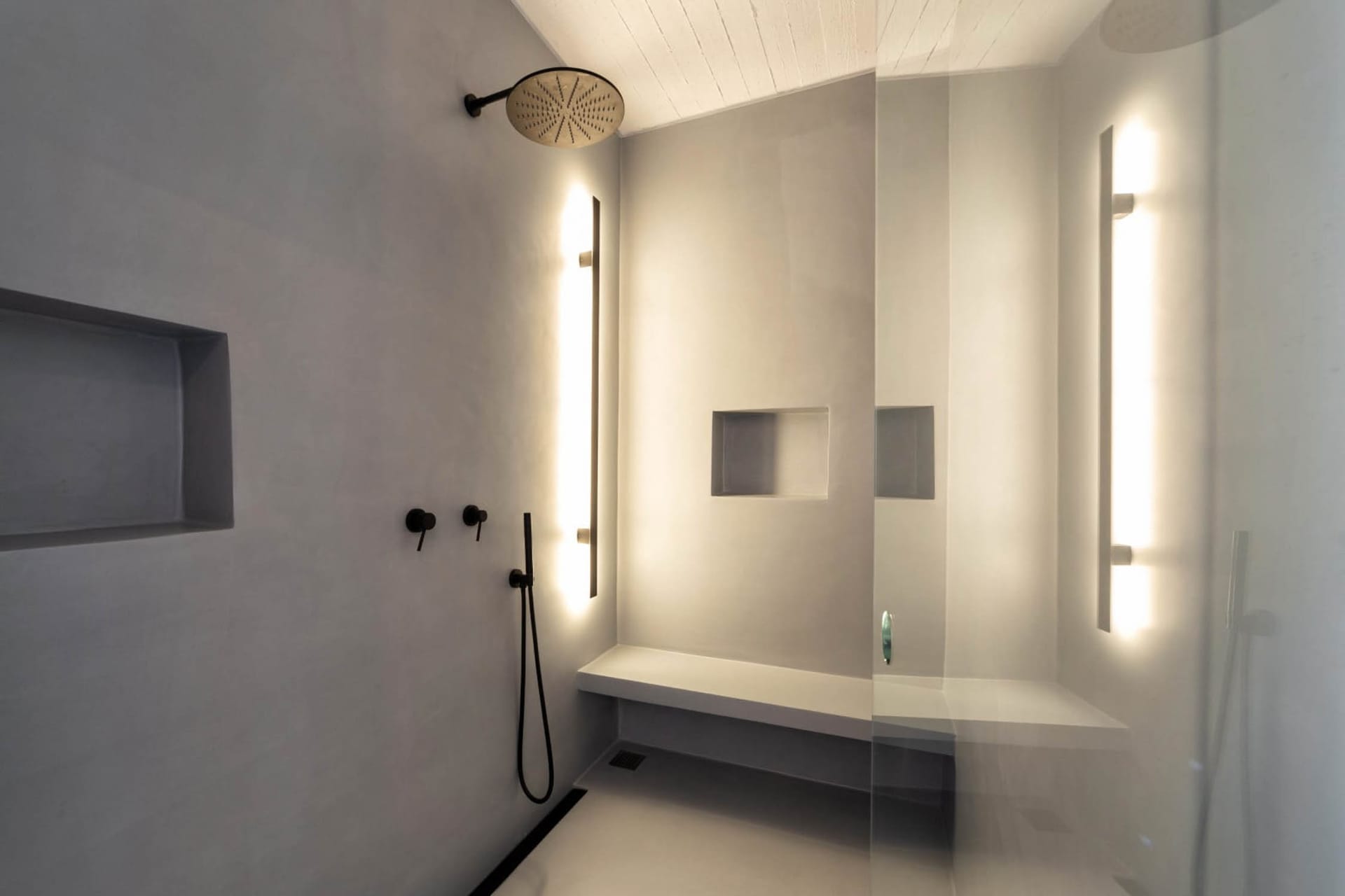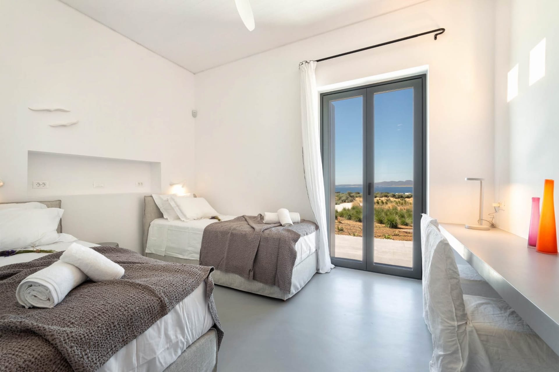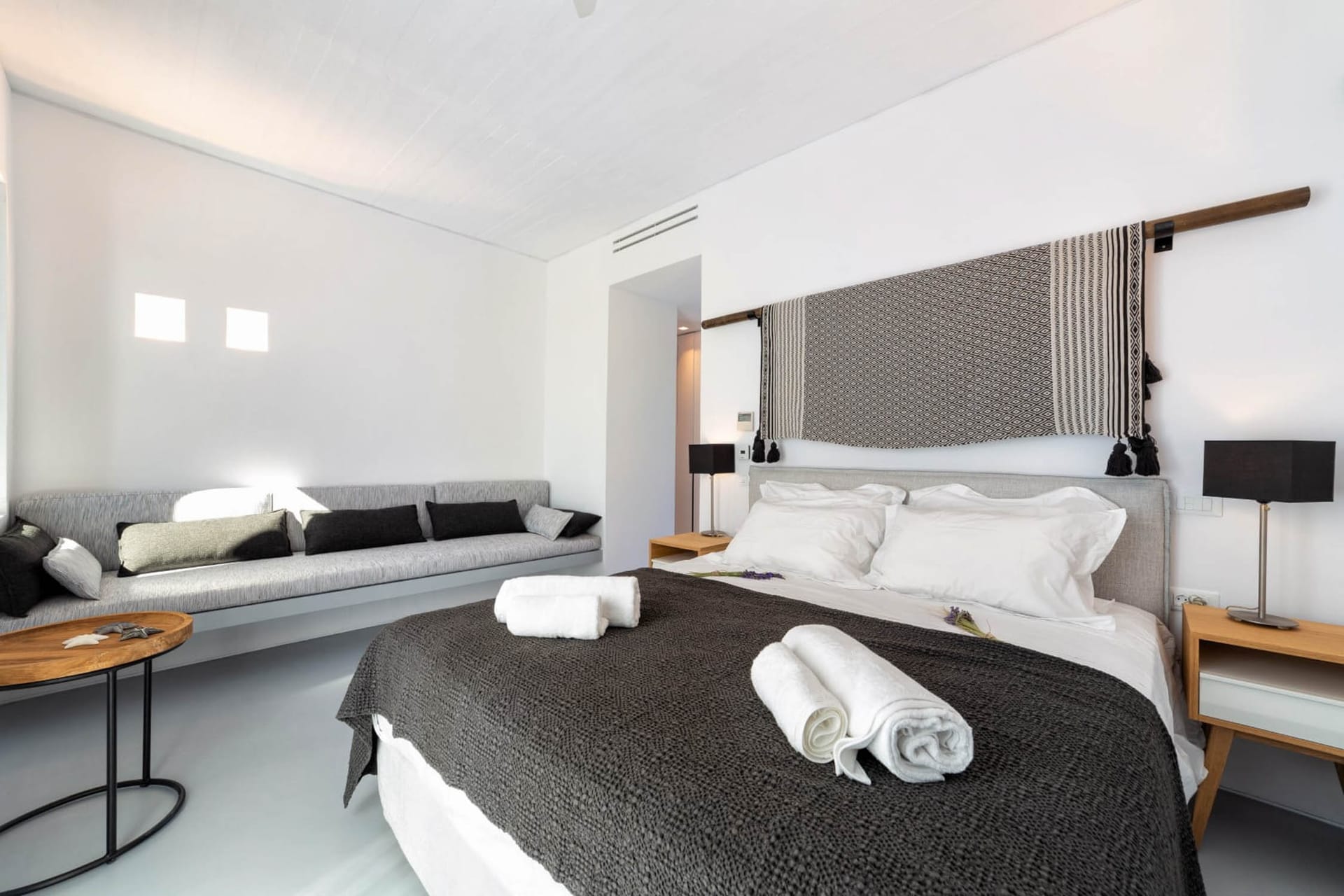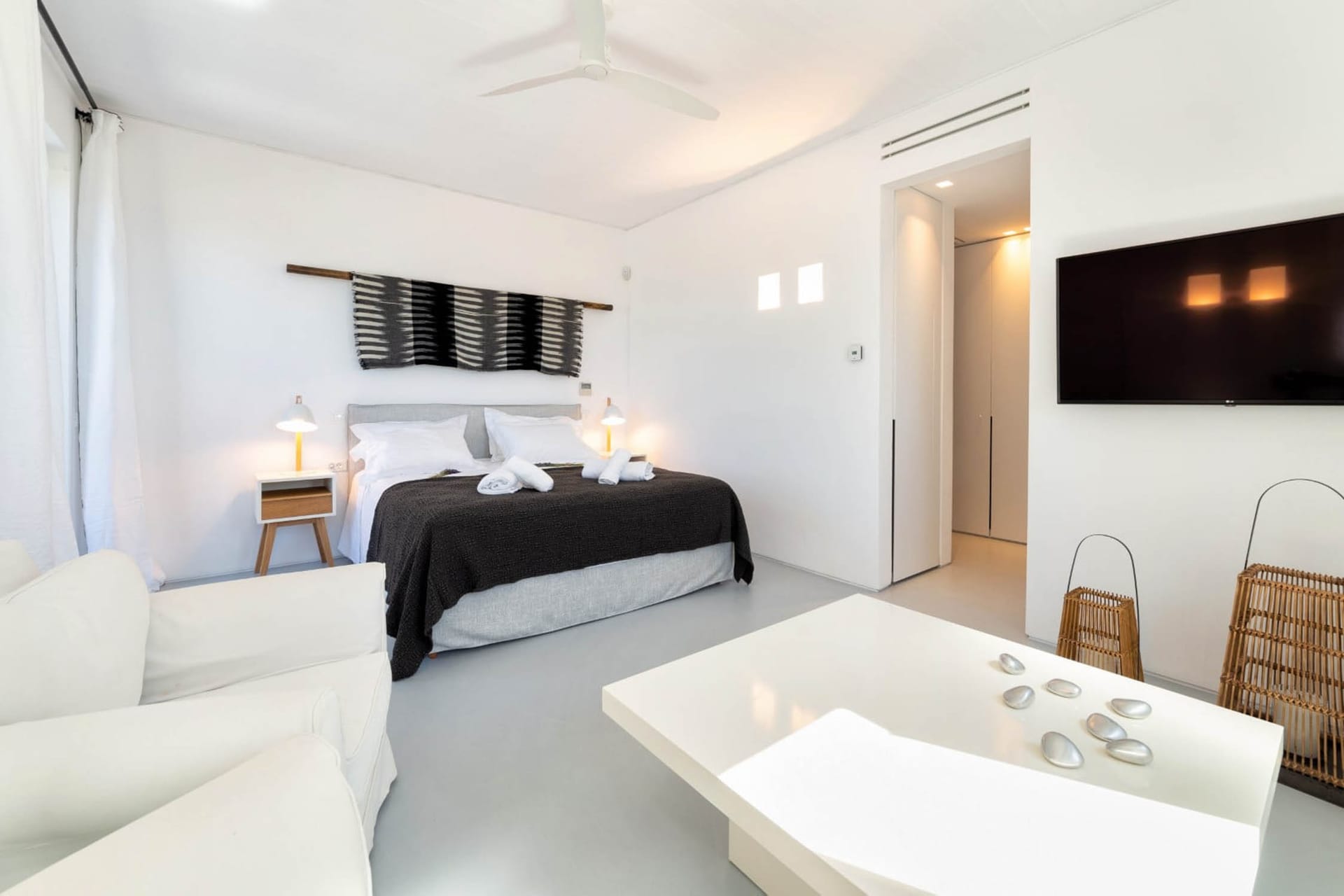 The villa’s interior is marked by a harmonious blend of natural textures, contemporary furnishings, and hand-picked artworks that elevate the space with a unique identity. Carefully treated cement elements on ceilings and patios reflect a fusion of modern design and traditional technique. Whether enjoying the sea view from the infinity pool, gathering around the stylish fire pit, or relaxing in the peaceful indoor spaces, Villa Francisco delivers a sophisticated and memorable Paros experience.