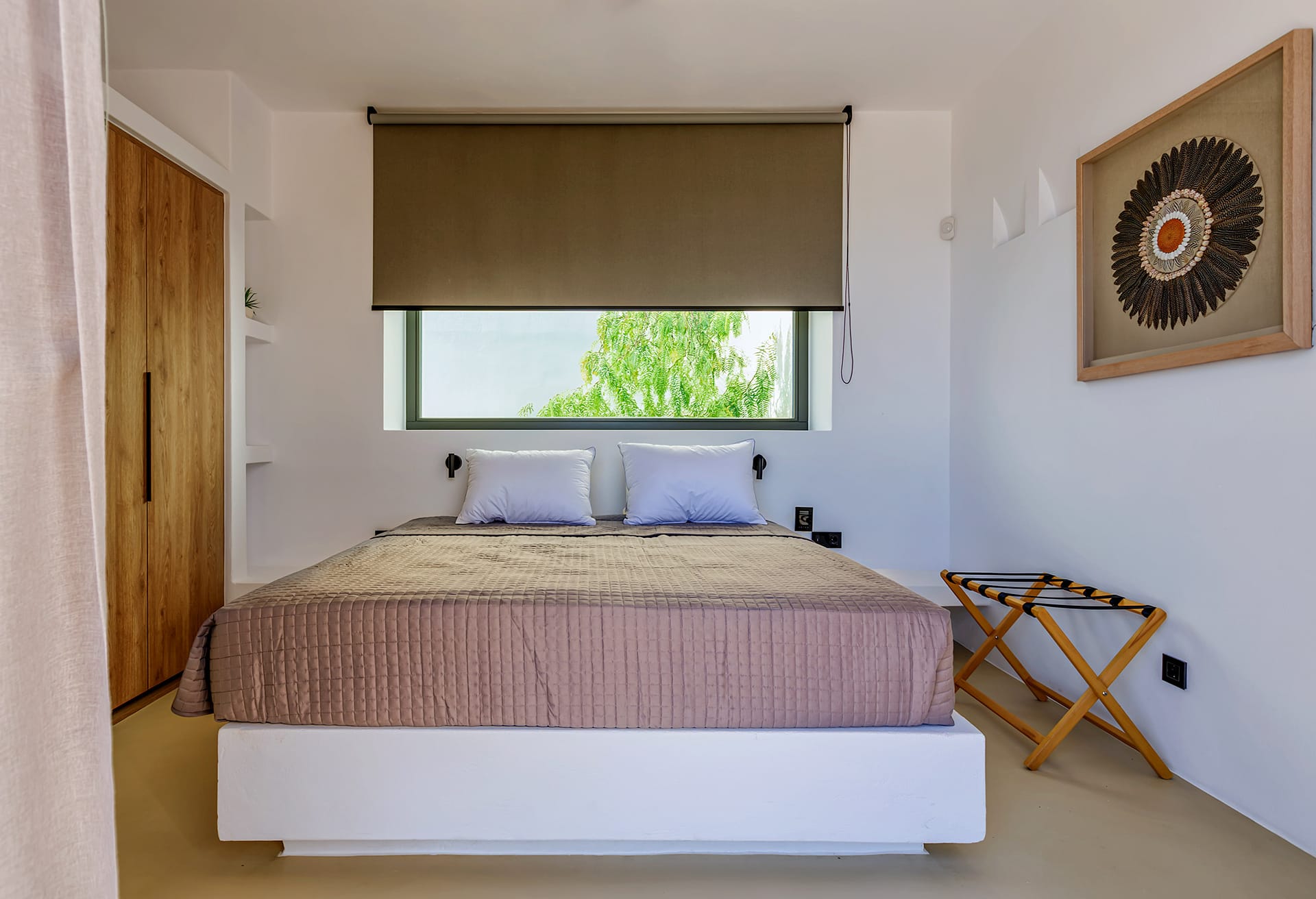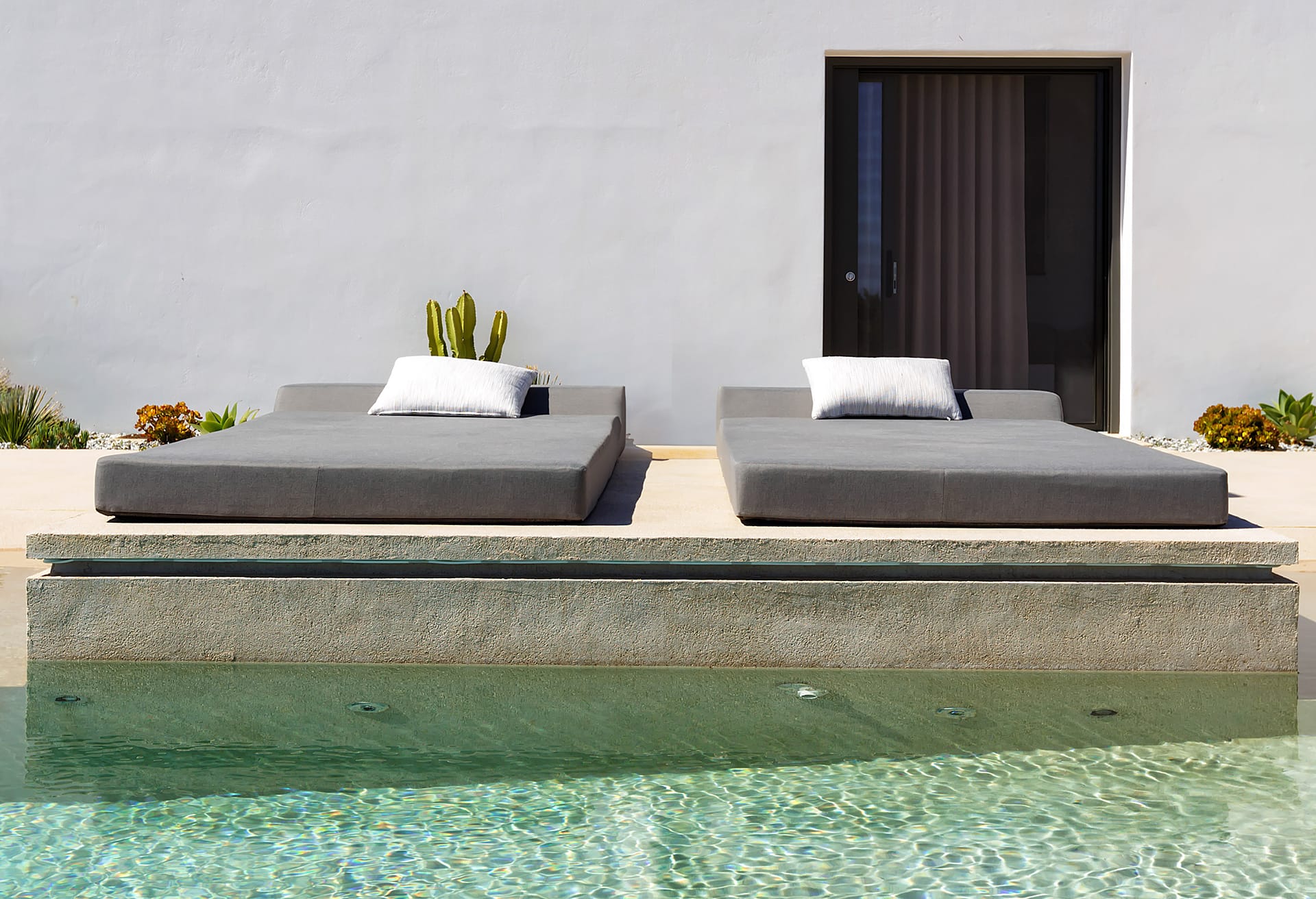Indoors, the villa reflects a contemporary aesthetic with sleek furnishings, soft neutral tones, and expansive sliding glass doors that blur the line between interior and exterior spaces. Both the shared living areas and the bedrooms maintain an equally high standard of comfort and design, all thoughtfully connected to the outdoors.