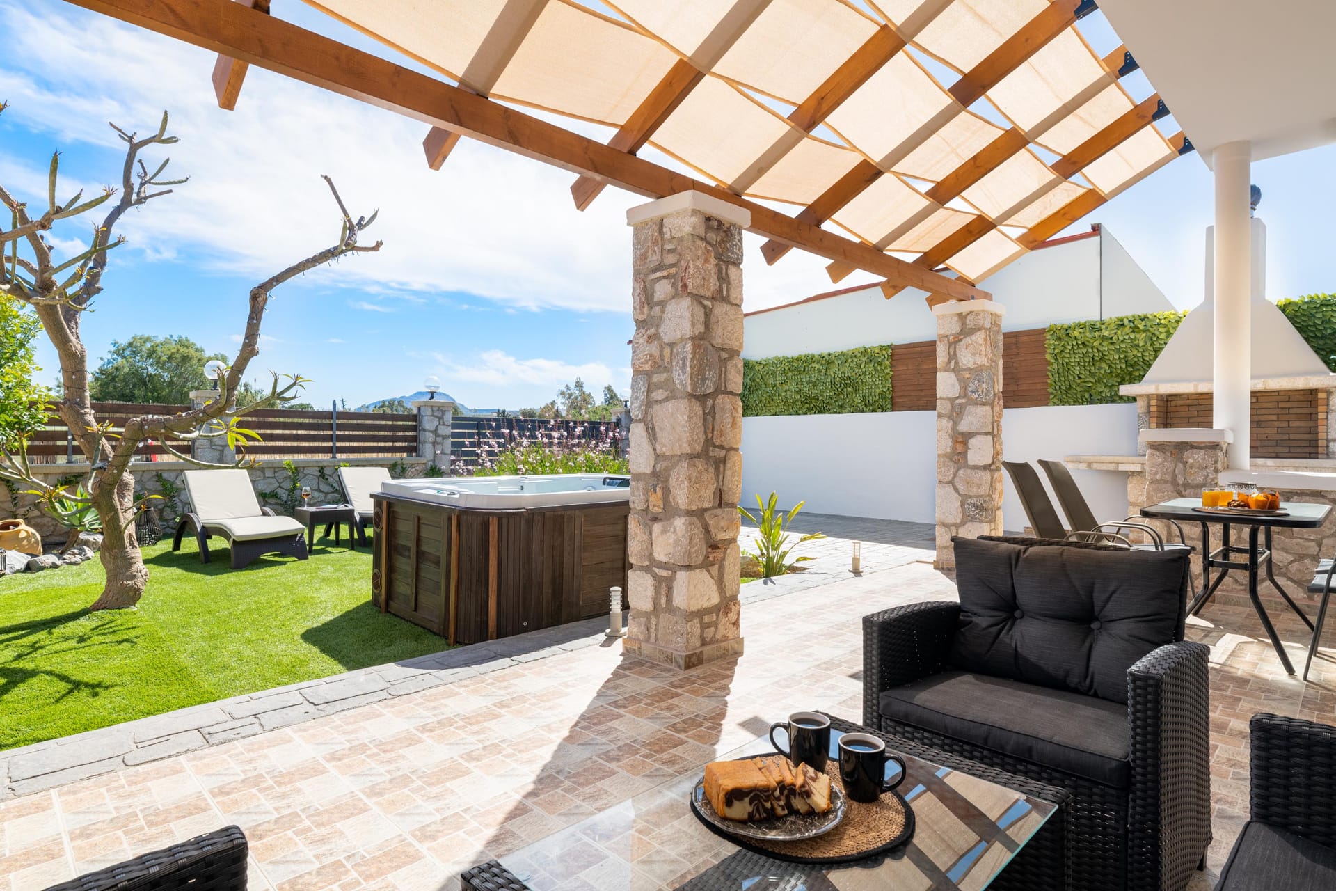 The flat, lawned garden, shared with the downstairs property, is separated from the beach by a secure fence; ideal for younger children to explore while the adults sip a beer at the outside bar, or while using the built-in BBQ kitchen.