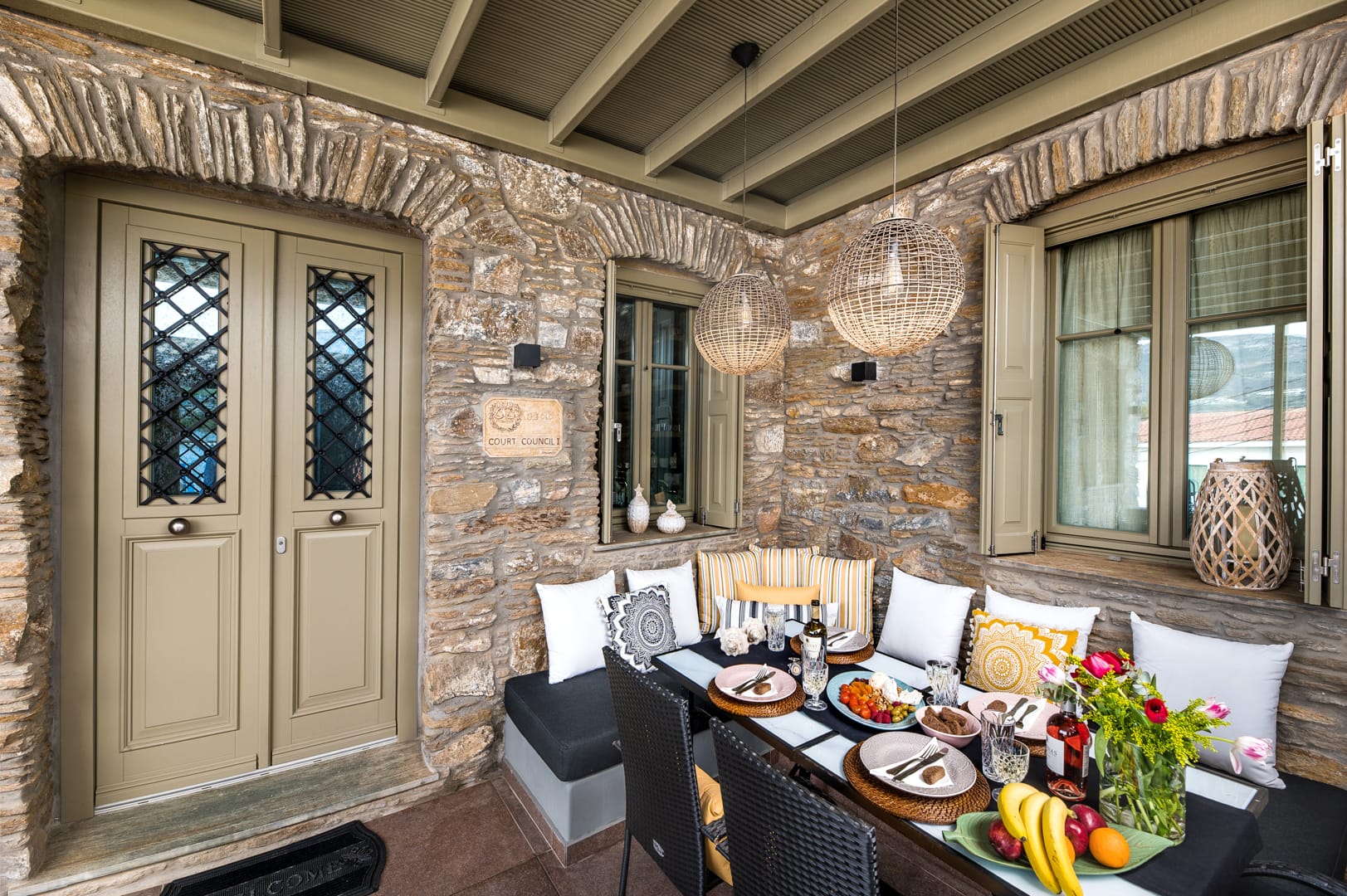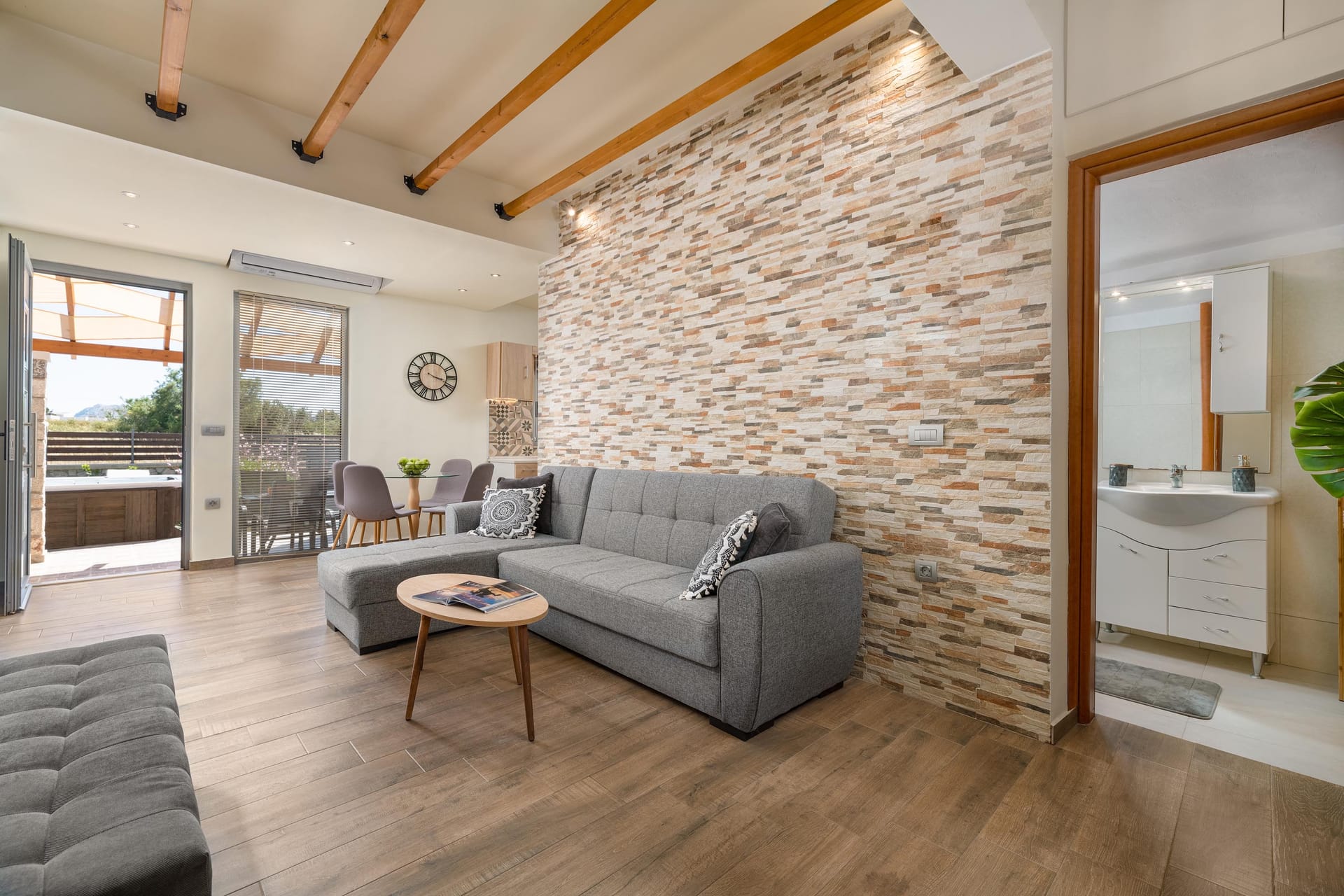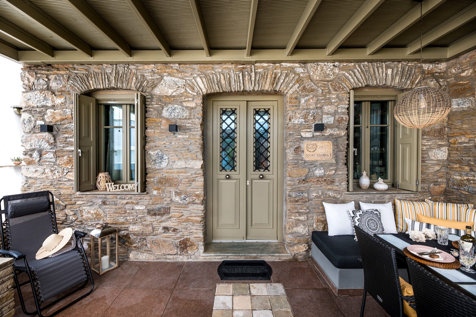 Accessed by external wide, stone steps surrounded by pink bougainvillea, Eleanna is blessed with a large balcony overlooking the tranquil, sandy beach and the Gulf beyond. With views towards Argostoli and the mountains of the island, the balcony is furnished with comfortable sofas and a table for out-door eating. The beach is merely steps away, and the house is well-stocked with beach equipment for use by the guests, including SUPs and a kayak for exploring the coast.