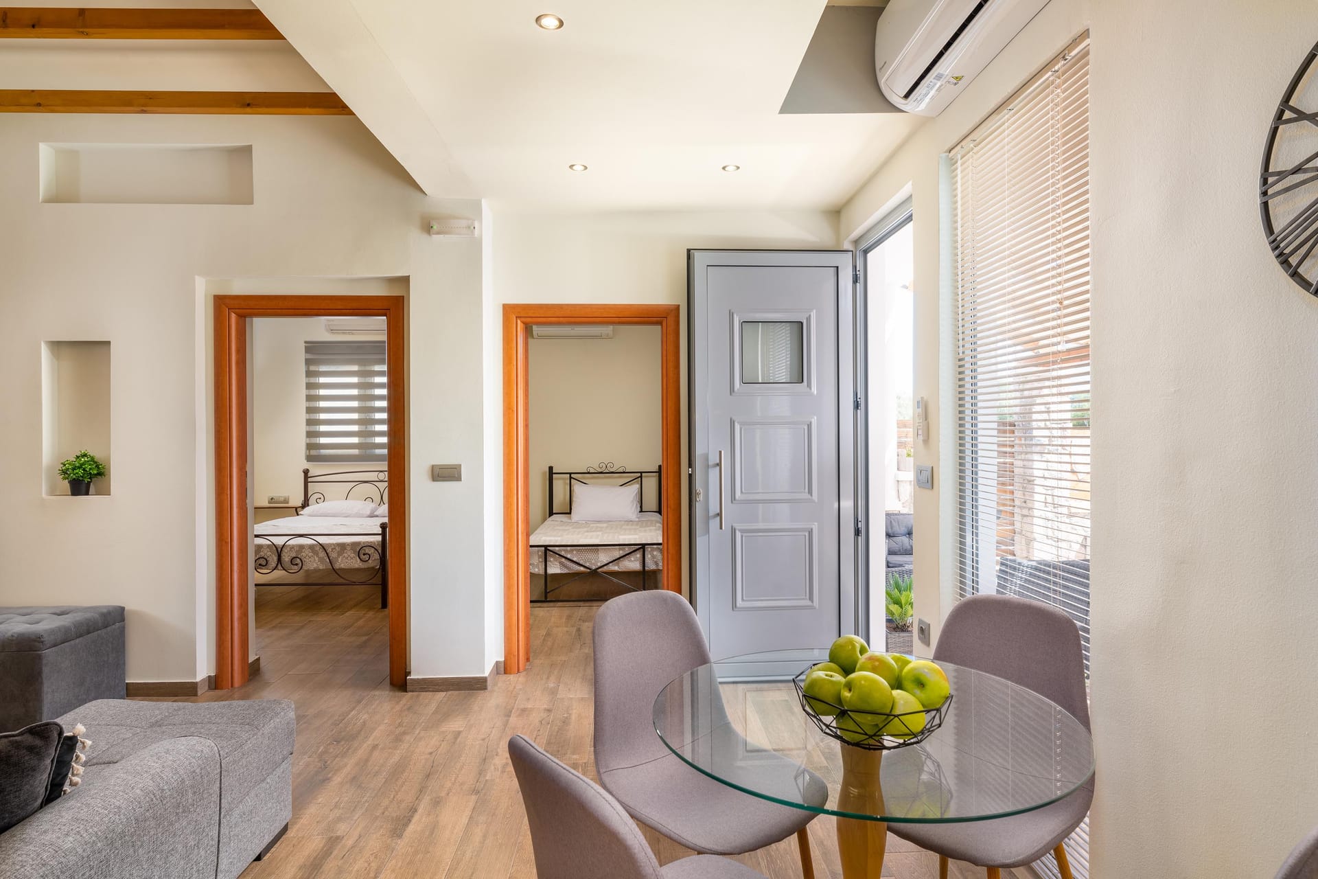 Inside the apartment, the generous living space inside has a comfortable seating area, and dining table, with direct access to the balcony.