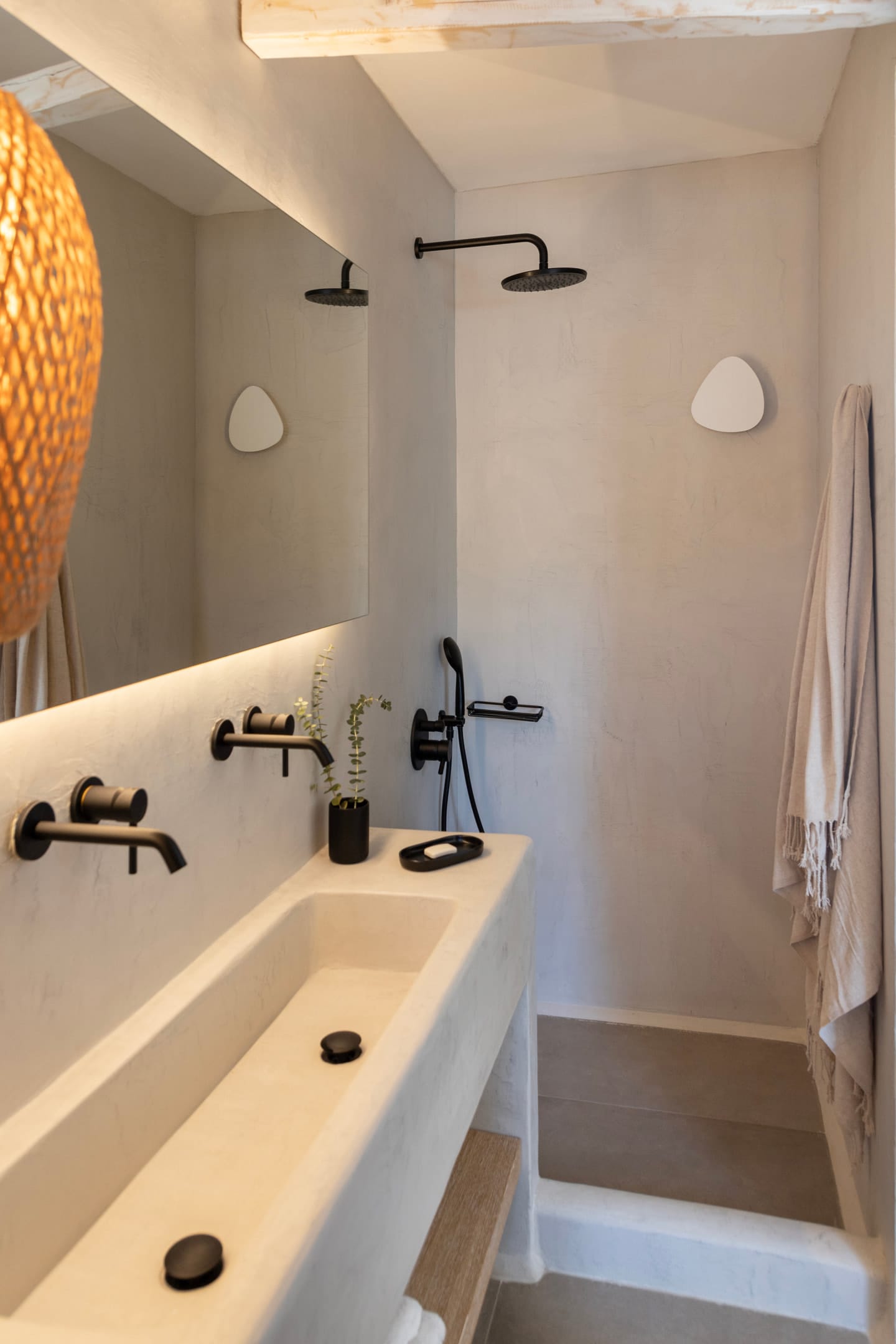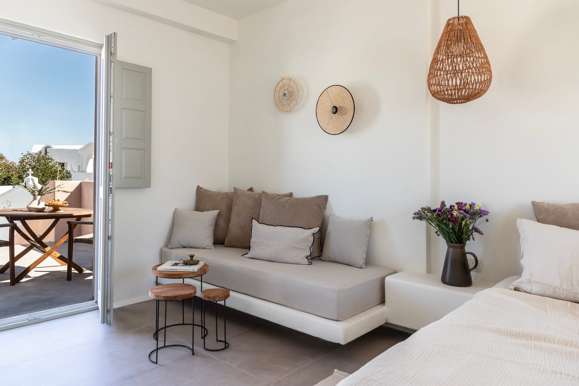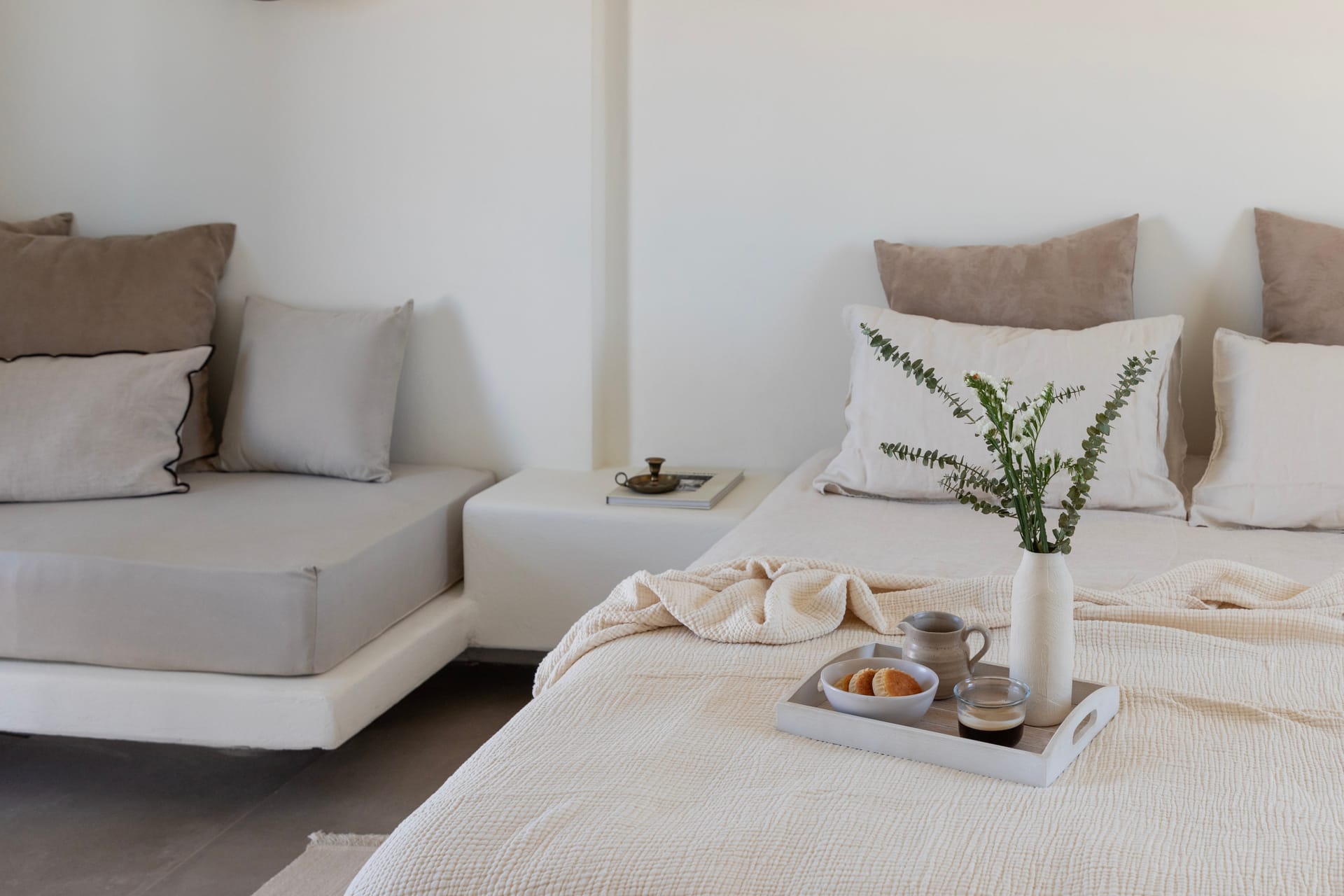 Aris Sky Suite is a luminous 69 m² retreat located just above the iconic Super Paradise Beach in Mykonos. Thoughtfully designed for couples, families, or friends, it features two comfortable bedrooms with queen-size beds (one of which also includes a single bed), two ensuite bathrooms, and a living area with a handcrafted plush sofa that can accommodate an extra guest.