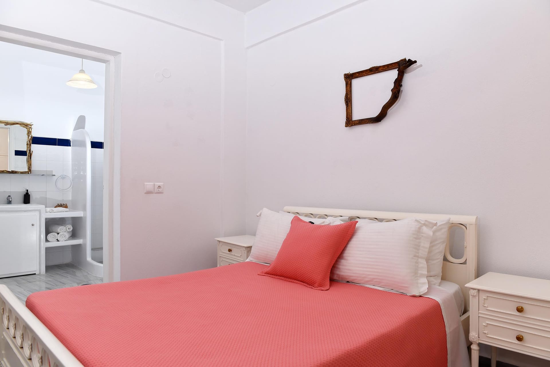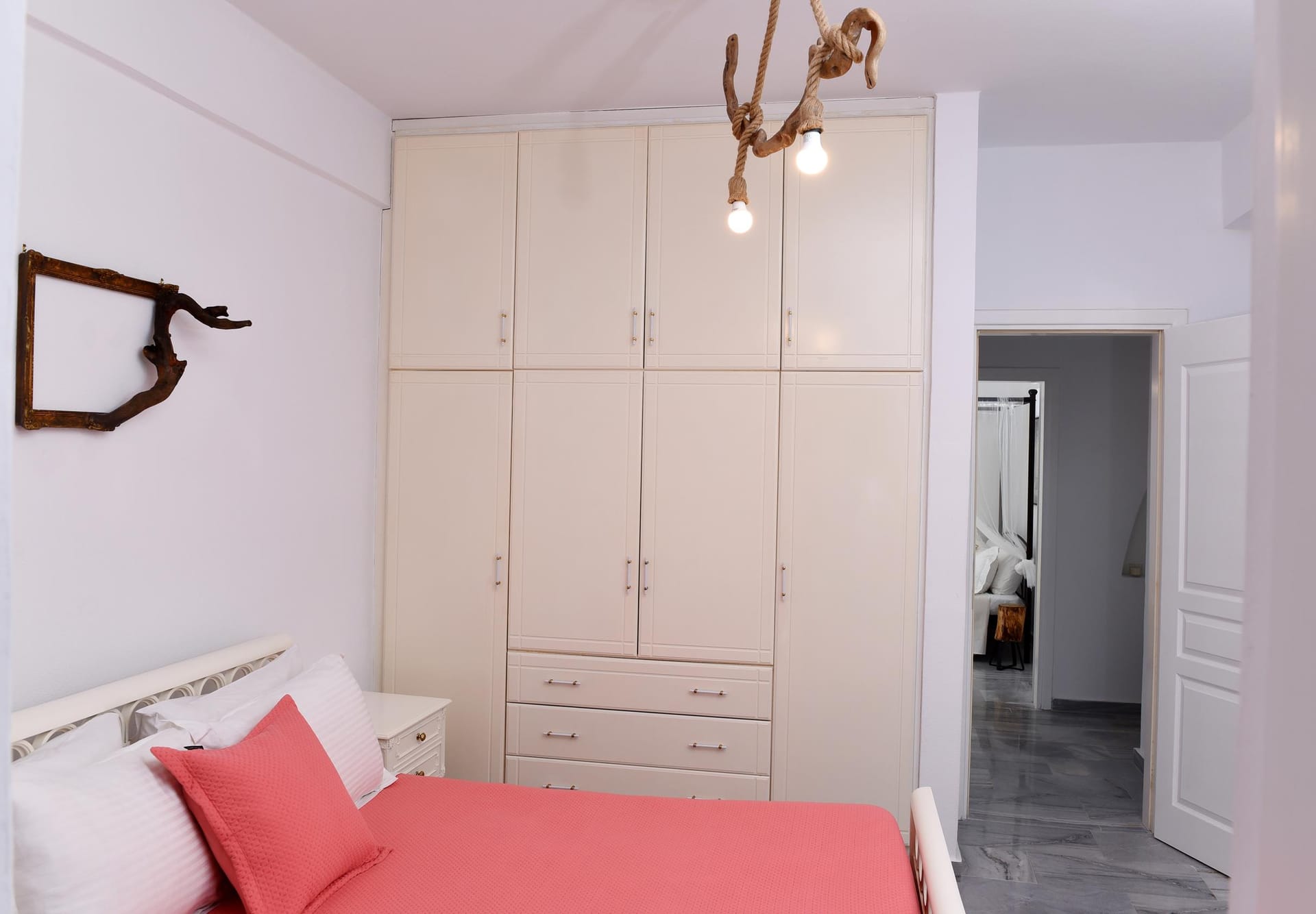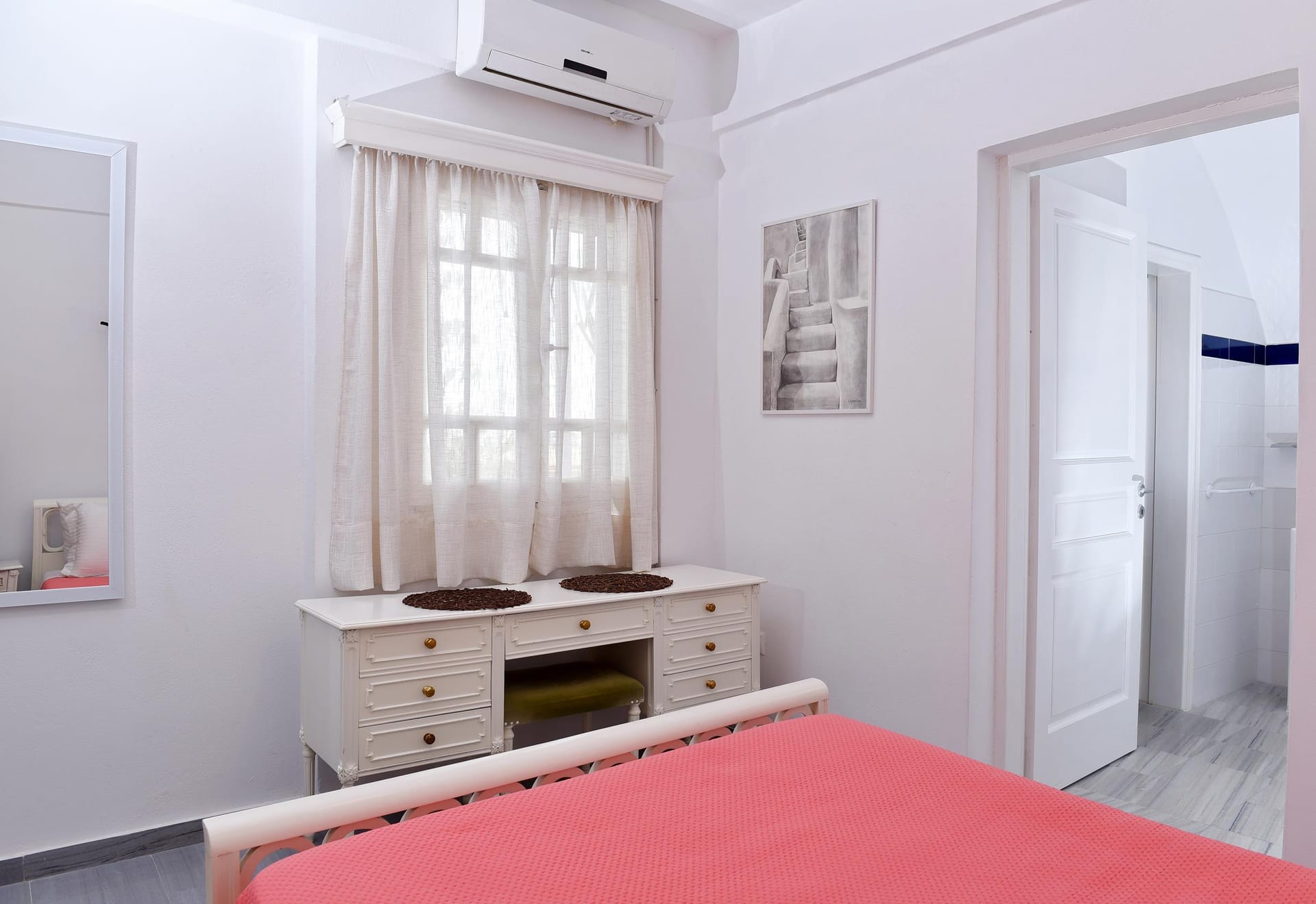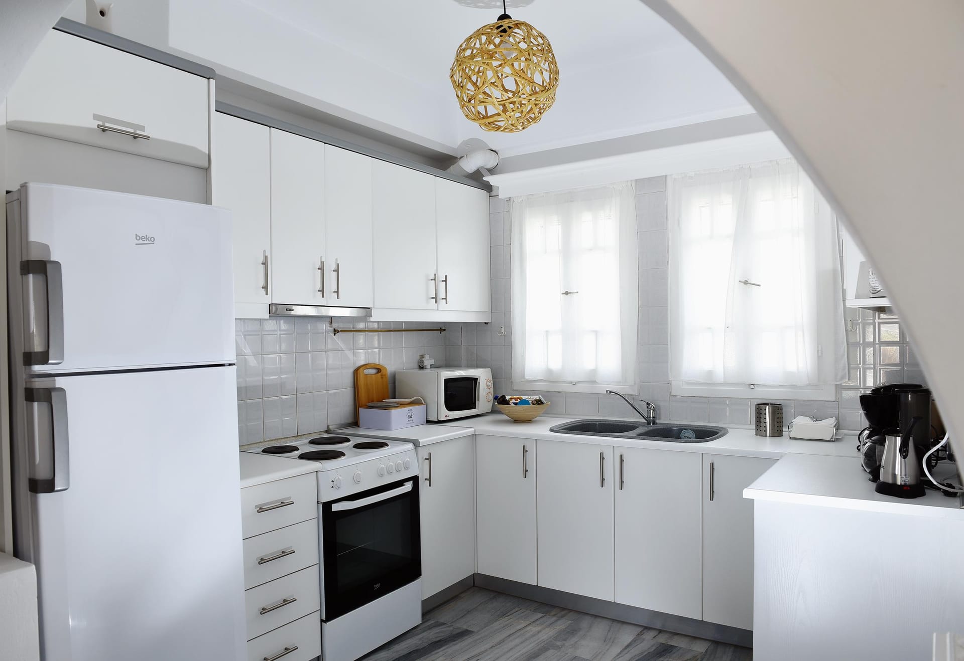 Inside the villa, there are 3 bedrooms. The Master bedroom, is a 15 m2 (165 sq.ft), it has its own 8 m2 (86 sq.ft) modern bathroom, very big wardrobes and closets, and one king size bed, with high class side furnitures and lighting. The second bedroom is an 11 sq.m (120 sq.ft) room, with an iron made bed, and spacious wardrobes, and a hand made mirror table, that will catch your attention! The 3rd bedroom, is 12 m2 (95 sq.ft) is located at the attic (top floor), and has 2 single beds and an amazing view of the sea, through its small and traditional windows! It also has a 24'' fat screen TV, and hidden lighting decoration! The second bathroom is 4.5 m2 (50 sq.ft), and has a bath tab, wash basin and wc. The kitchen is a modern type fully equipped kitchen, of 8.5 m2 (92 sq.ft), and has access to the backyard and the main living room.