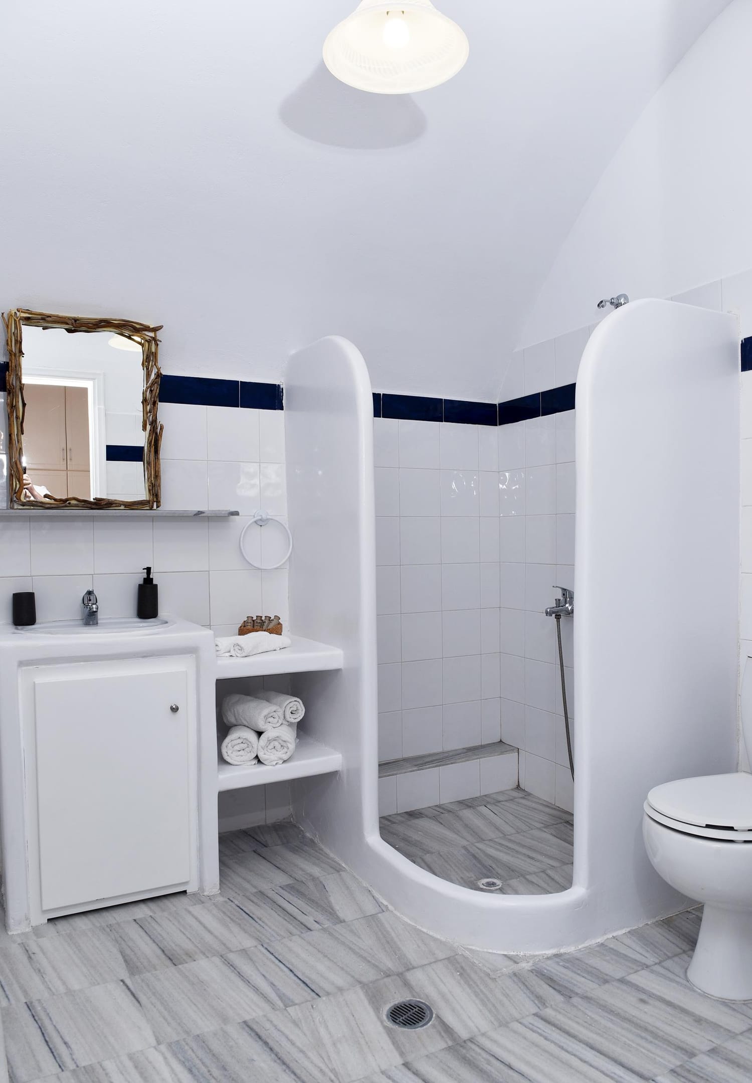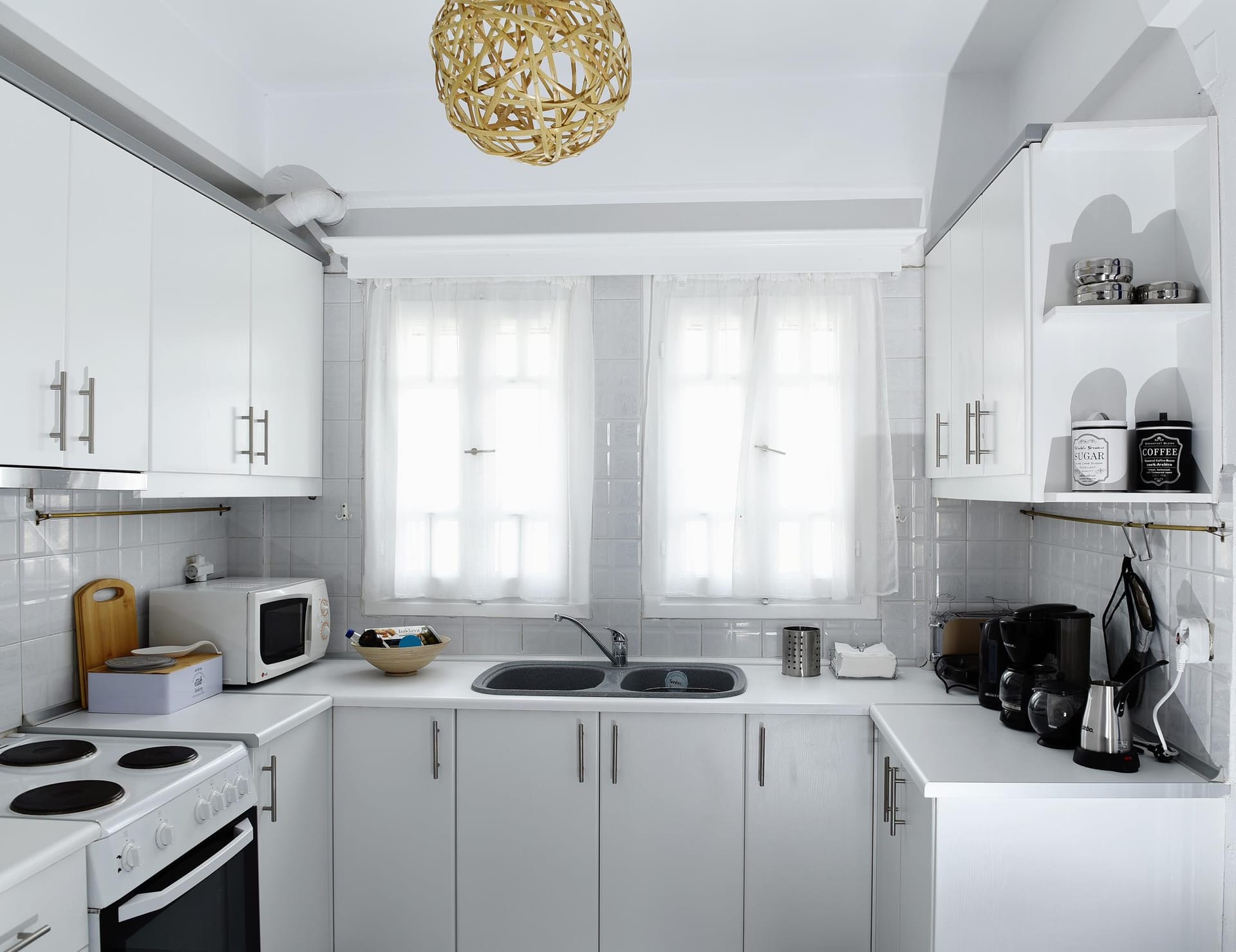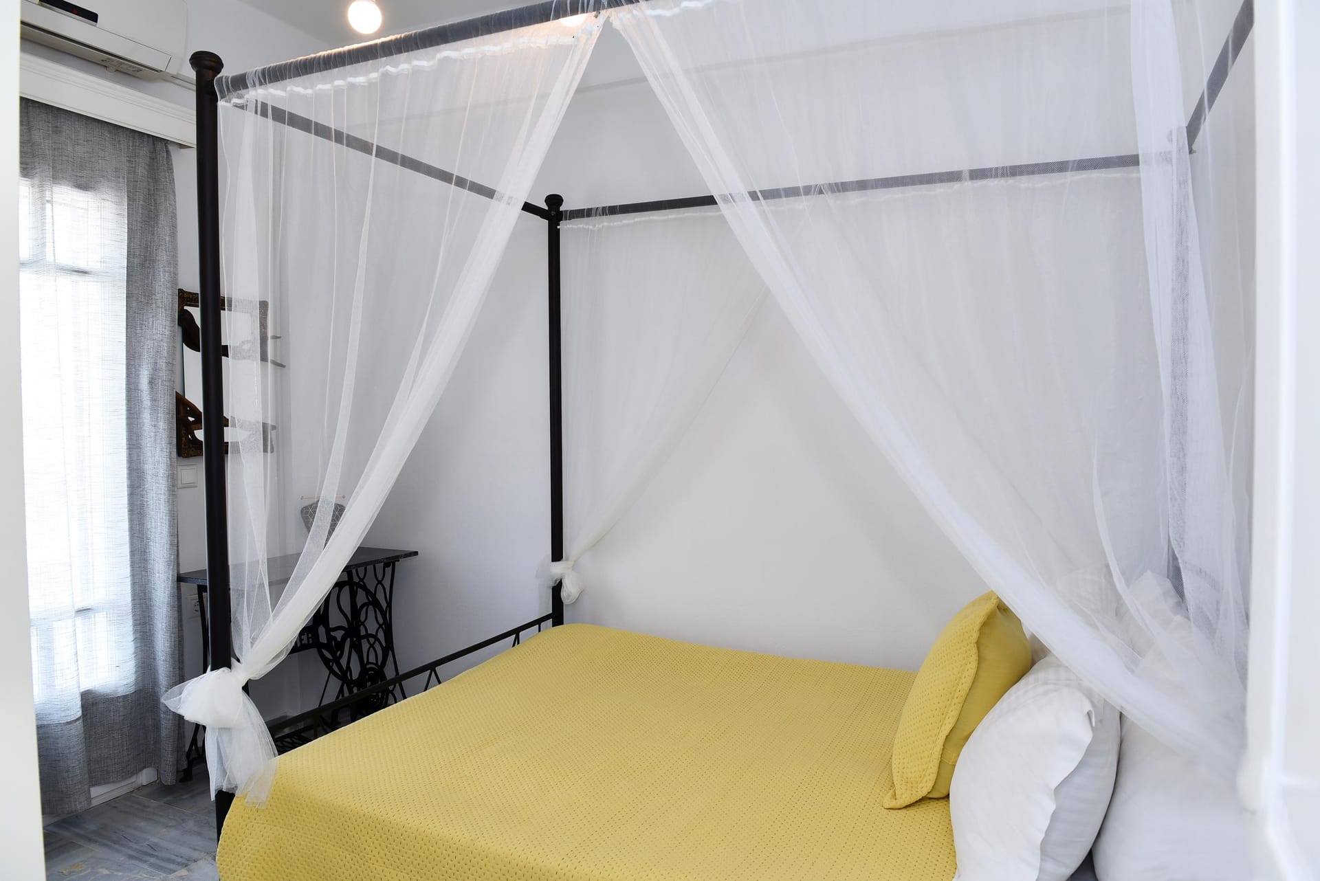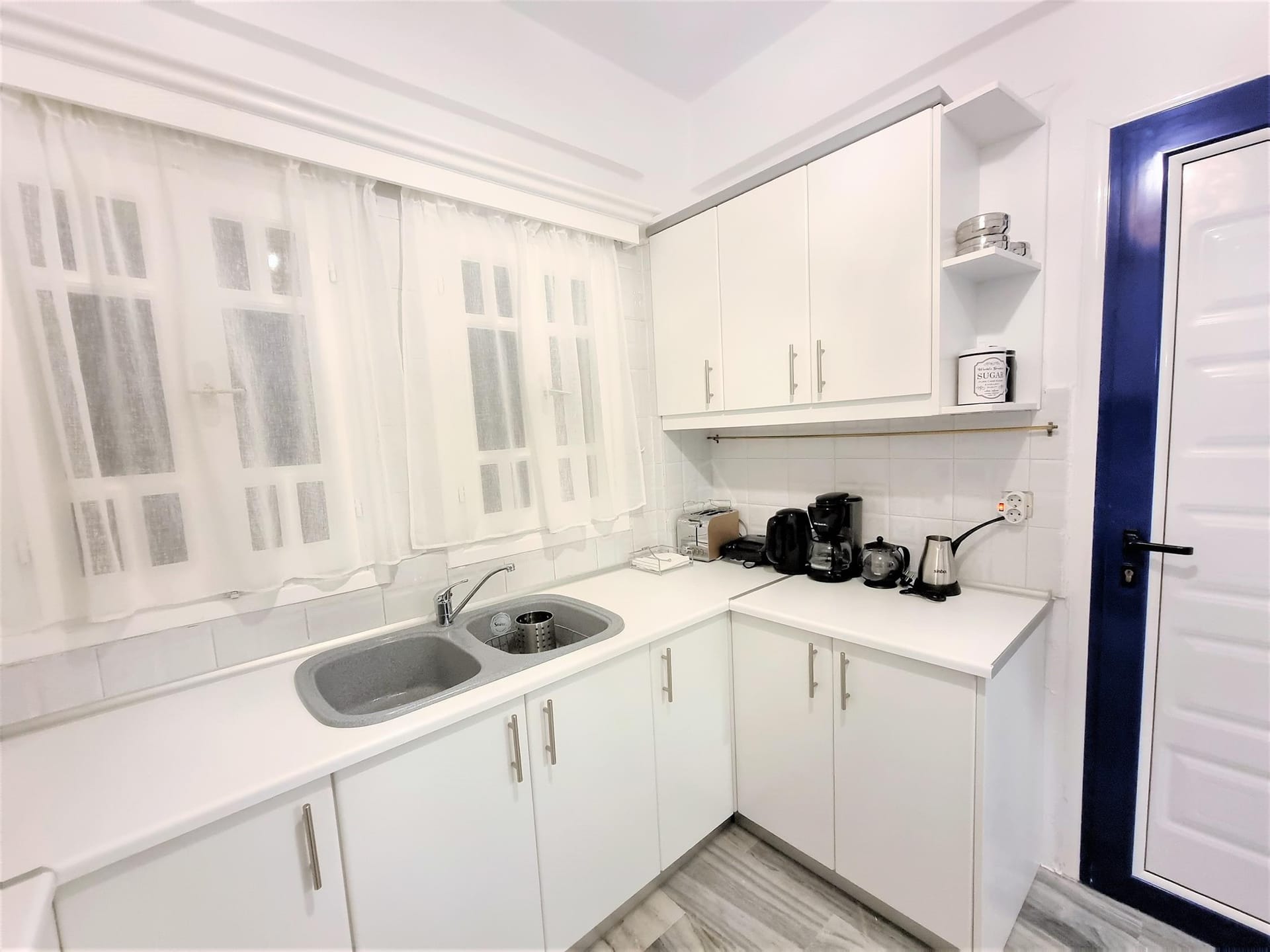 Inside the villa, there are 3 bedrooms. The Master bedroom, is a 15 m2 (165 sq.ft), it has its own 8 m2 (86 sq.ft) modern bathroom, very big wardrobes and closets, and one king size bed, with high class side furnitures and lighting. The second bedroom is an 11 sq.m (120 sq.ft) room, with an iron made bed, and spacious wardrobes, and a hand made mirror table, that will catch your attention! The 3rd bedroom, is 12 m2 (95 sq.ft) is located at the attic (top floor), and has 2 single beds and an amazing view of the sea, through its small and traditional windows! It also has a 24'' fat screen TV, and hidden lighting decoration! The second bathroom is 4.5 m2 (50 sq.ft), and has a bath tab, wash basin and wc. The kitchen is a modern type fully equipped kitchen, of 8.5 m2 (92 sq.ft), and has access to the backyard and the main living room.