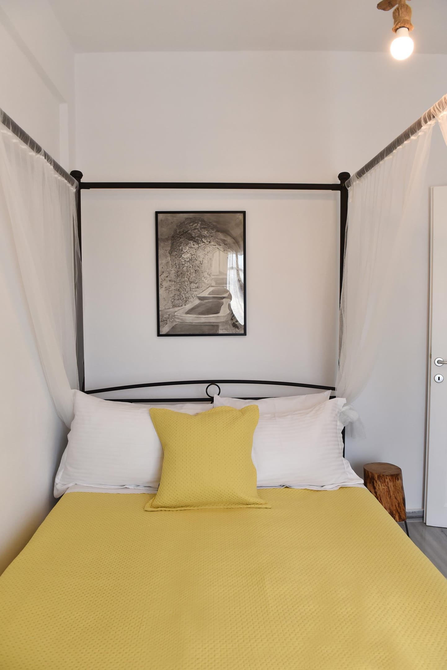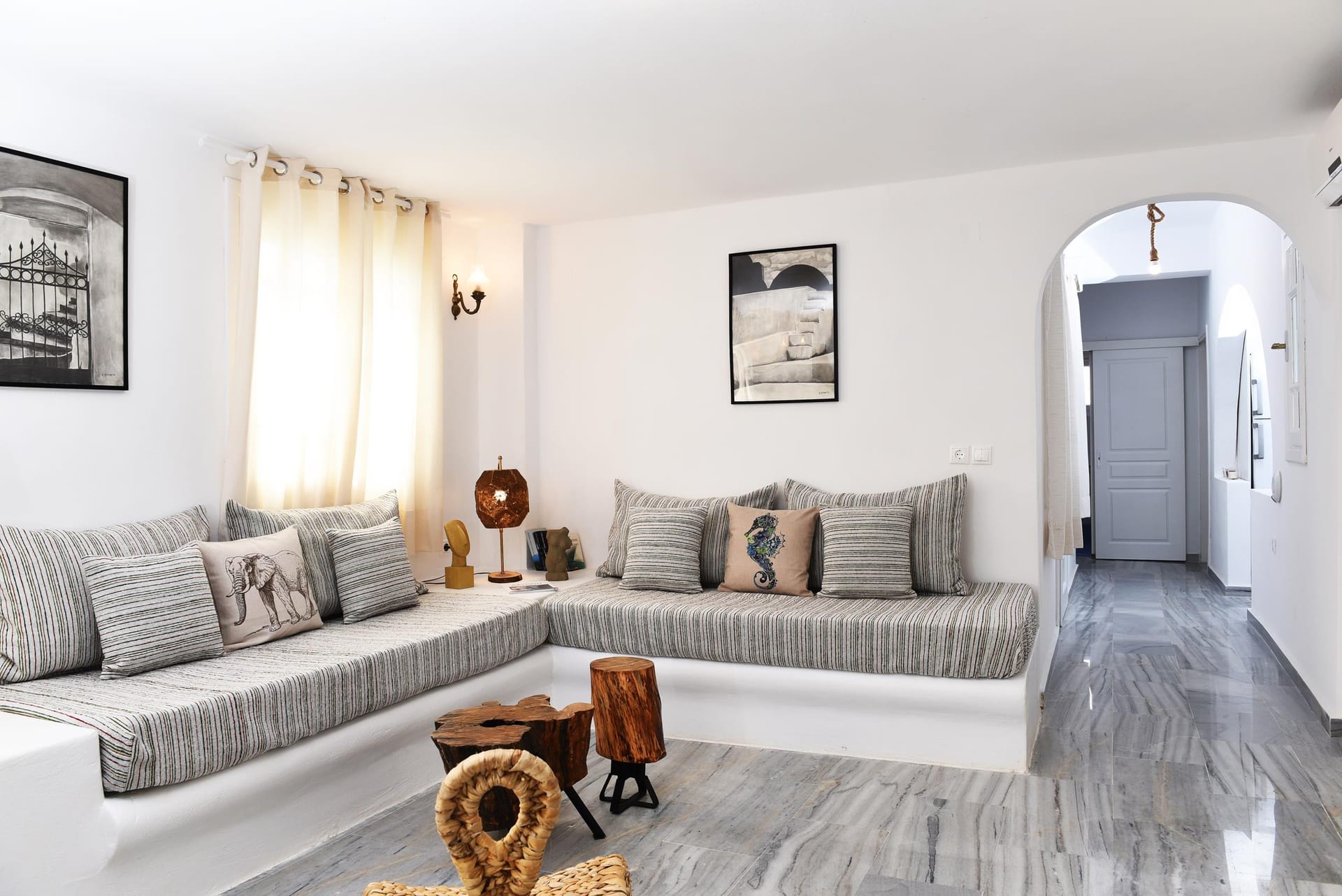 In the living room area, of 25 m2 ( 260 sq.ft), there are 2 custom build sofas, that can become 2 single beds as well. In the living room area, you can also find yoga equipment for those who wish to exercise, flat screen Smart TV and a soccer table! Our heated water jacuzzi, is a huge 2.5m x 2.5 octagonal shape and can accommodate up to 6 persons! There are 2 different terraces, where you can sit and relax, and if someone wishes, there is a fully equipped kitchen that can be used to cook your lunch or dinner. There is even a portable coal barbeque available, located on the south terrace, where you can grill local quality beef, lamp or pork, or local and tasty vegetables! At the main entrance, there is a seperate, sunny room, of 15 m2 (140 sq.ft), that can be used to have your breakfast or dinner, relax in the sofa, and enjoy the view! Inside the villa, there are Hand made Art paintings, made by a Local Artist, using Coal techique, and the table lamps located in the living room, as well as the mirrors, are hand made using sea woods!