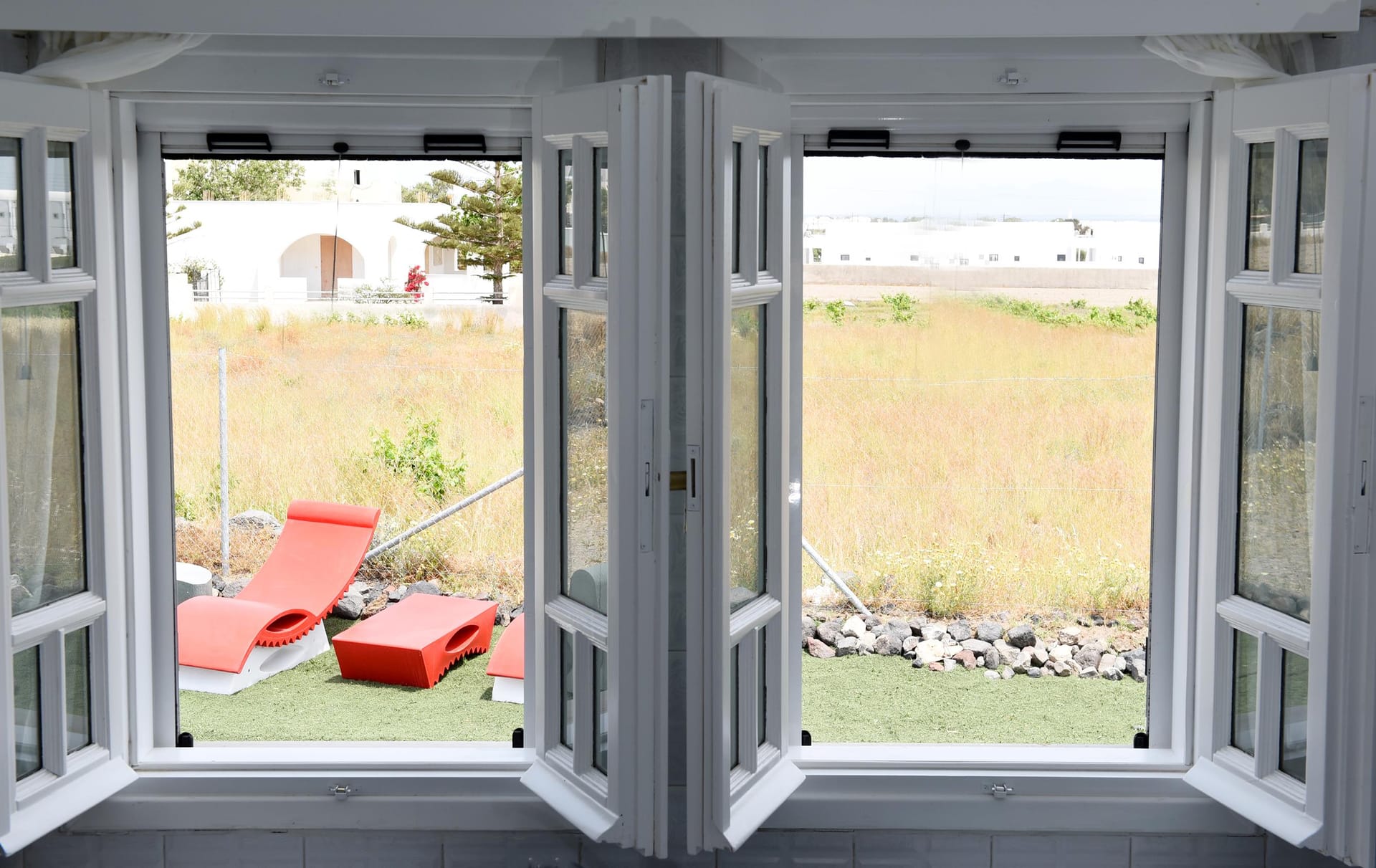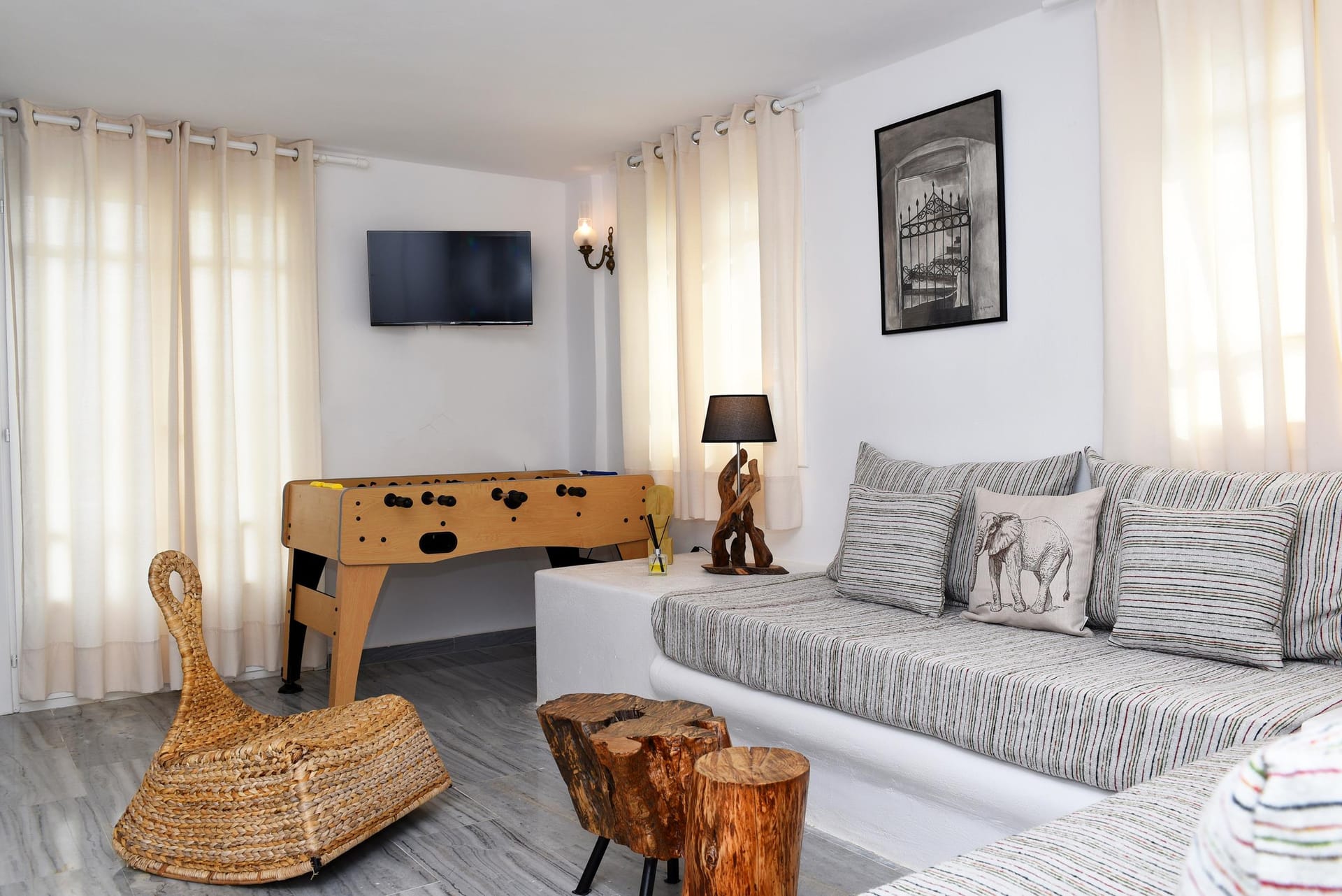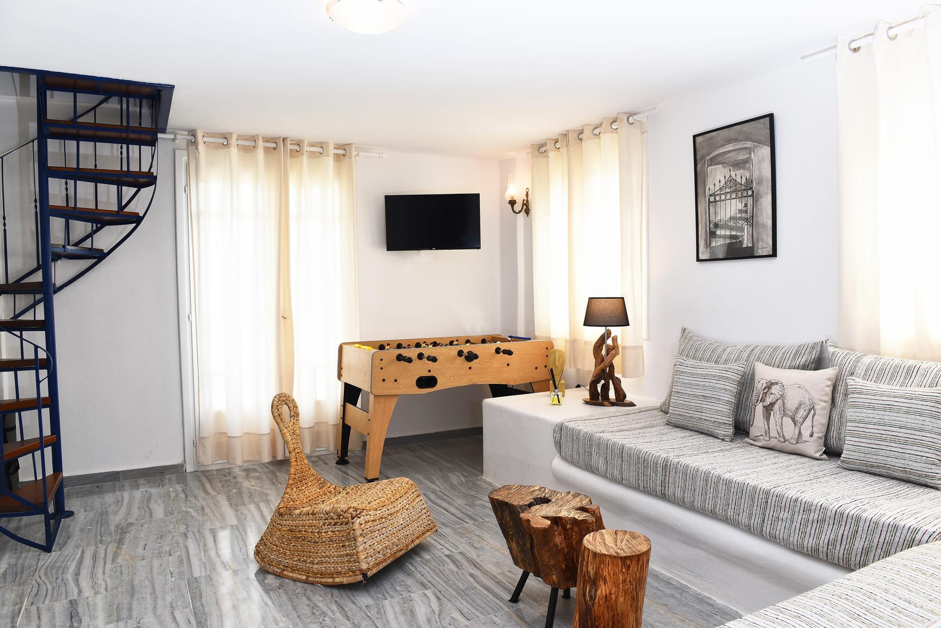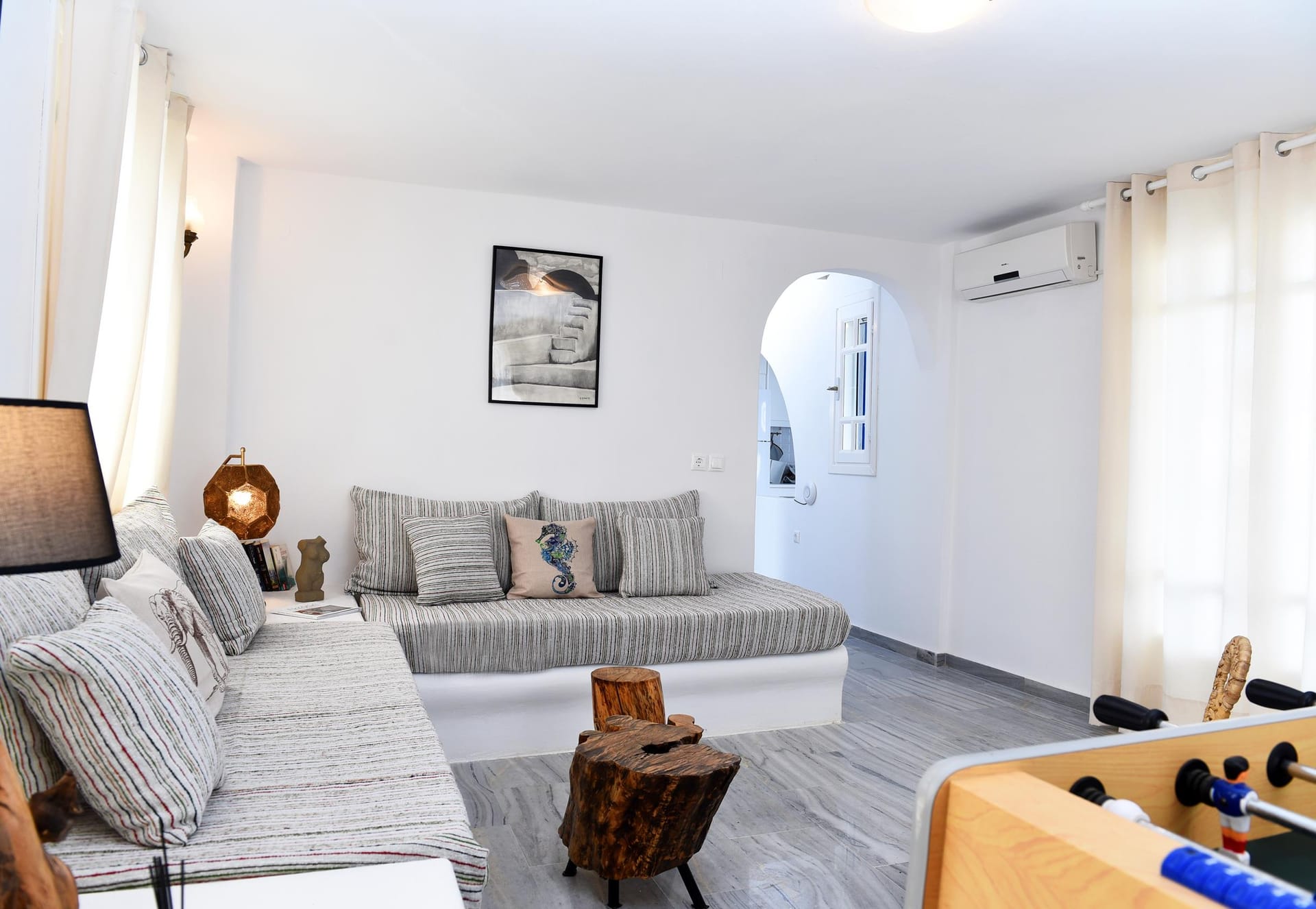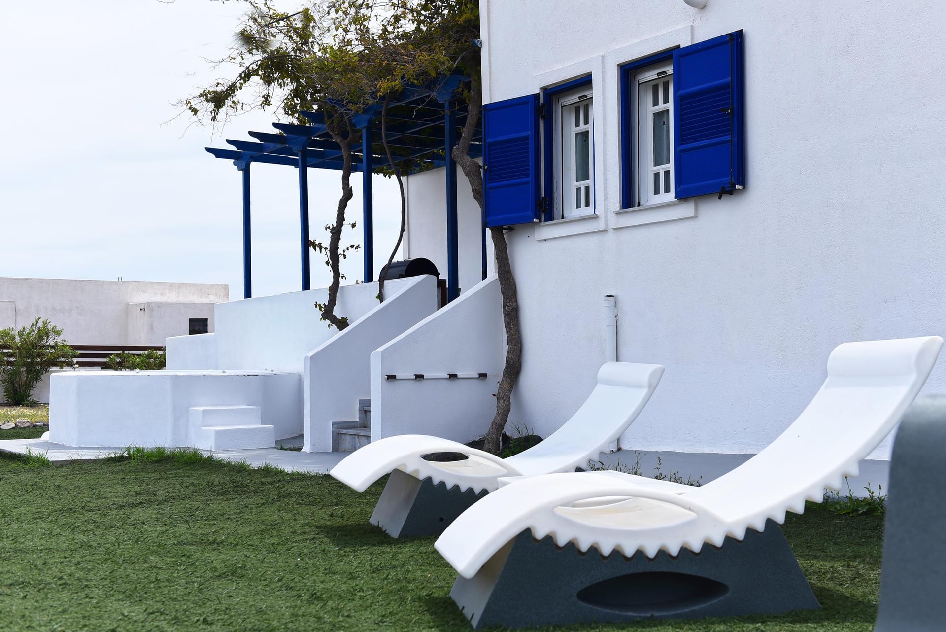 You are most welcome to our newly refurbished villa, of 120 m2, where you can literally feel the volcanic soil in your hands, and feel the energy of the ground! We left the garden area of 1.800m2 intentionally with its original soil, and we only added beautiful plants to grow around the villa, in order to provide to our guests a simple but luxury at the same time stay in the island! Let your children play with the soil of our garden, use our ping-pong table, compete in the table soccer, and relax on our modern sunbeds! There is also 90 m2 ( 920 sq.ft) of artificial grass at the back yard and the Jacuzzi area.