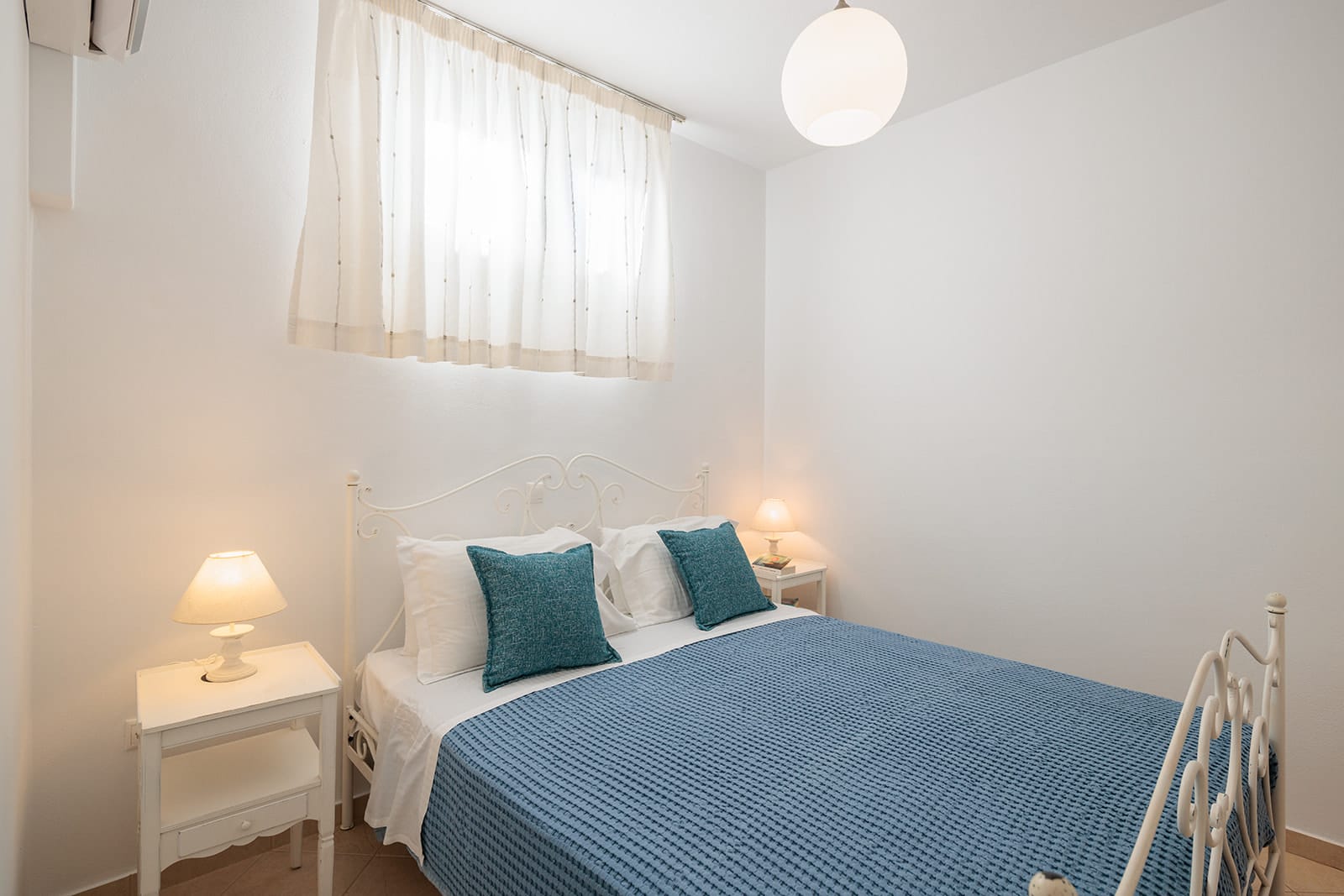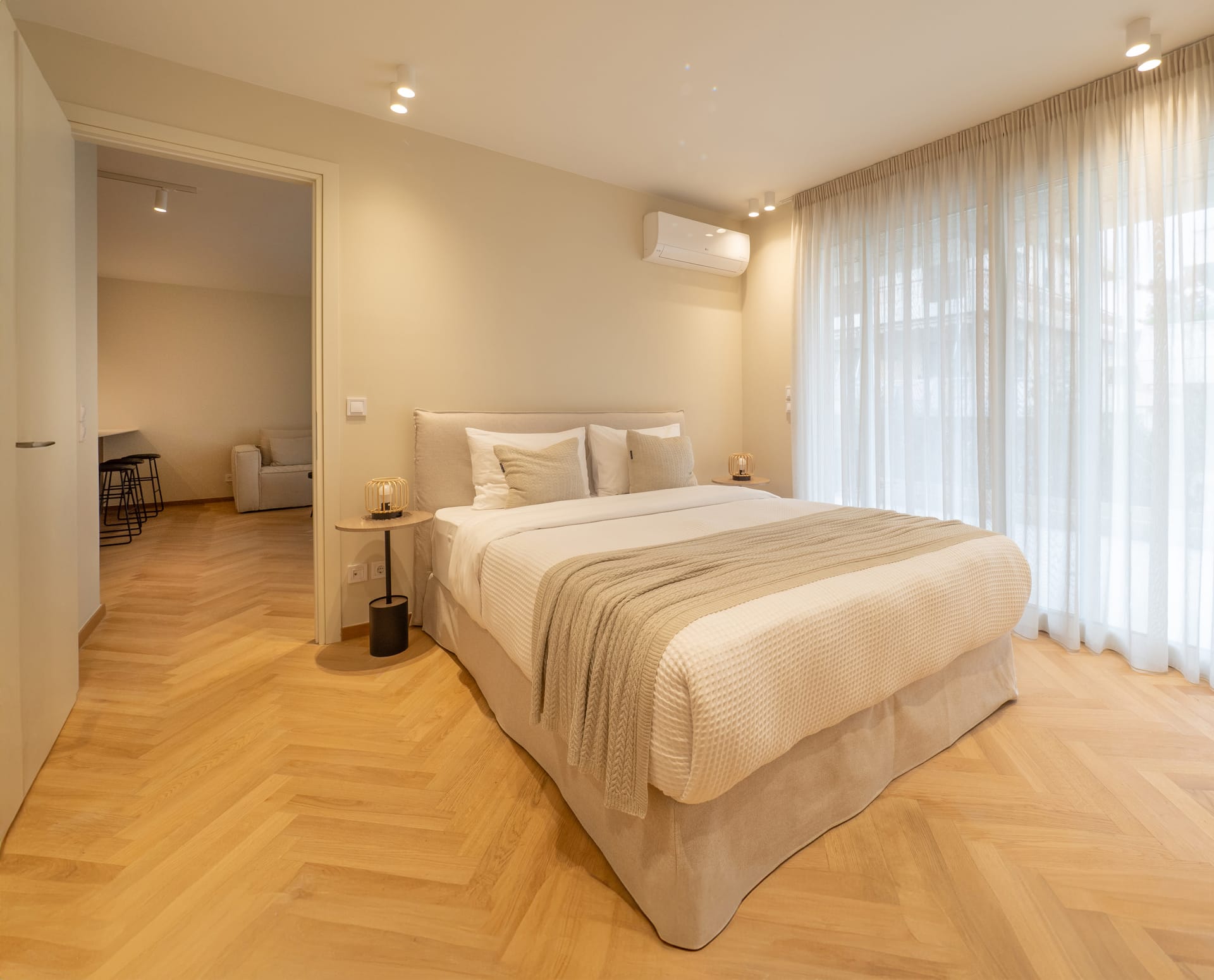 The master bedroom has a zip&lock(double), parquet flooring, and an en-suite with bath, separate shower, and dual sinks. The second twin bedroom also has an en-suite and French doors to a private terrace with fragrant plants.