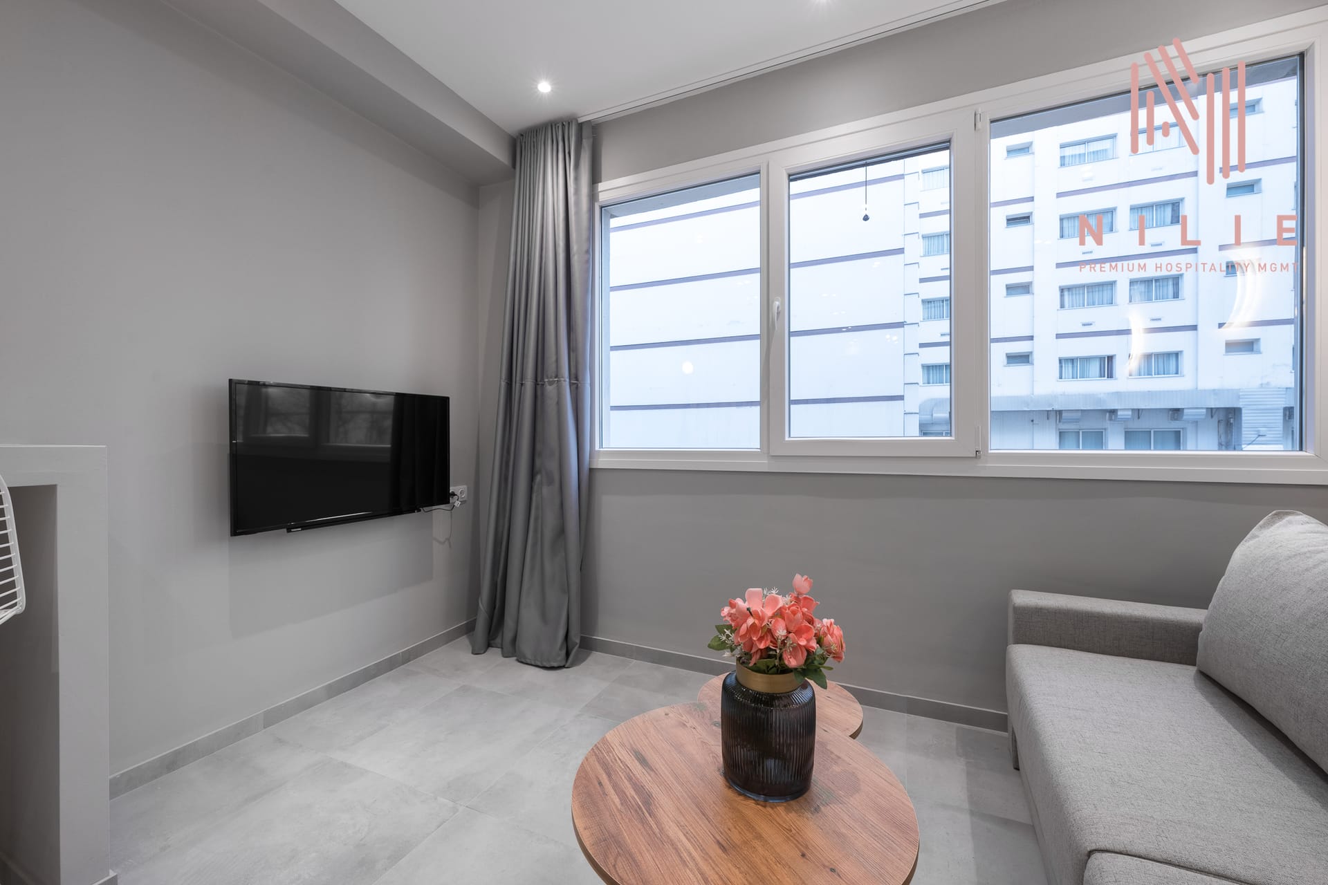 The open-plan lounge and dining area features a comfortable sofa, flat-screen TV, and dining table for six, with French doors opening onto a spacious furnished terrace ideal for alfresco dining. The kitchen is fully equipped with granite worktops, microwave, washing machine, and all modern conveniences.