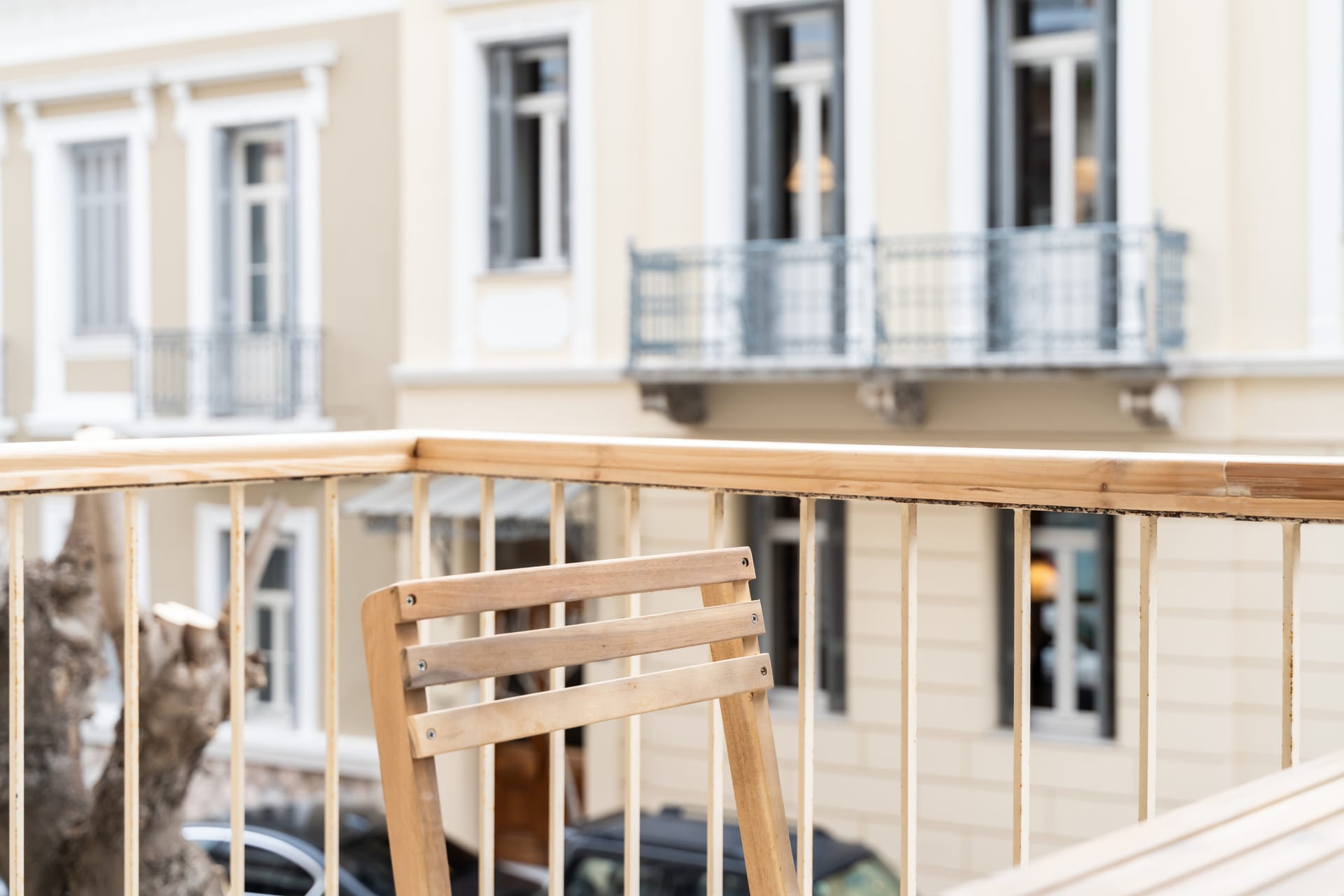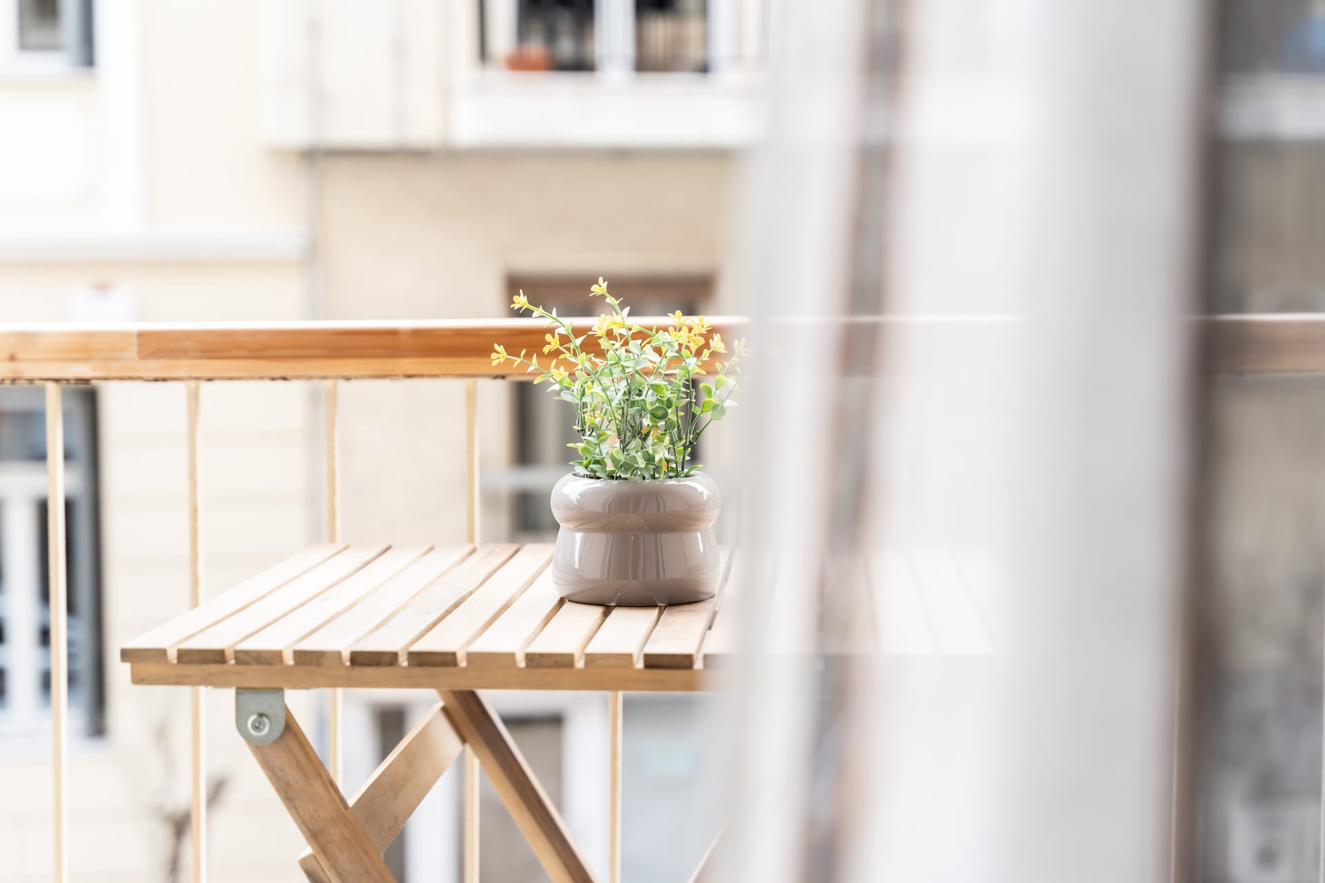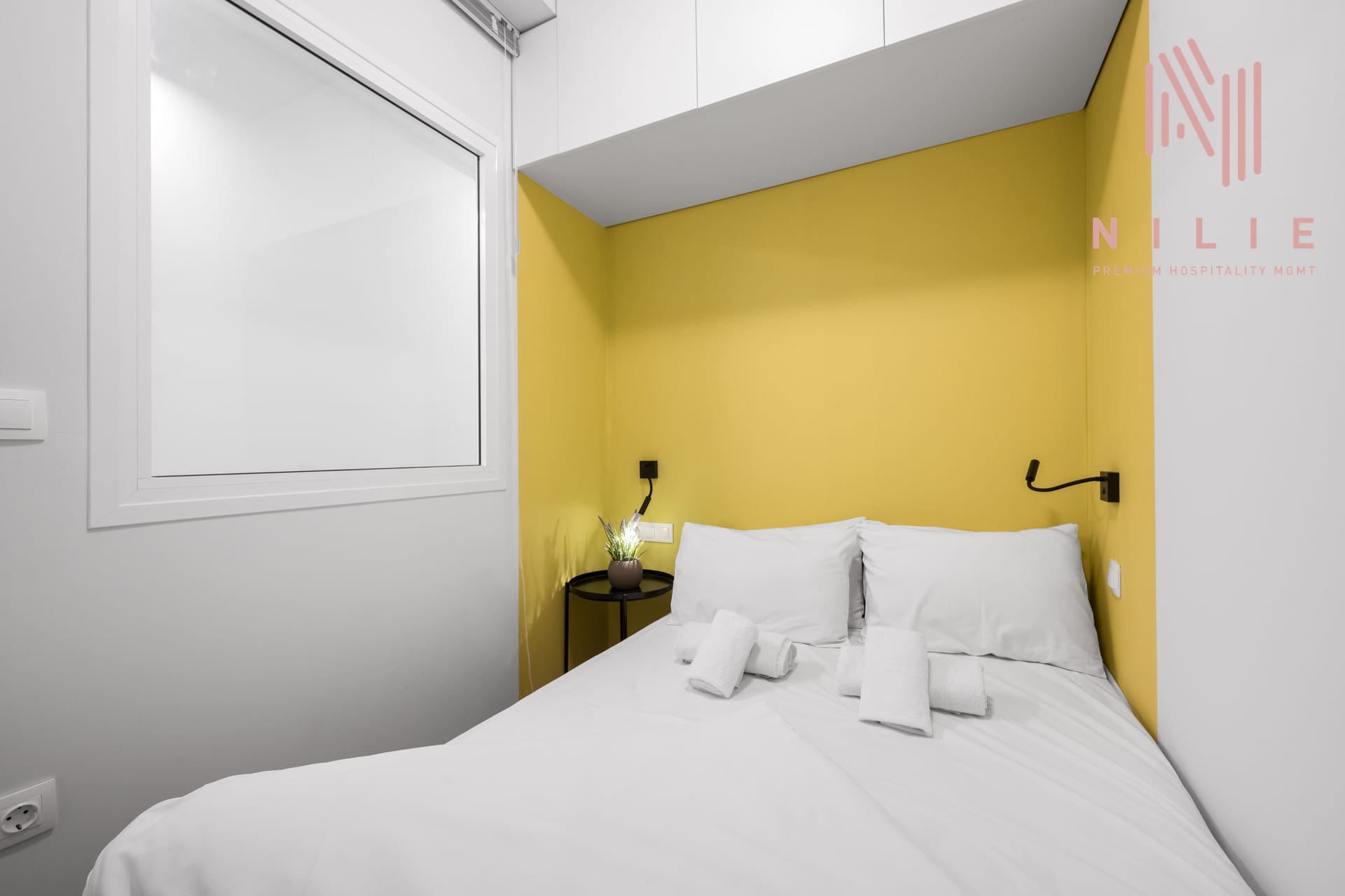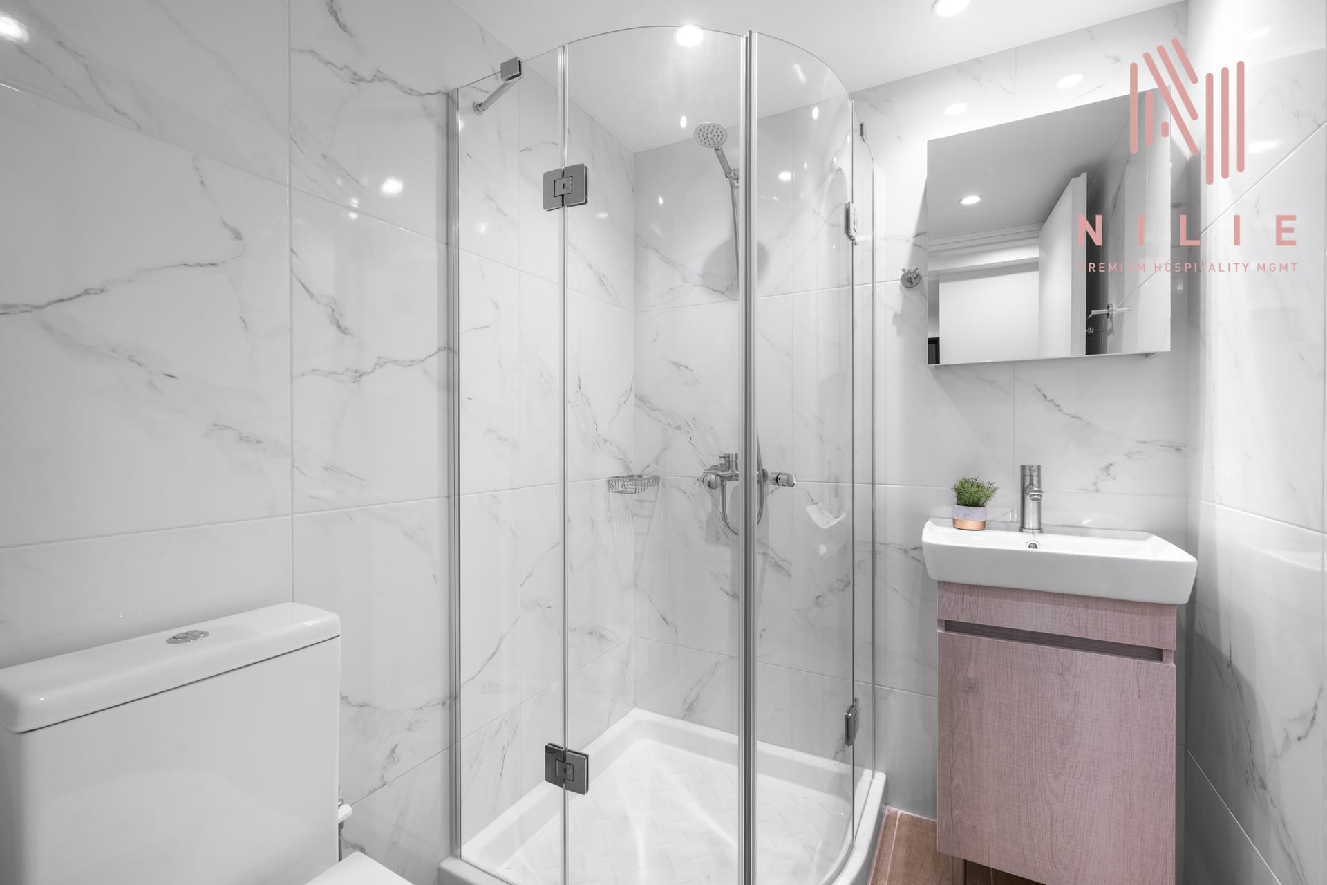 The bedroom has a double bed, balcony access, and a fully tiled en-suite bathroom with walk-in shower, plus a separate guest WC.