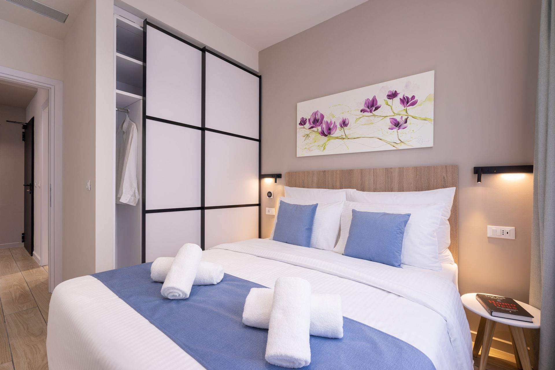 The master bedroom has a king-size bed, parquet flooring, French doors with panoramic views, and an en-suite with dual sinks, bath/shower, and WC. The second bedroom has two large singles and an adjacent bathroom with bath/shower, vanity, and WC.