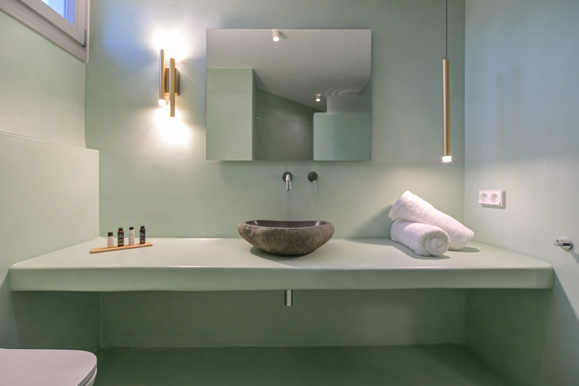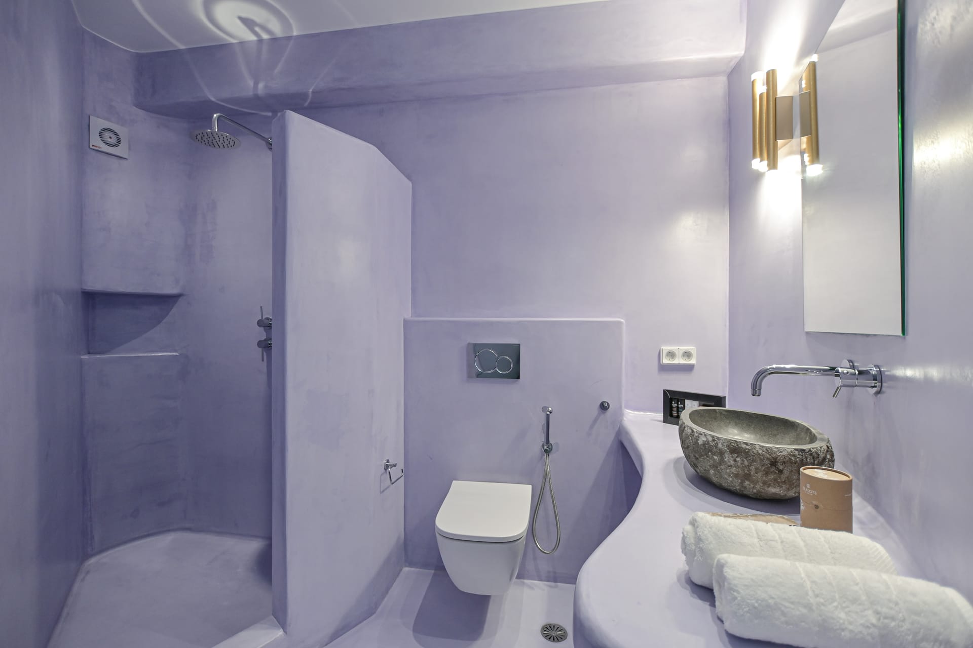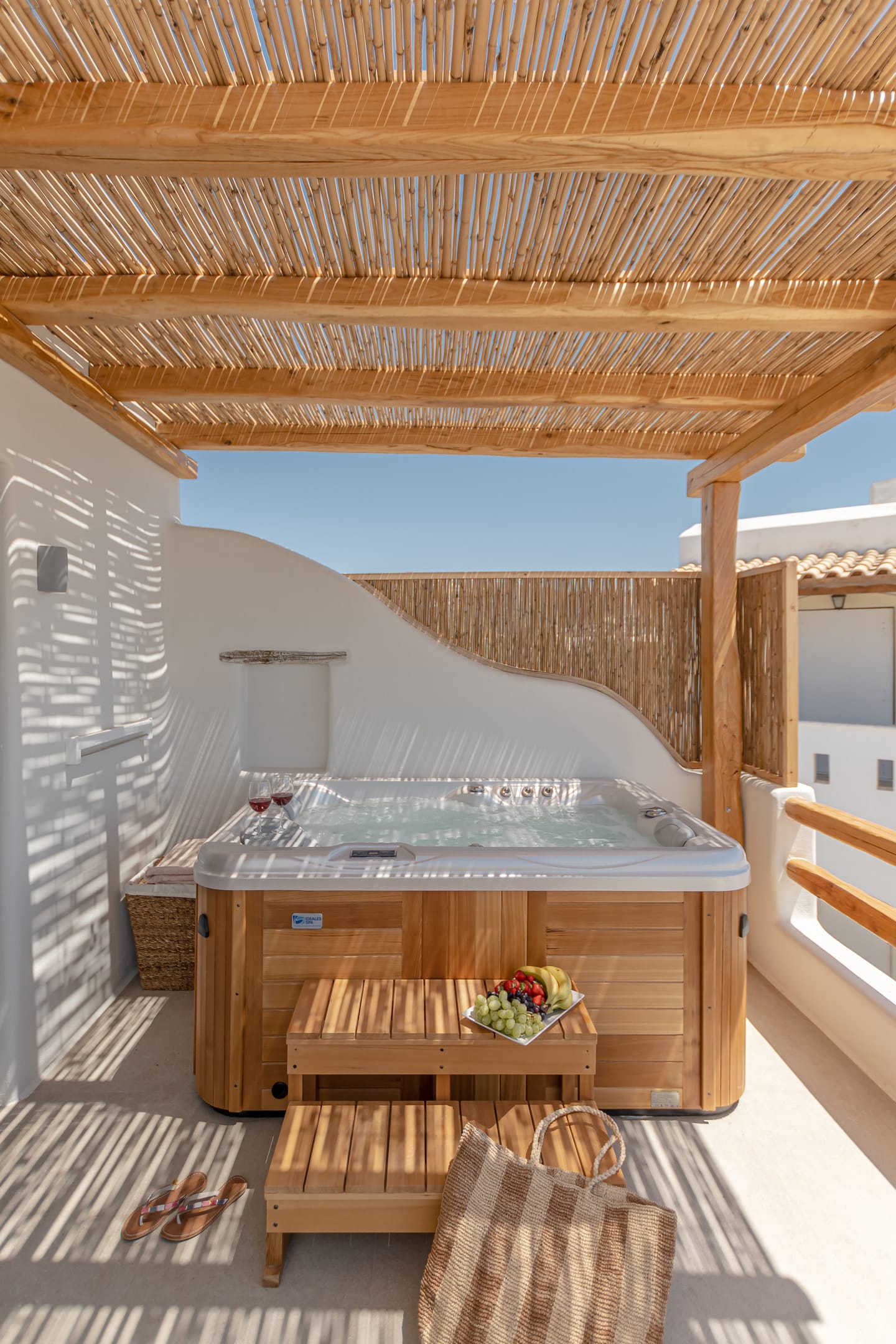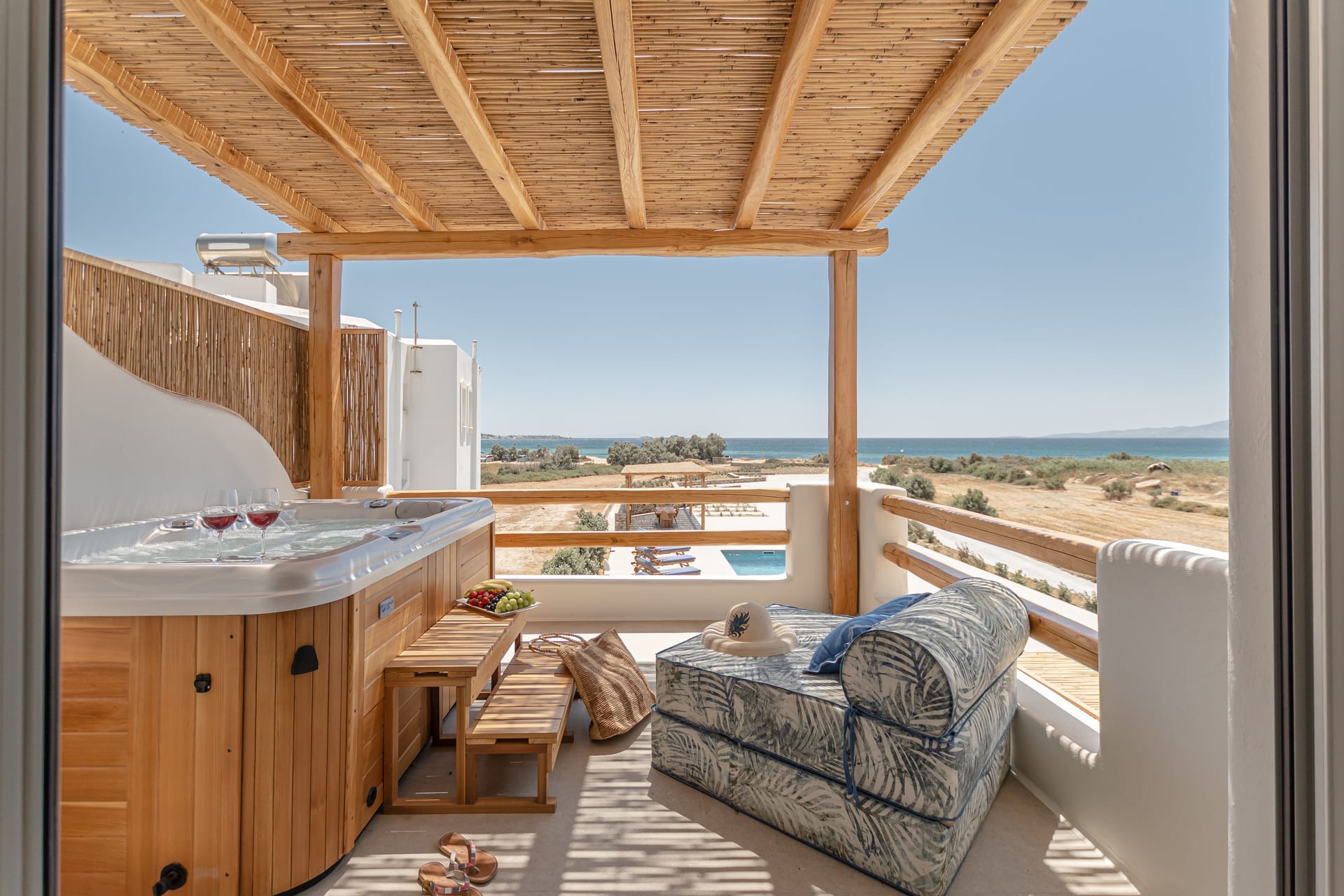 Upstairs, there are two bedrooms. One of them is the premium bedroom. The Premium bedroom overlooks the sea and the sunset and has a veranda with a pergola, an outdoor spa 2-seat, and an outdoor poof relax. The other one is the master bedroom. The master bedroom overlooks the mountain and the sunrise and has two balconies (one with a lounge suite with cushions and the other with a partial sea view).