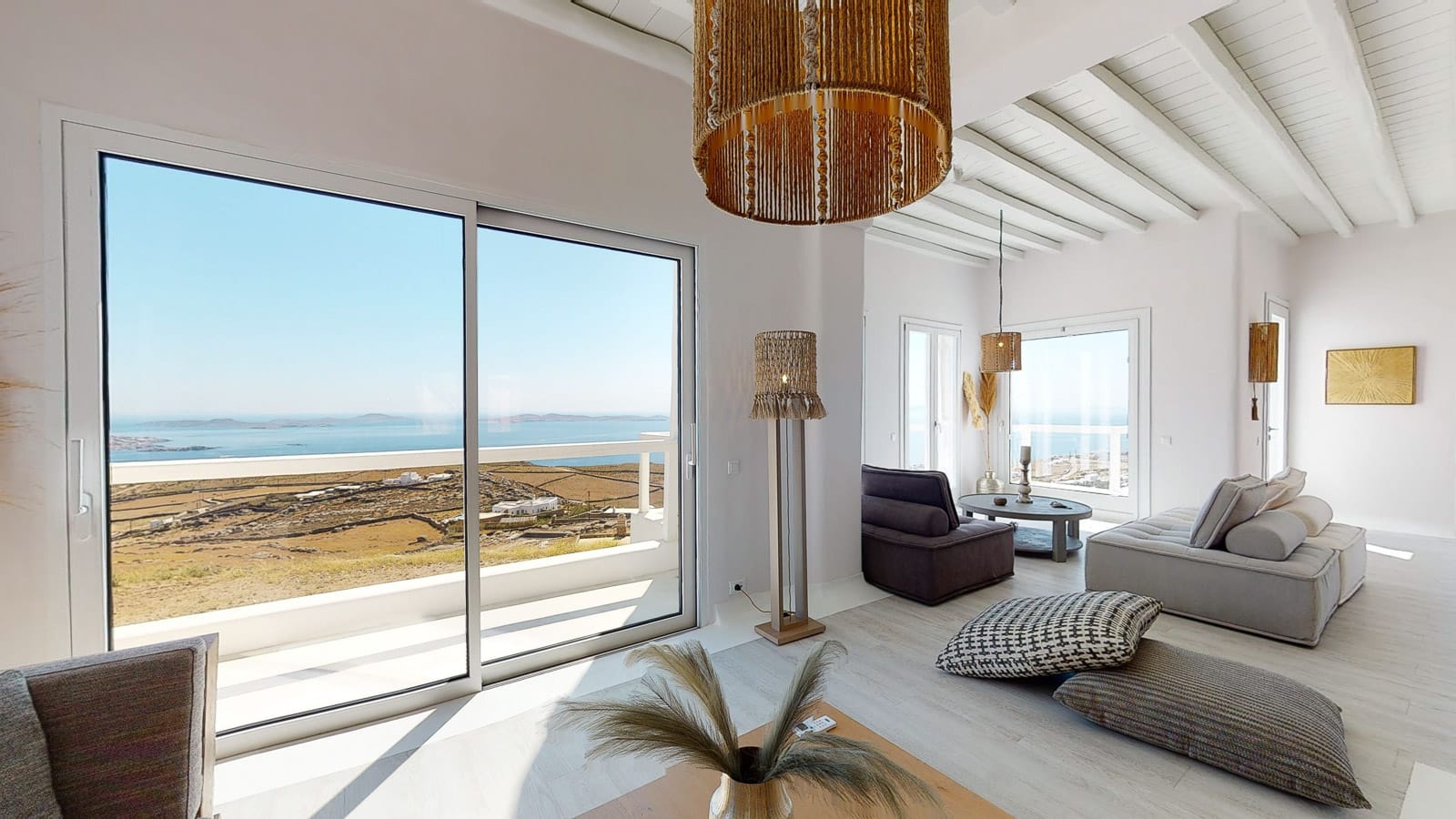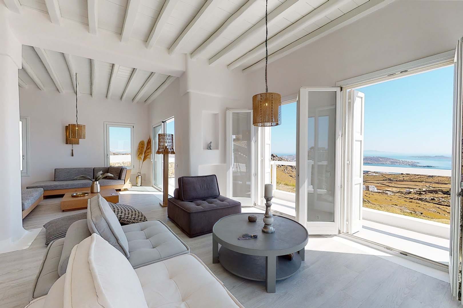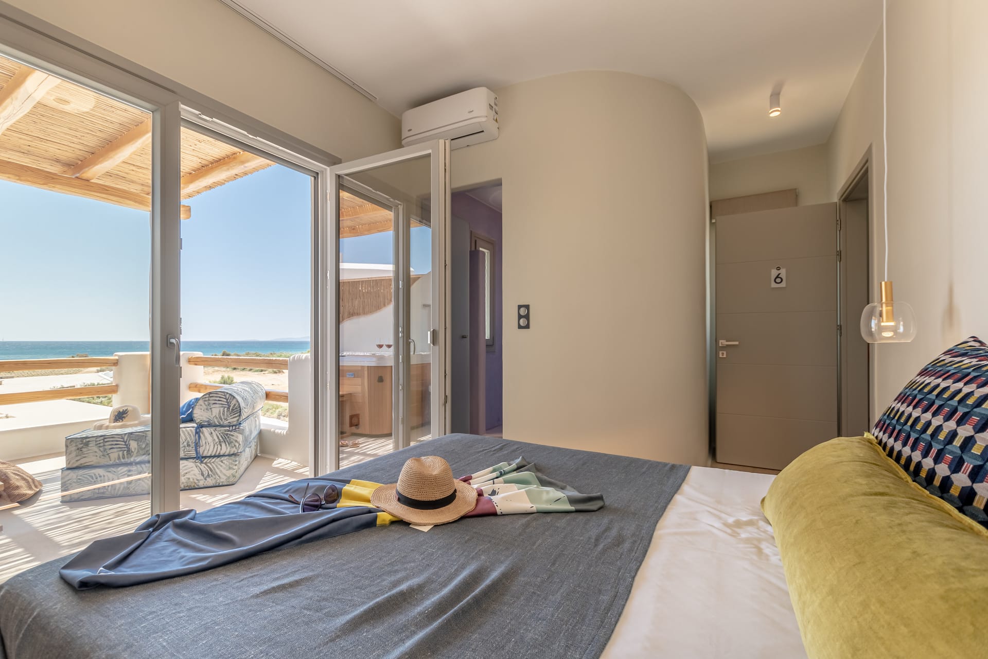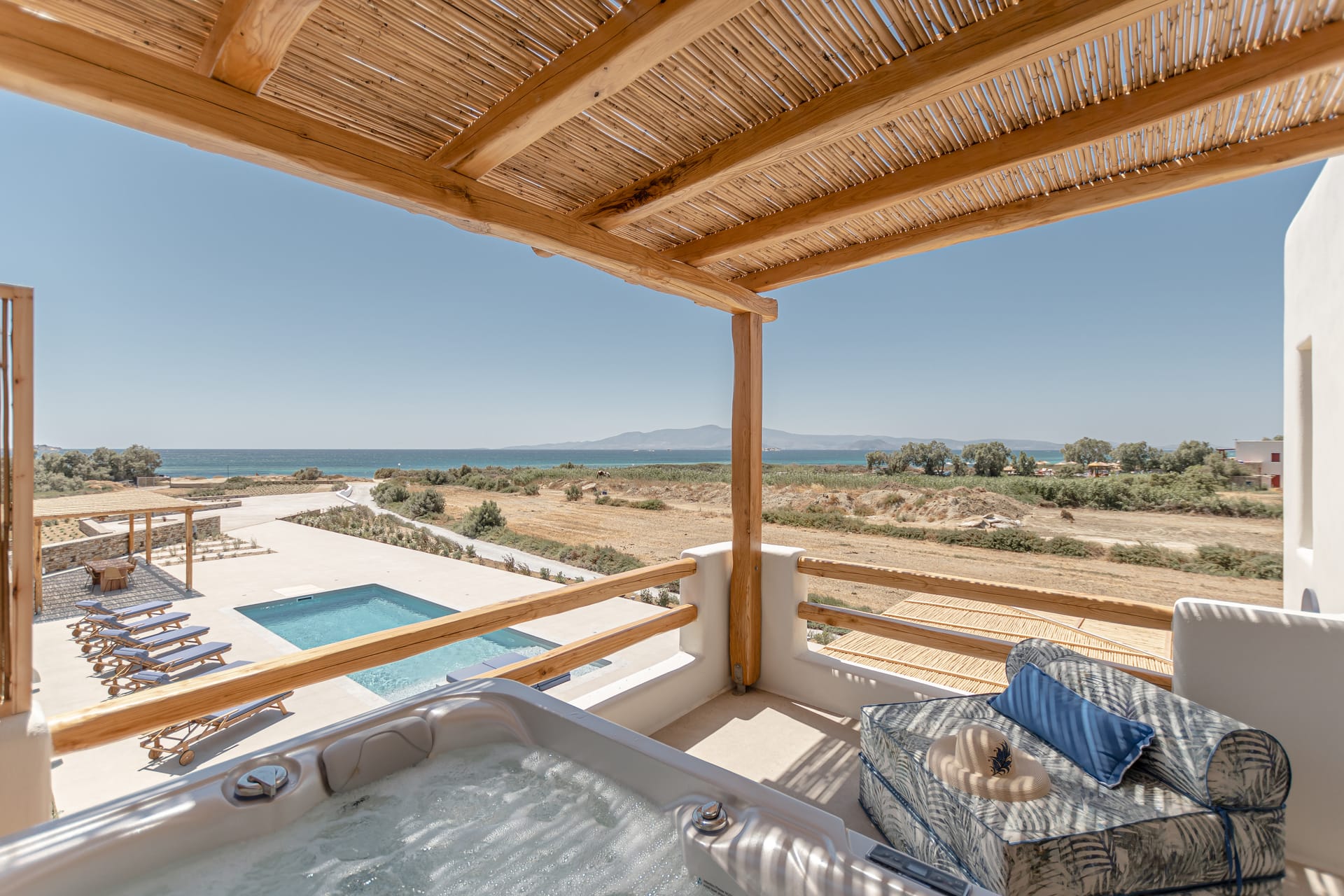 Its privileged location, with a direct and unobstructed sea view, is a strong point to visit. It offers absolute peace, due to its privacy, enjoying the guests a truly relaxing holiday. The villa’s owner is Kiriaki. Armelina Villa’s story goes back to Kiriaki’s grandmother’s sister, who was named Armelina and owned the plot of land where Armelina Villa is situated today. The aesthetics of the space is inspired by the bright summer sunlight, the blue of the Aegean Sea, and the nature of Naxos Island. The villa can be rented as a whole property. With 6 bedrooms and 6 baths, Armelina Villa is ideal for gathering a group of friends or family together with enough space for everyone to relax, offering views of the Aegean Sea and the unique sunset of the Cyclades.