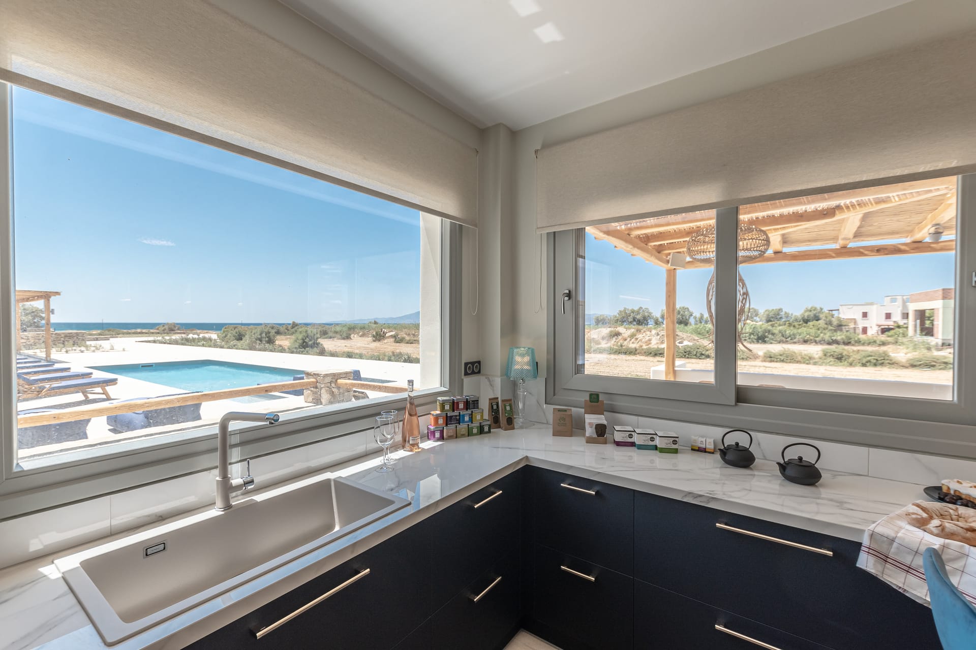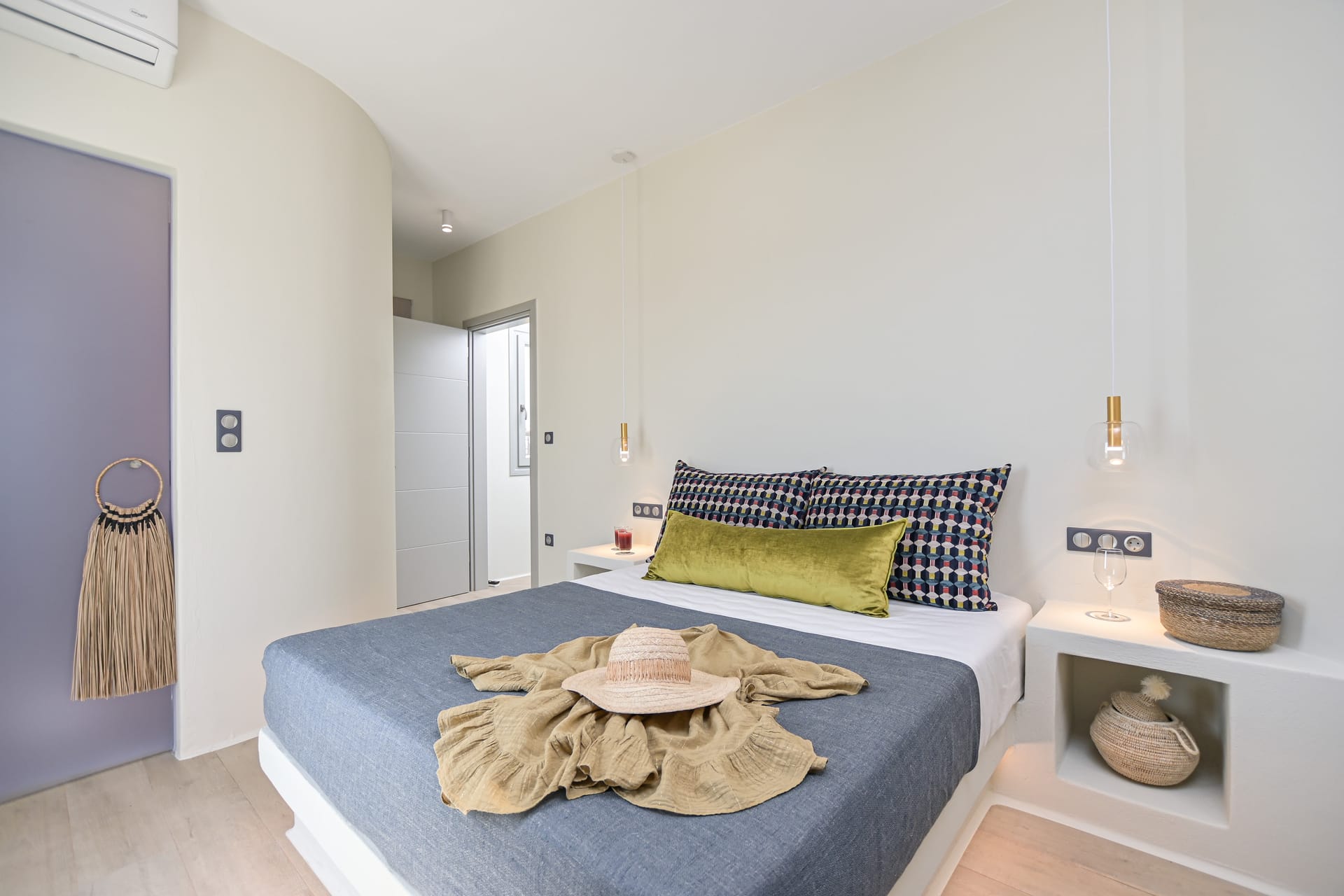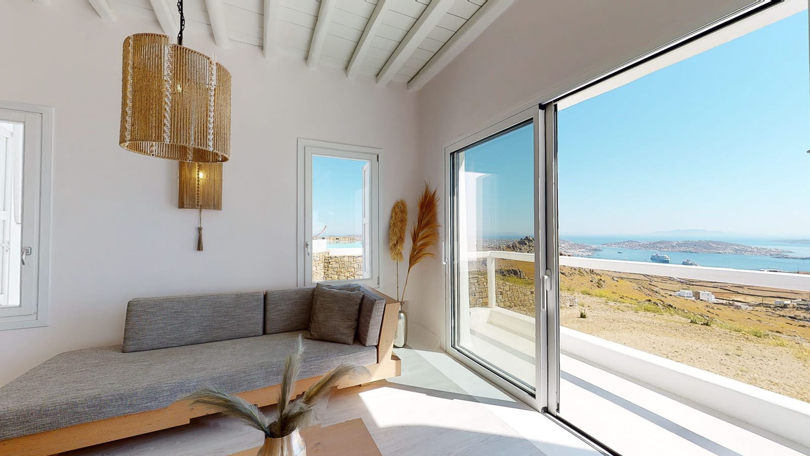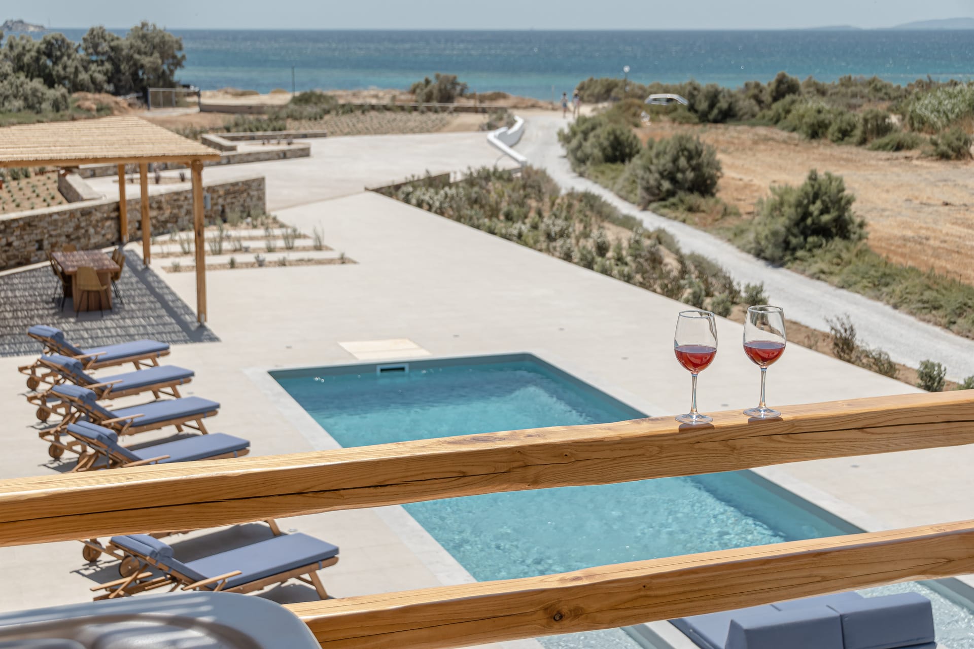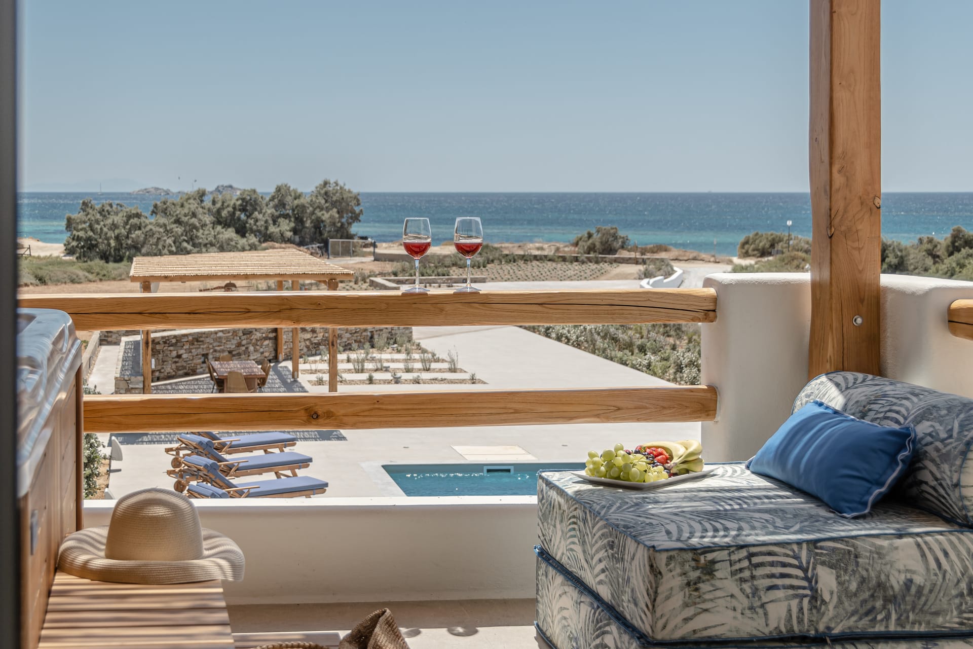 Its privileged location, with a direct and unobstructed sea view, is a strong point to visit. It offers absolute peace, due to its privacy, enjoying the guests a truly relaxing holiday. The villa’s owner is Kiriaki. Armelina Villa’s story goes back to Kiriaki’s grandmother’s sister, who was named Armelina and owned the plot of land where Armelina Villa is situated today. The aesthetics of the space is inspired by the bright summer sunlight, the blue of the Aegean Sea, and the nature of Naxos Island. The villa can be rented as a whole property. With 6 bedrooms and 6 baths, Armelina Villa is ideal for gathering a group of friends or family together with enough space for everyone to relax, offering views of the Aegean Sea and the unique sunset of the Cyclades.