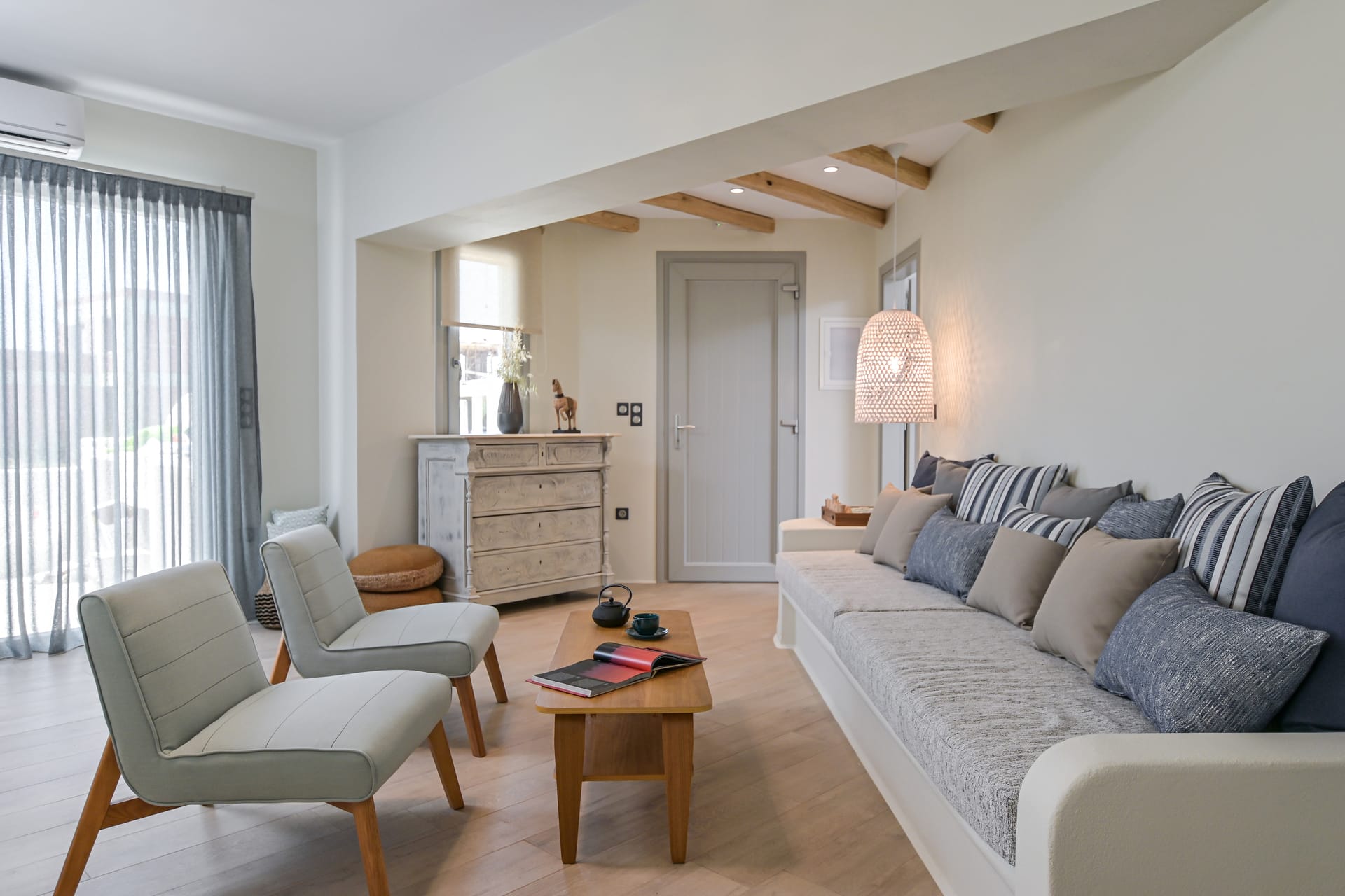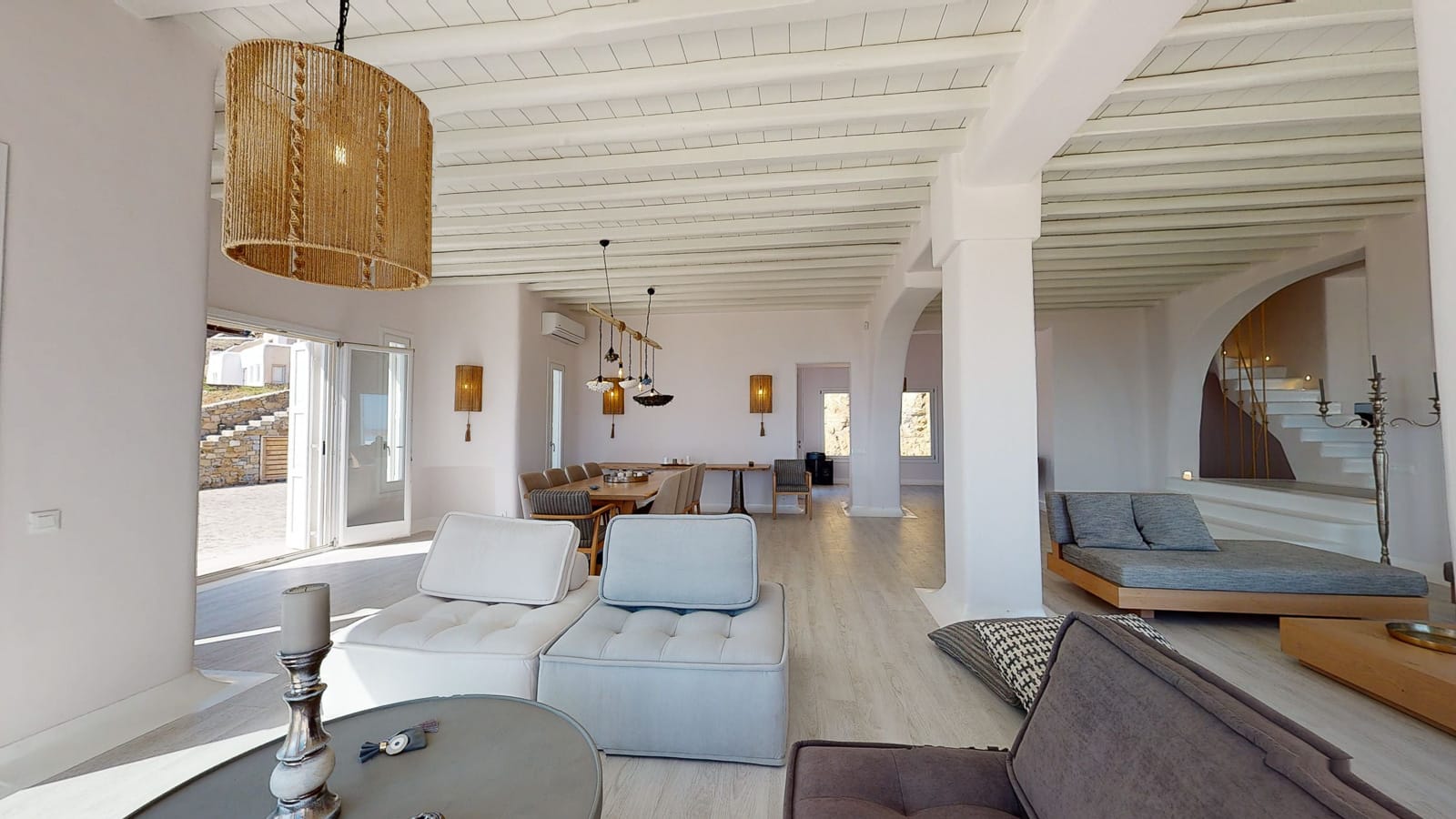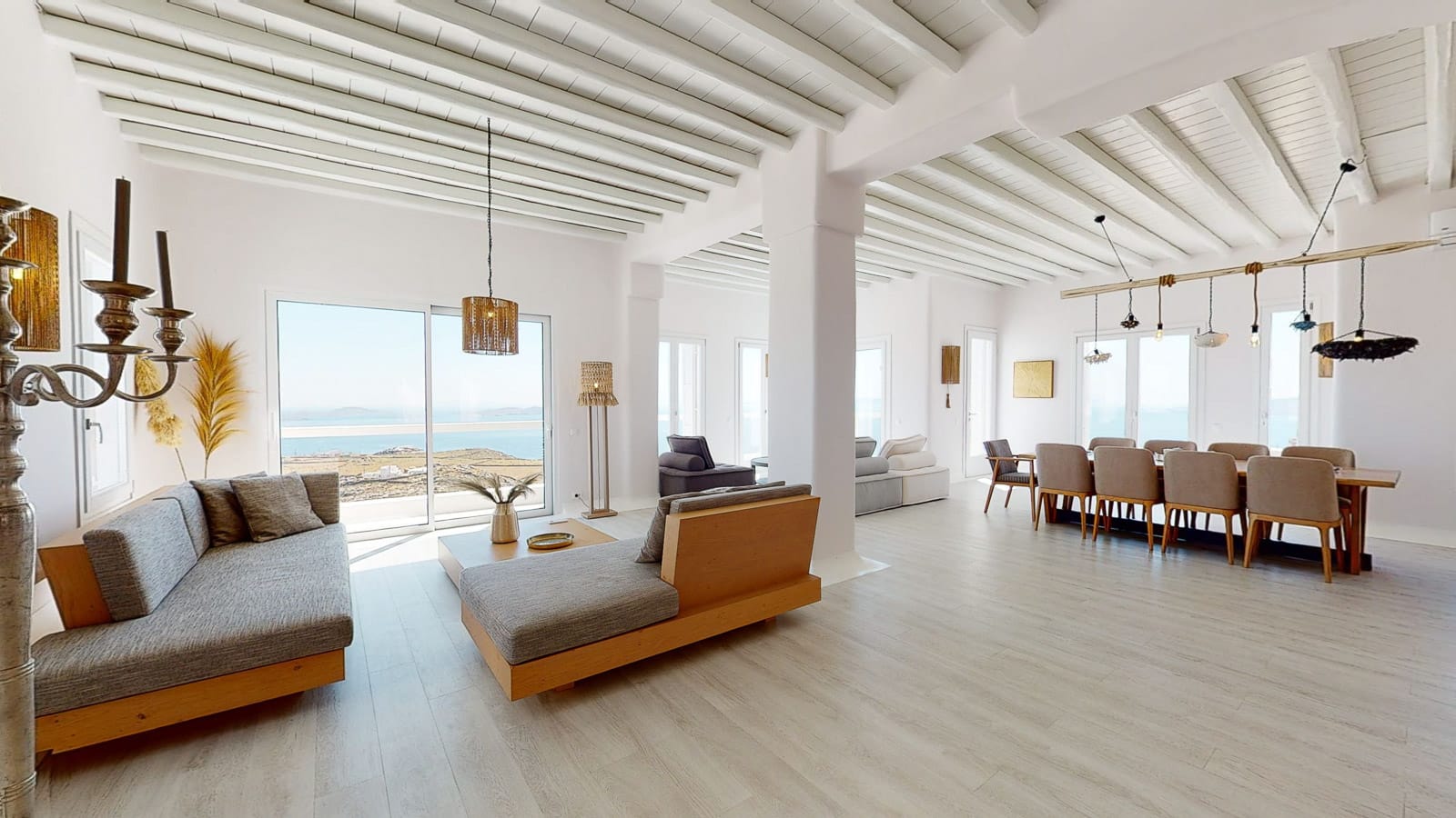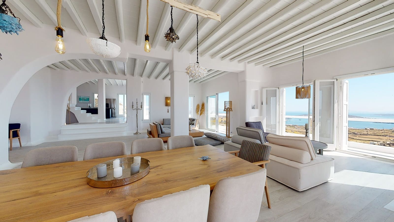 Its privileged location, with a direct and unobstructed sea view, is a strong point to visit. It offers absolute peace, due to its privacy, enjoying the guests a truly relaxing holiday. The villa’s owner is Kiriaki. Armelina Villa’s story goes back to Kiriaki’s grandmother’s sister, who was named Armelina and owned the plot of land where Armelina Villa is situated today. The aesthetics of the space is inspired by the bright summer sunlight, the blue of the Aegean Sea, and the nature of Naxos Island. The villa can be rented as a whole property. With 6 bedrooms and 6 baths, Armelina Villa is ideal for gathering a group of friends or family together with enough space for everyone to relax, offering views of the Aegean Sea and the unique sunset of the Cyclades.