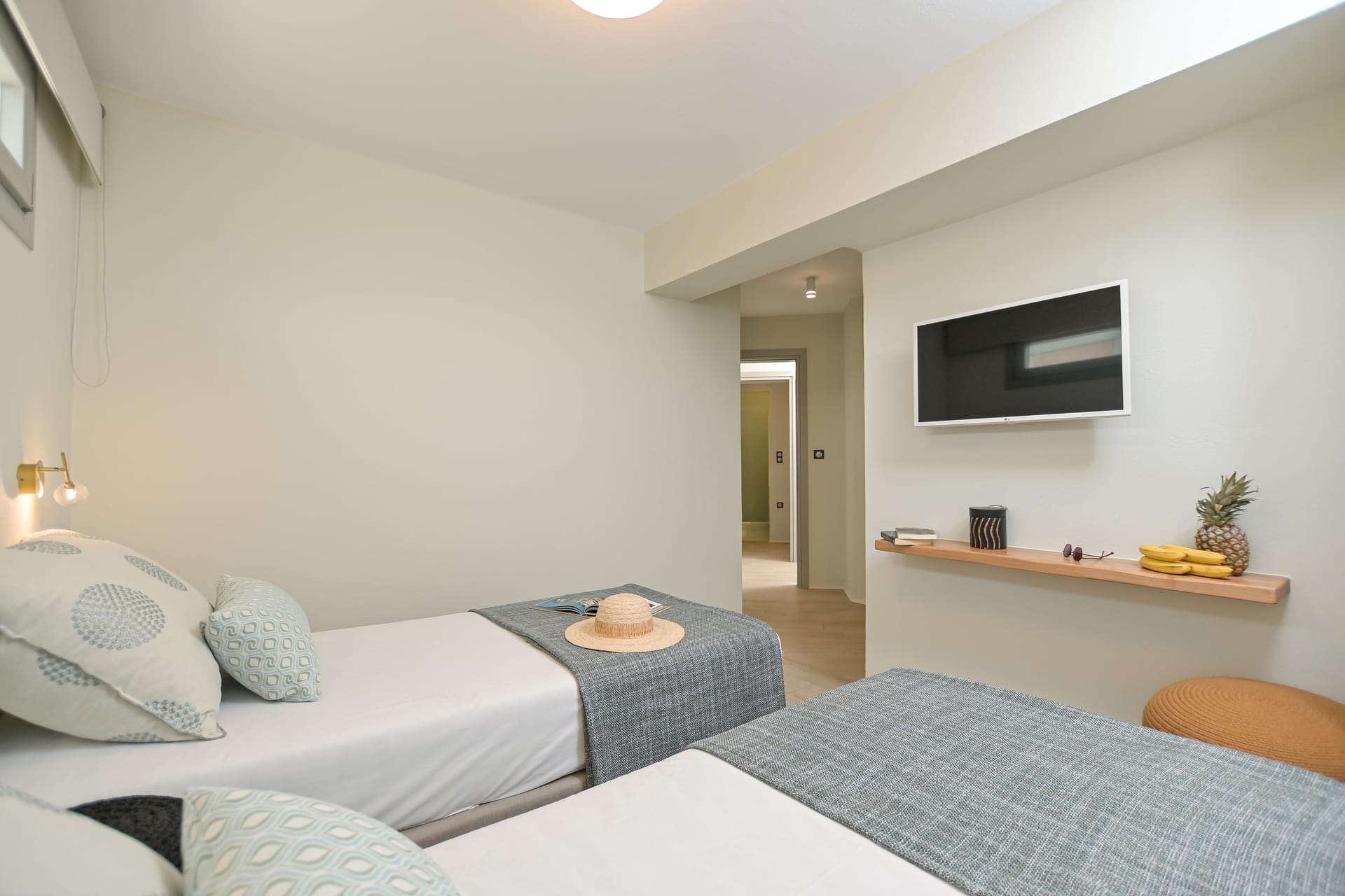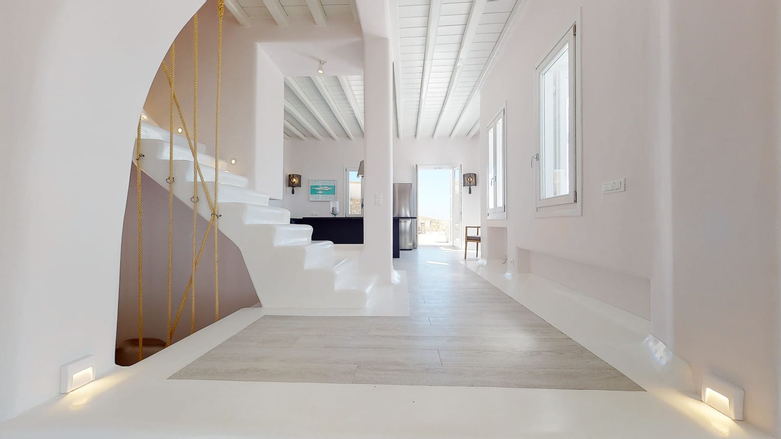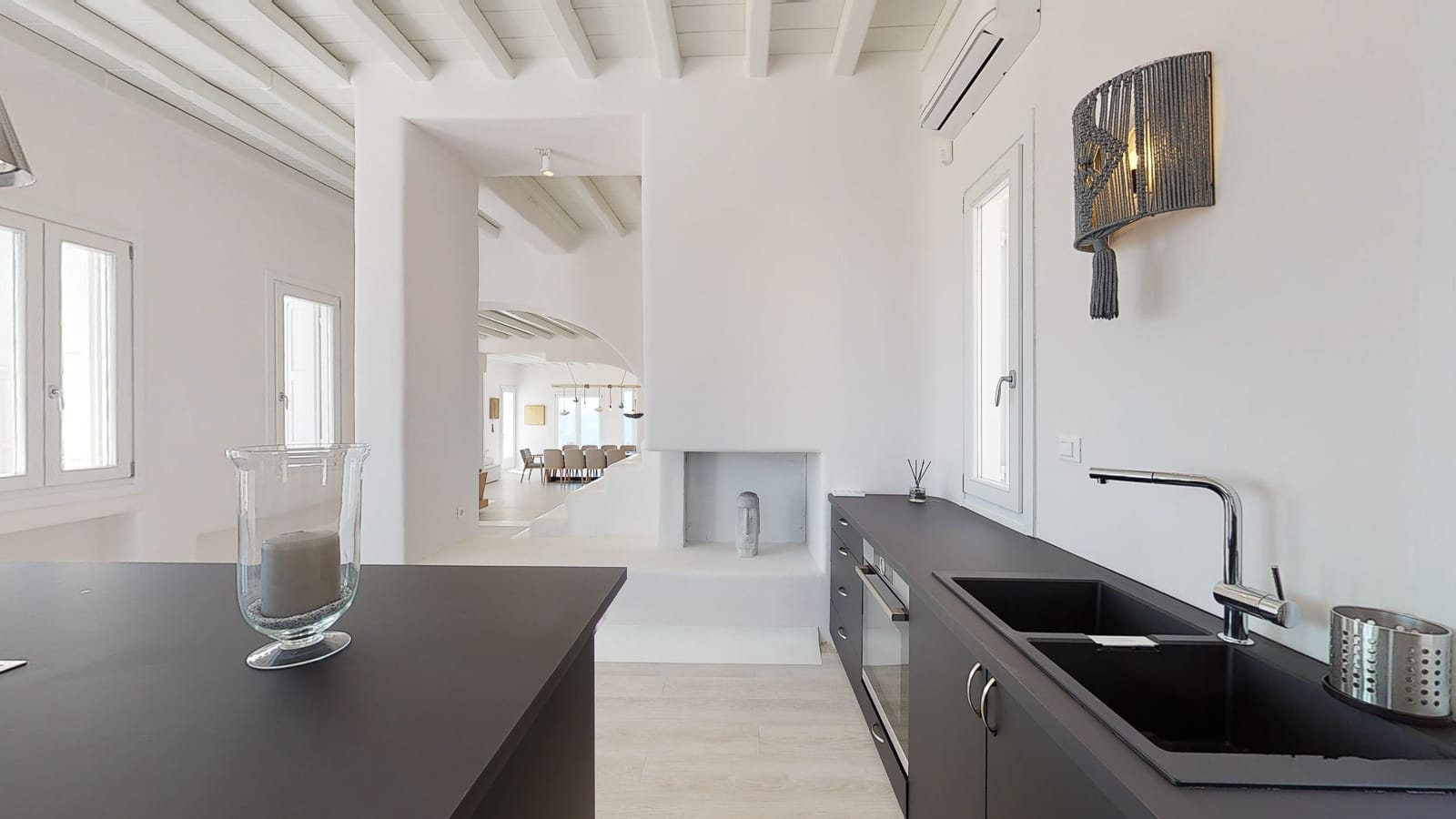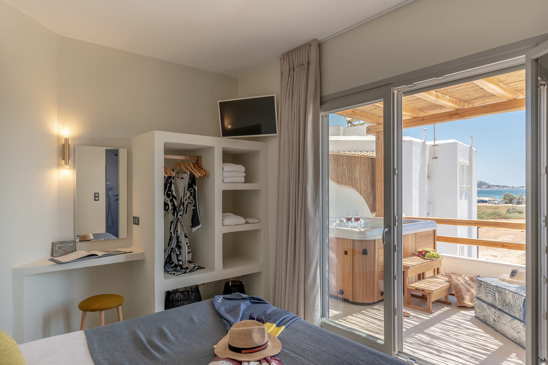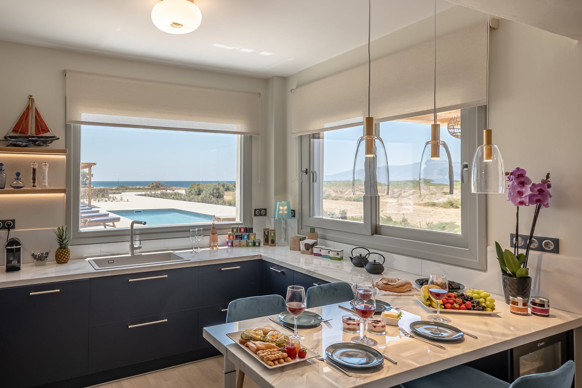 Its privileged location, with a direct and unobstructed sea view, is a strong point to visit. It offers absolute peace, due to its privacy, enjoying the guests a truly relaxing holiday. The villa’s owner is Kiriaki. Armelina Villa’s story goes back to Kiriaki’s grandmother’s sister, who was named Armelina and owned the plot of land where Armelina Villa is situated today. The aesthetics of the space is inspired by the bright summer sunlight, the blue of the Aegean Sea, and the nature of Naxos Island. The villa can be rented as a whole property. With 6 bedrooms and 6 baths, Armelina Villa is ideal for gathering a group of friends or family together with enough space for everyone to relax, offering views of the Aegean Sea and the unique sunset of the Cyclades.