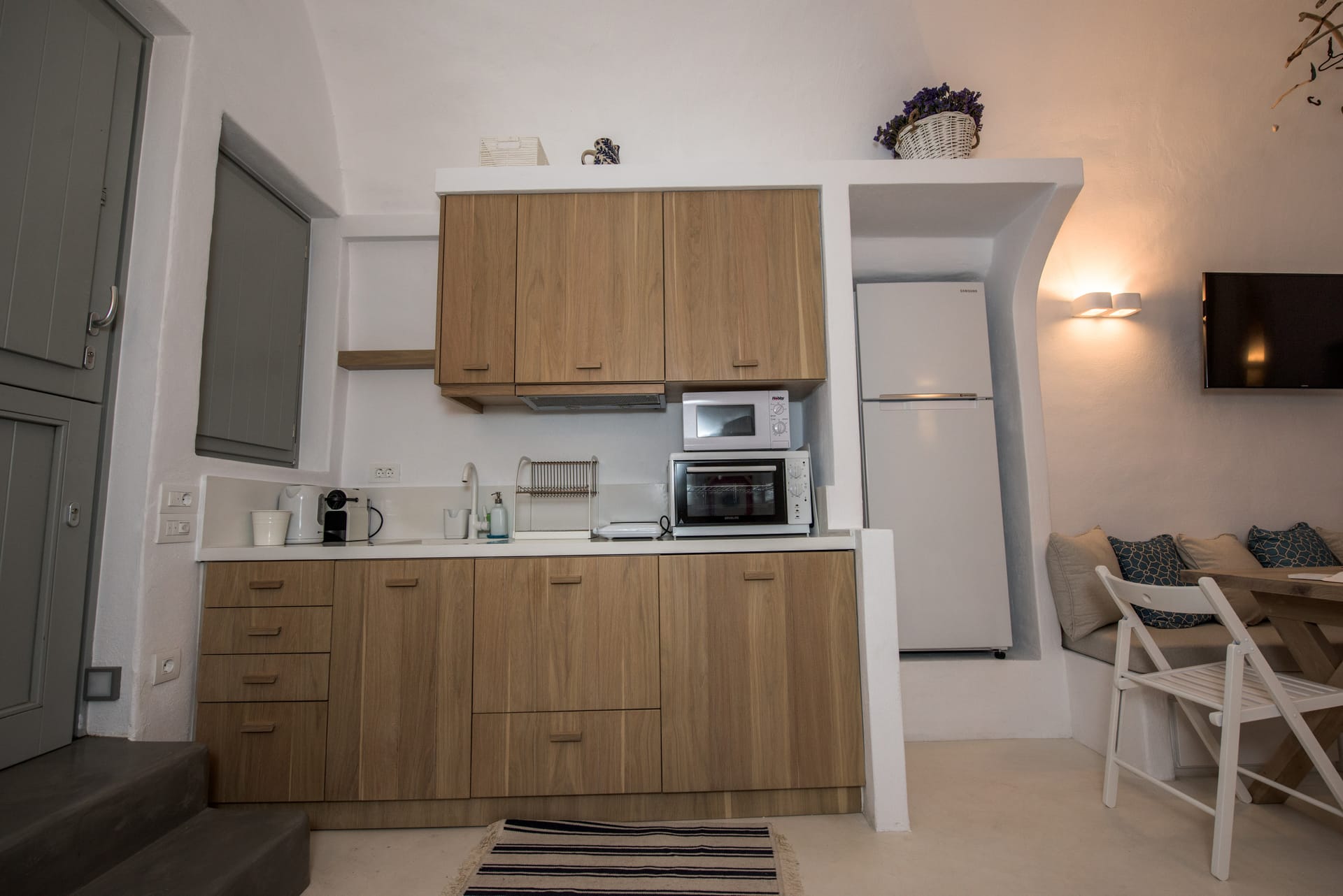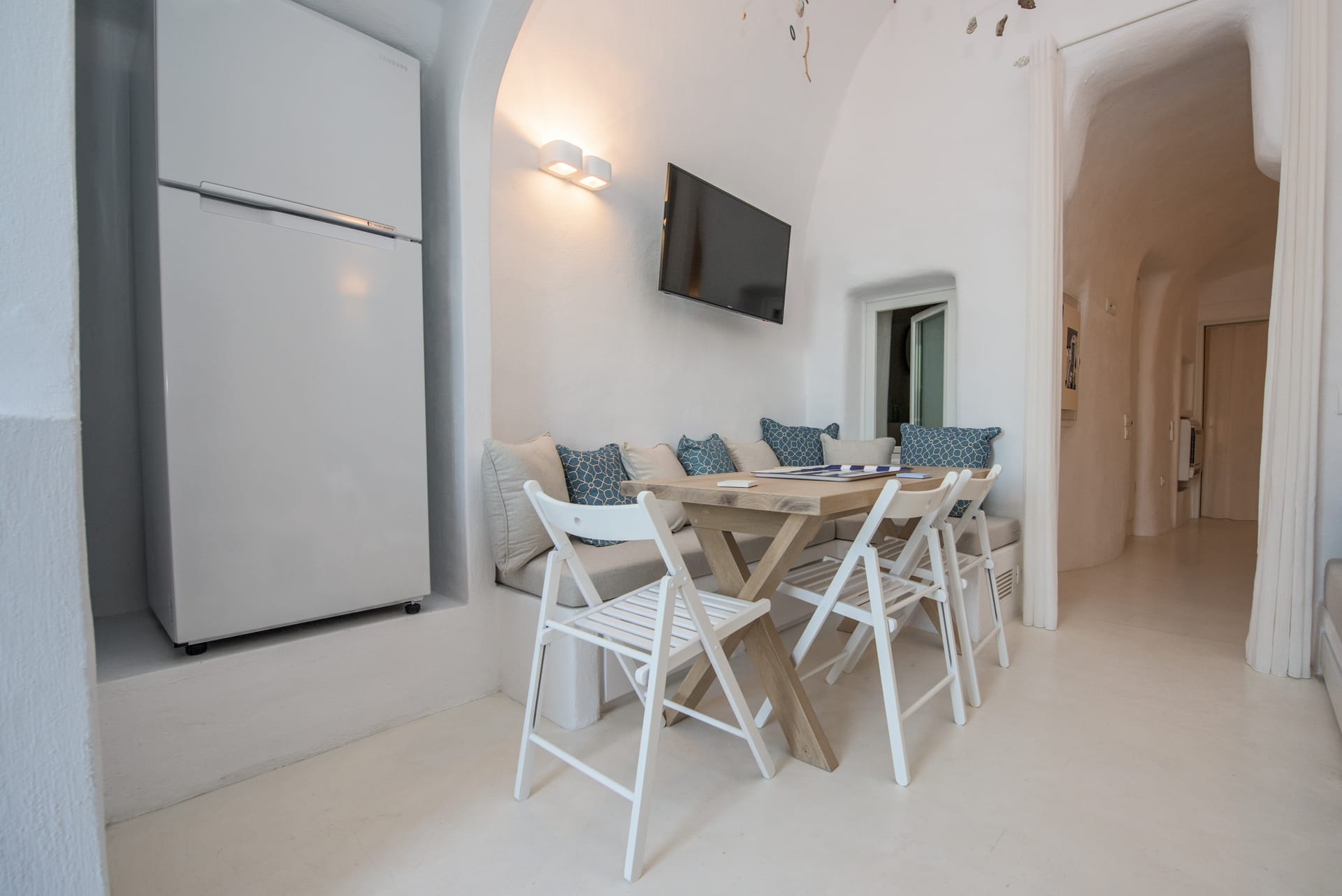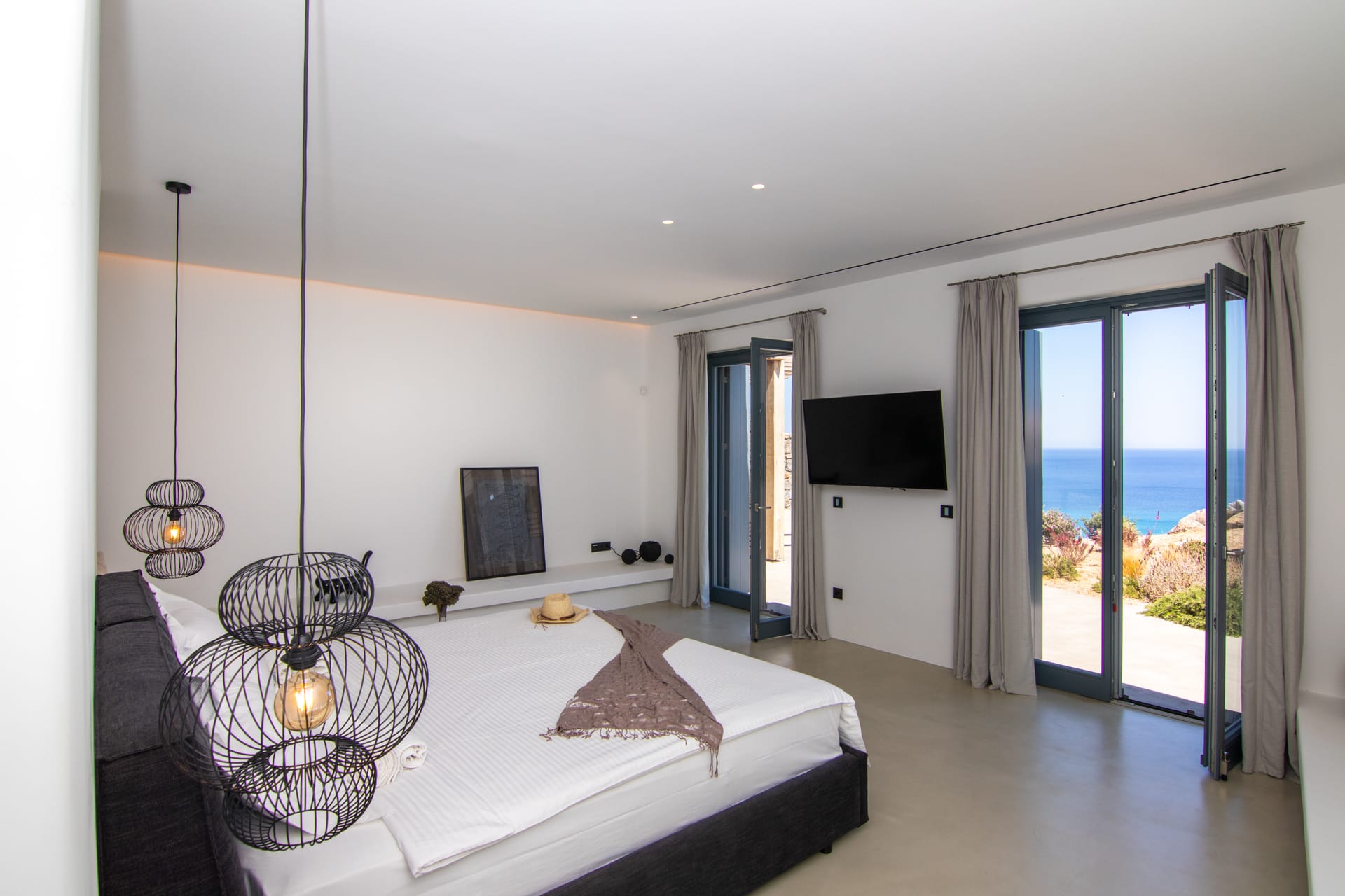 Artina Villa can accommodate up to 8 people, 6 in 3 large bedrooms and 2 more in the sofa beds in the living room. Two of the bedrooms have en suite bathrooms, there is one more extra bathroom, fully equipped kitchen with all utilities such as microwave oven, espresso machine, coffee machine, dishwasher, large cooker and refrigerator, dining table, living room with 2 sofa beds and fireplace. There is a 42 inch plasma satellite TV with CD-DVD player and playstation in the living room and a 32 inch plasma satellite TV in every bedroom. Air conditioning (cold/heat) and WiFi internet access is available throughout. The villa also features many floor to ceiling windows that lead to spacious verandas offering unobstructed views of the endless blue sea and the majestic mountains in the surrounding area.