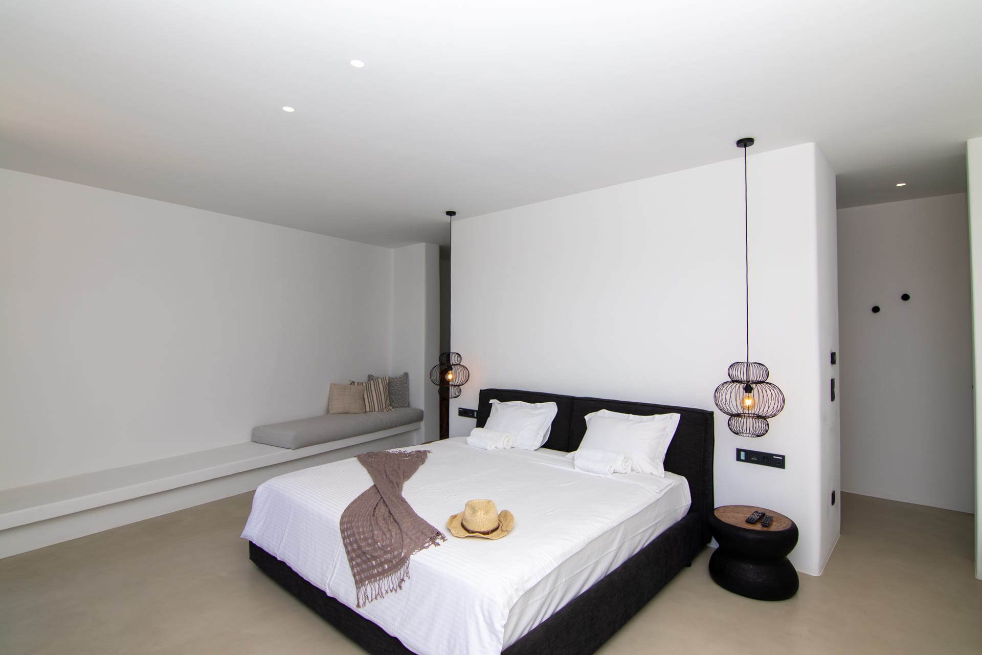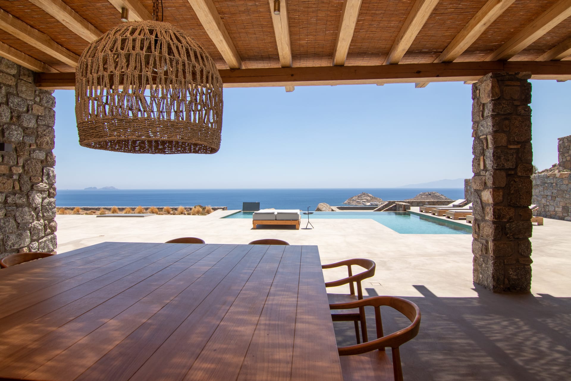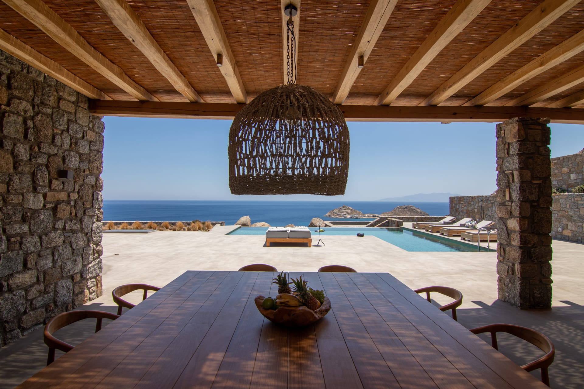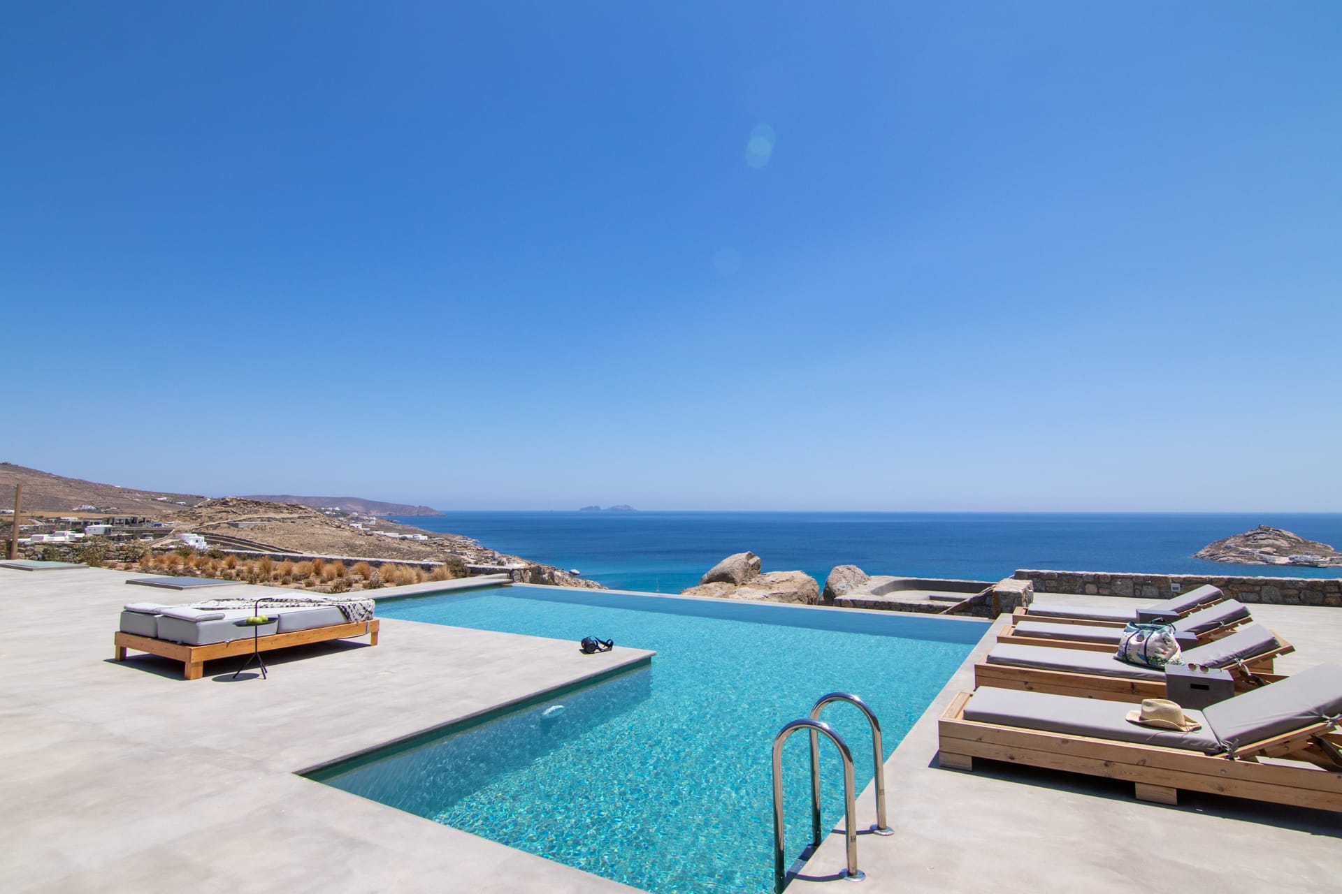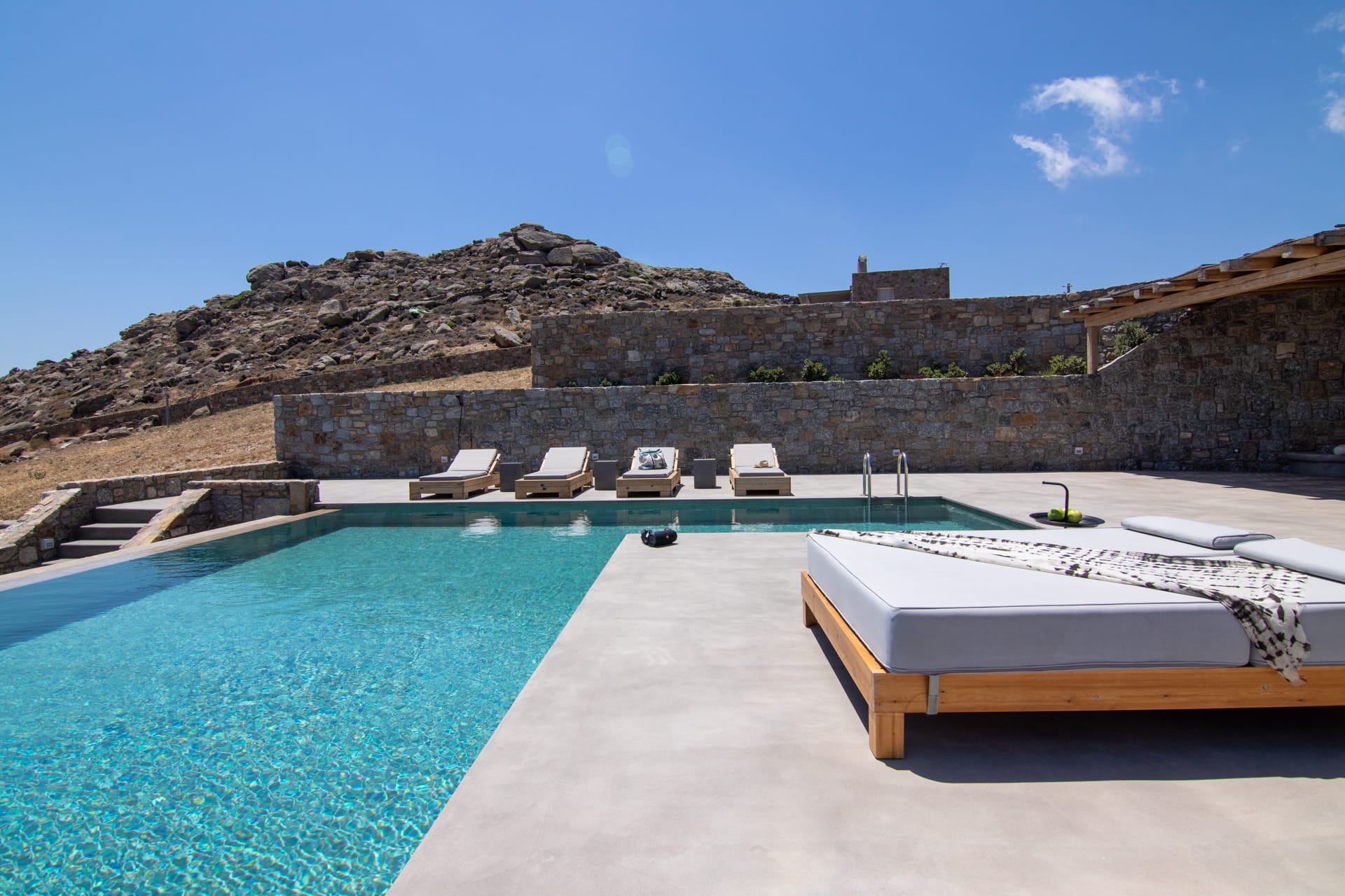 Outside, you are greeted by a private, paved driveway leading to the villa, well kept lawns in multiple levels, a state of the art heated* swimming pool with waterfalls, aero-massage and hydro-massage, shaded verandas, a sun terrace as well as an outdoor bar where you can enjoy your drinks and cocktails while gazing the endless blue of Keri bay.