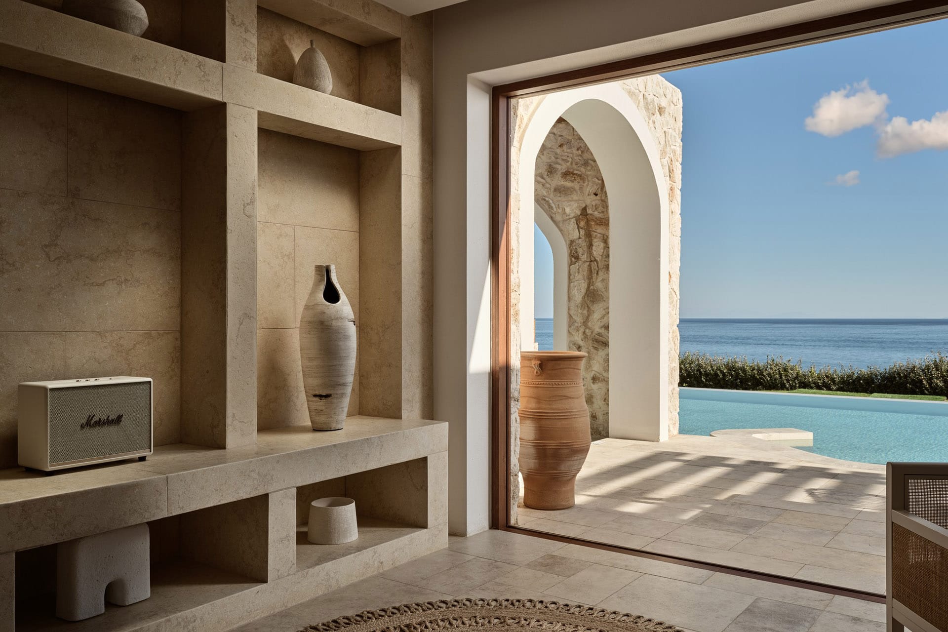 Arismari Luxury Villas are located in the south eastern corner of Zakynthos and offer a spectacular view to the Peloponnese. They were built by local craftsmen using materials, and more particular stones, from the near vicinity. We believe that it’s a perfect example of how combining local materials, traditional architectural lines and a minimal and modern interior design not only does it ensure it suits perfectly to the environment but it also maximizes the spectacular hillside it occupies.