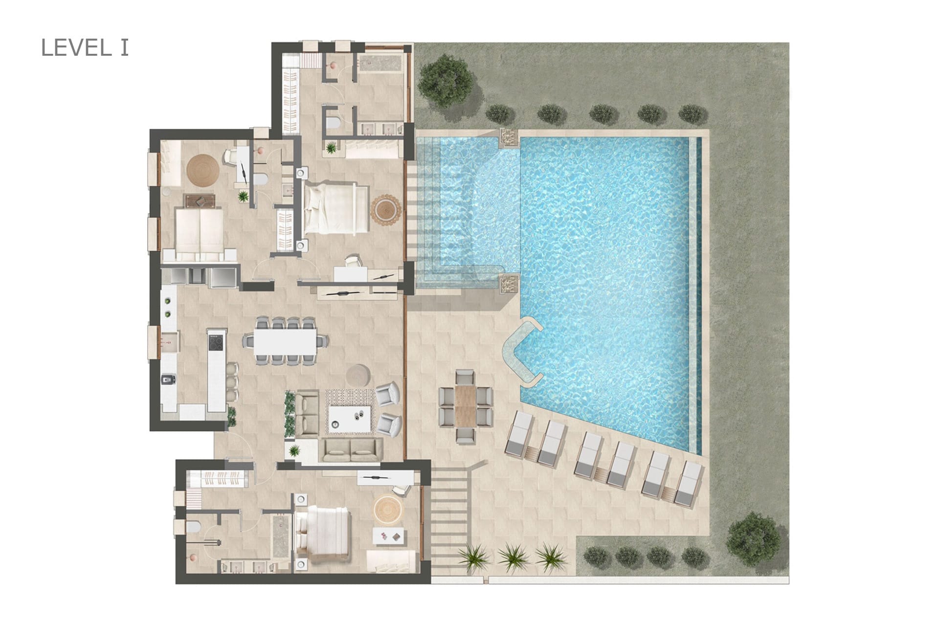 Each villa is made up of two floors and a spacious loft. In the ground floor there are two bedrooms with en-suite bathrooms and in the first floor a kitchen, a living room and a guest’s bathroom. The loft includes two bedrooms with en-suite bathrooms offering an amazing view to the Ionian Sea. The loft is also the ideal spot to enjoy the breath-taking view of the sunrise, which you need to experience yourselves as words doesn’t do it justice.